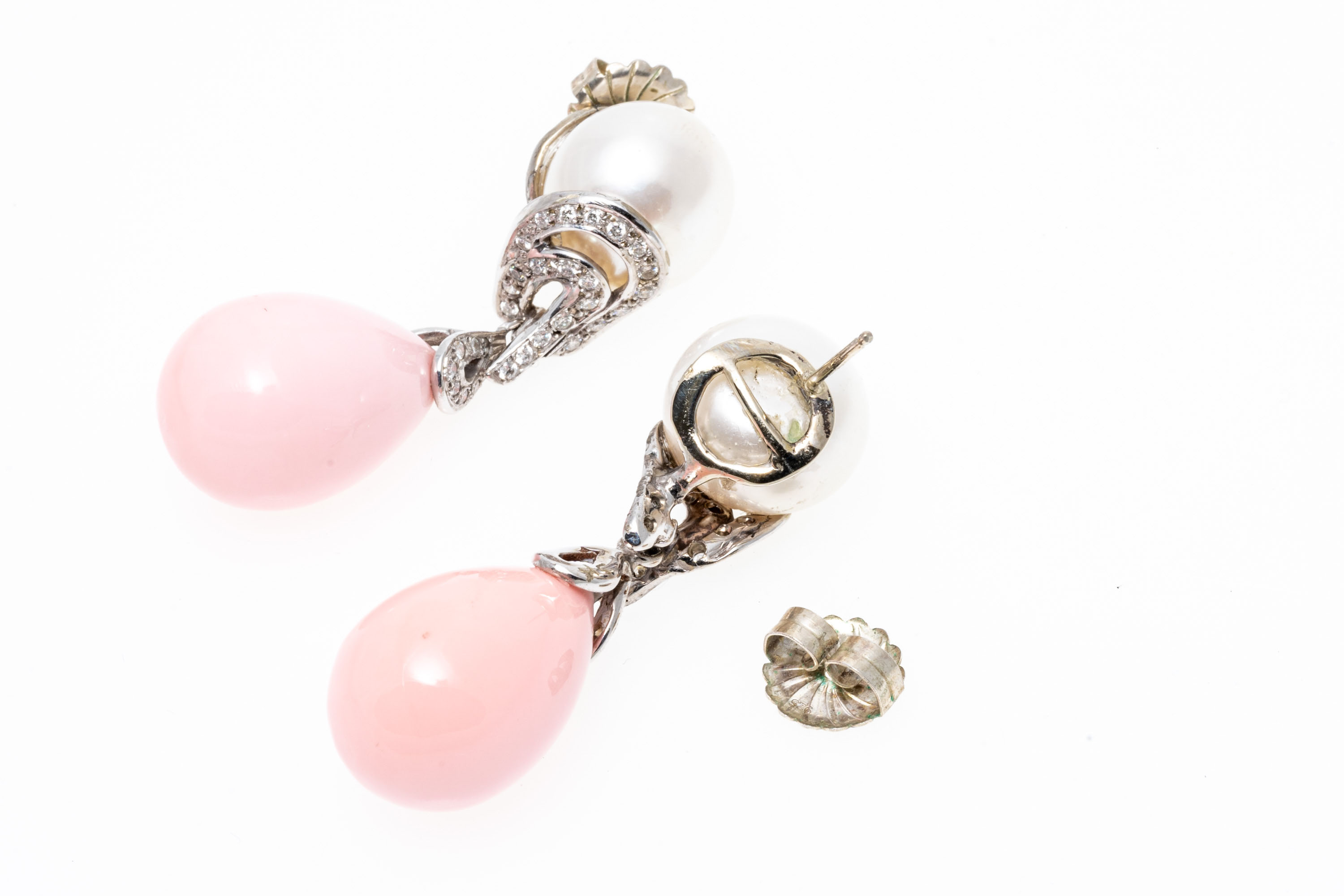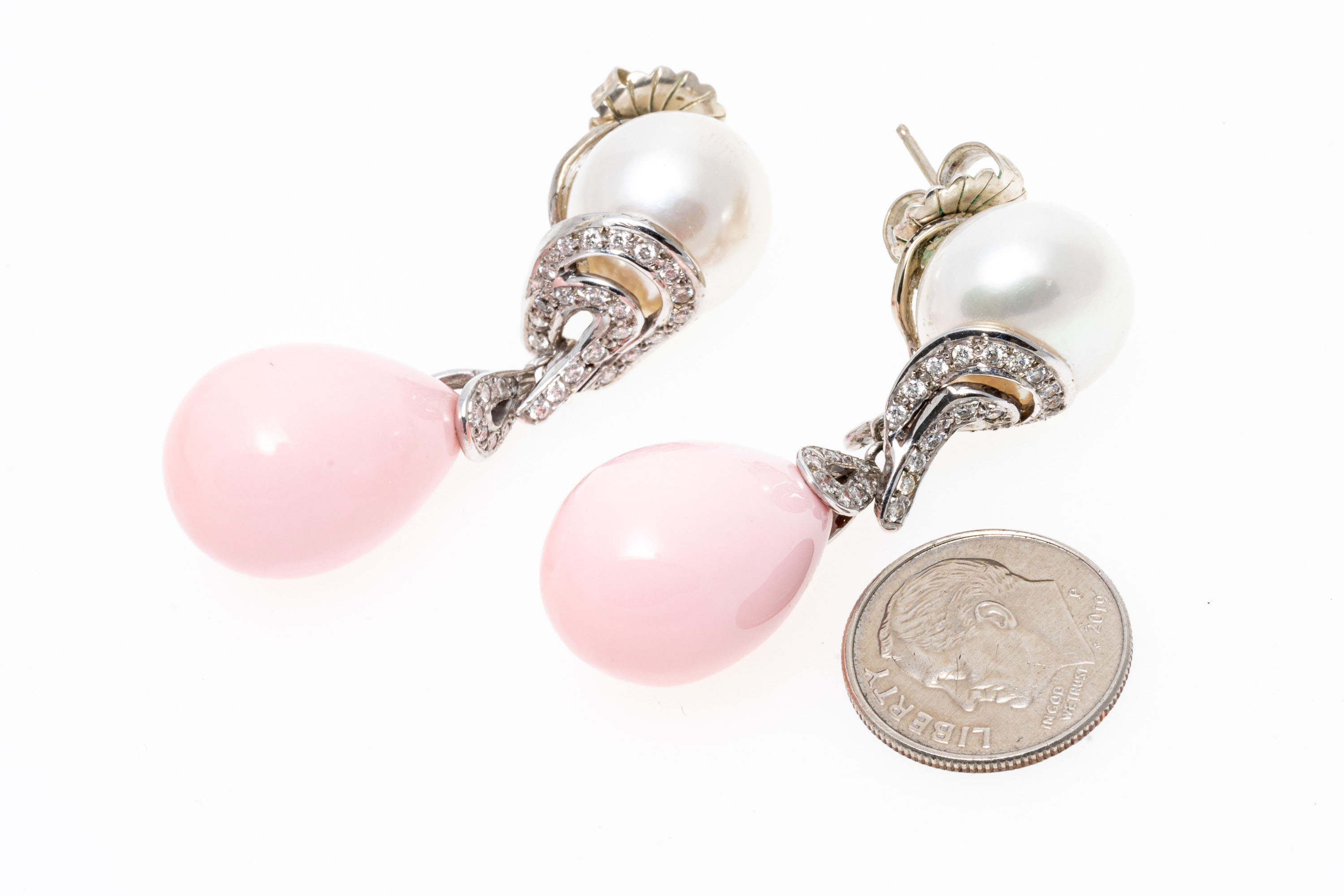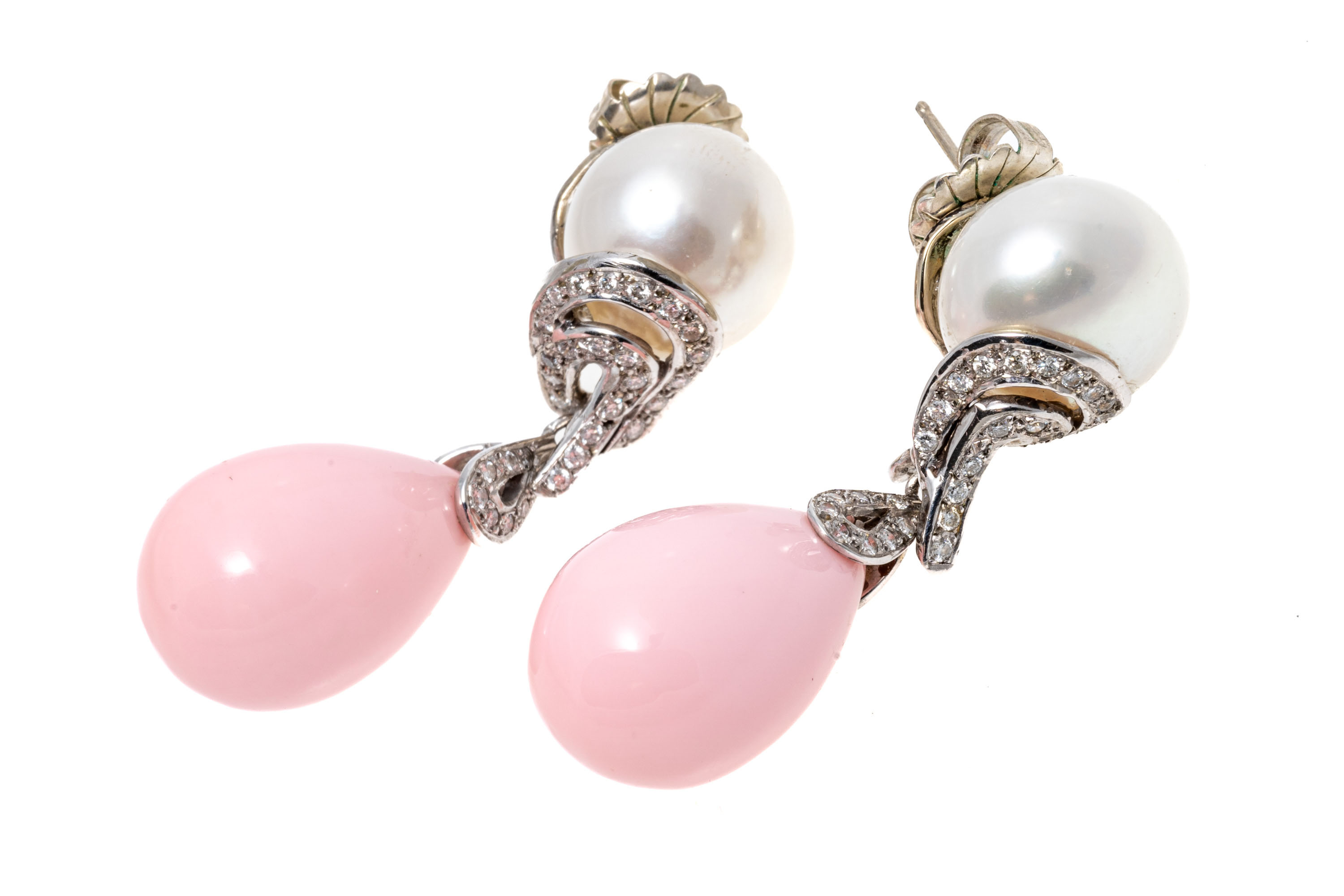 14k yellow gold earrings. These stunning pendant earrings contain a white cultured south sea pearl top, from which suspends a gorgeous pear shaped, light to medium pinkish peach coral drop and accessorized by round faceted diamonds, approximately 0.45 TCW.