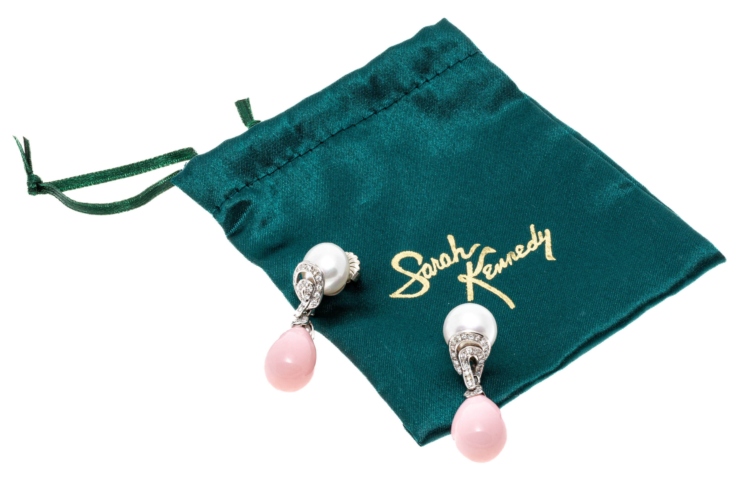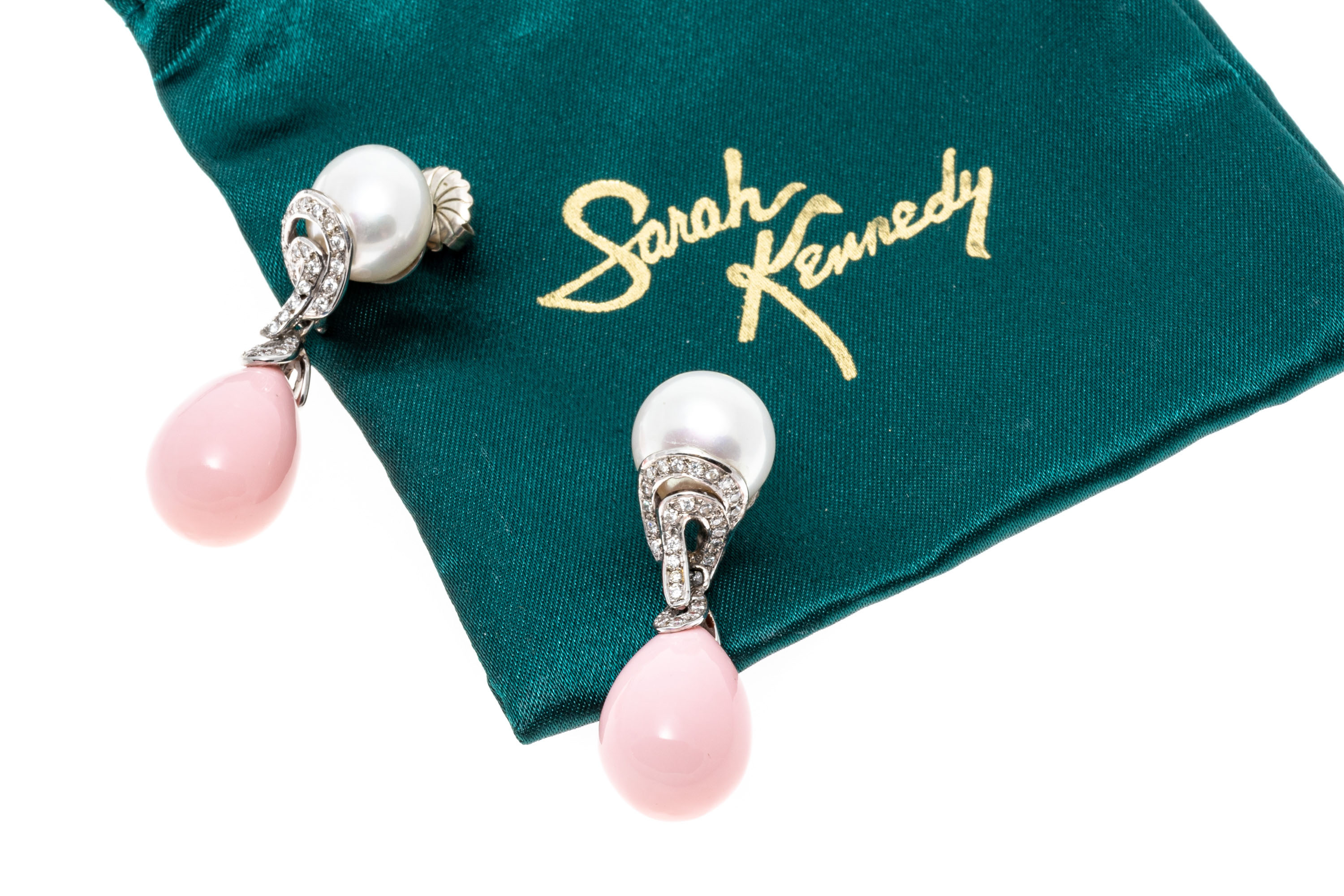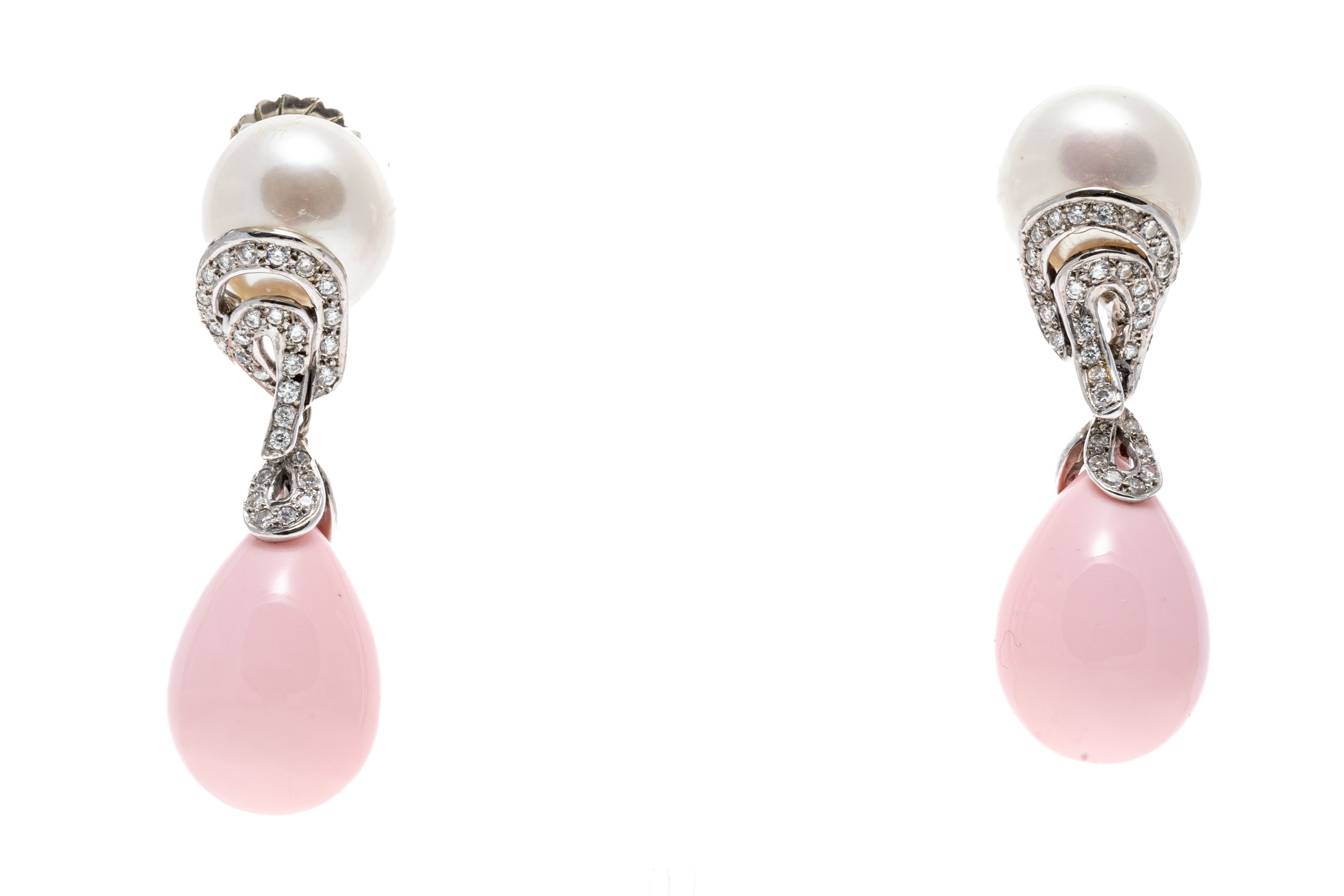 14k yellow gold earrings. These stunning pendant earrings contain a white cultured south sea pearl top, from which suspends a gorgeous pear shaped, light to medium pinkish peach coral drop and accessorized by round faceted diamonds, approximately 0.45 TCW.