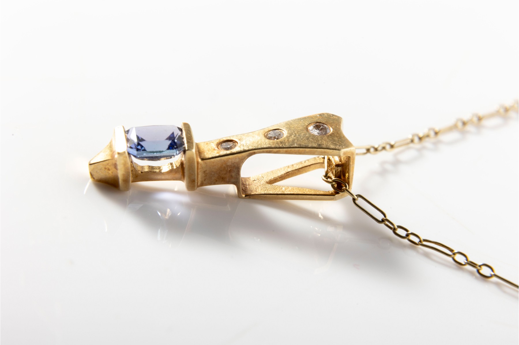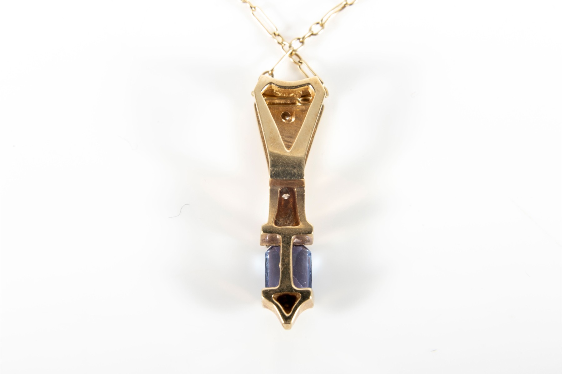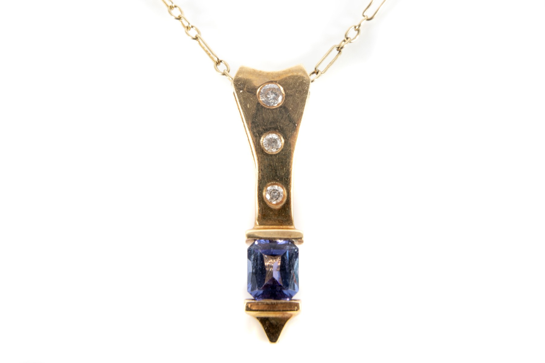 A pretty yellow gold contemporary necklace displaying an emerald-cut tanzanite under a tall, shapely bail with three flush set diamonds hanging from a figaro cable link chain. The tanzanite is approximately 0.83 CTS, the diamonds are approximately 0.08 TCW.