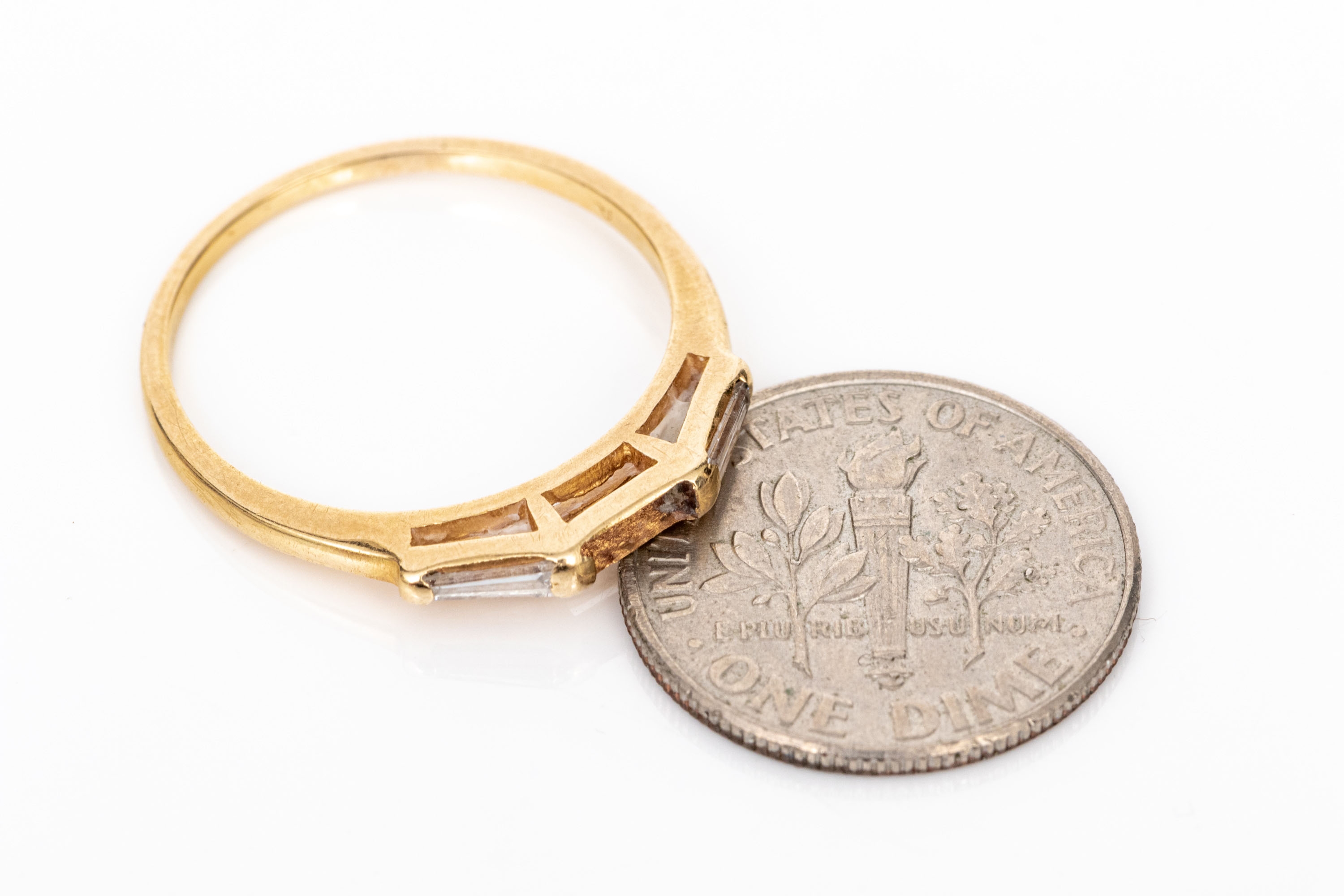 14k yellow gold three stone baguette diamond band ring, app. 0.20 TCW, size 7.25, as-is
