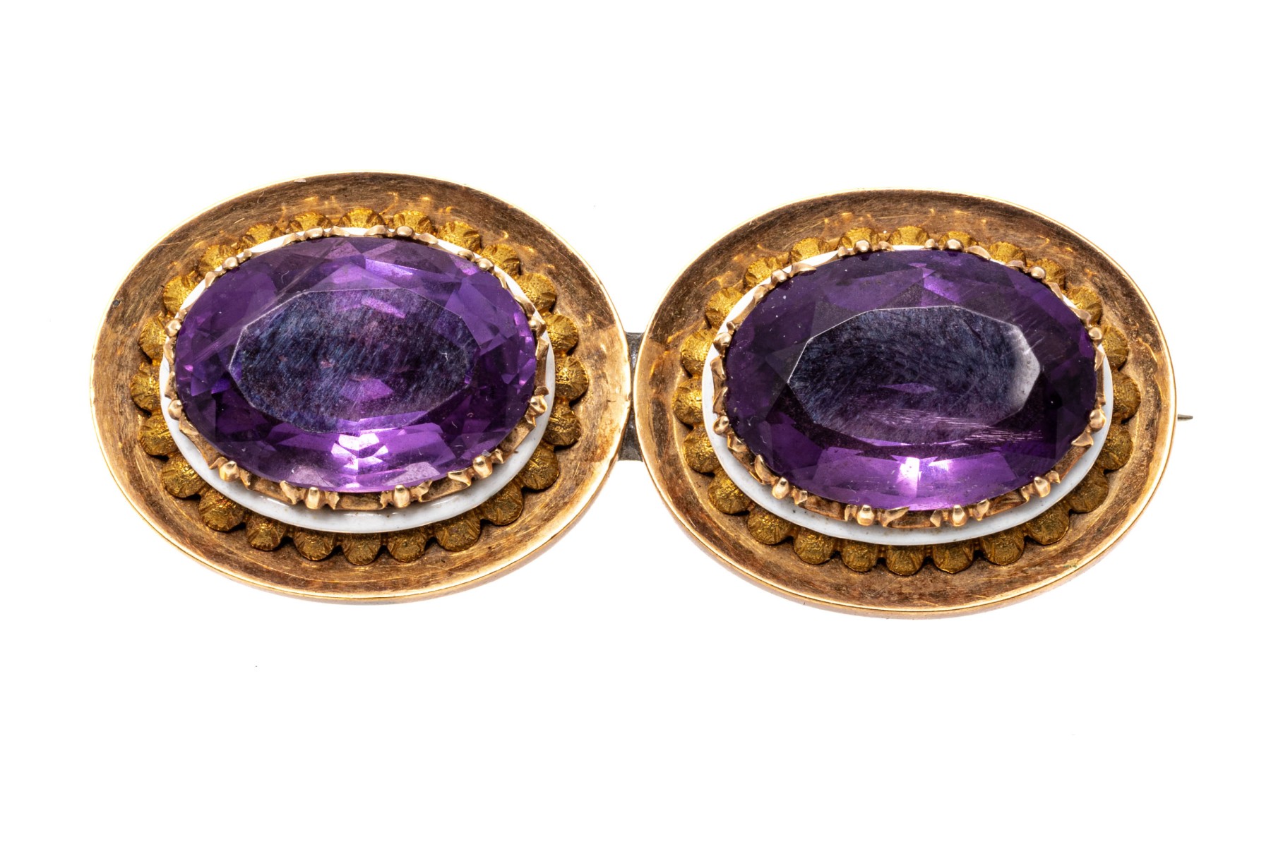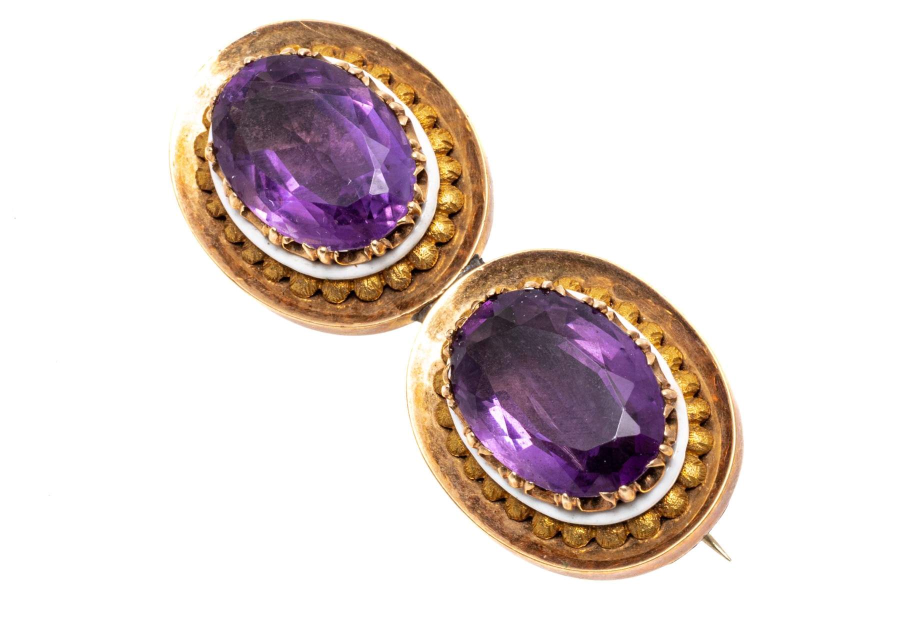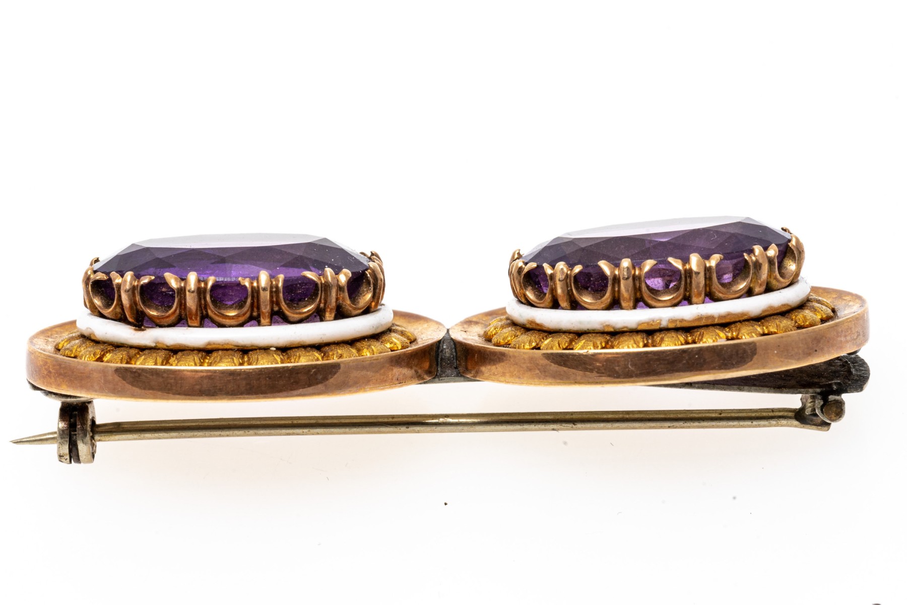 14k yellow gold topped pretty antique brooch, set with large oval faceted double amethysts, prong set and trimmed in white enamel, approximately 7.66 TCW