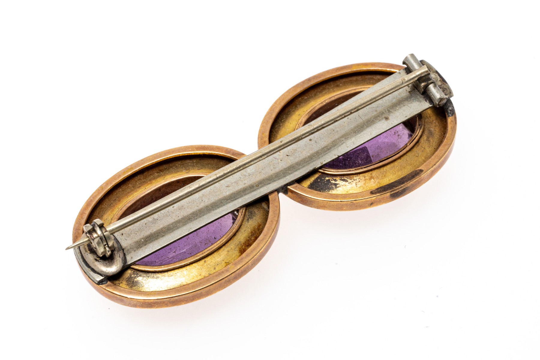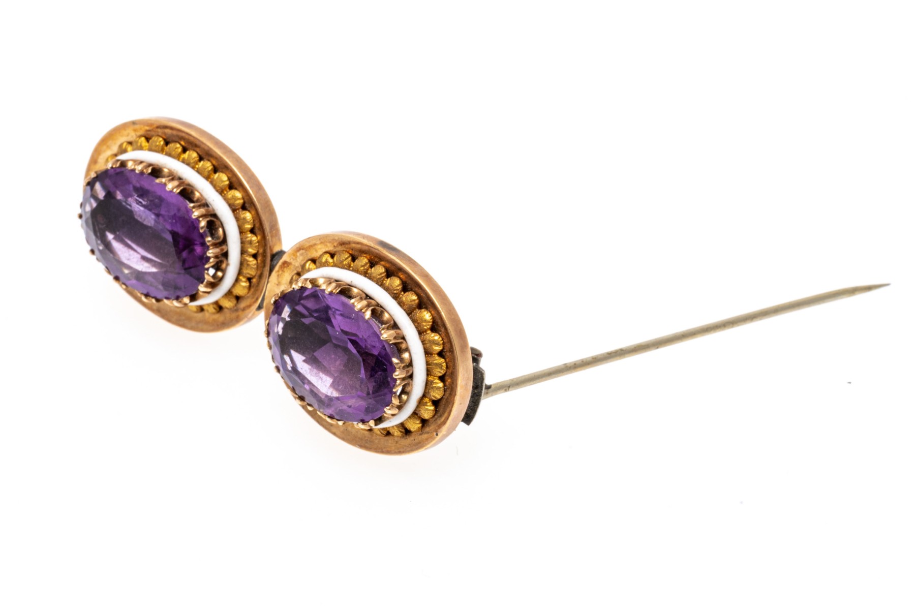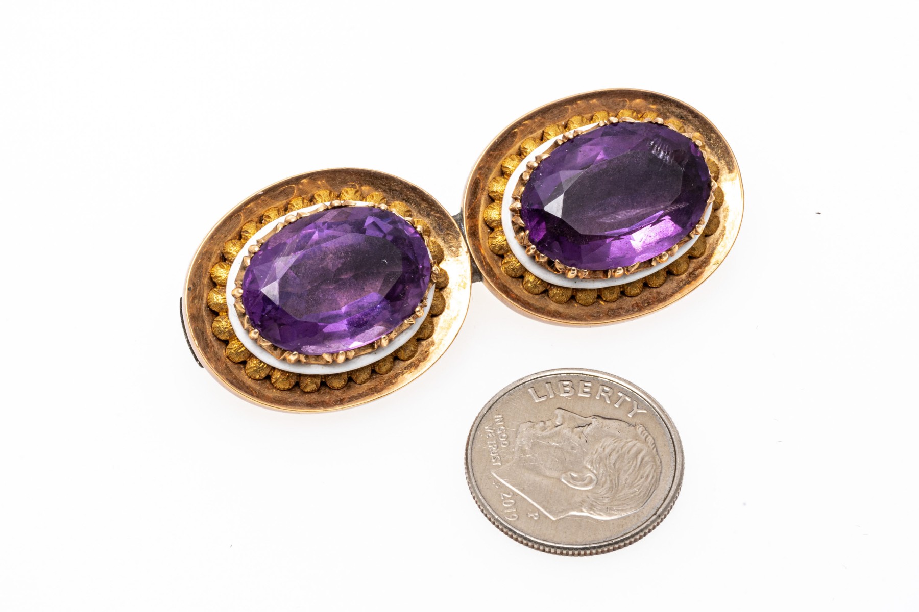 14k yellow gold topped pretty antique brooch, set with large oval faceted double amethysts, prong set and trimmed in white enamel, approximately 7.66 TCW