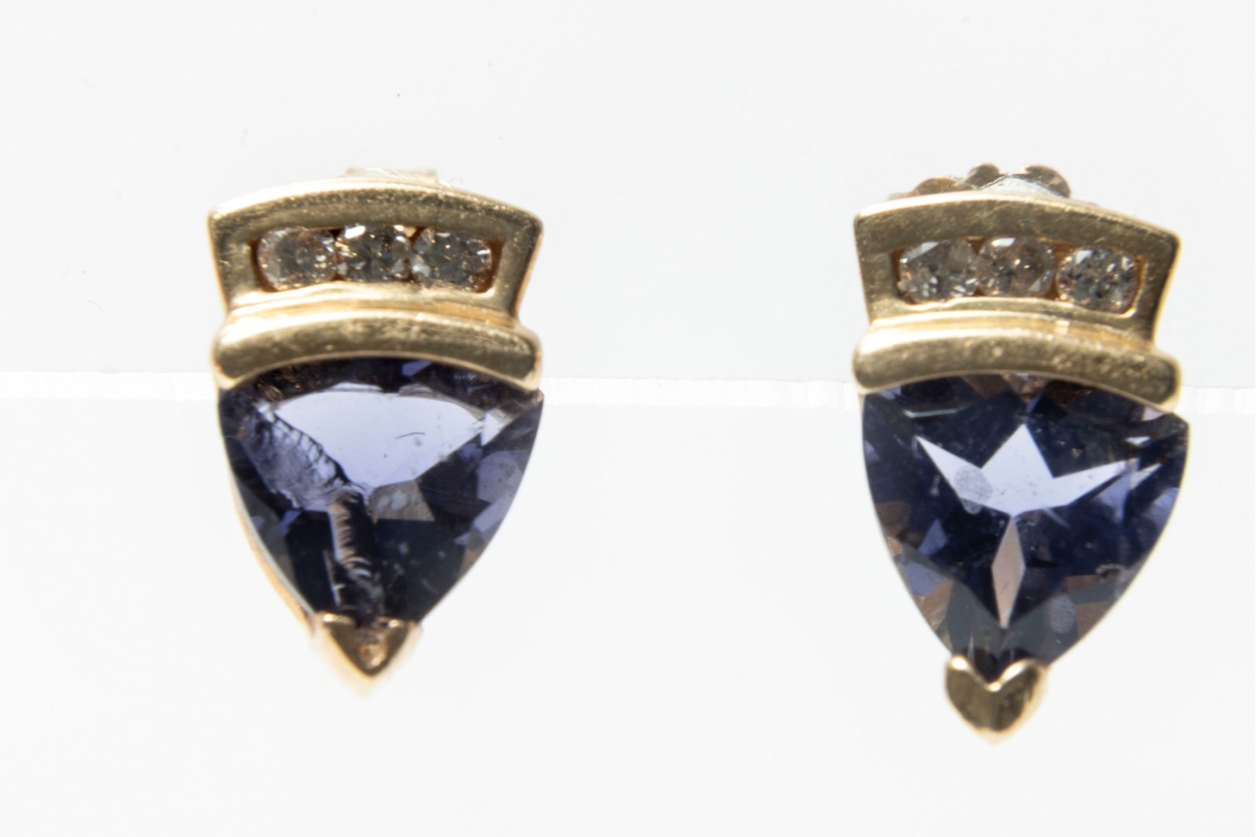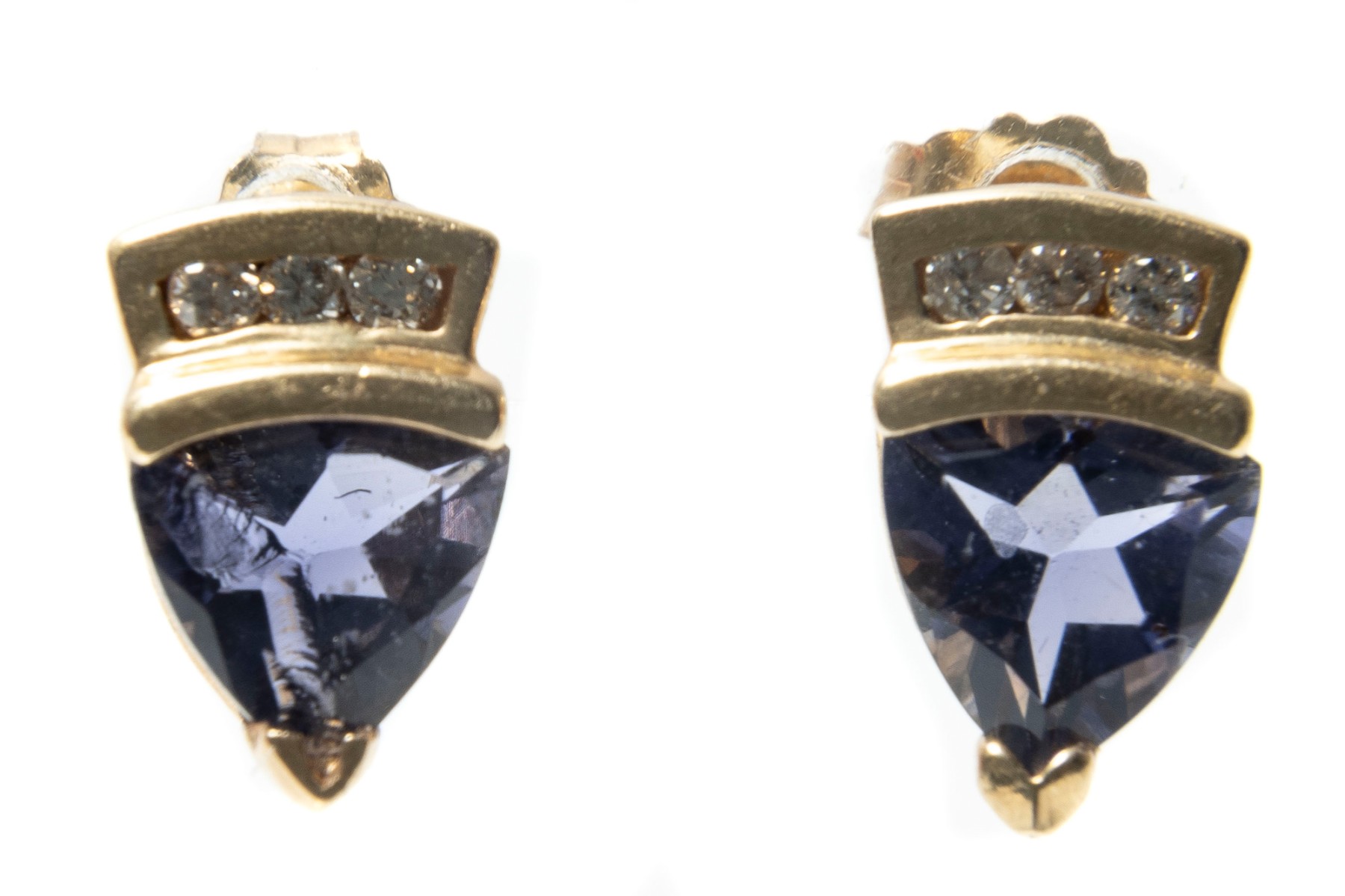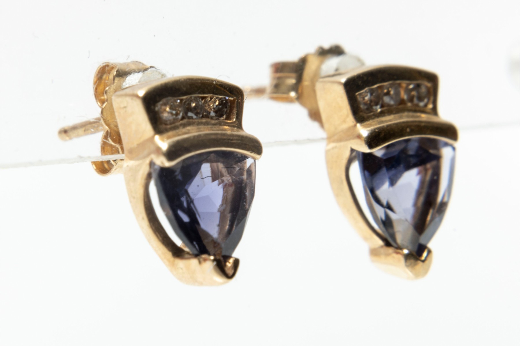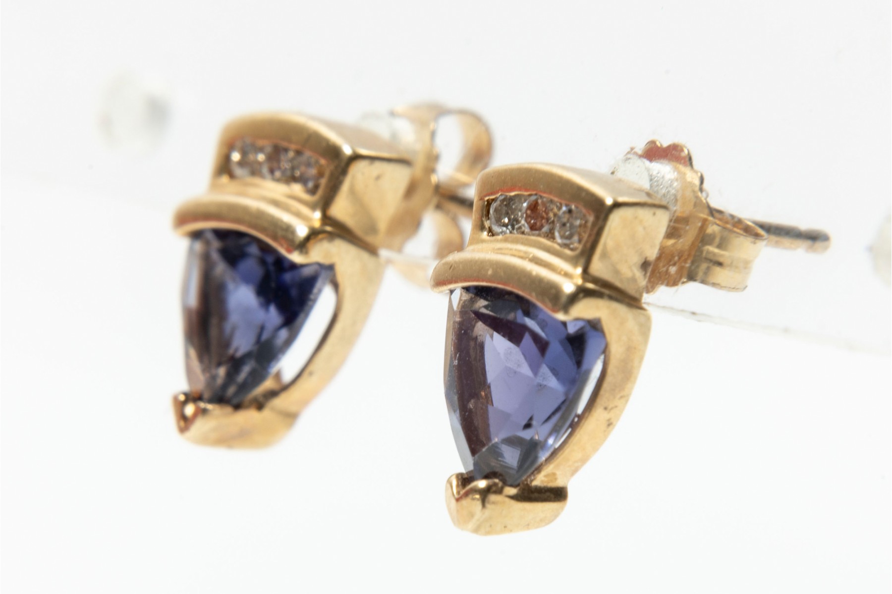 A pair of stylish, contemporary yellow gold studs displaying vibrant purple trillion shaped tanzanites in partial bezel settings accented with channels of round diamonds along the tops.