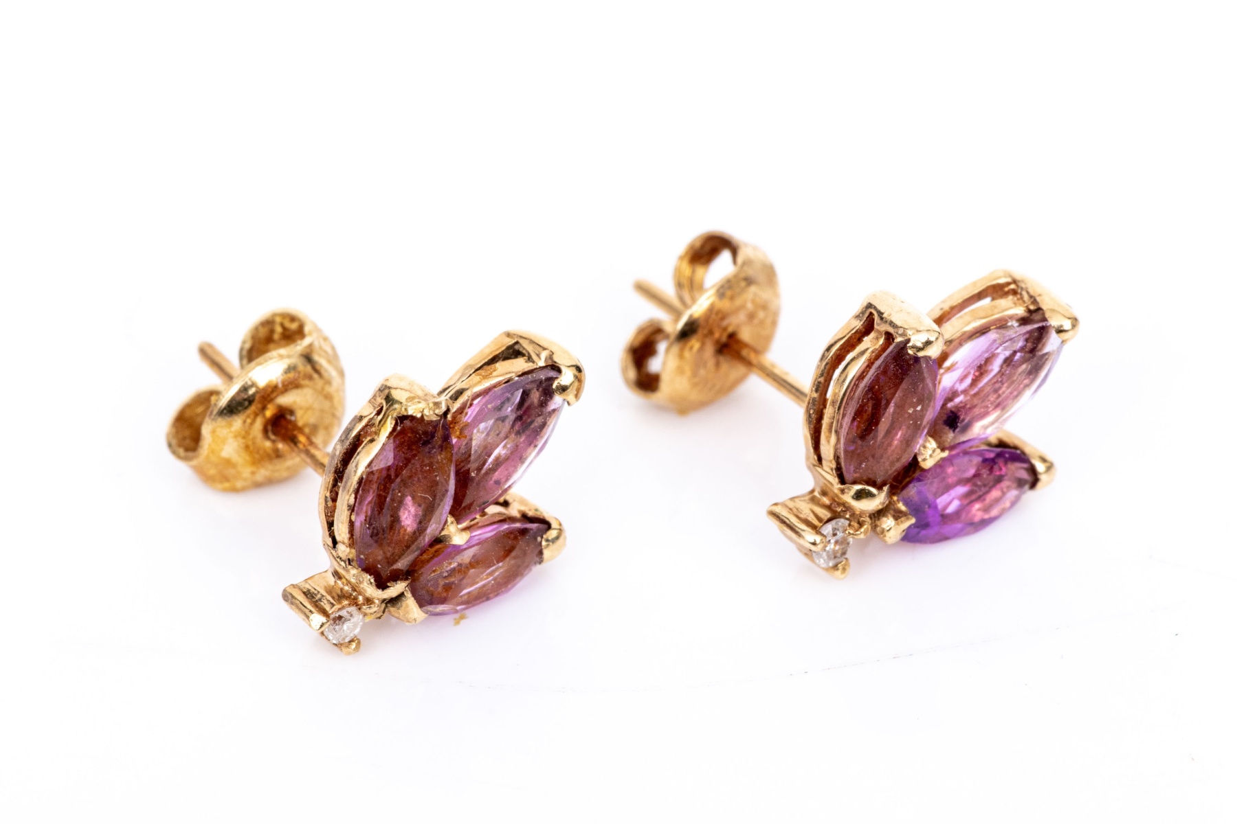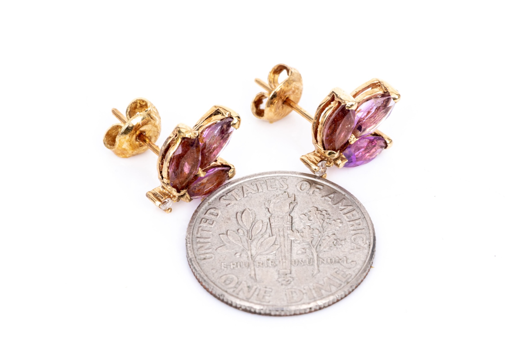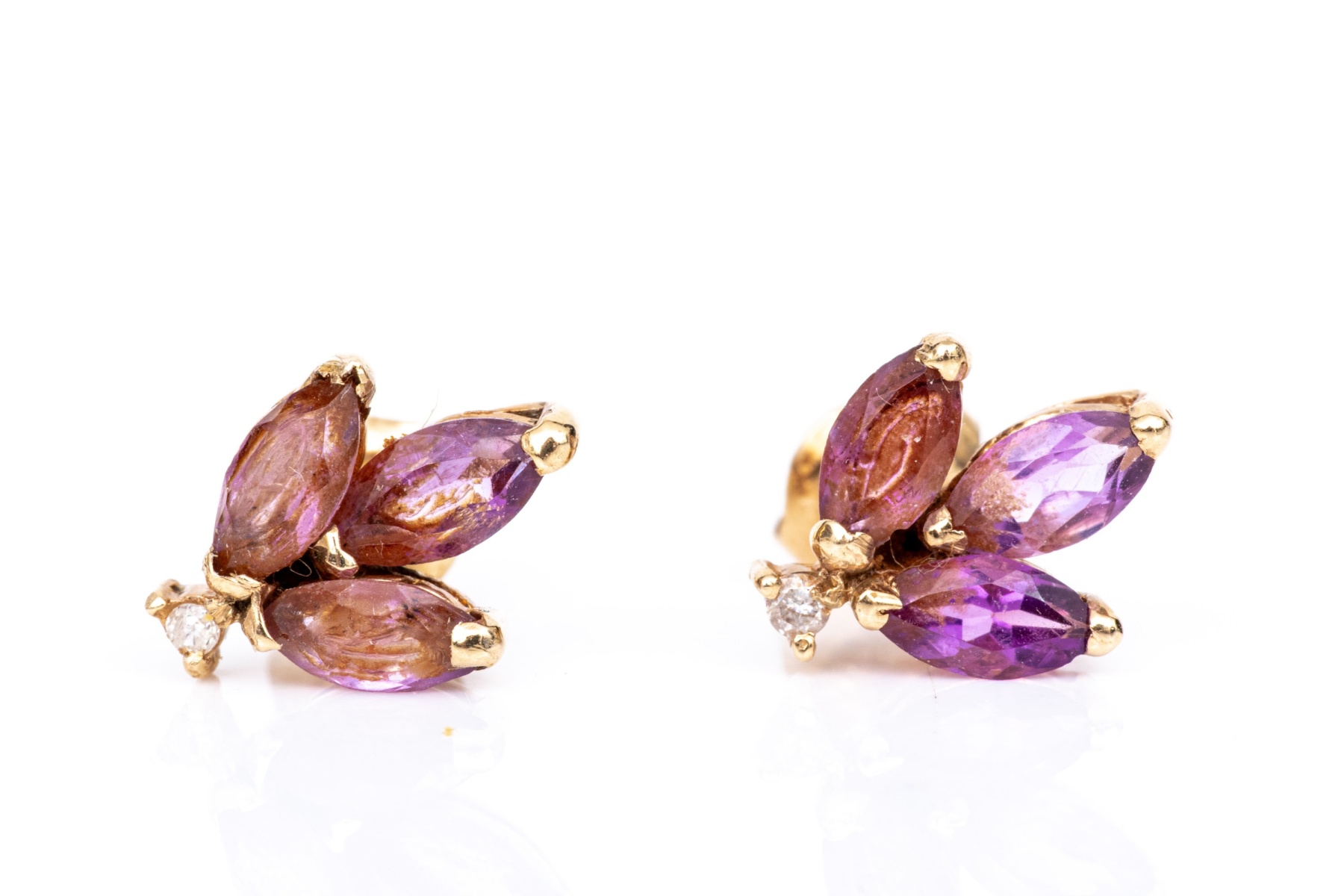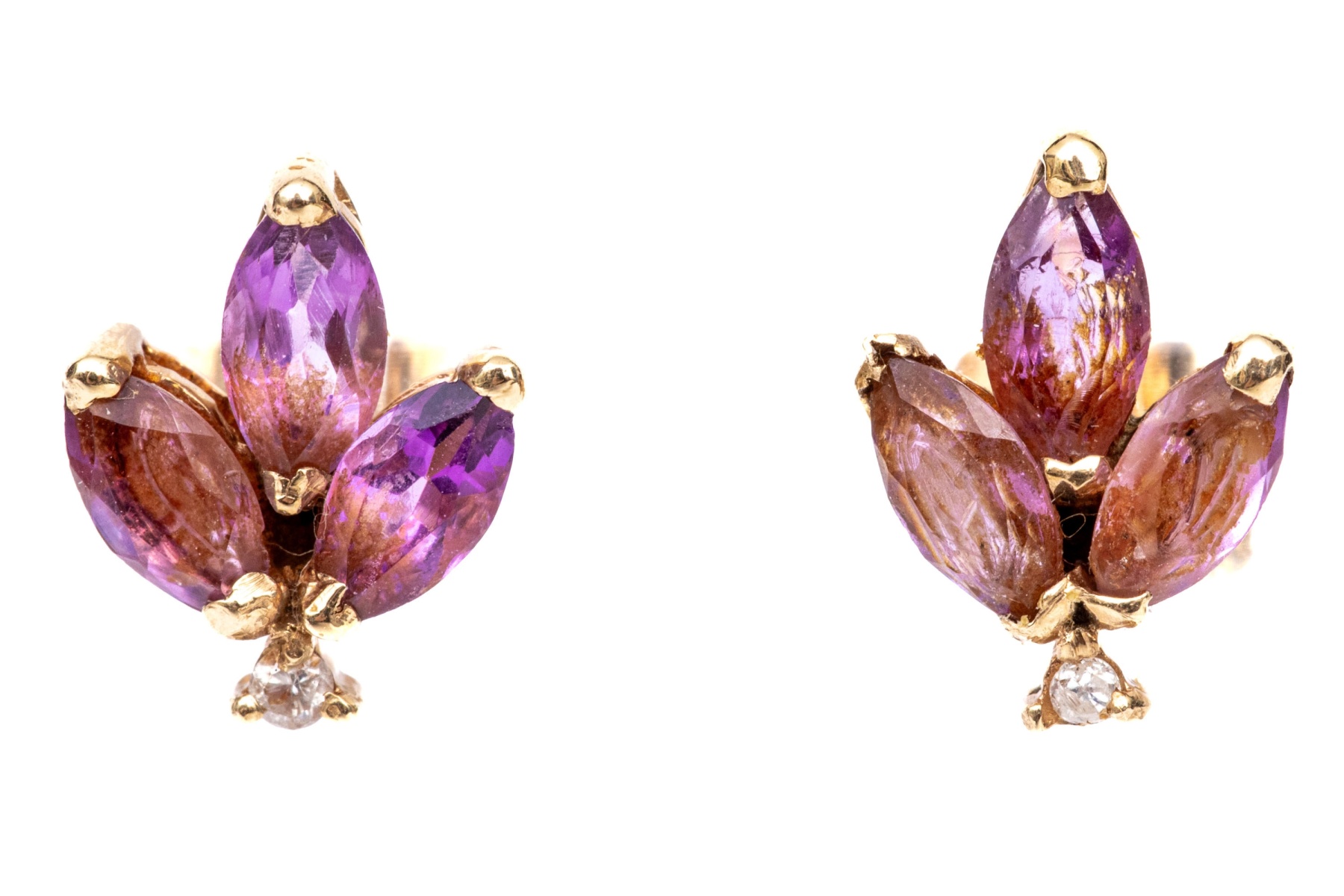 14k yellow gold triple amethyst foliate cluster and diamond accented earrings. These retro style earrings feature three marquise faceted, purple amethysts, app. 0.78 TCW, accented with round faceted diamonds, app. 0.03 TCW, prong set, finished with posts and clutch style backs