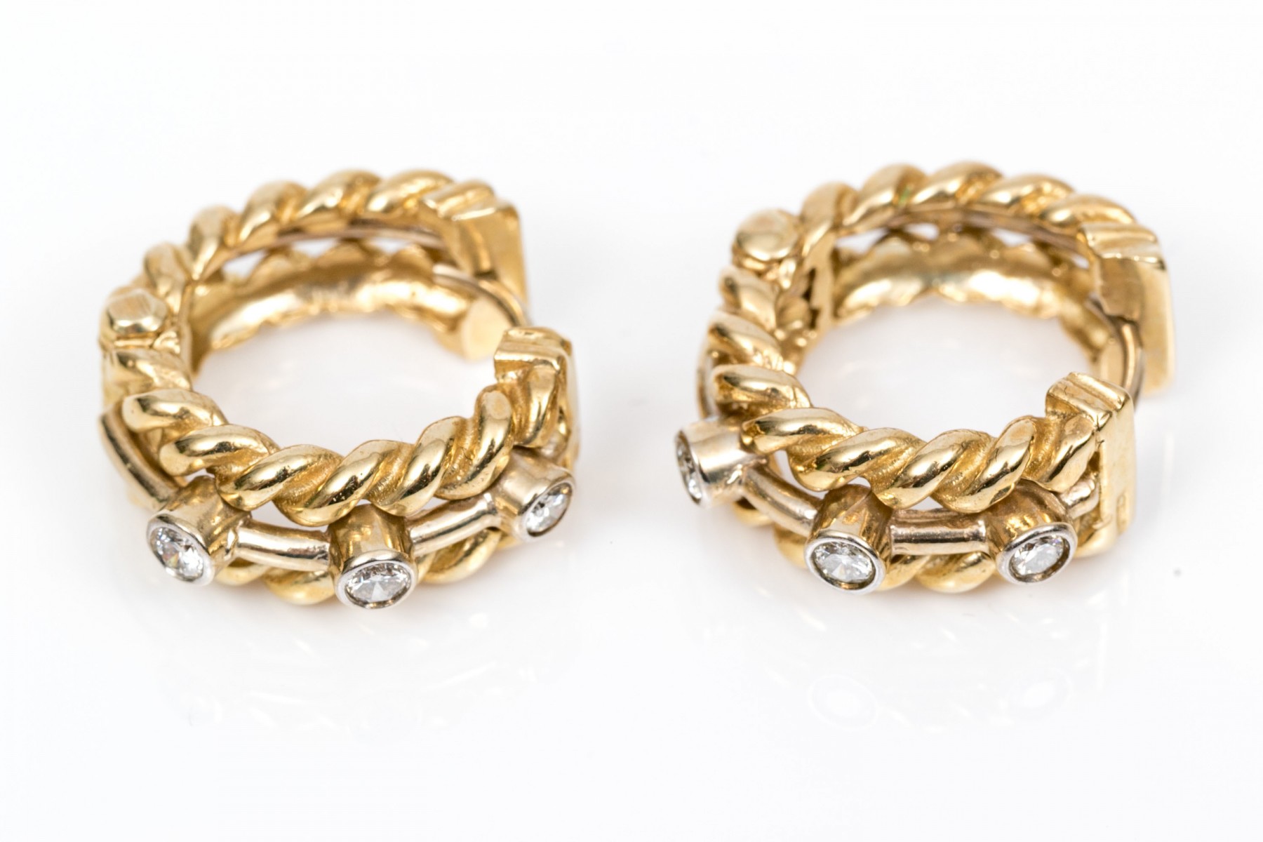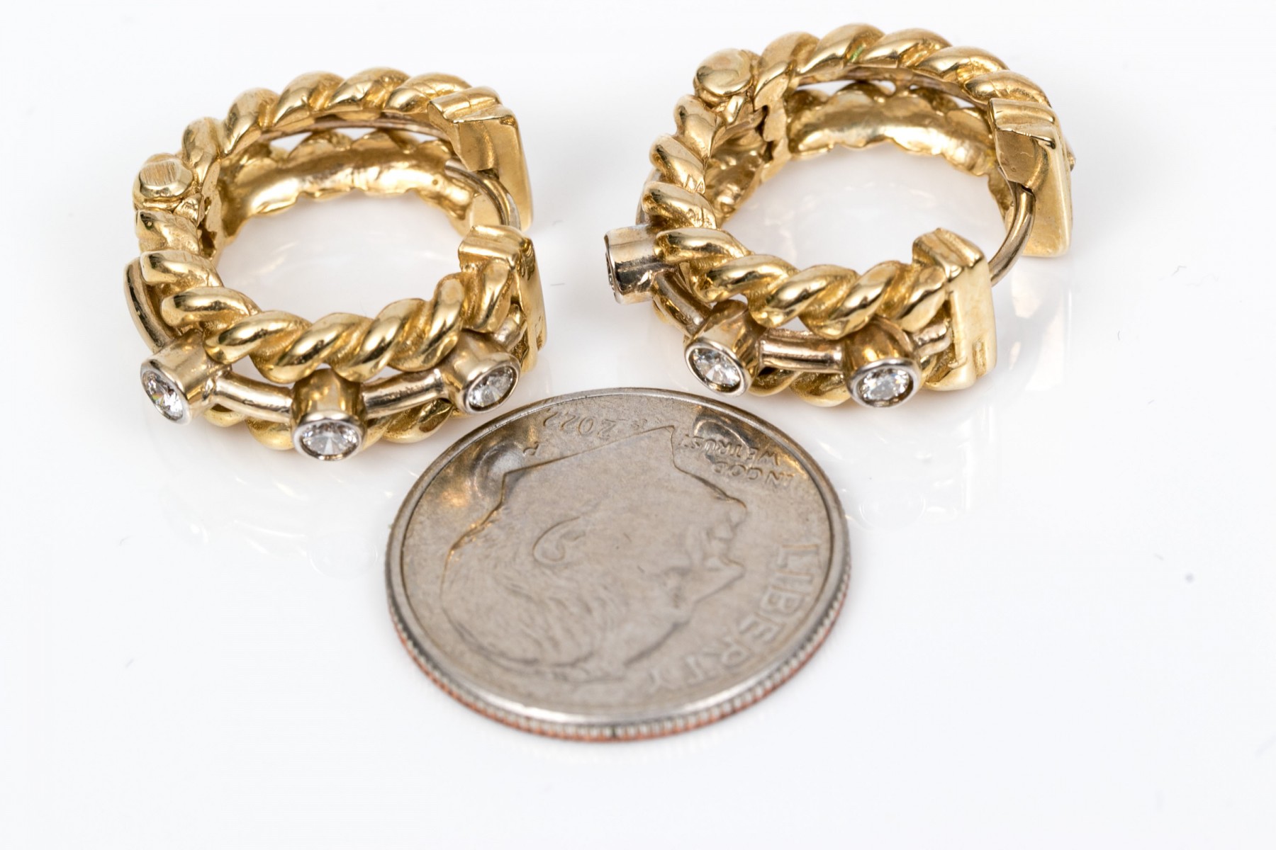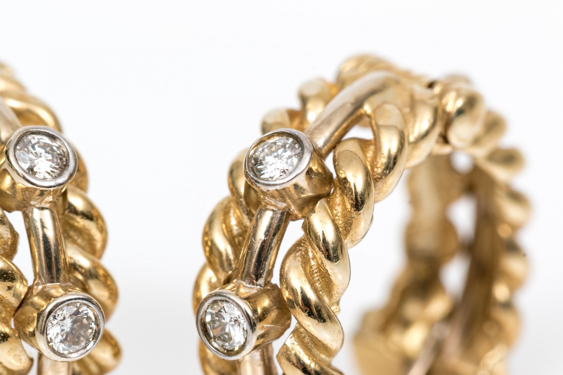 14k yellow gold twisted huggie style hoop earrings, diamond set, approximately 0.12 TCW. The earrings are have posts with hinged snap backs