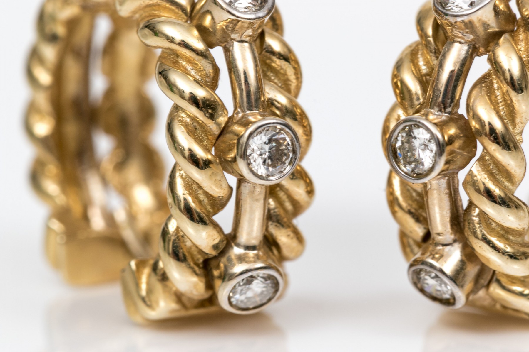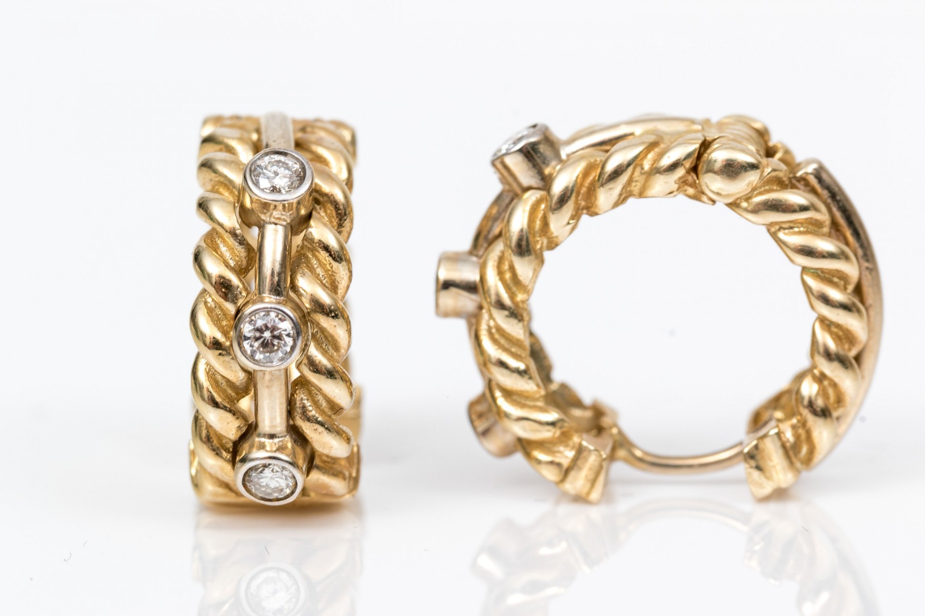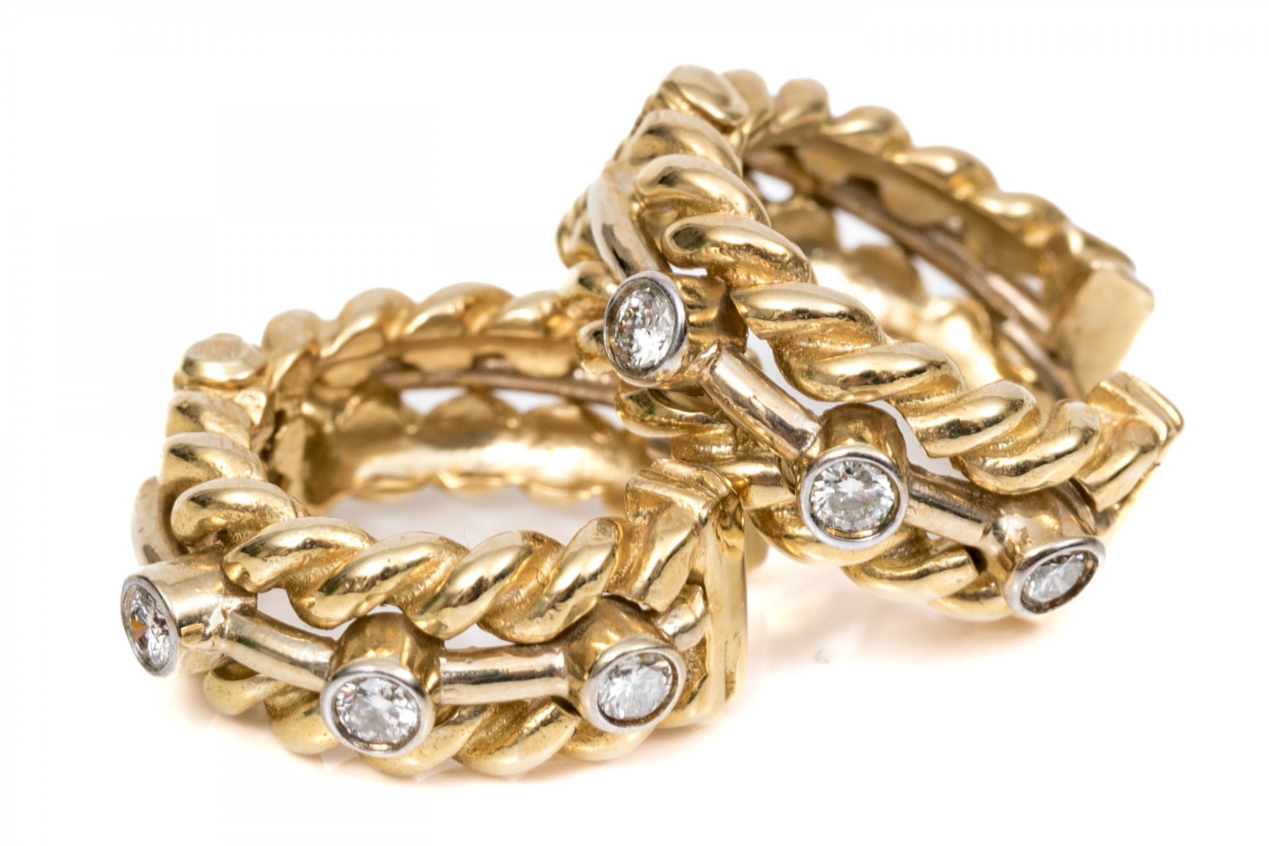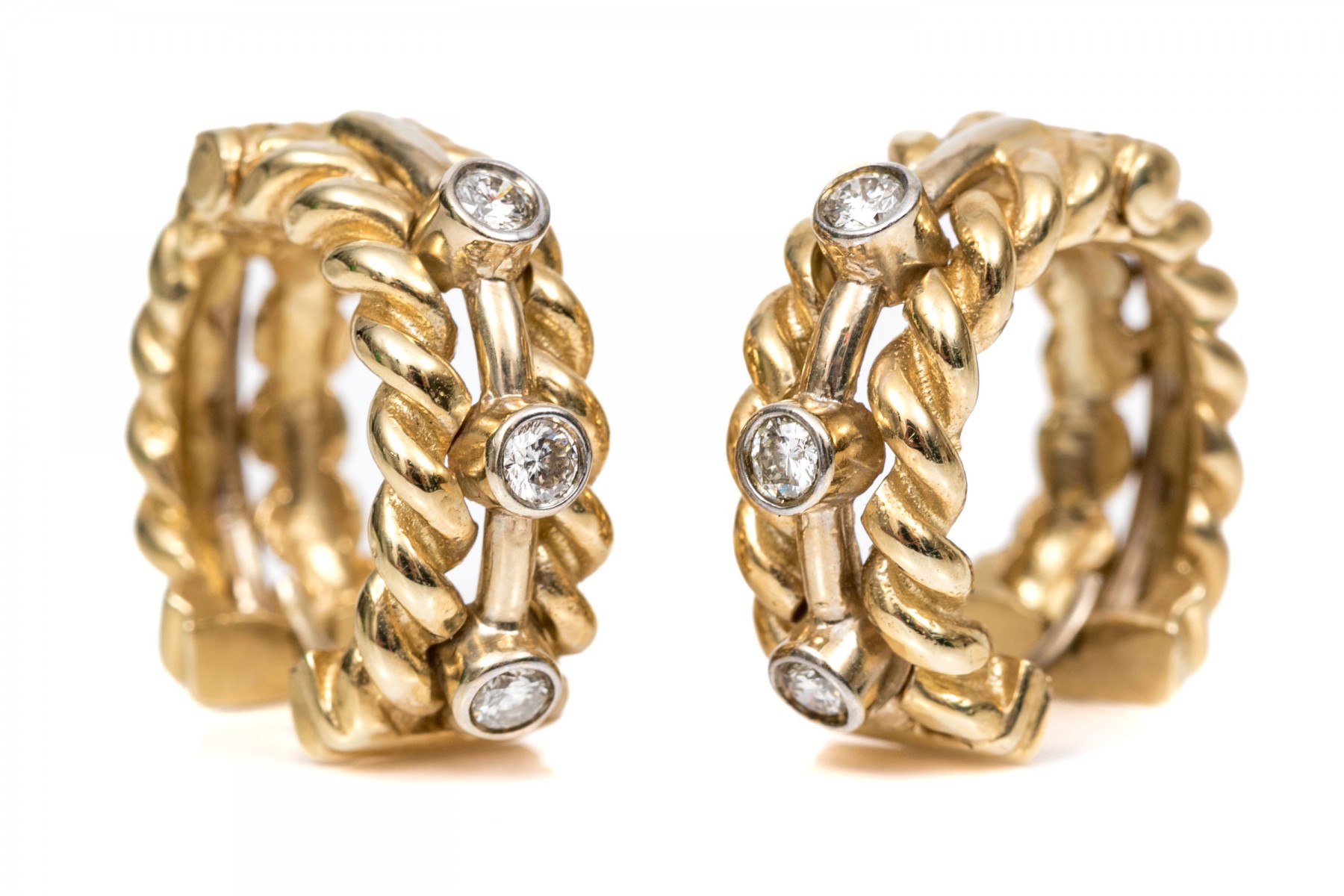 14k Yellow Gold Twisted Huggie Style Hoop Earrings, Diamond Set, Approximately 0.12 TCW #293407. Black Rock Galleries provides high end estate liquidation services through online estate auctions and a 50,000 sq ft designer showroom. estate liquidator, estate sale, online auction, antiques, fine art, liquidation, clean outs, auction, consignment, interior design, fine jewelry, collectibles, appraisals, estate appraisals, estate services, decor, furniture, furniture consignment, antique center, consignment shop. We offer appraisal services and specialize in fine art, jewelry, antiques and decorative arts. Sell with us. Black Rock Galleries is the tri-state's largest estate liquidator serving New England and the greater New York City area. We are the trusted source for expert appraisals, auction services, estate sales, and consignments. Black Rock Galleries is the east coast's largest and most trusted estate liquidator, with locations in Connecticut, greater Boston, MA and Raleigh, NC, Fairfield, Southport, Apex, TX. We are the best source for expert appraisals, auction services, estate sales and consignments. We have served thousands of families and estates with compassion, professionalism and expertise. BRG works with attorneys, executors, realtors and families to bring the greatest return on personal and estate property in the current market. Our unique combination of services make us the easy choice to get the job done in a timely and stress-free manner. We are with you from the initial consultation to the final clean out. Our house-built online auction software platform offers clients a dynamic approach to liquidating their personal property. This venue is most successful in bringing the best return with the least amount of disruption for our clients. See our services page for a complete description of this offering. 14k Yellow Gold Twisted Huggie Style Hoop Earrings, Diamond Set, Approximately 0.12 TCW #293407