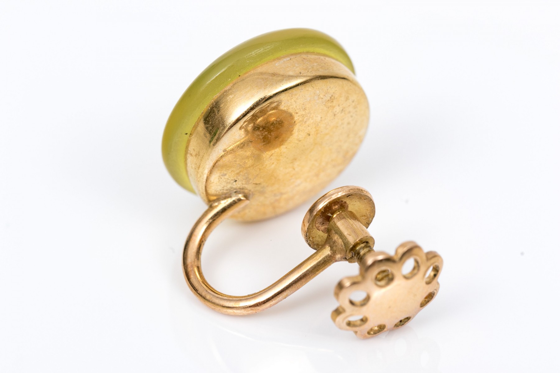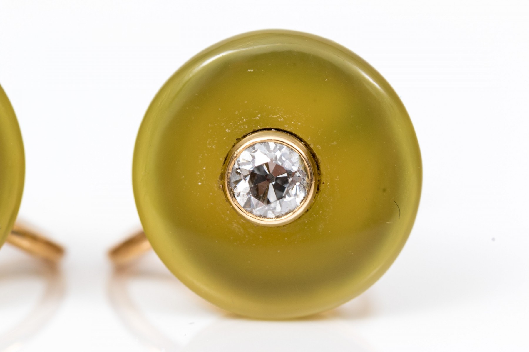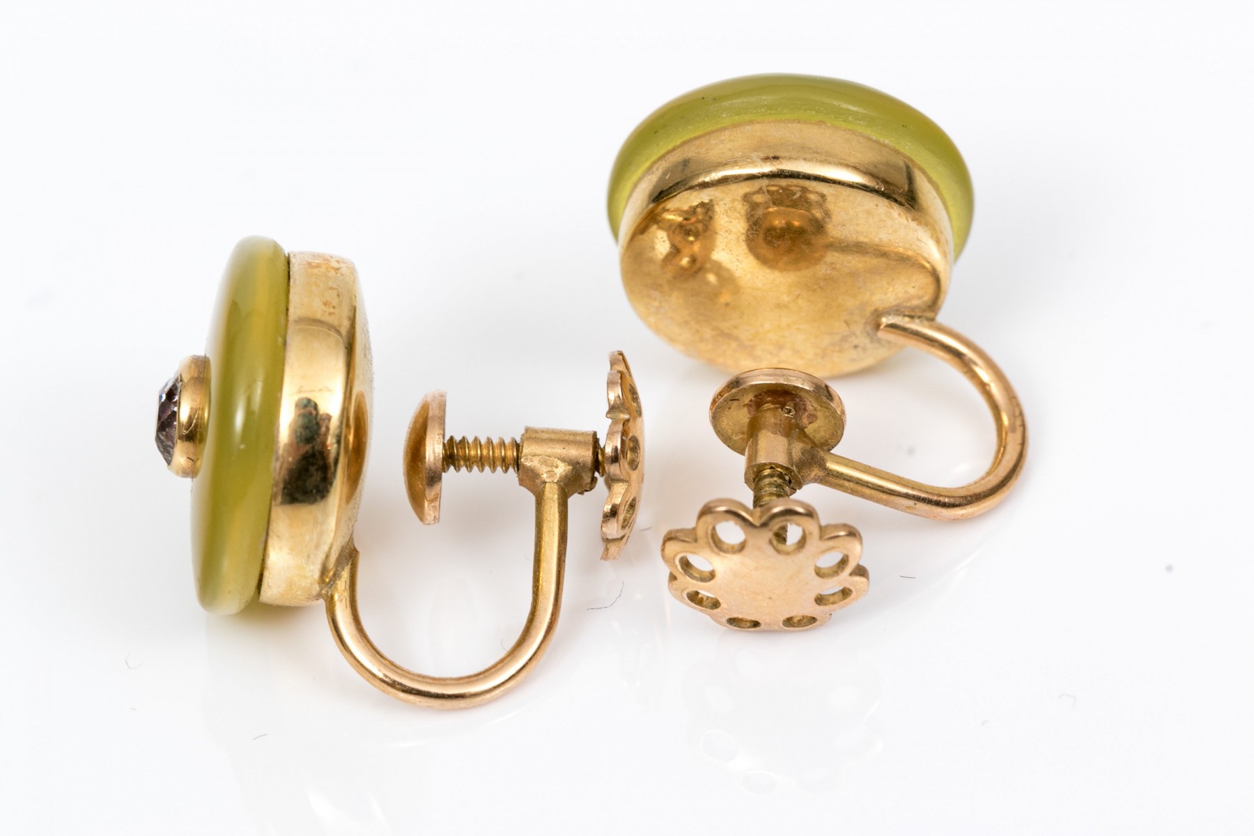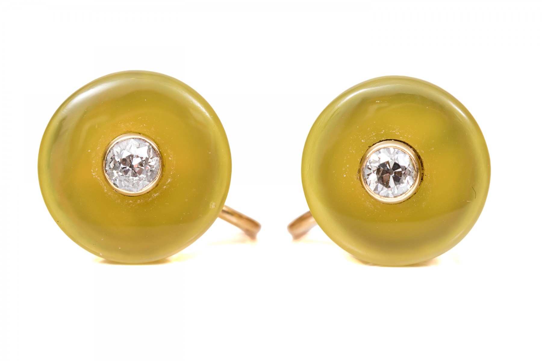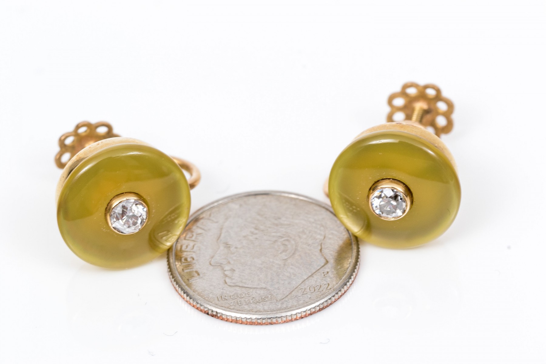 14k yellow gold vintage bakelite and diamond set earrings, app. 0.28 TCW, bezel set. The earrings are finished with no posts and screw style backs