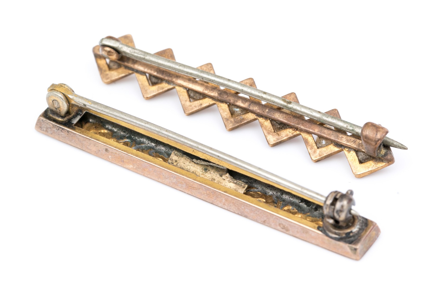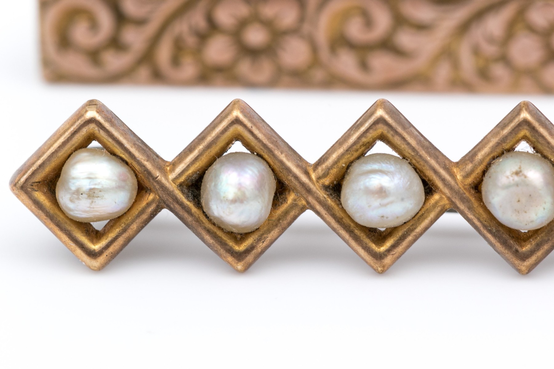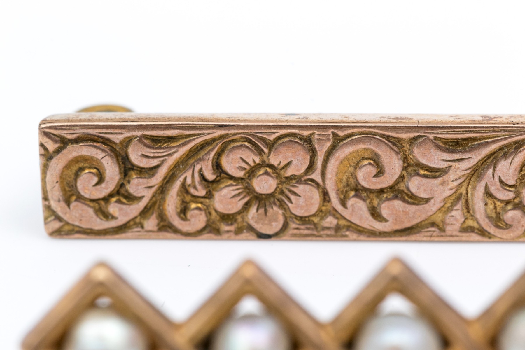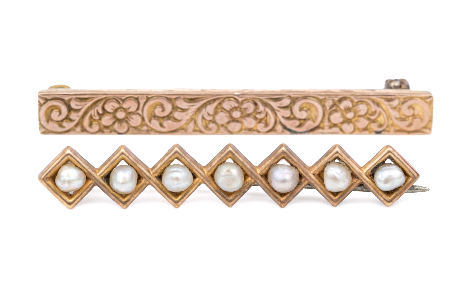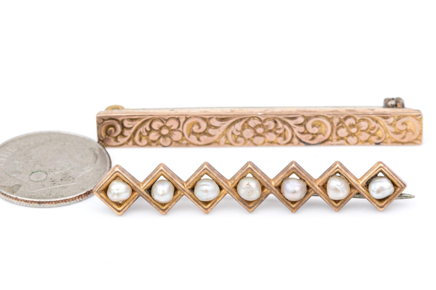 14k yellow gold vintage chased and seed pearl bar pins, steel pin stems
