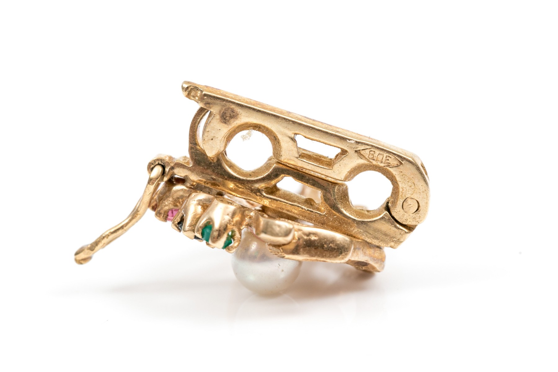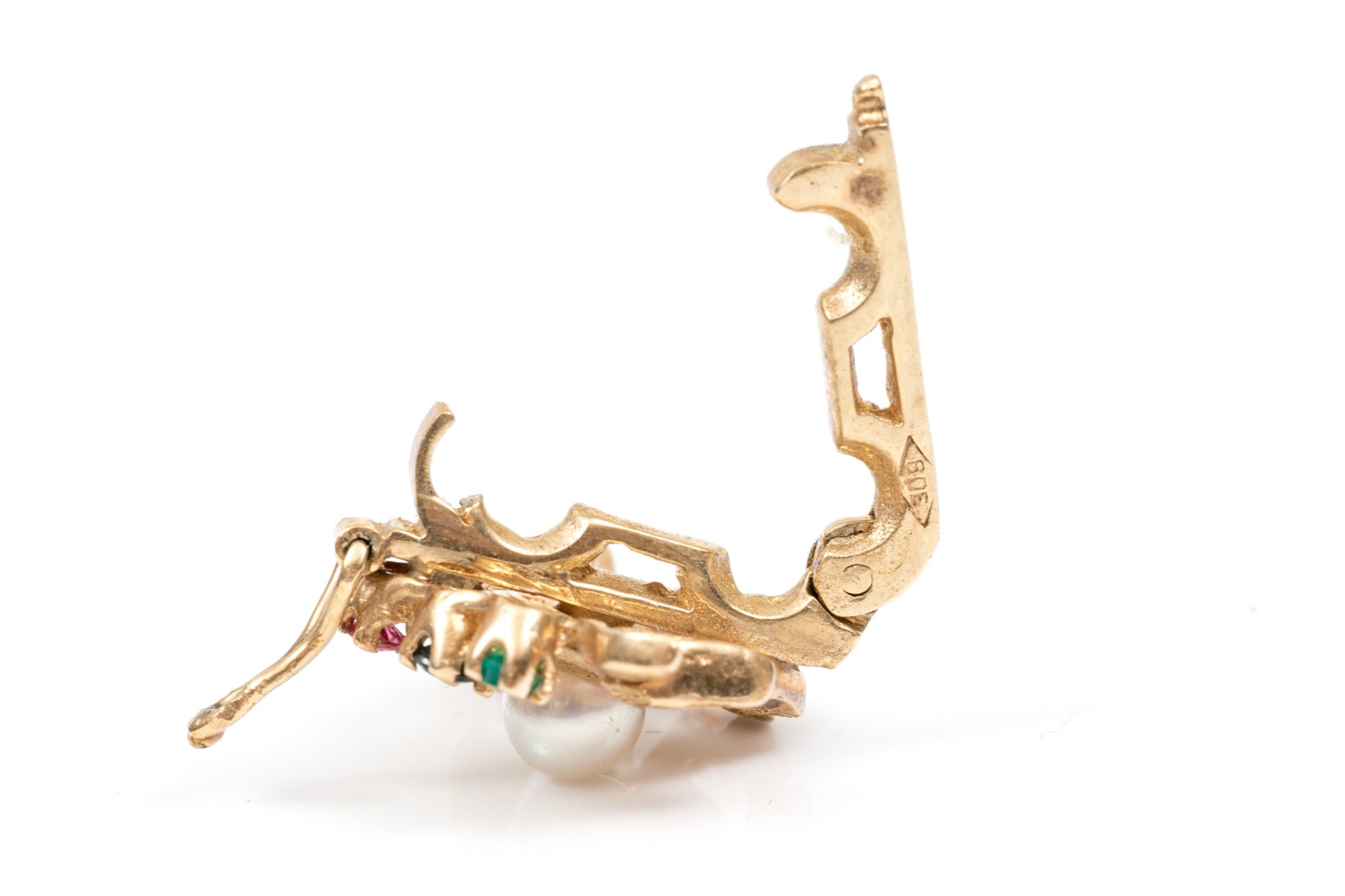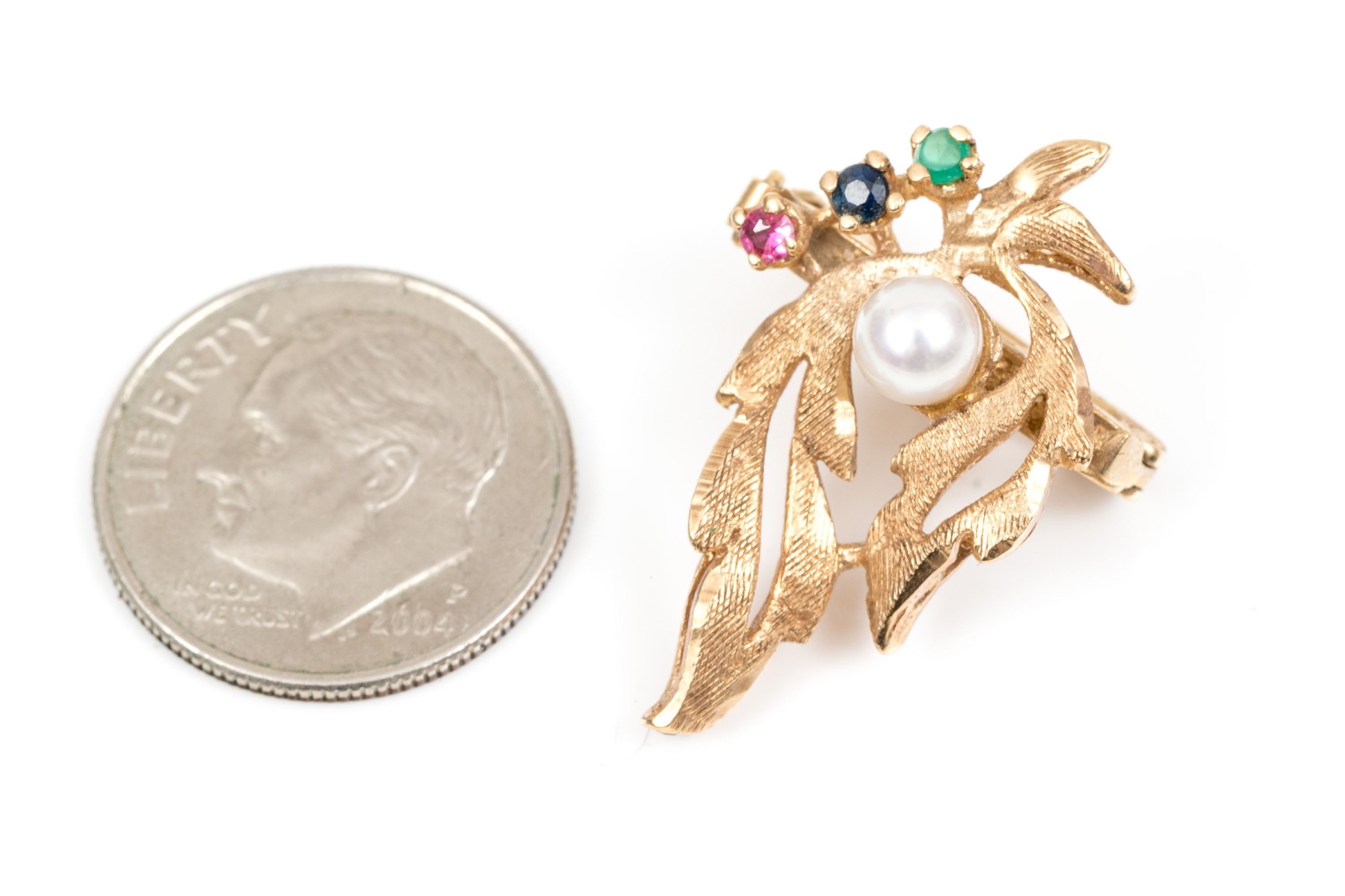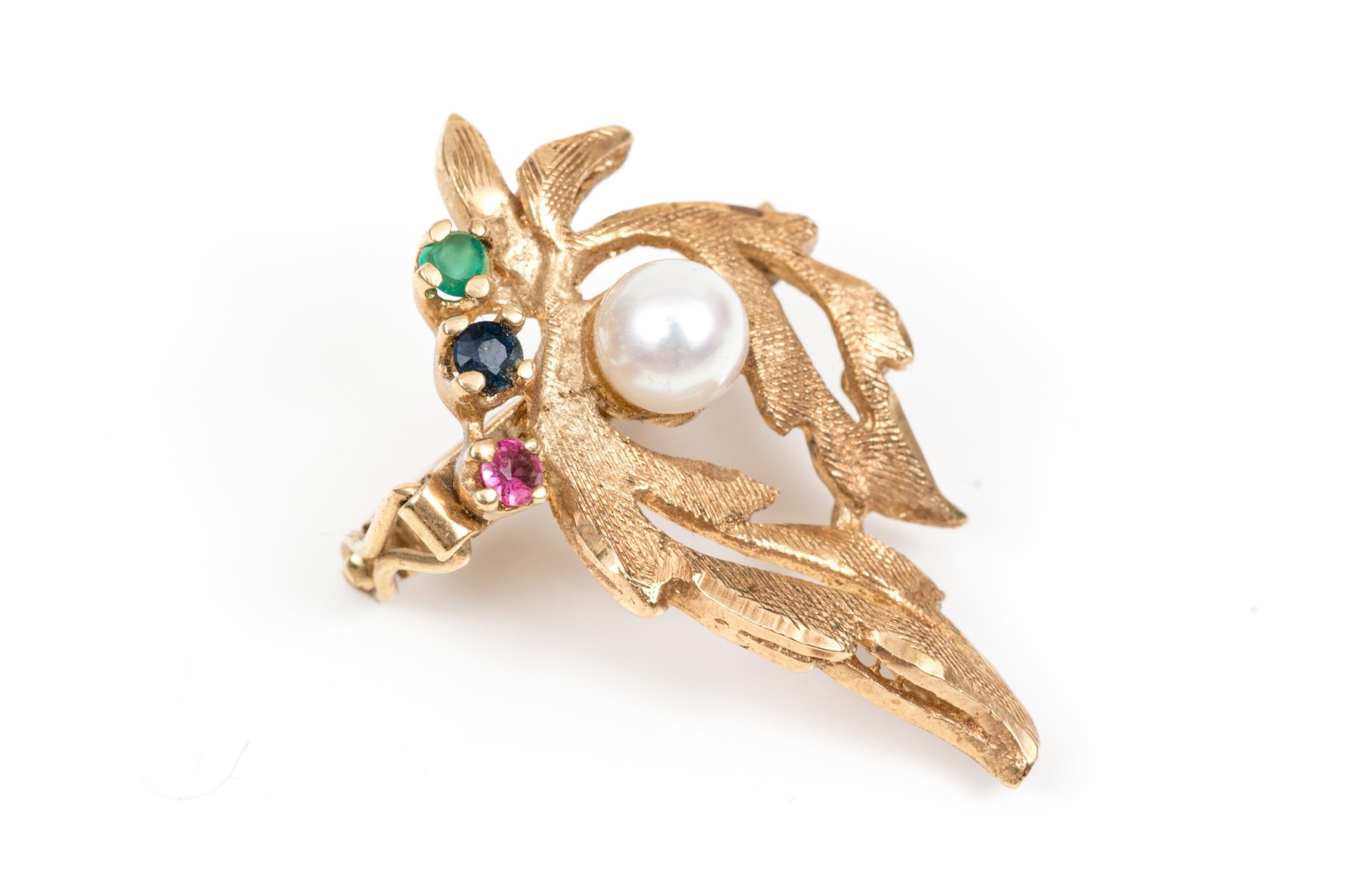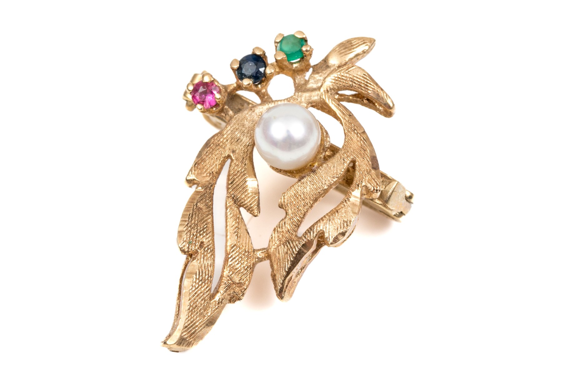 14k yellow gold vintage cultured pearl, ruby, sapphire, emerald bead enhancer, prong set, finished with a figure eight style clasp.