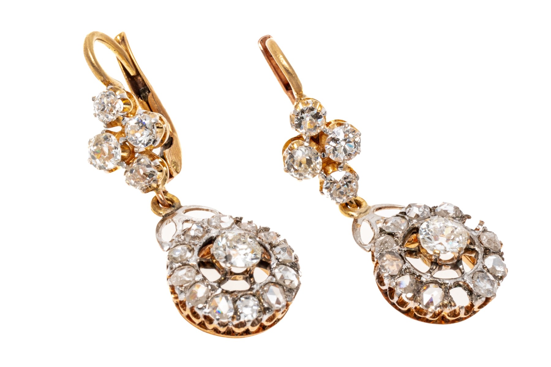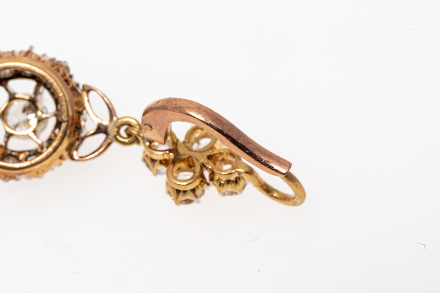 14k yellow gold vintage diamond drop cluster pendant earrings, app. 0.76 TCW, finished with wires and lever style backs