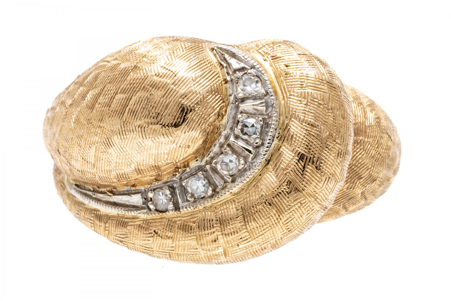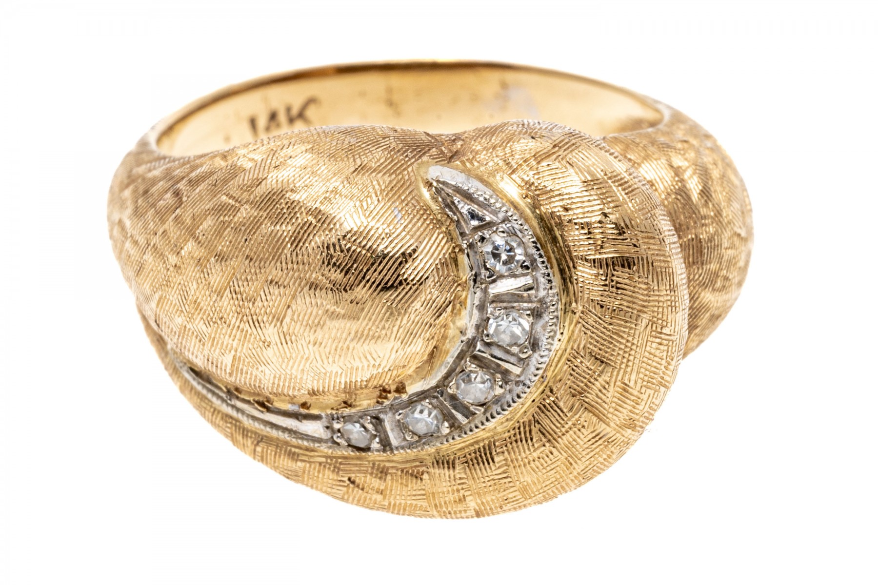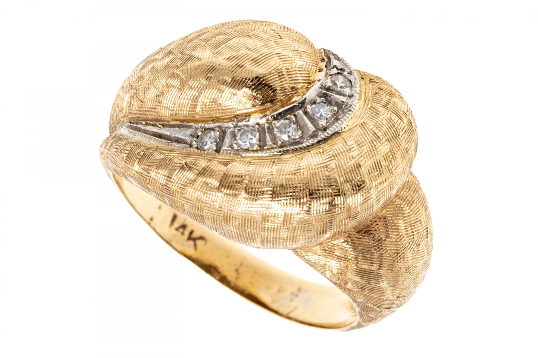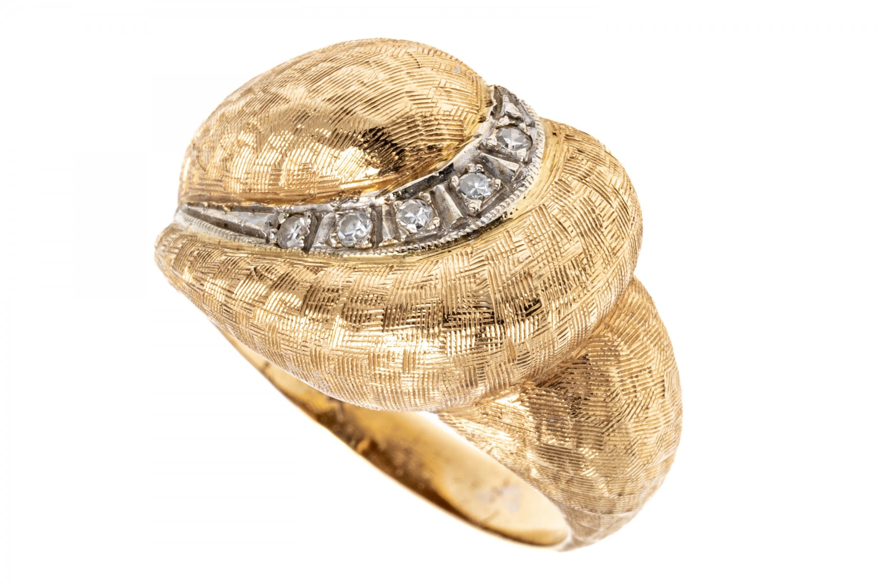 14k yellow gold vintage diamond swirl dome ring, Florentine finished, app. .03 TCW