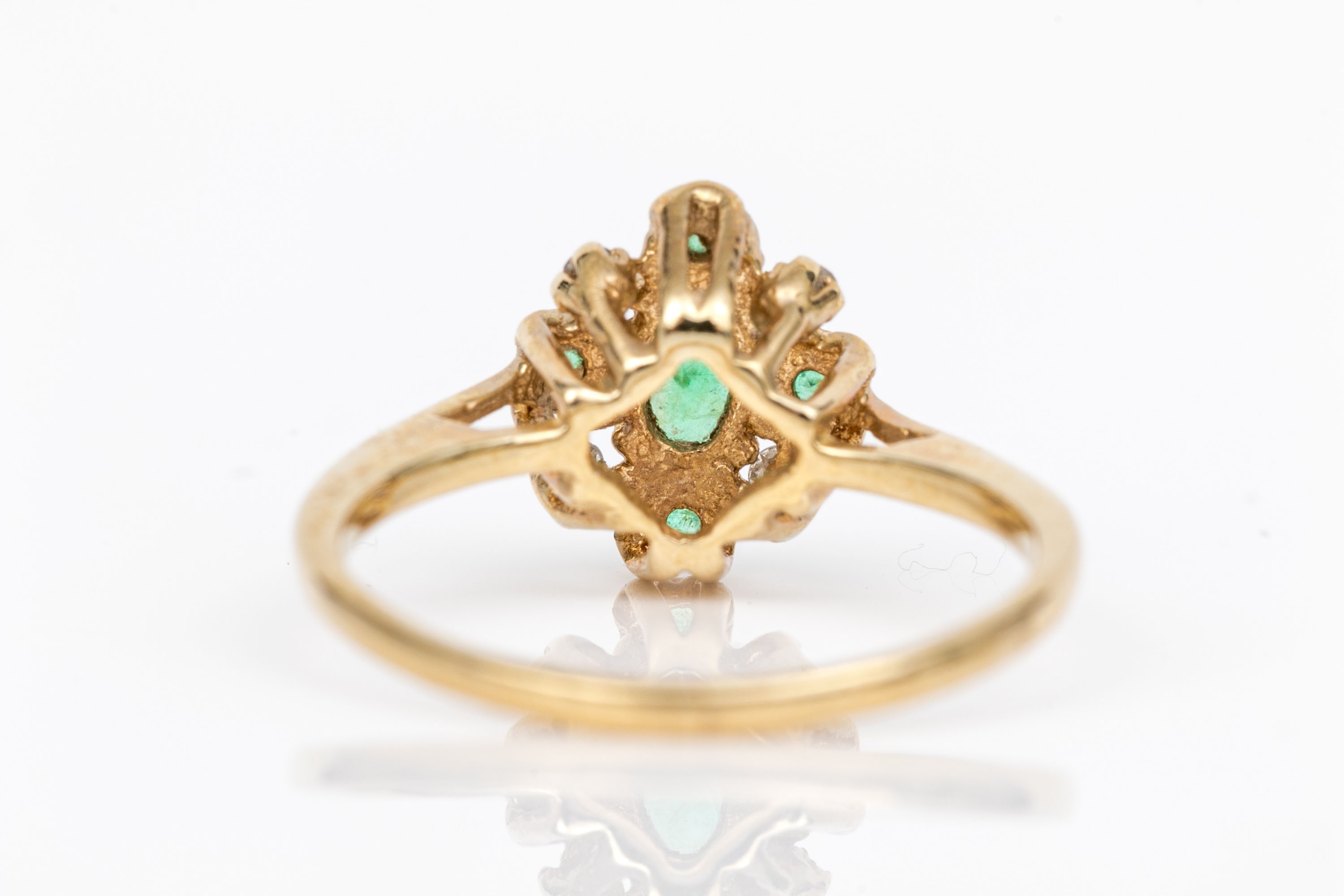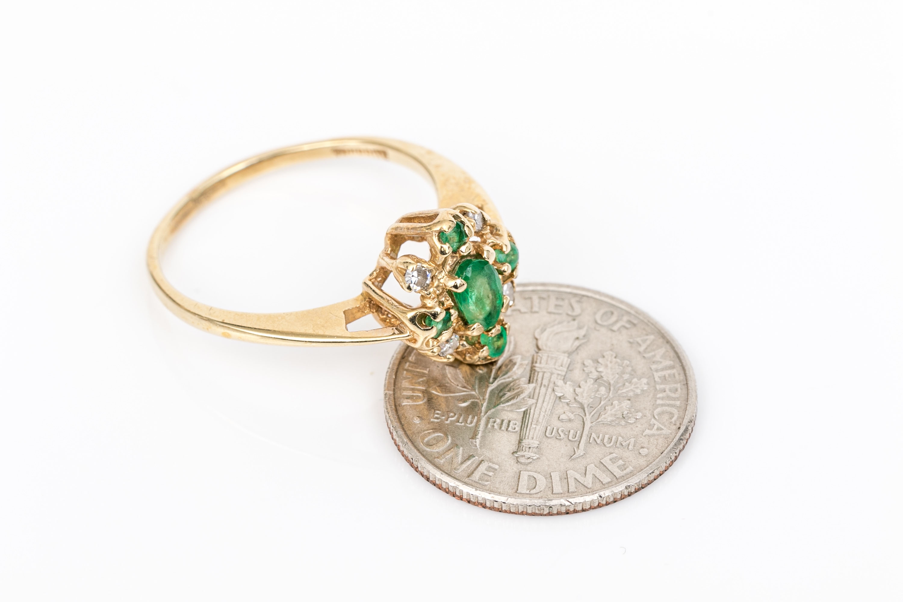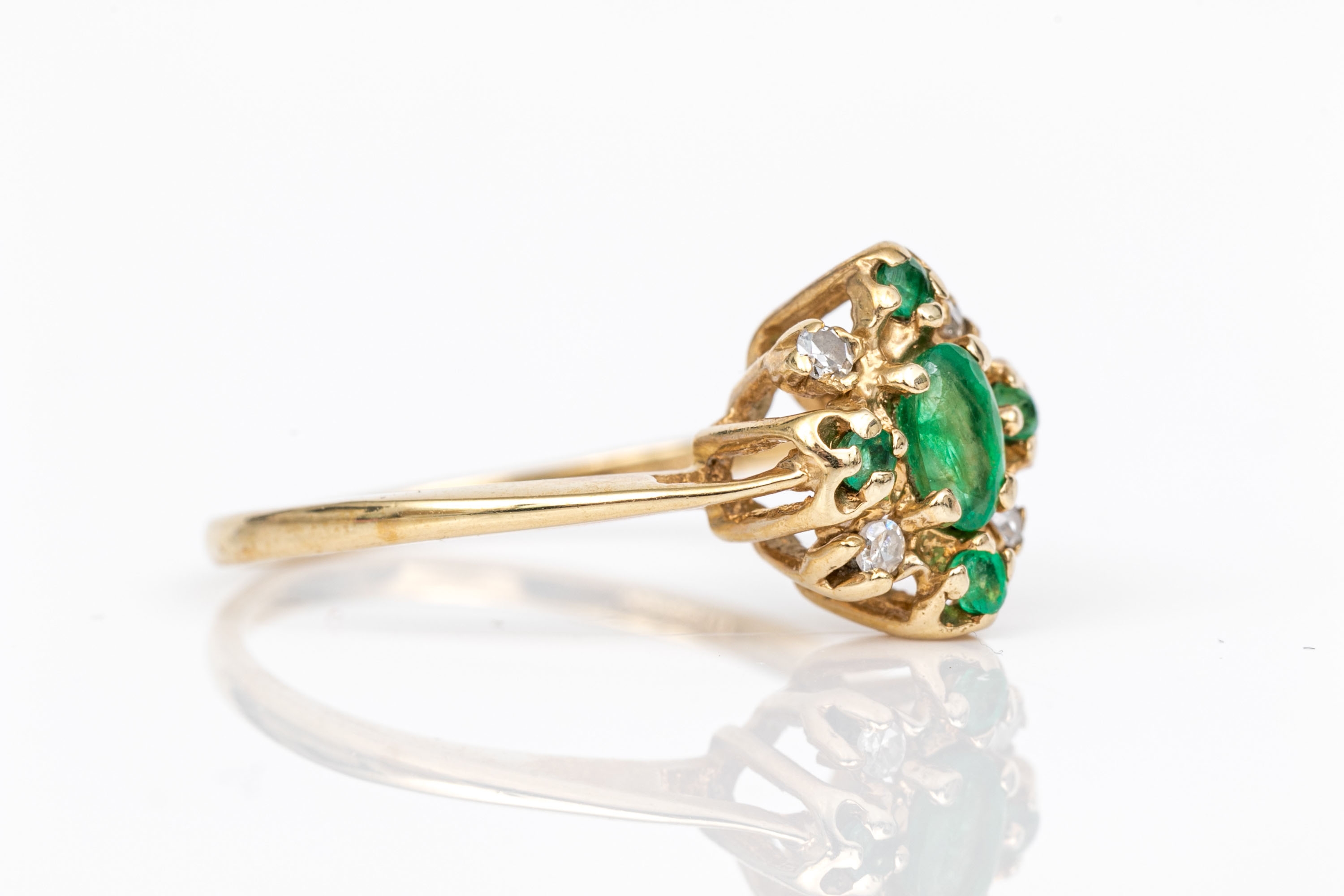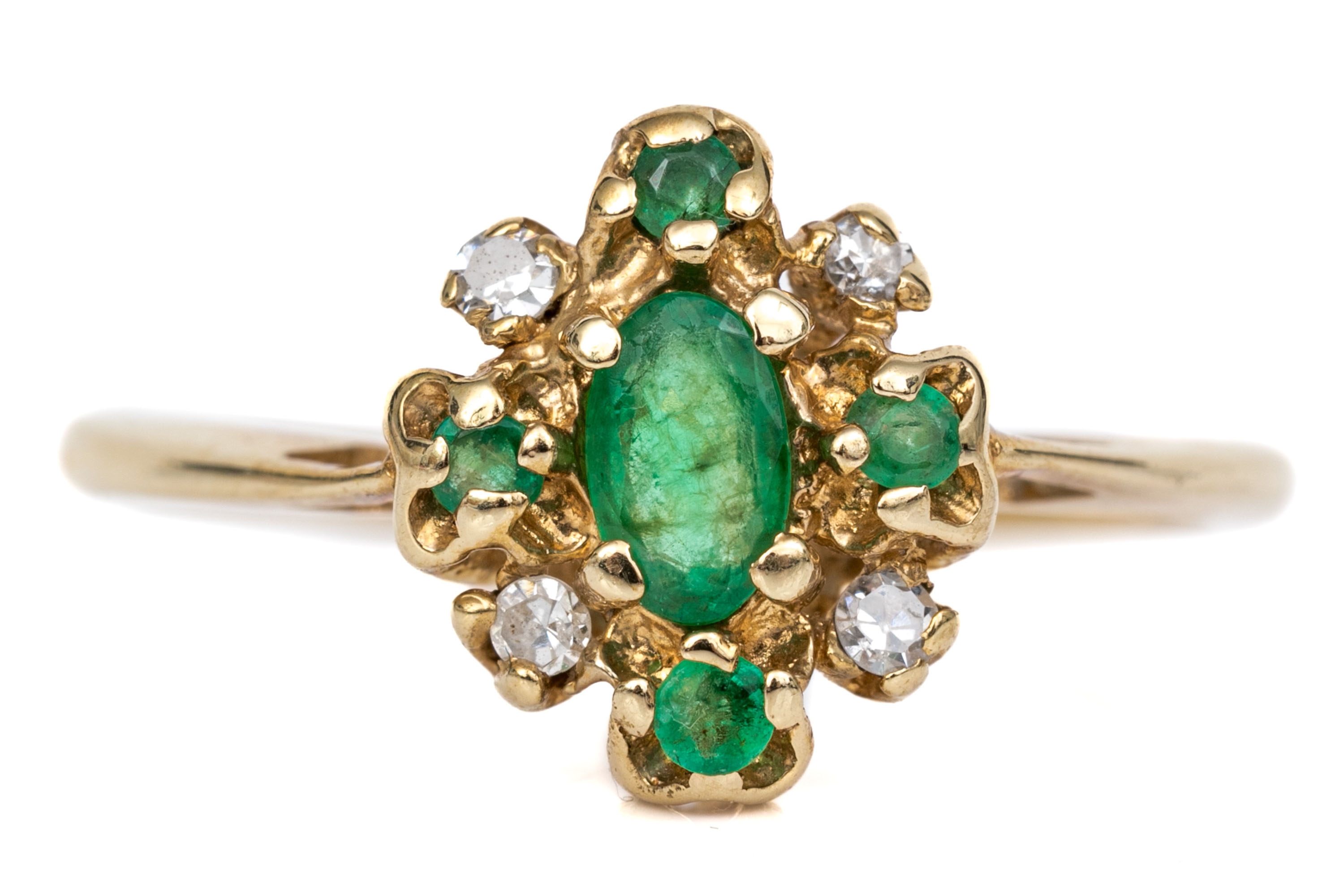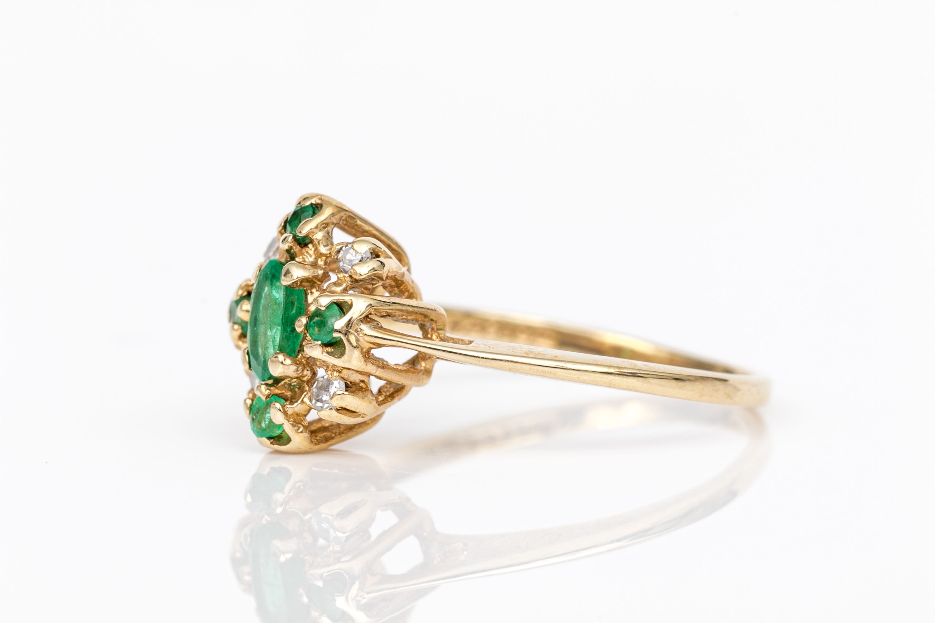 14k yellow gold vintage emerald and diamond cluster ring, app. 0.04 TCW, size 5.75