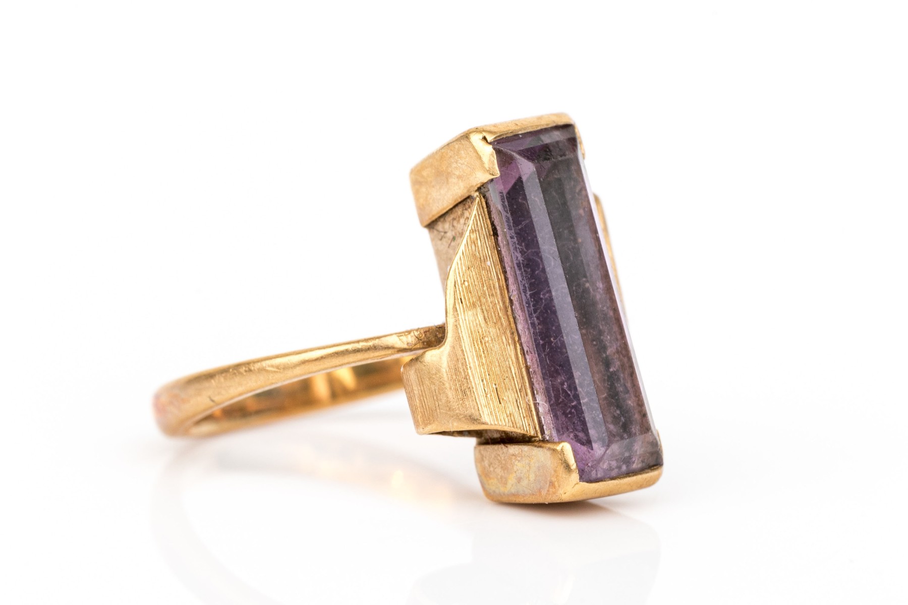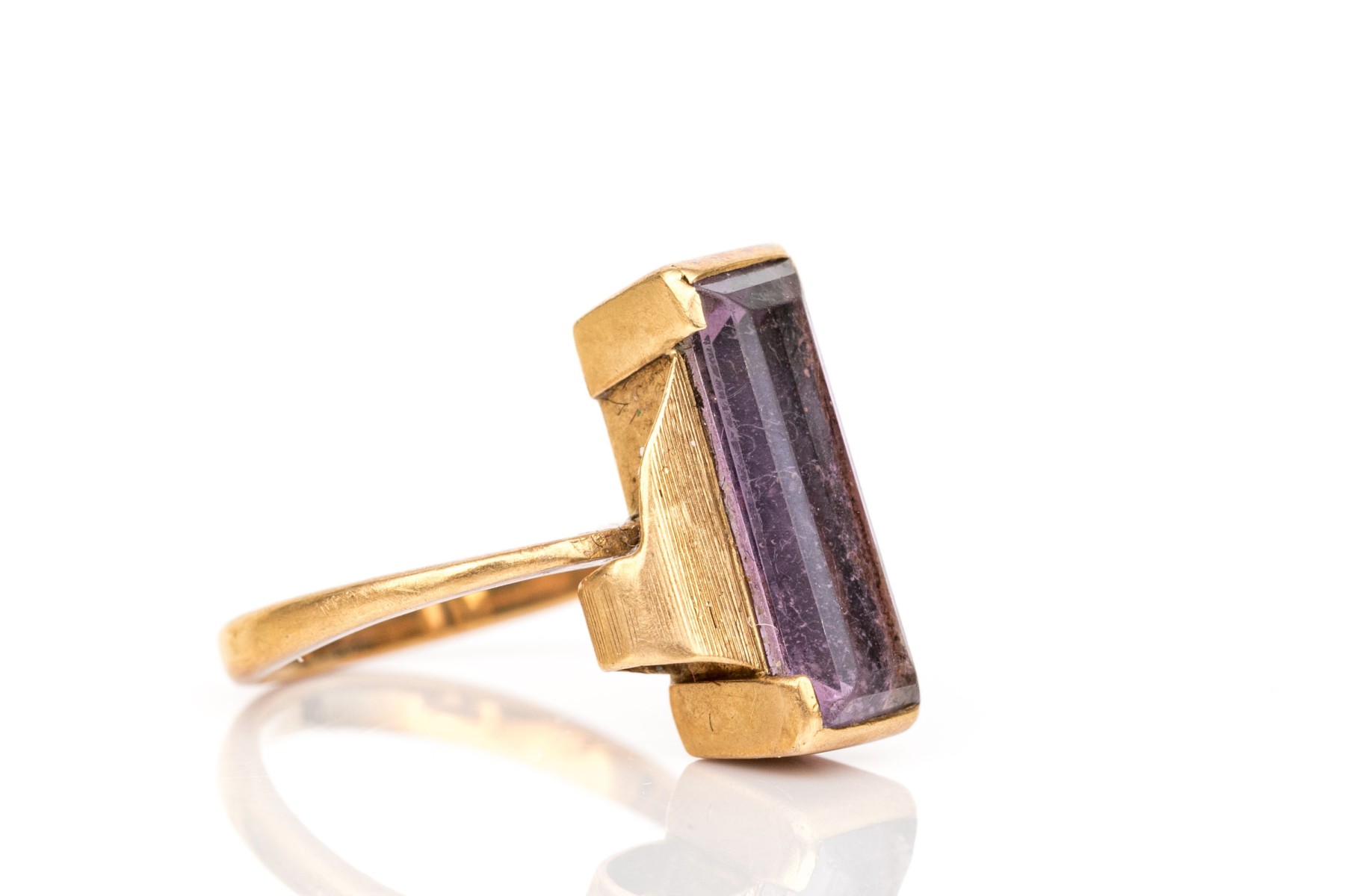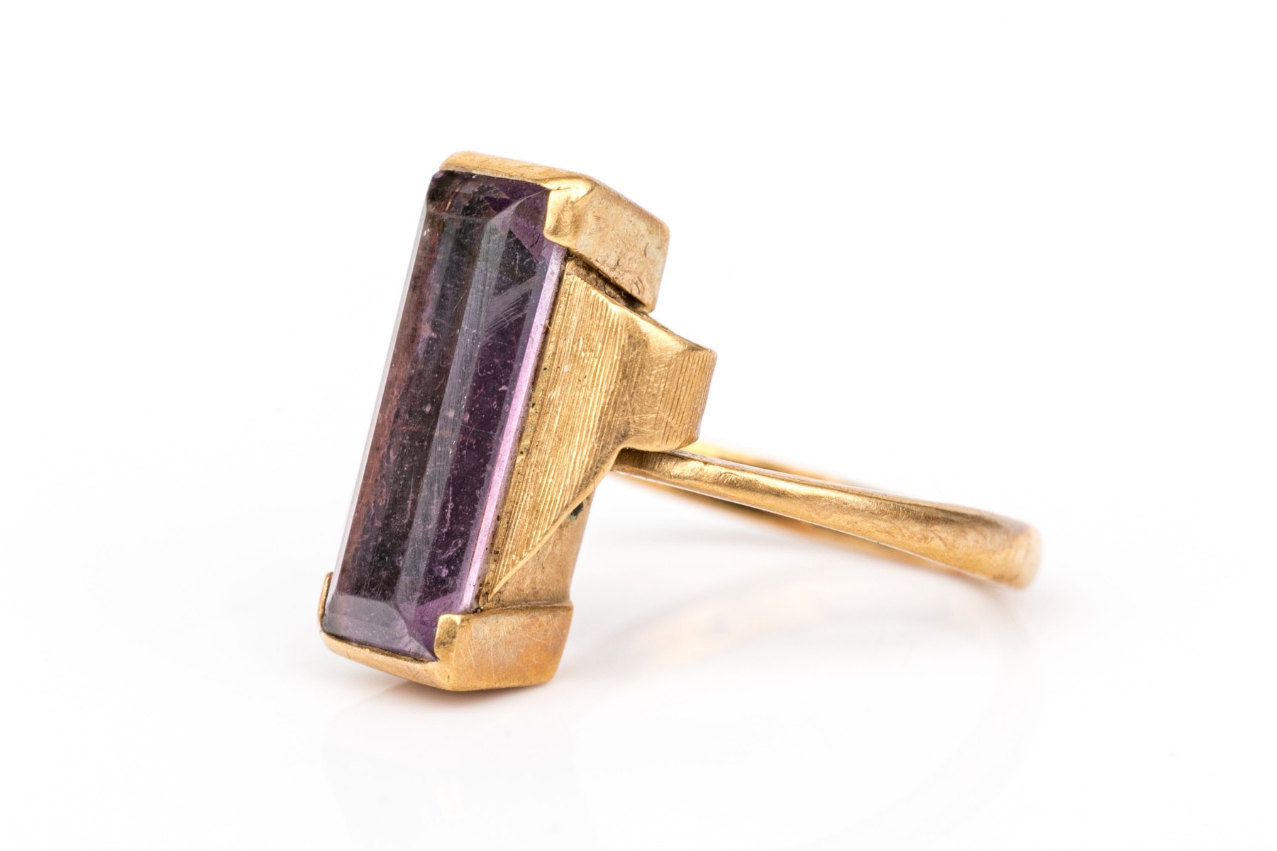 14k yellow gold vintage emerald cut synthetic purple spinel ring, size 3.75