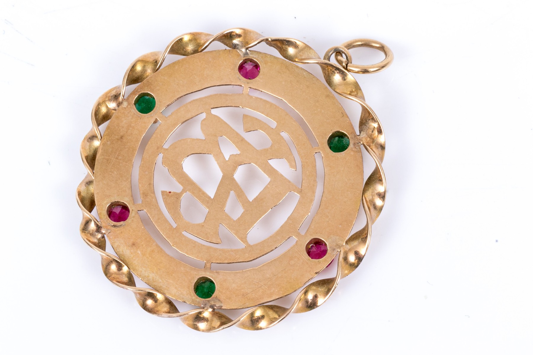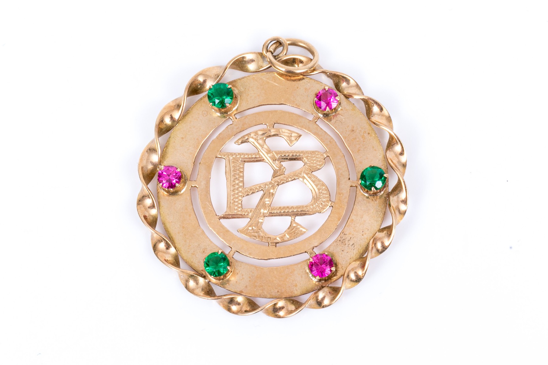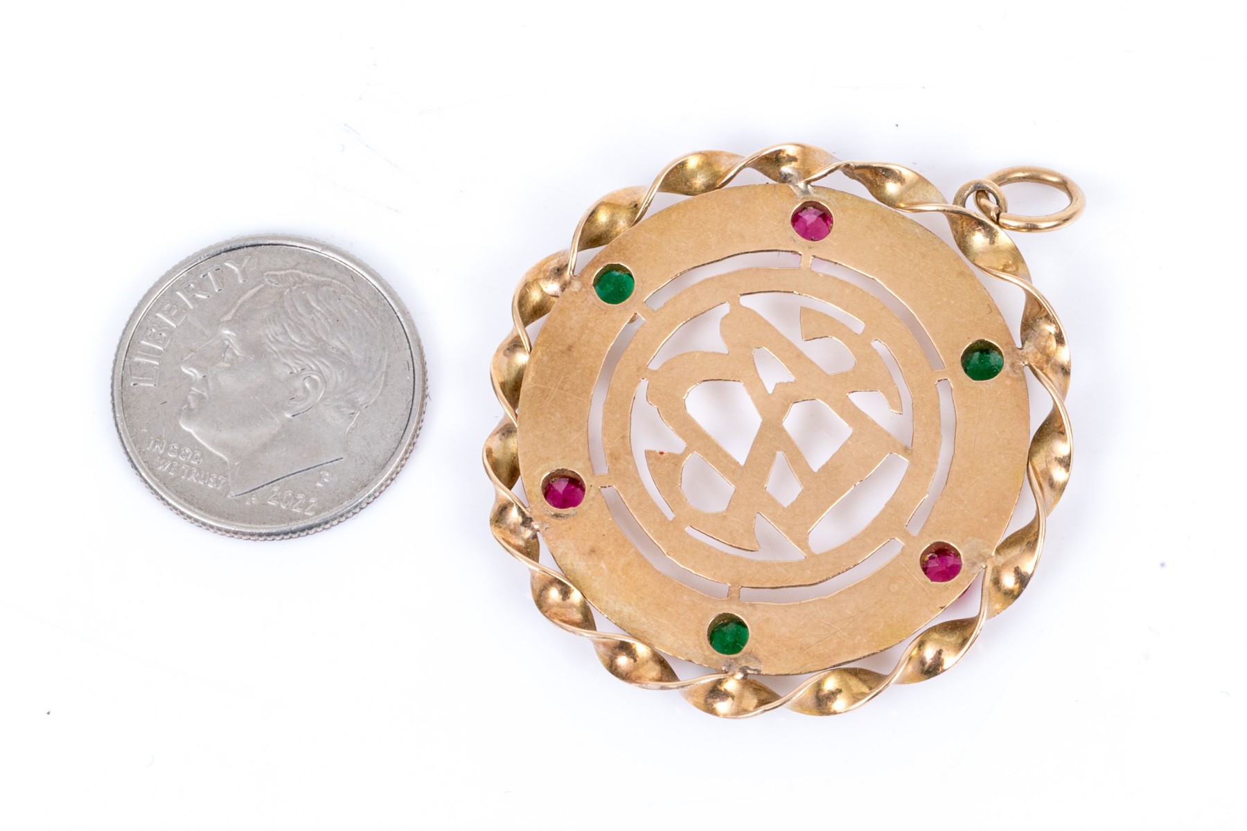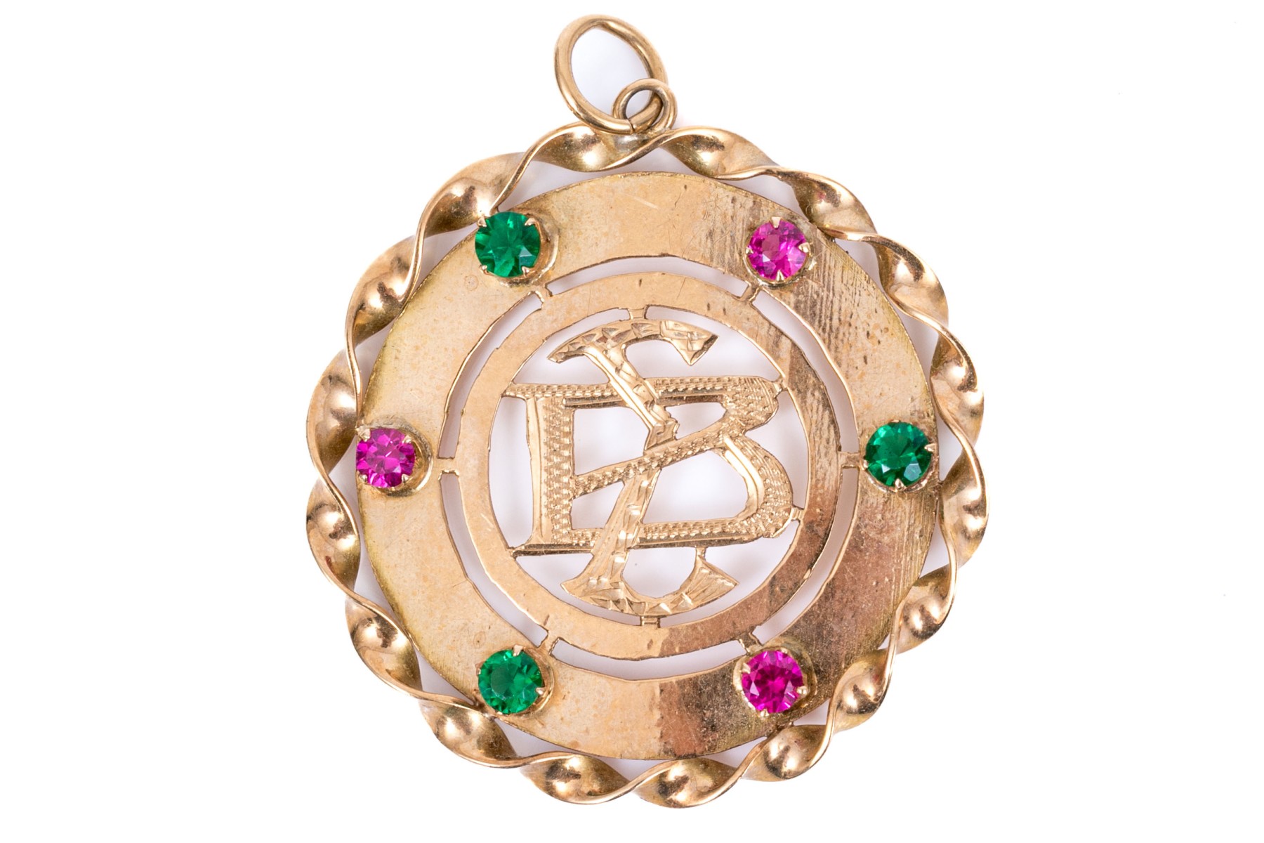 14k yellow gold vintage monogrammed pendant, twisted border, finished with synthetic stones and a jump ring style bale
