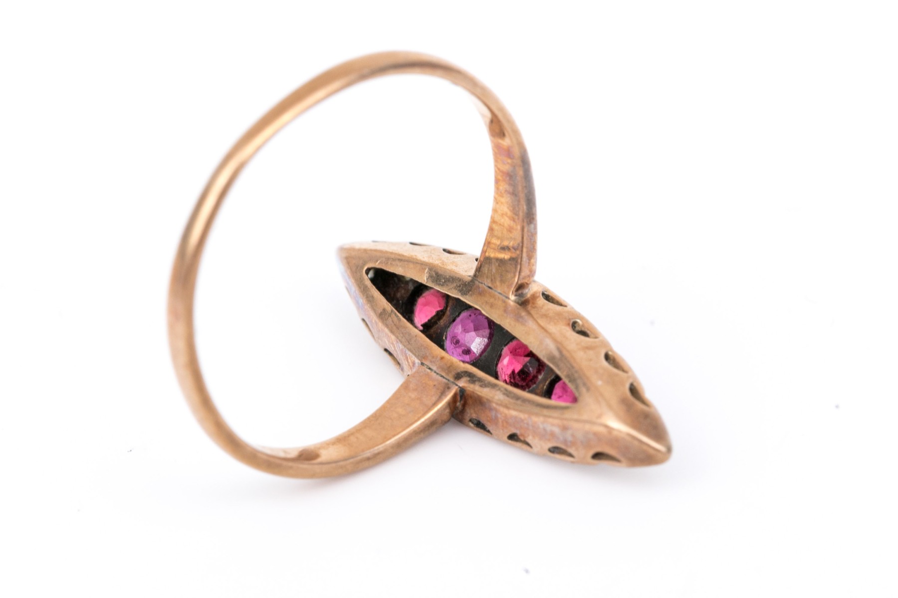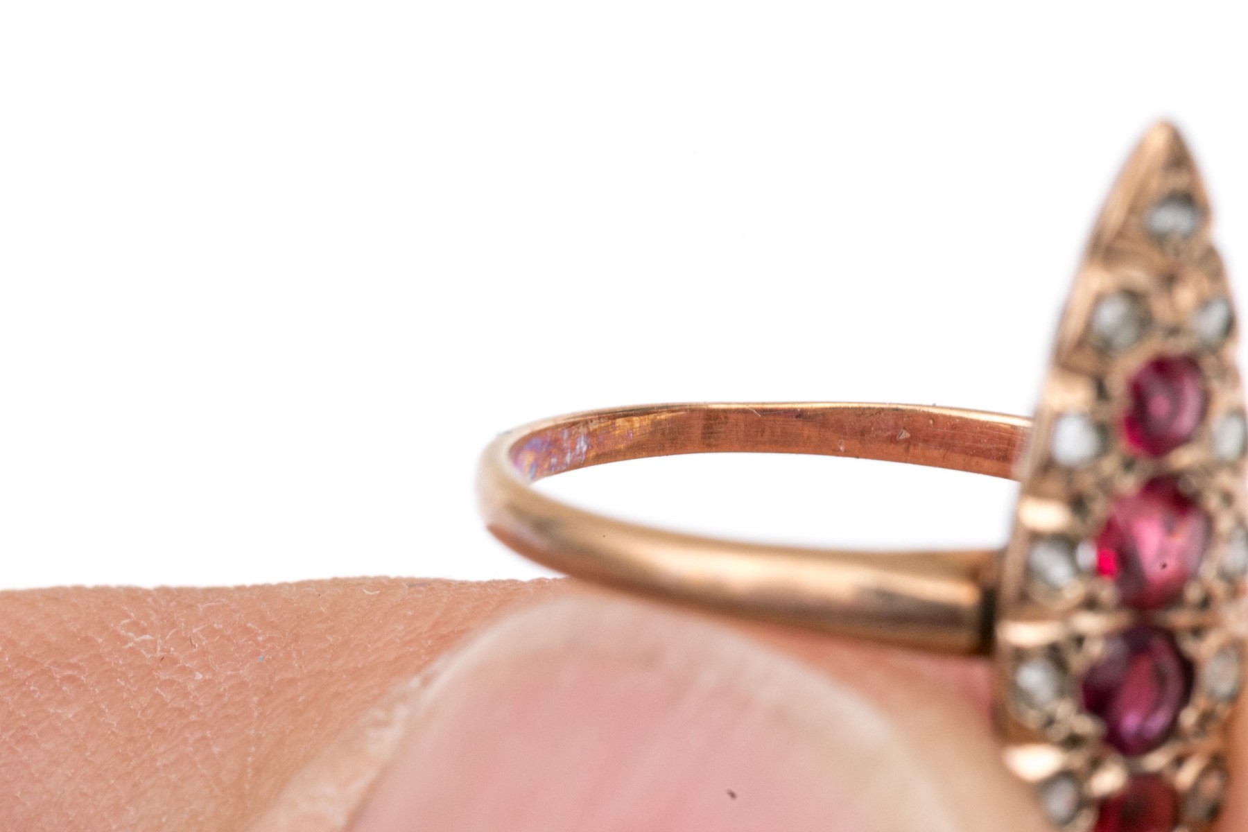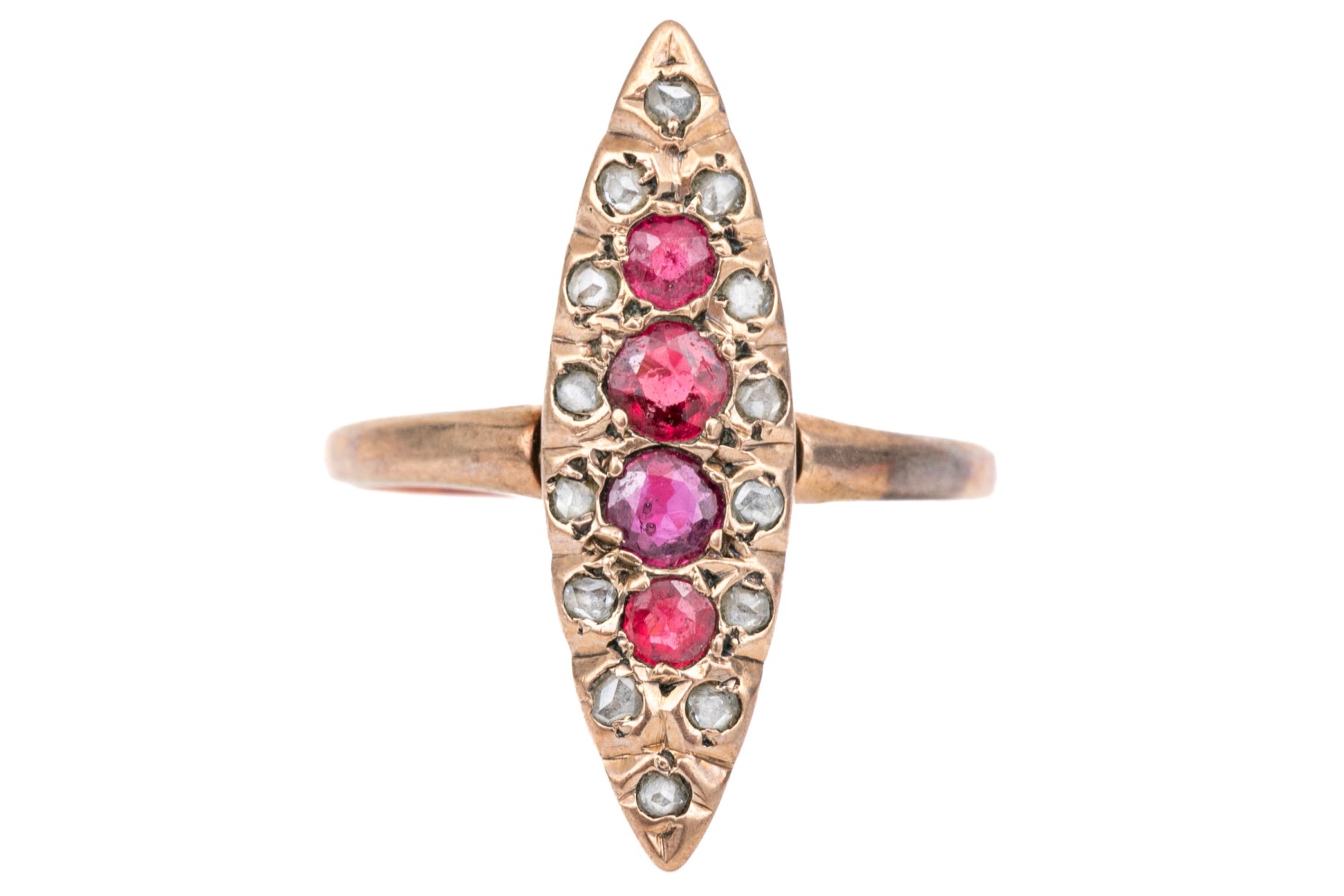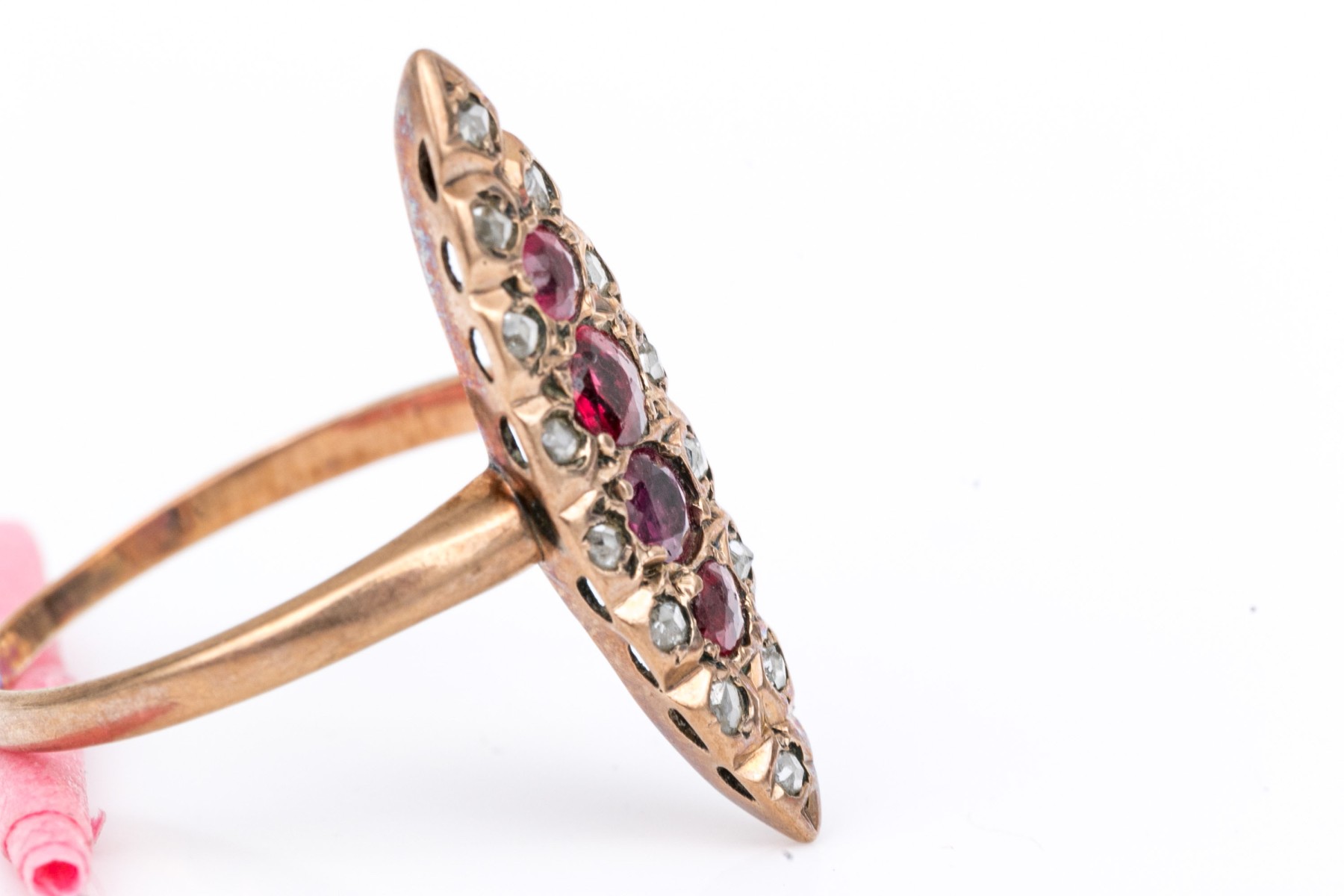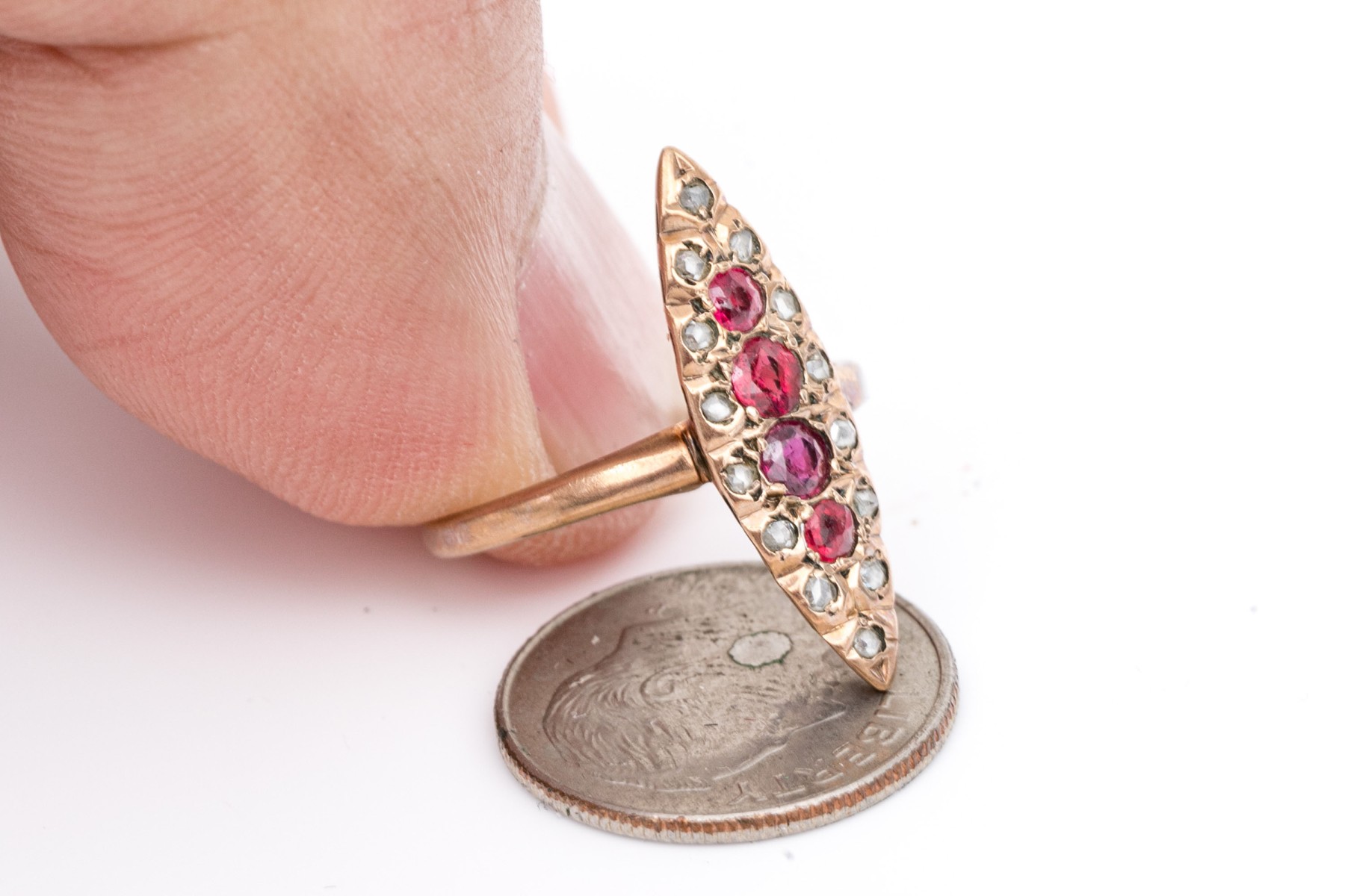 14k yellow gold vintage navette profile macle cut diamond and ruby ring , size 2.75