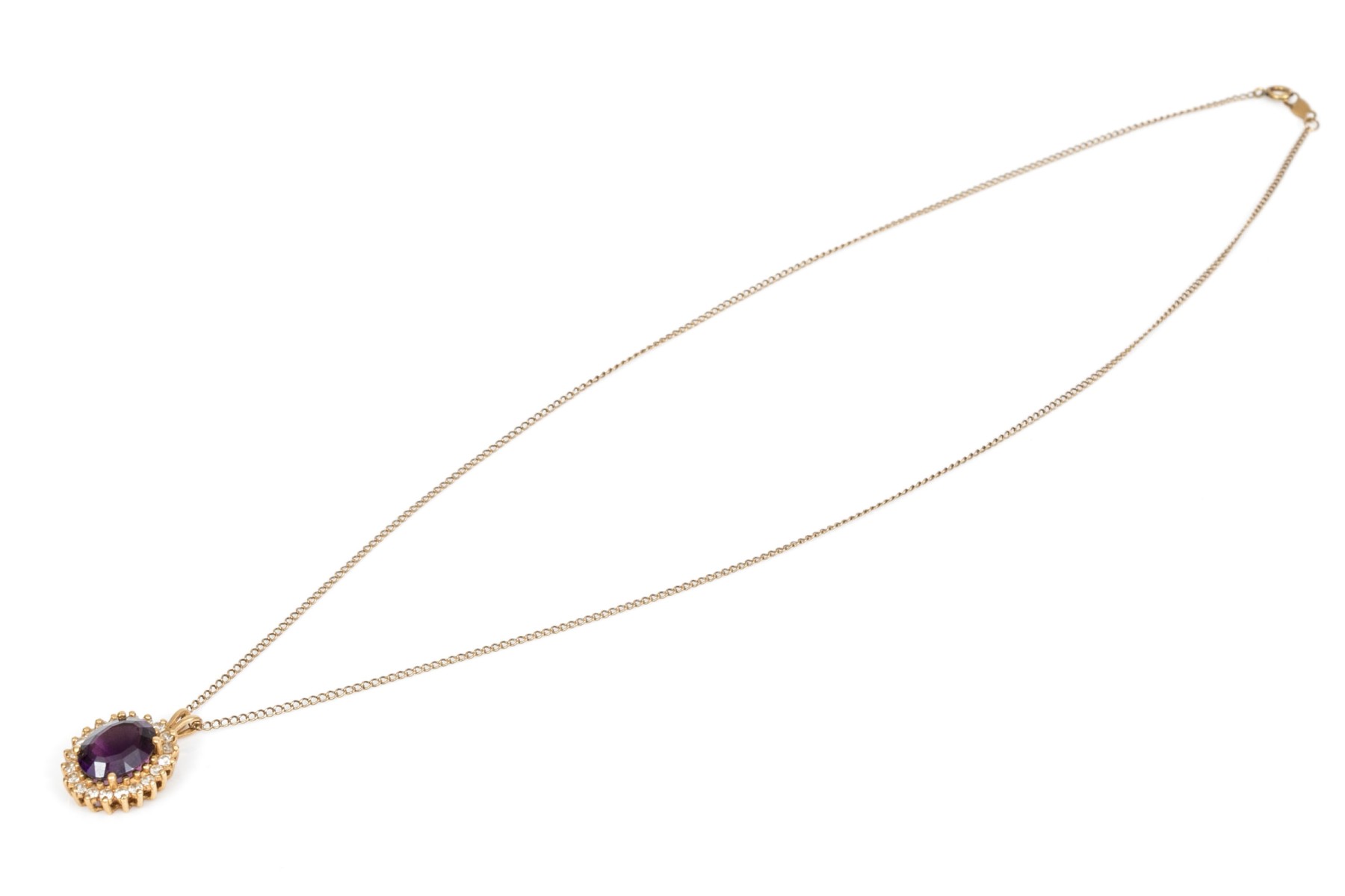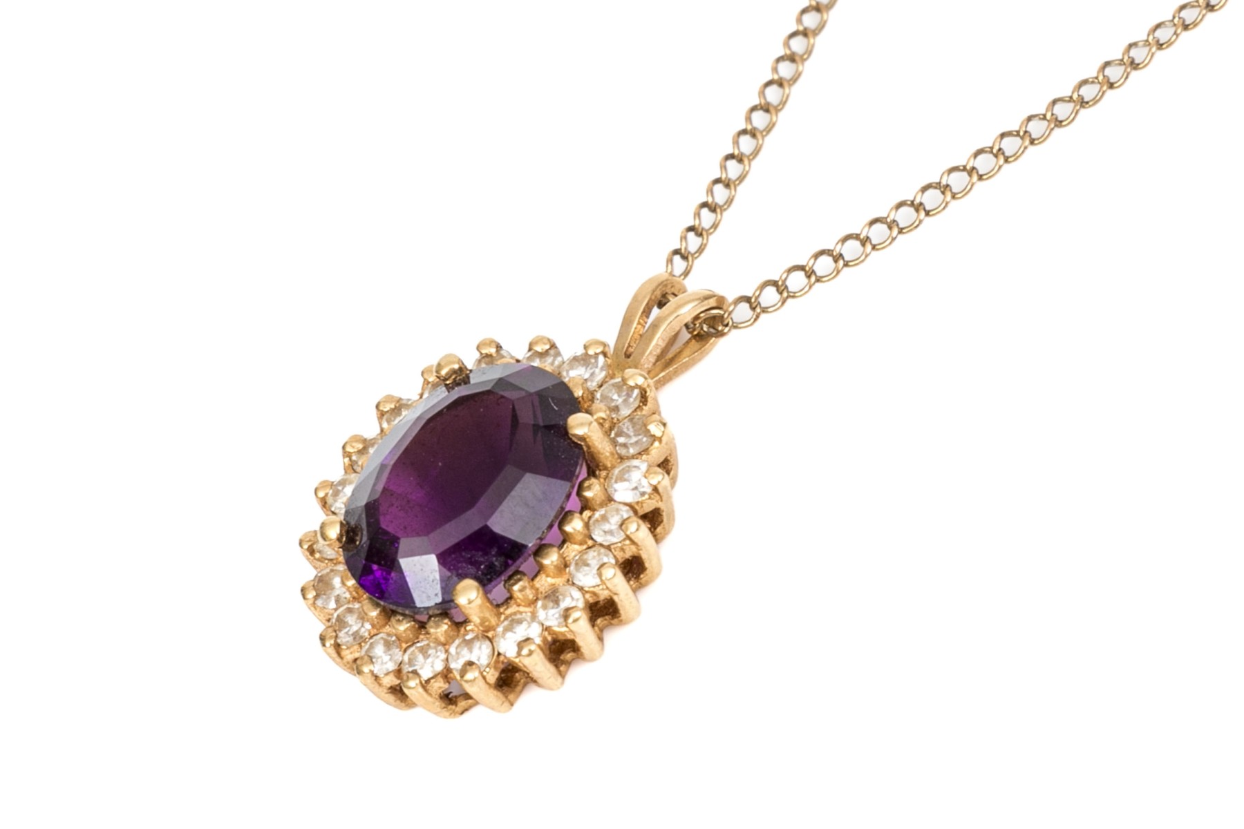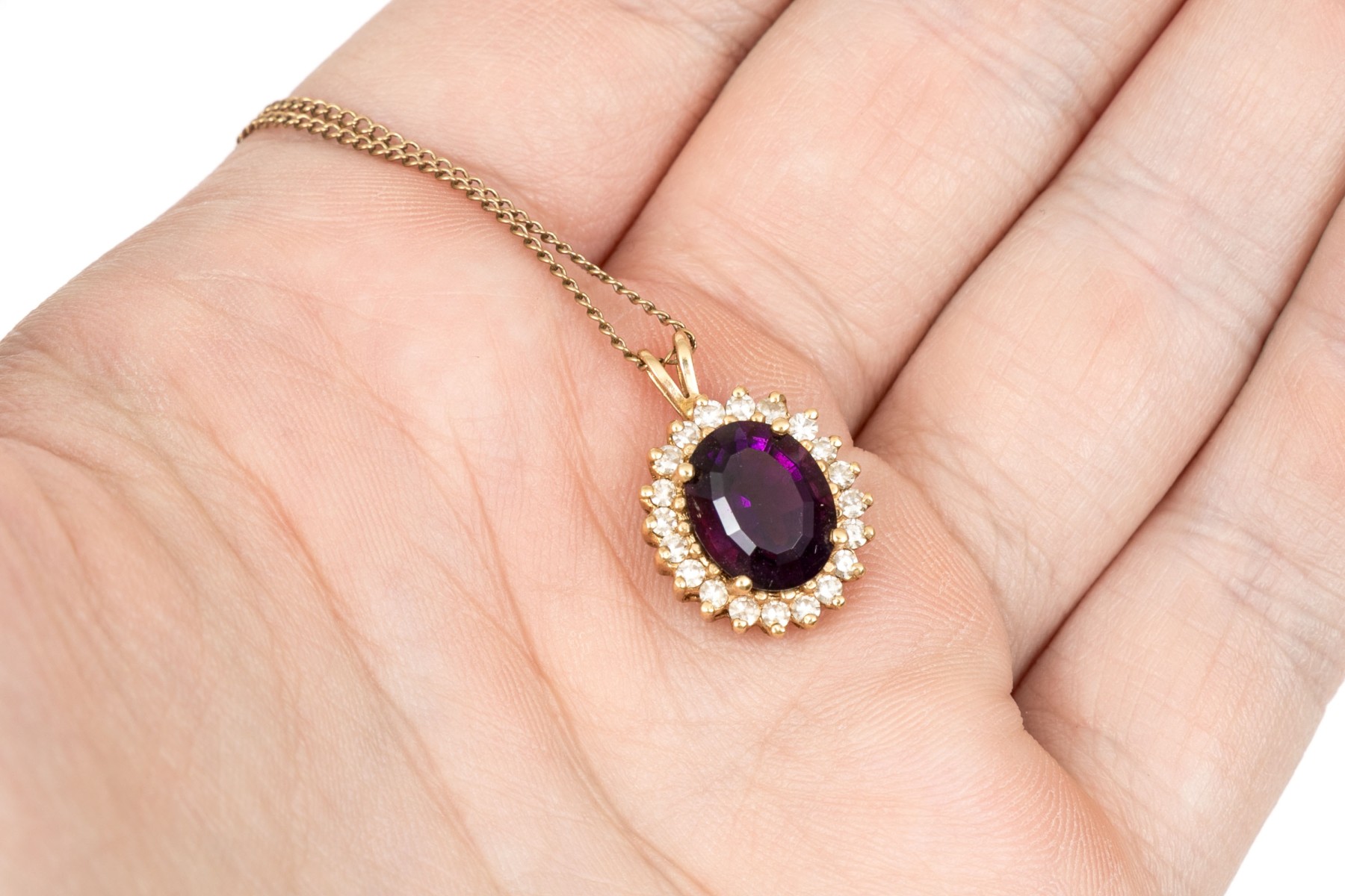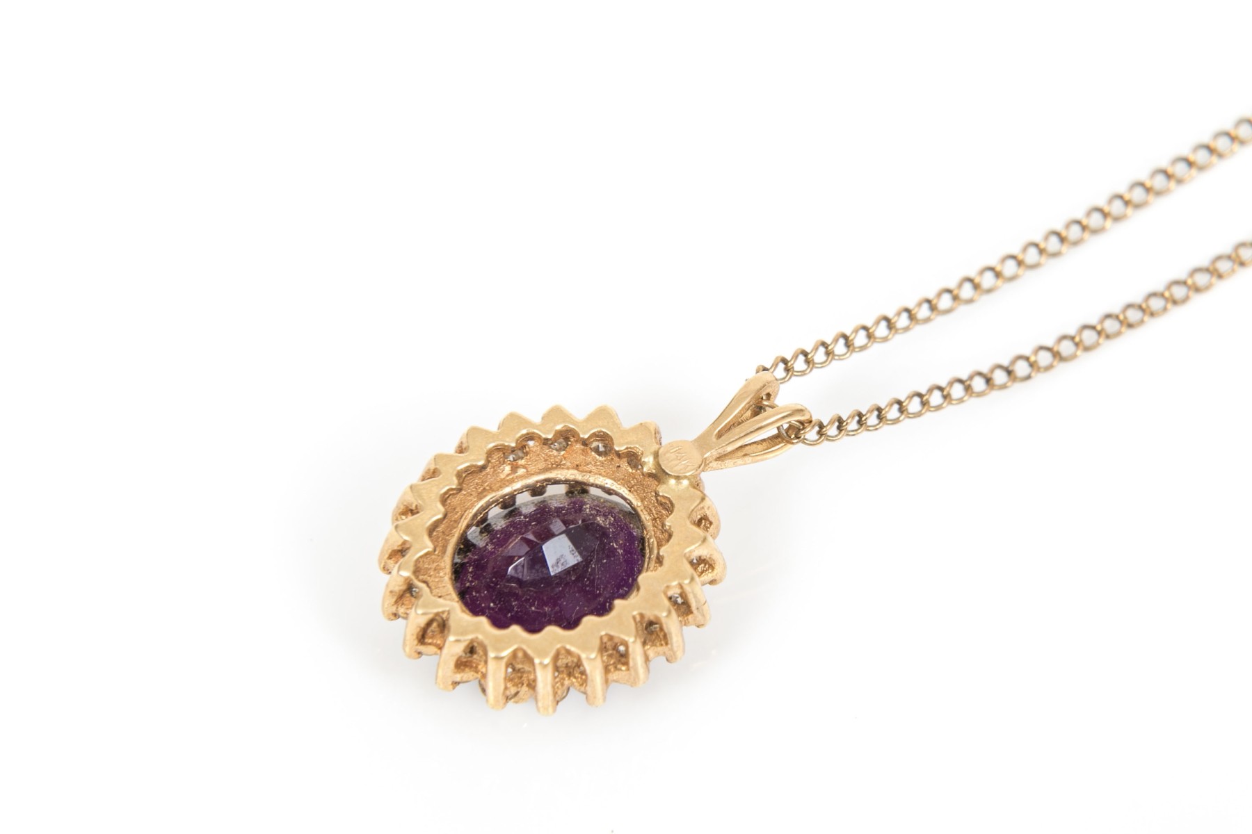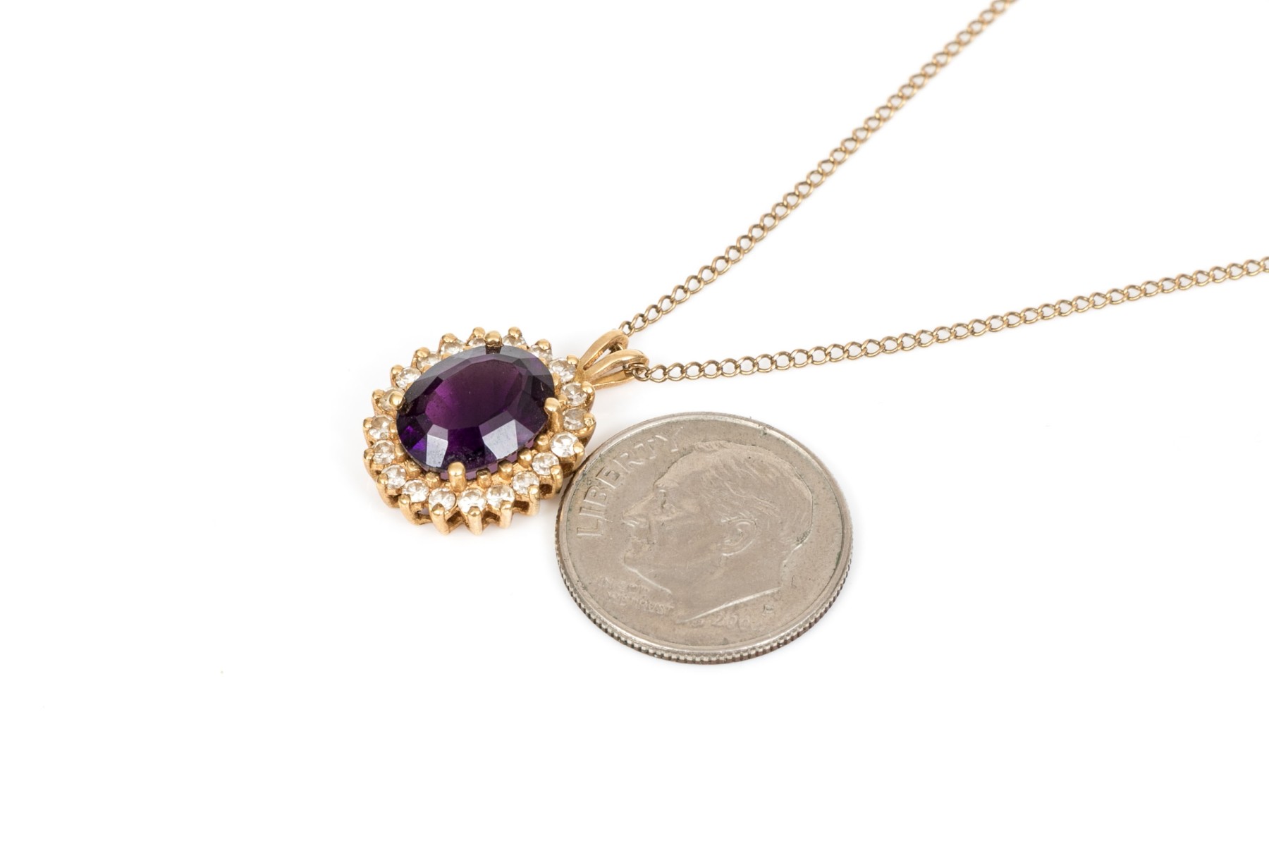 14k yellow gold vintage oval amethyst and diamond halo pendant, with chain. The amethyst is app. 2.24 CTS, and the round faceted diamonds are app. 0.25 TCW, prong set. The necklace is finished with a curb link style chain and a spring ring style clasp