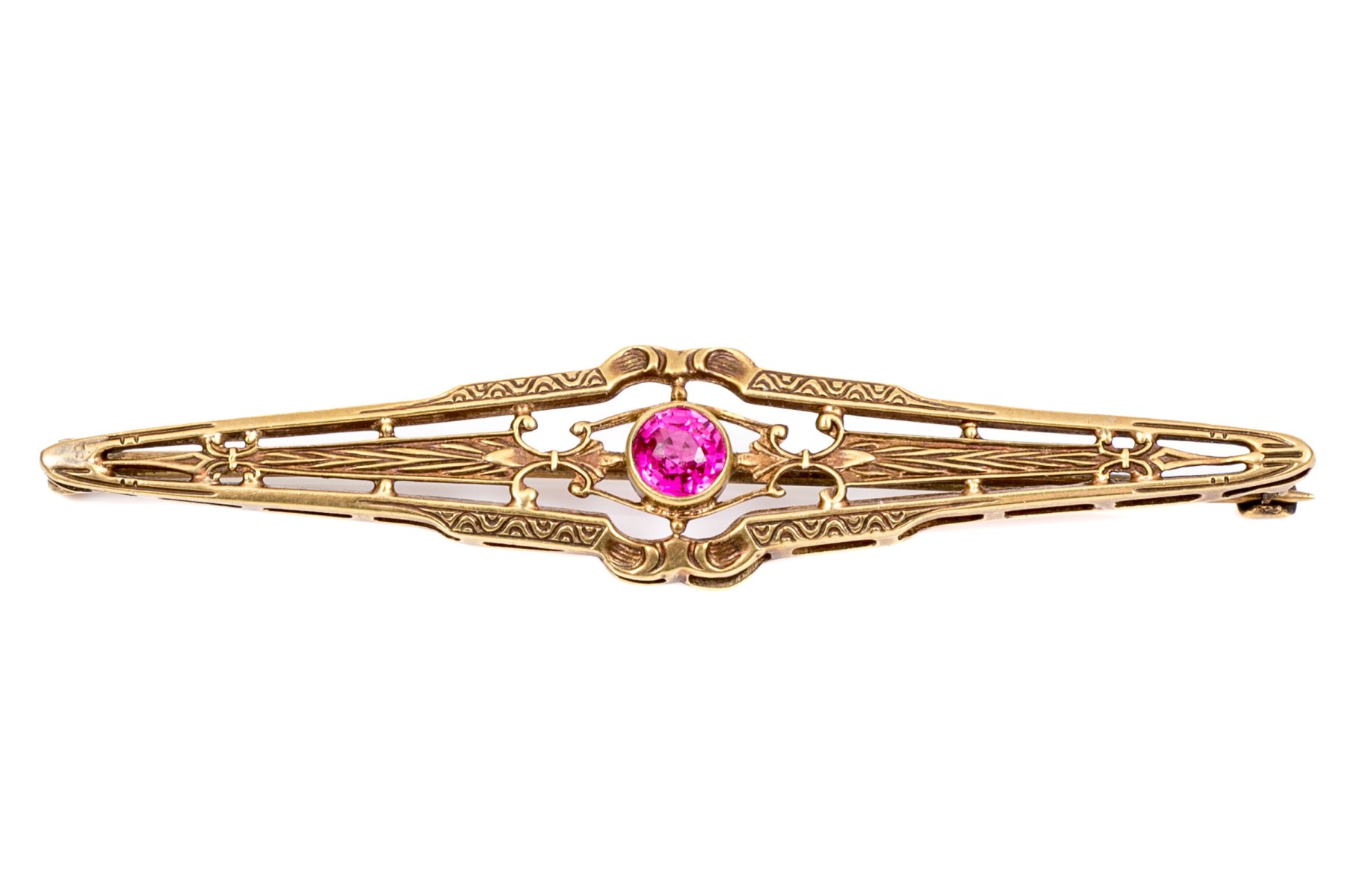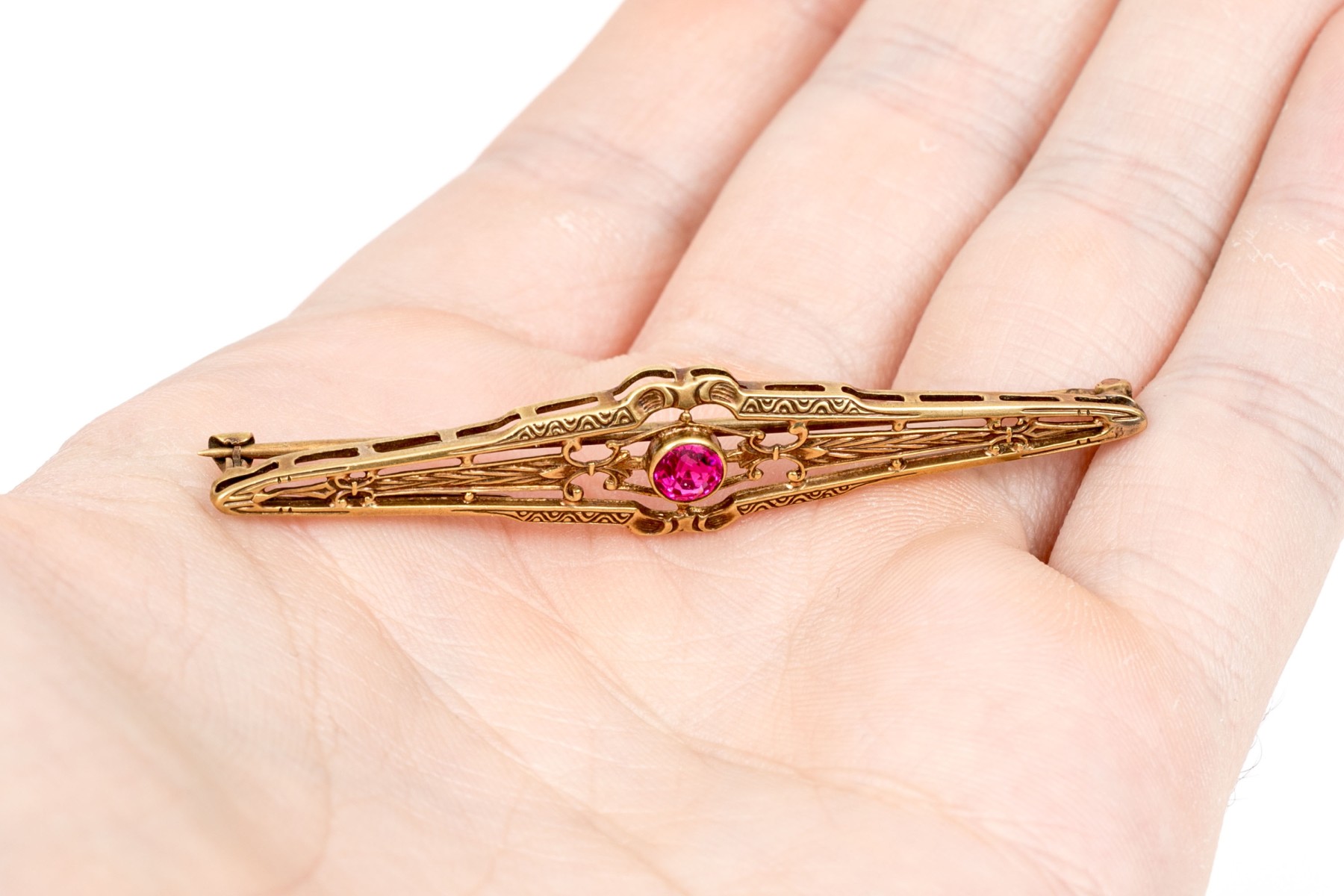 14k yellow gold vintage pierced bar pin, synthetic ruby set