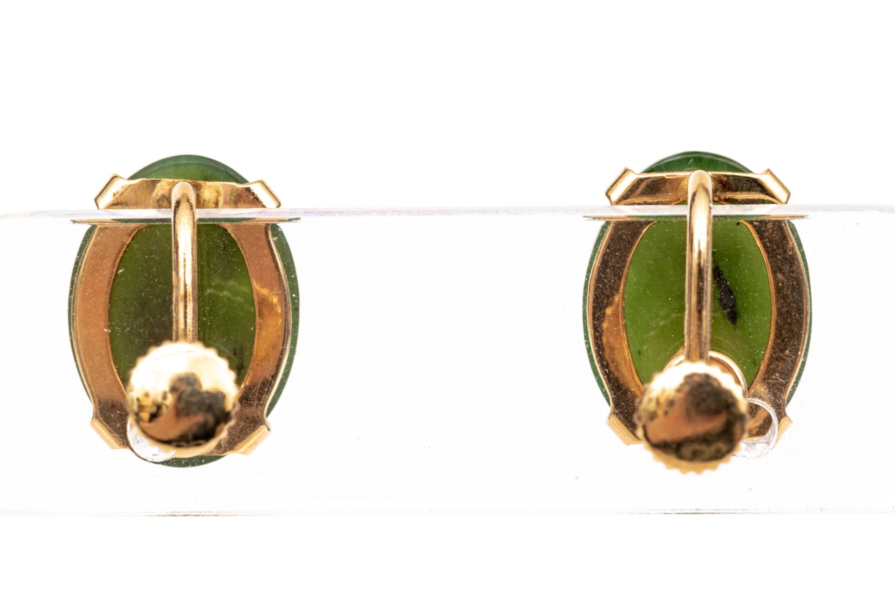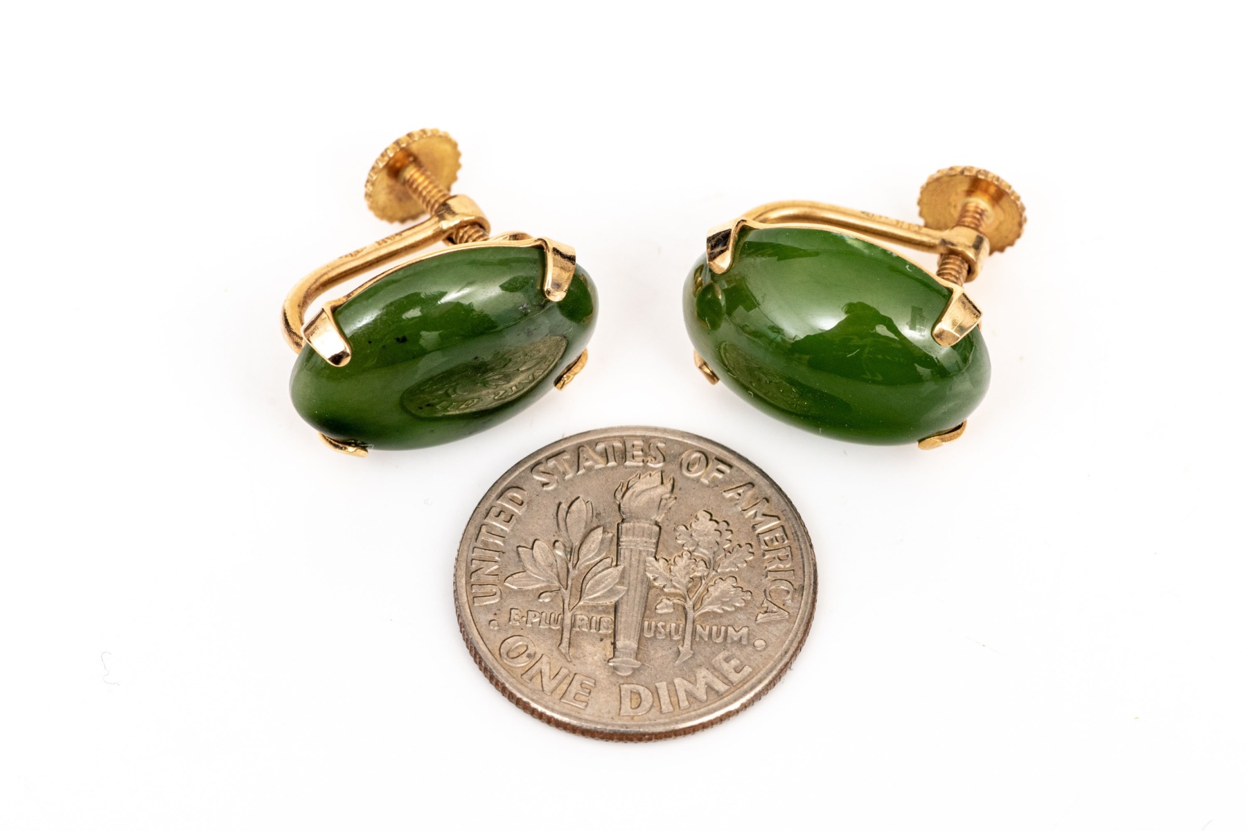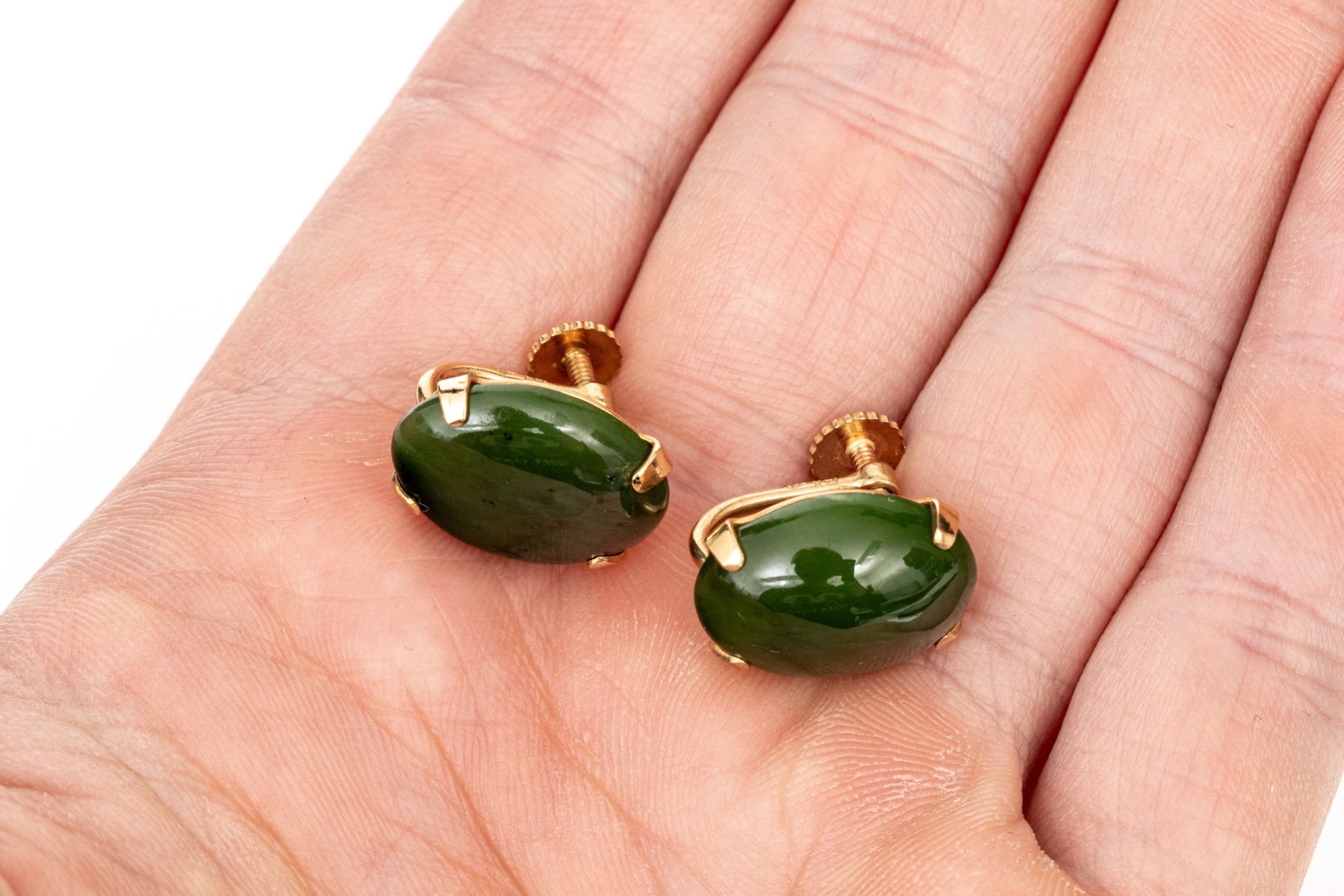14k yellow gold vintage simple oval green nephrite jade screwback style earrings, no posts