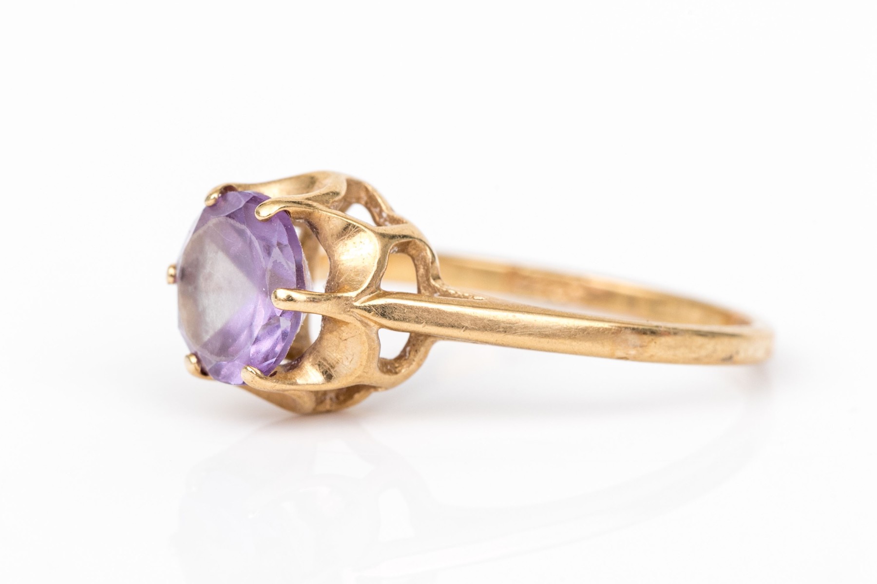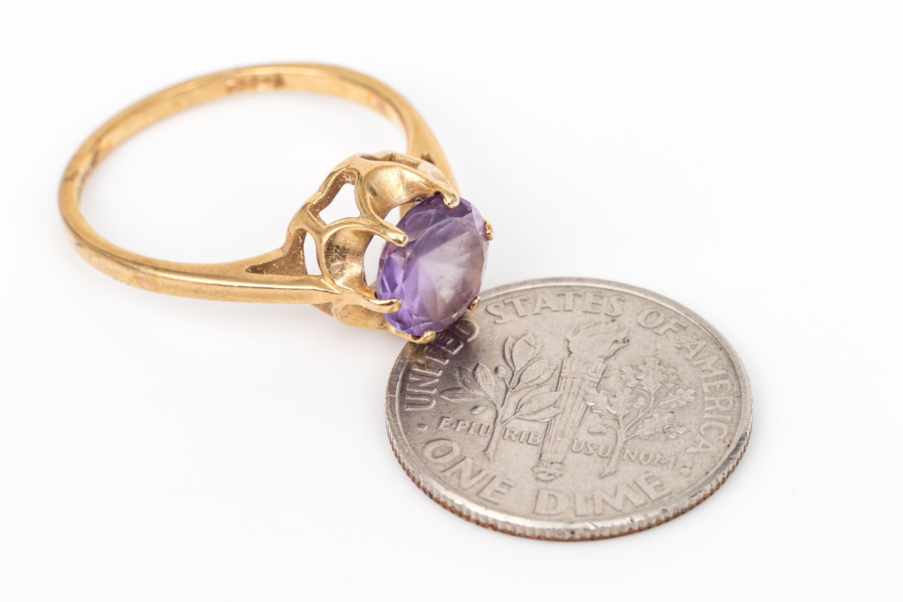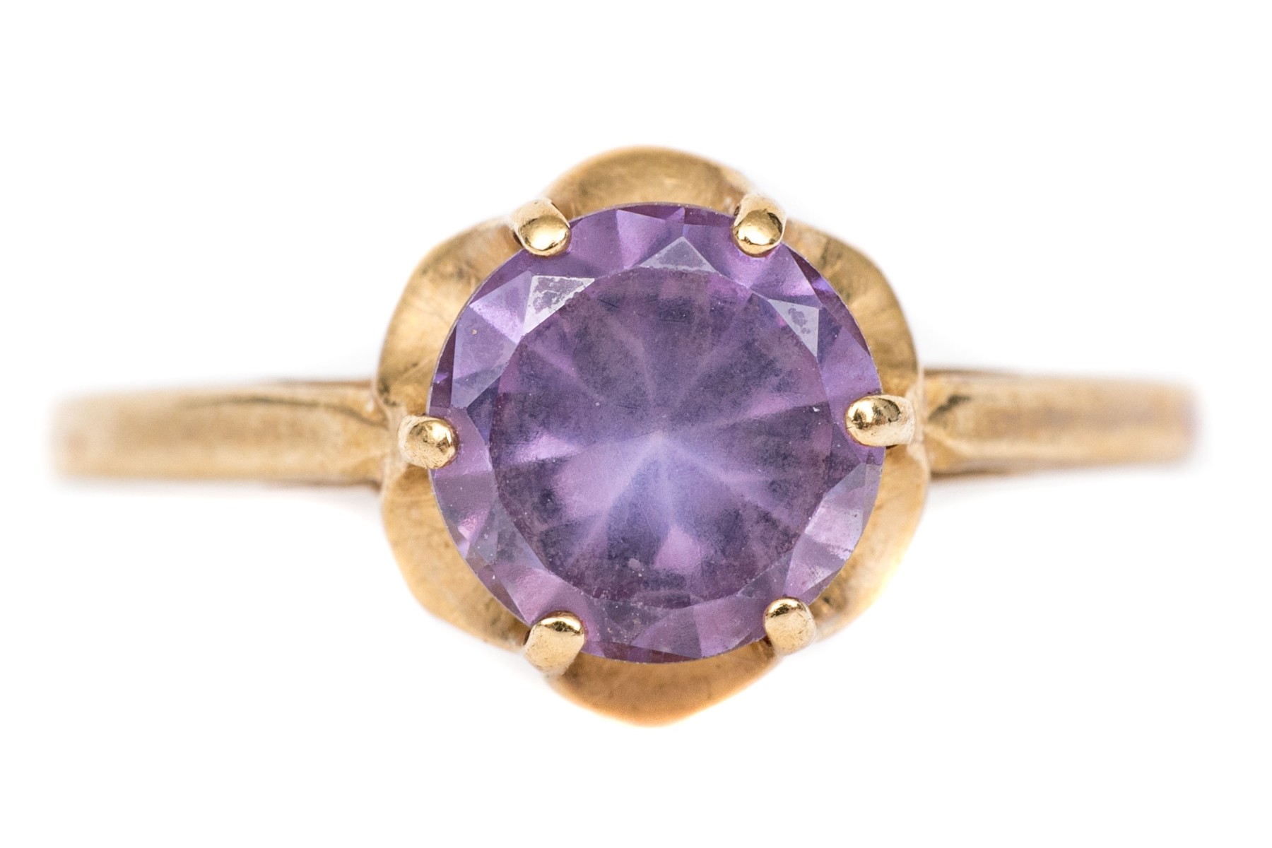 14k yellow gold vintage synthetic purple sapphire solitaire ring, size 6.25