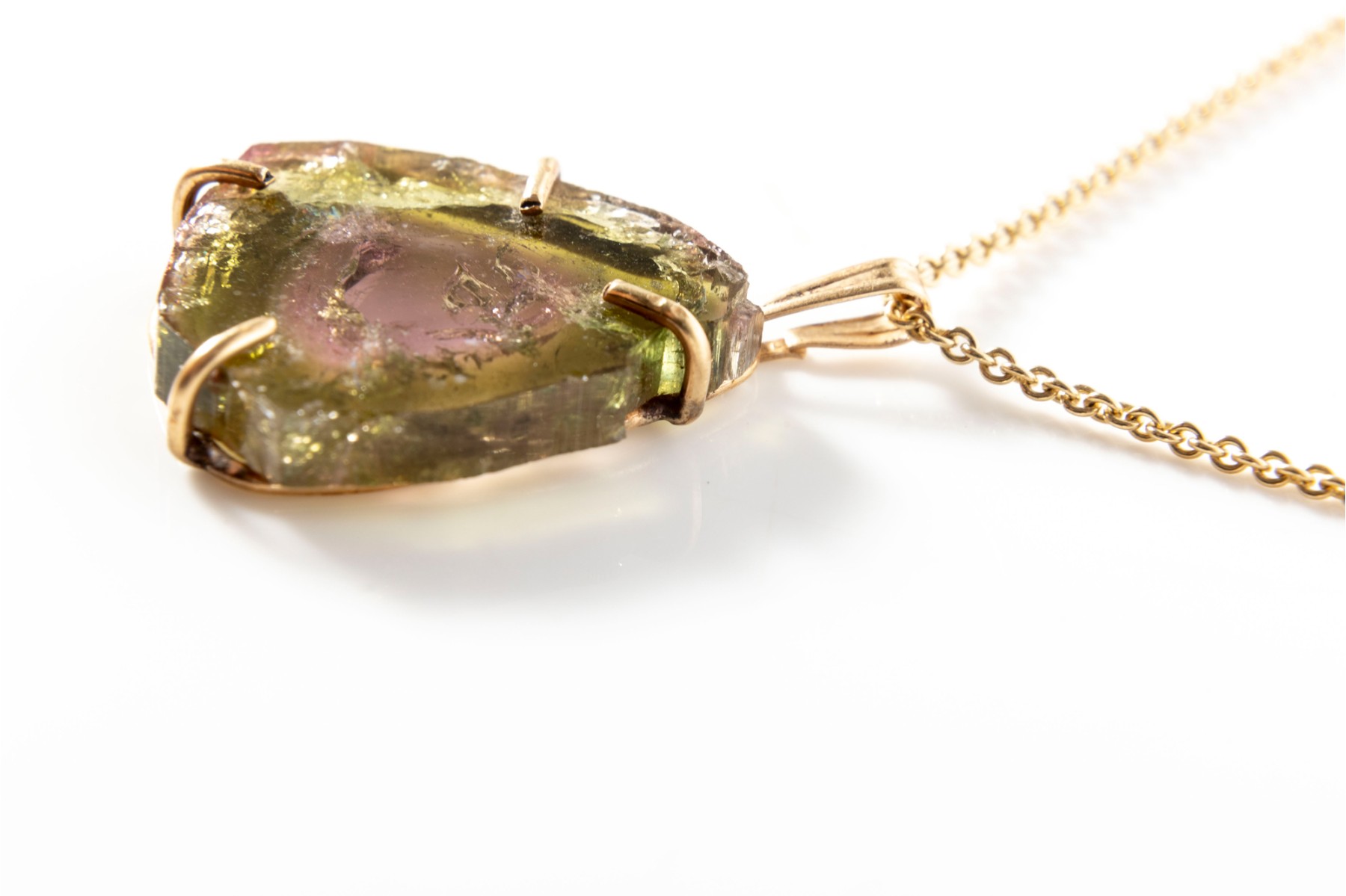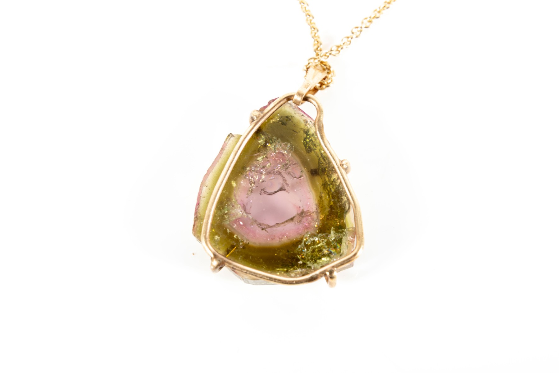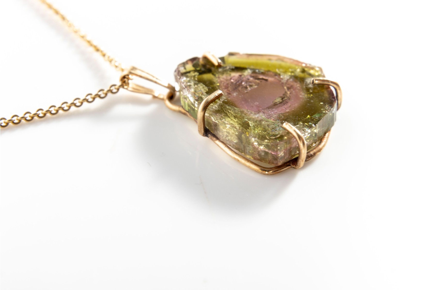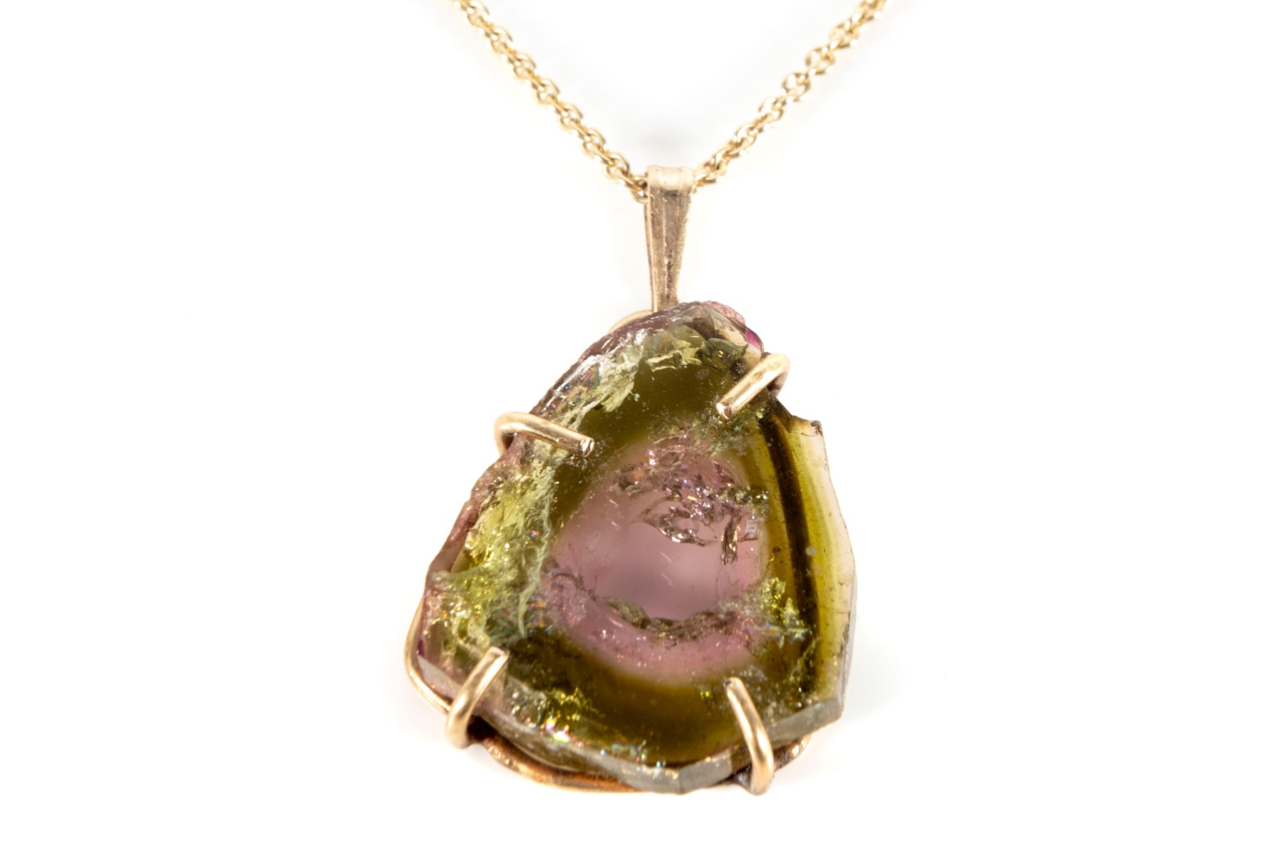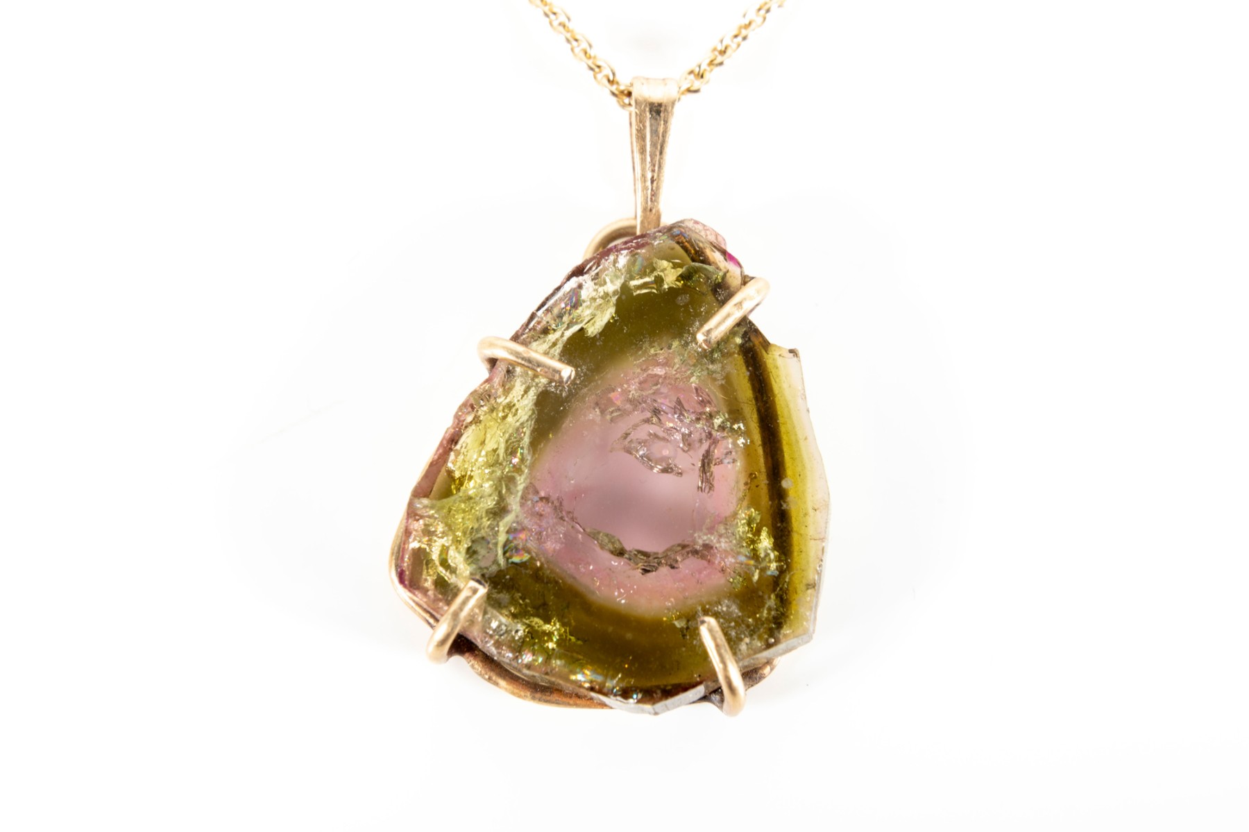A yellow gold necklace displaying a beautiful pink and green watermelon tourmaline slab in a prong setting hanging from a link chain with a spring ring clasp.