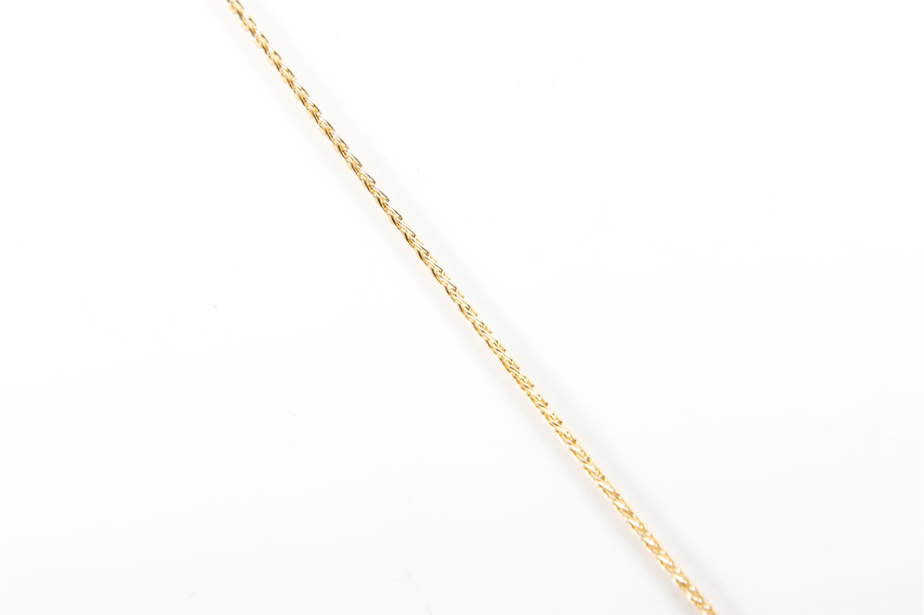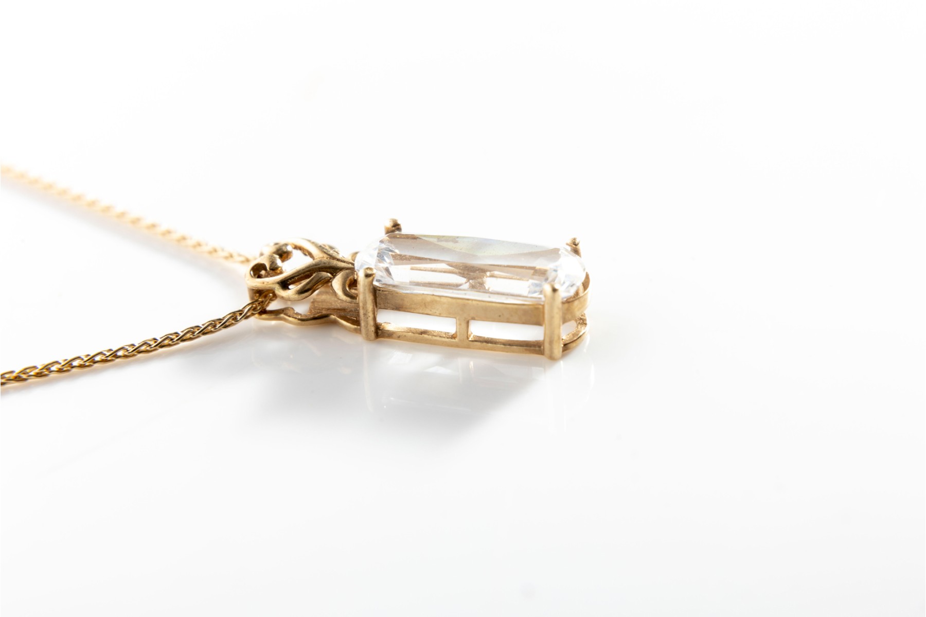 An elegant yellow gold necklace displaying an elongated white cubic zironcia in prong setting leading to a scrolled heart-shaped bail hanging from a fine wheat chain with a lobster claw clasp.
