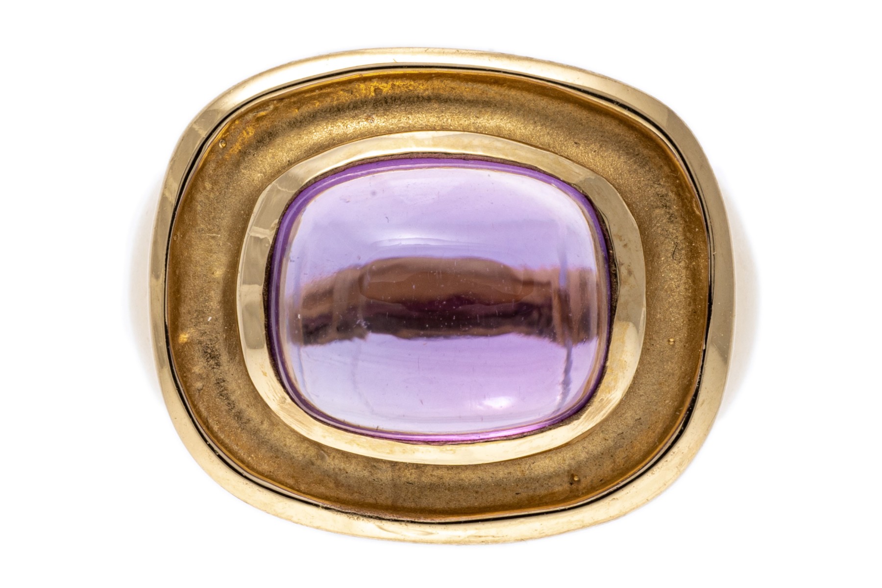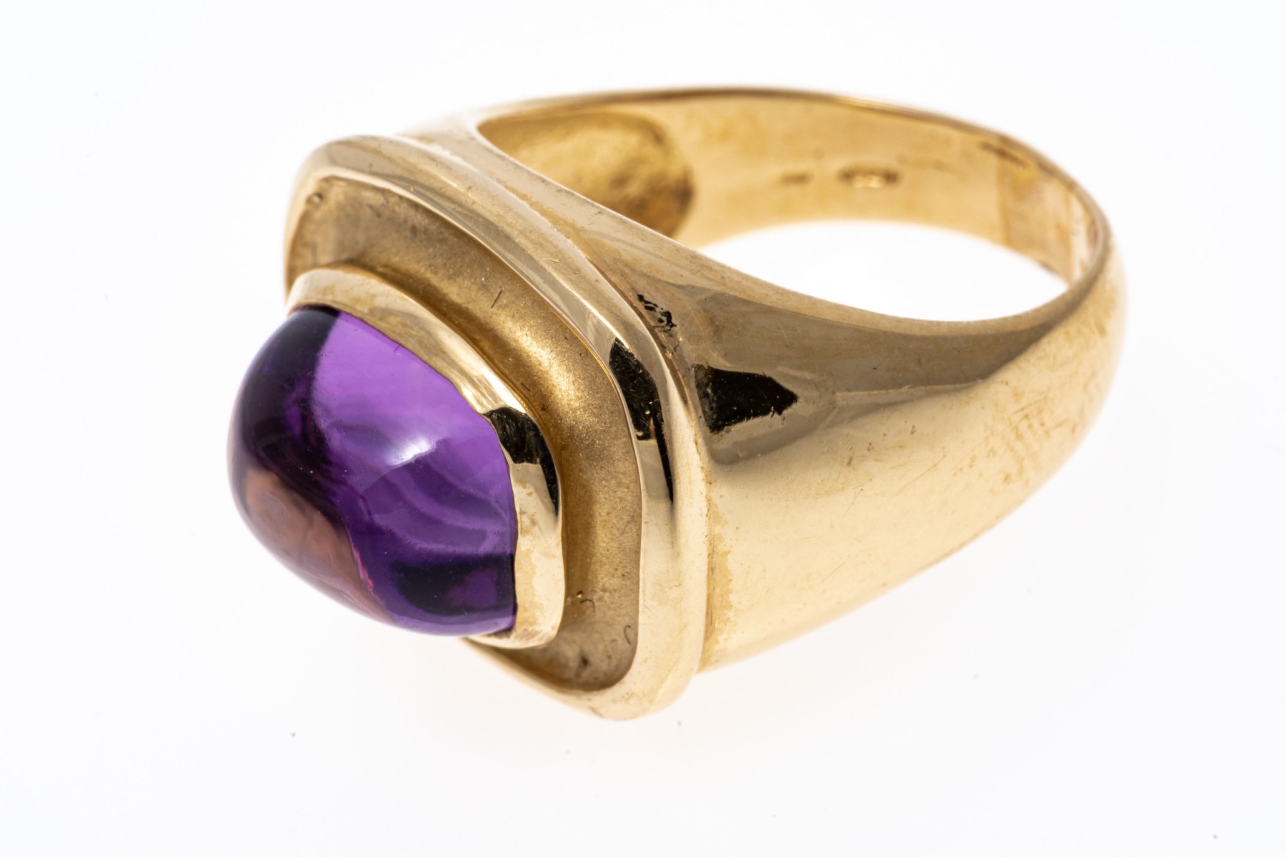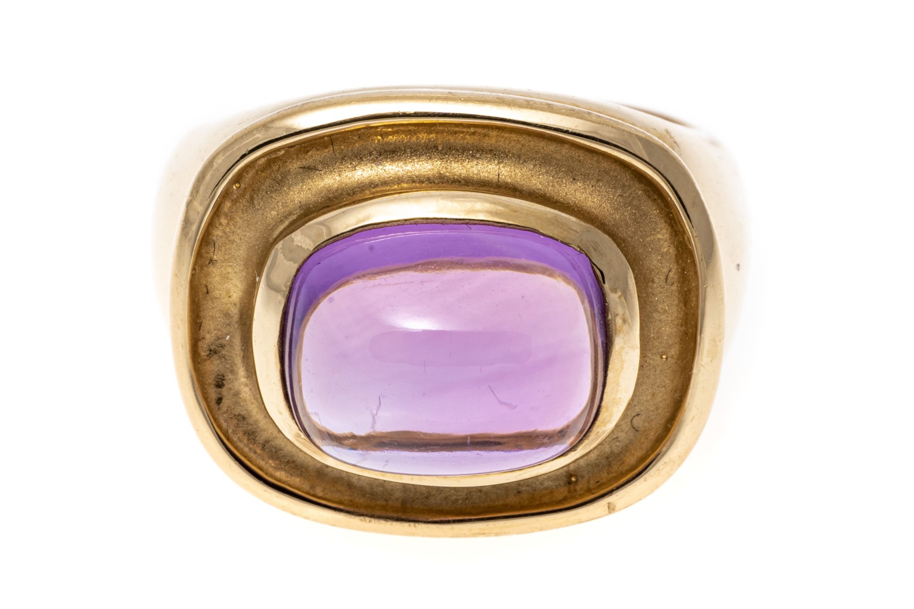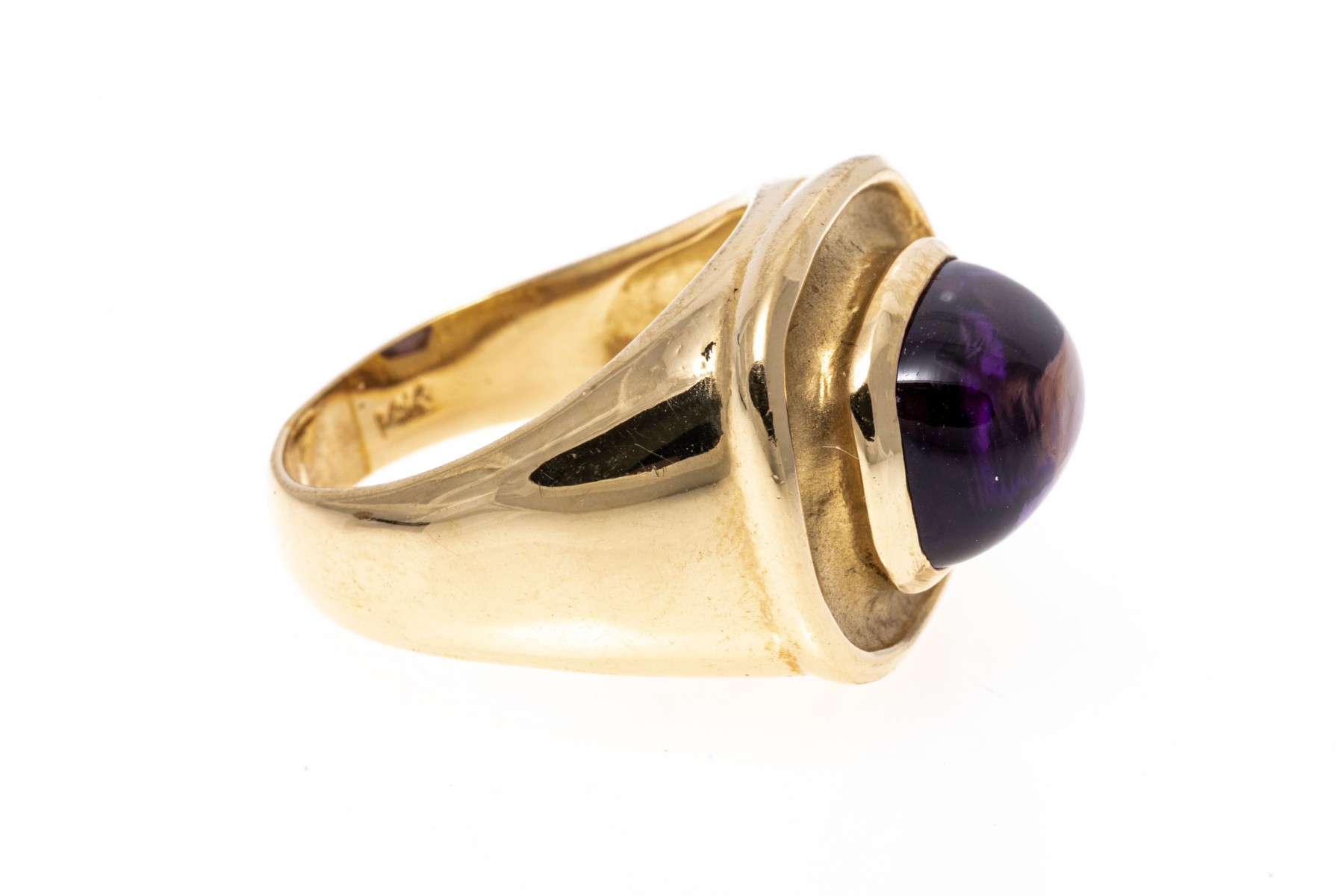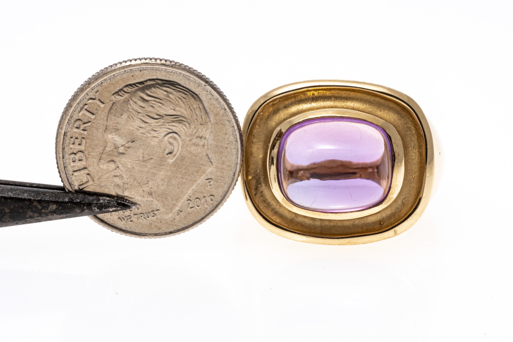 14k yellow gold ring. This beautiful ring has a horizontal, rectangular sugarloaf cabachon cut light purple color amethyst center, bezel set int a grooved, rounded rectangular contemporary profile, finished with wide, high polished shoulders.