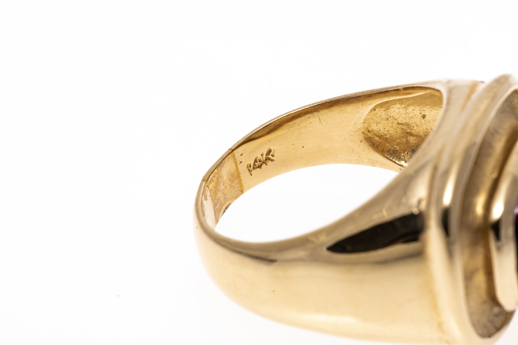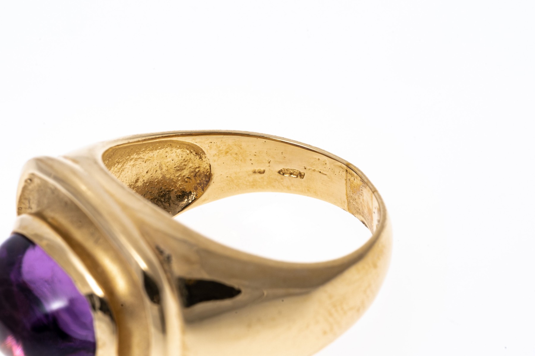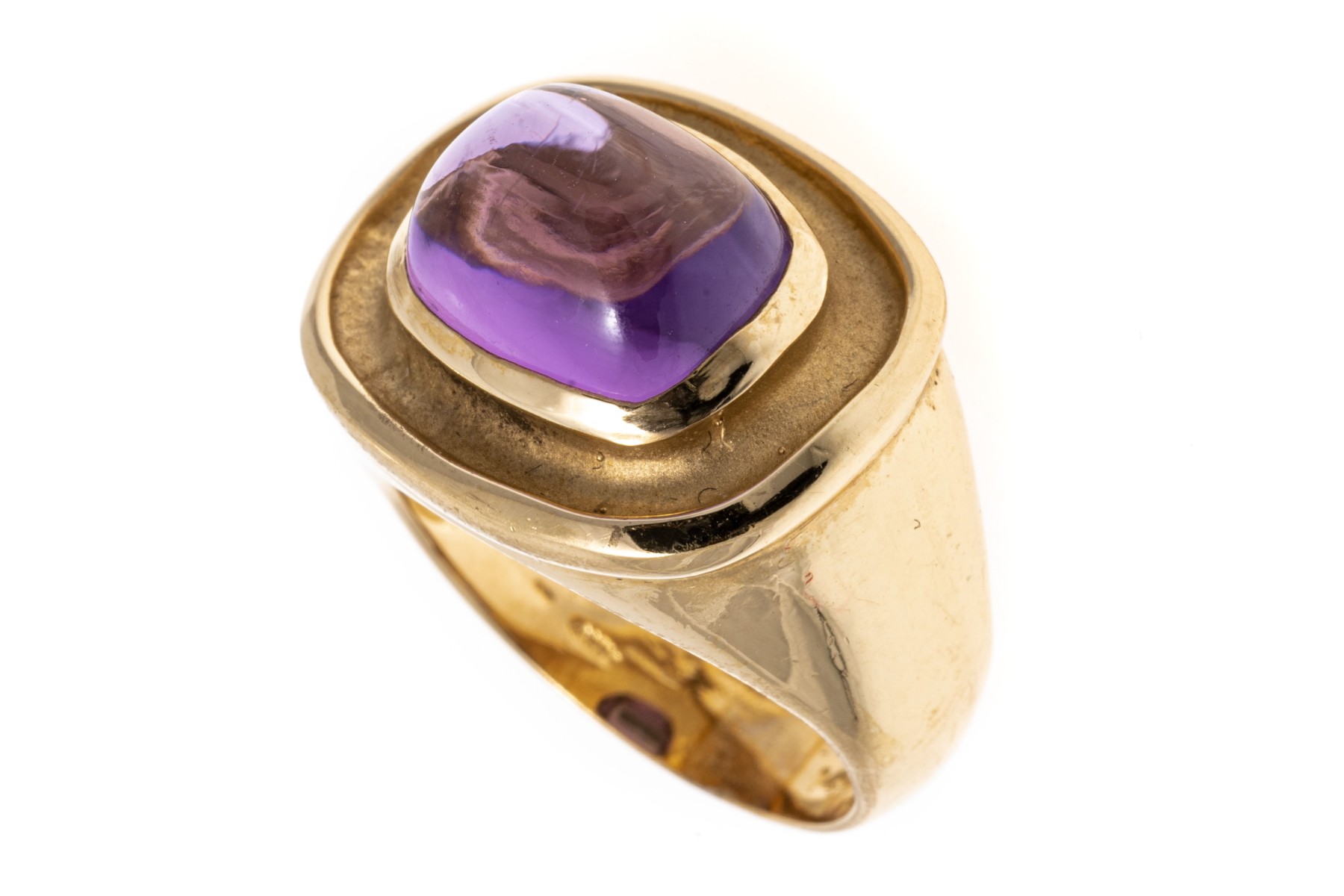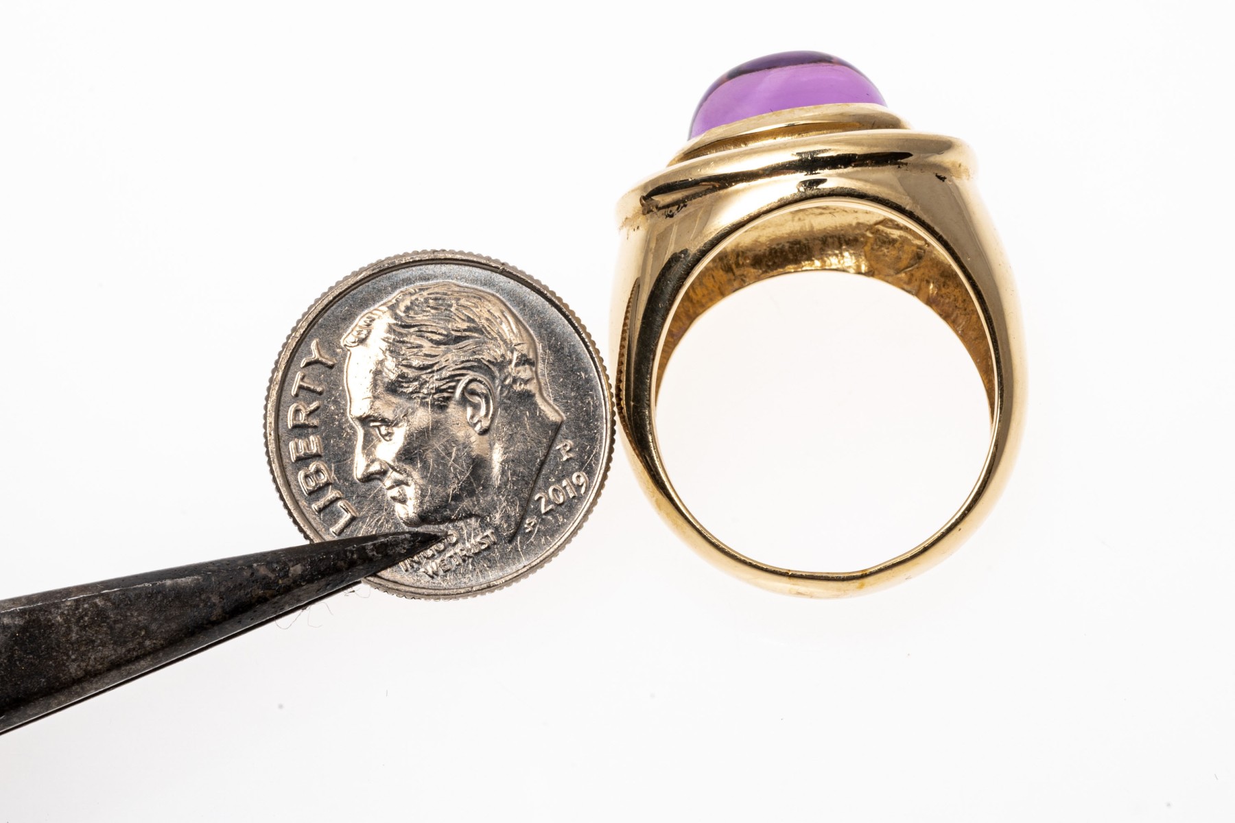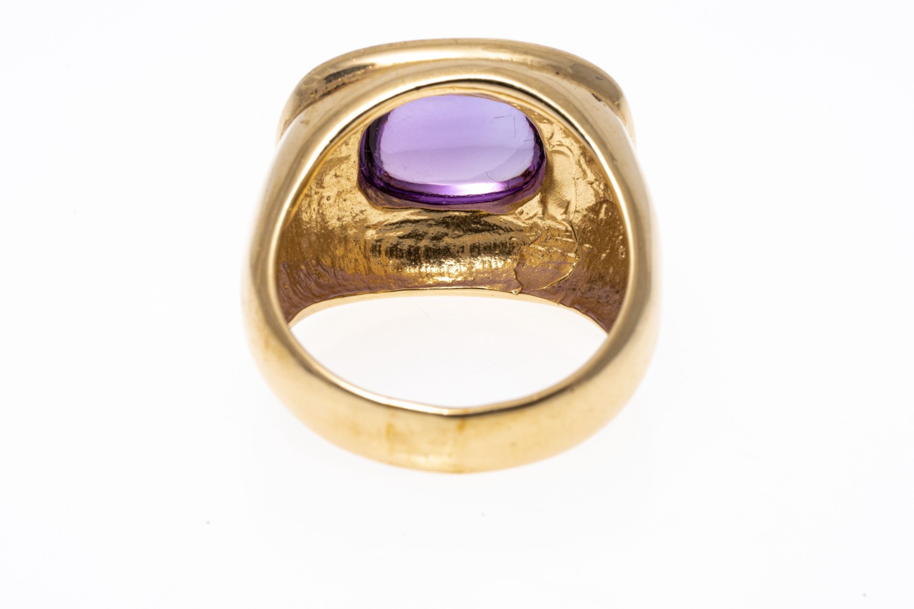 14k yellow gold ring. This beautiful ring has a horizontal, rectangular sugarloaf cabachon cut light purple color amethyst center, bezel set int a grooved, rounded rectangular contemporary profile, finished with wide, high polished shoulders.