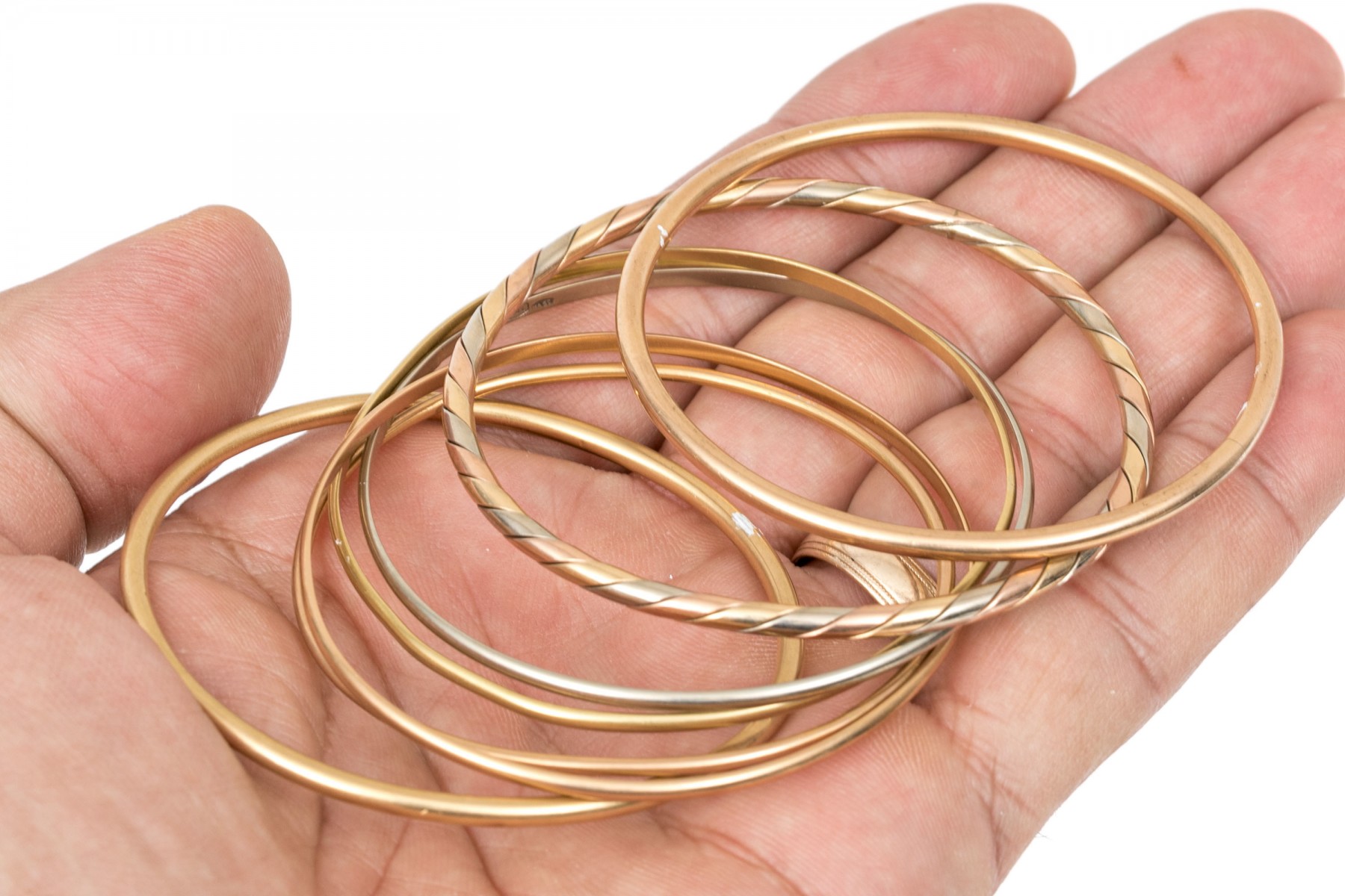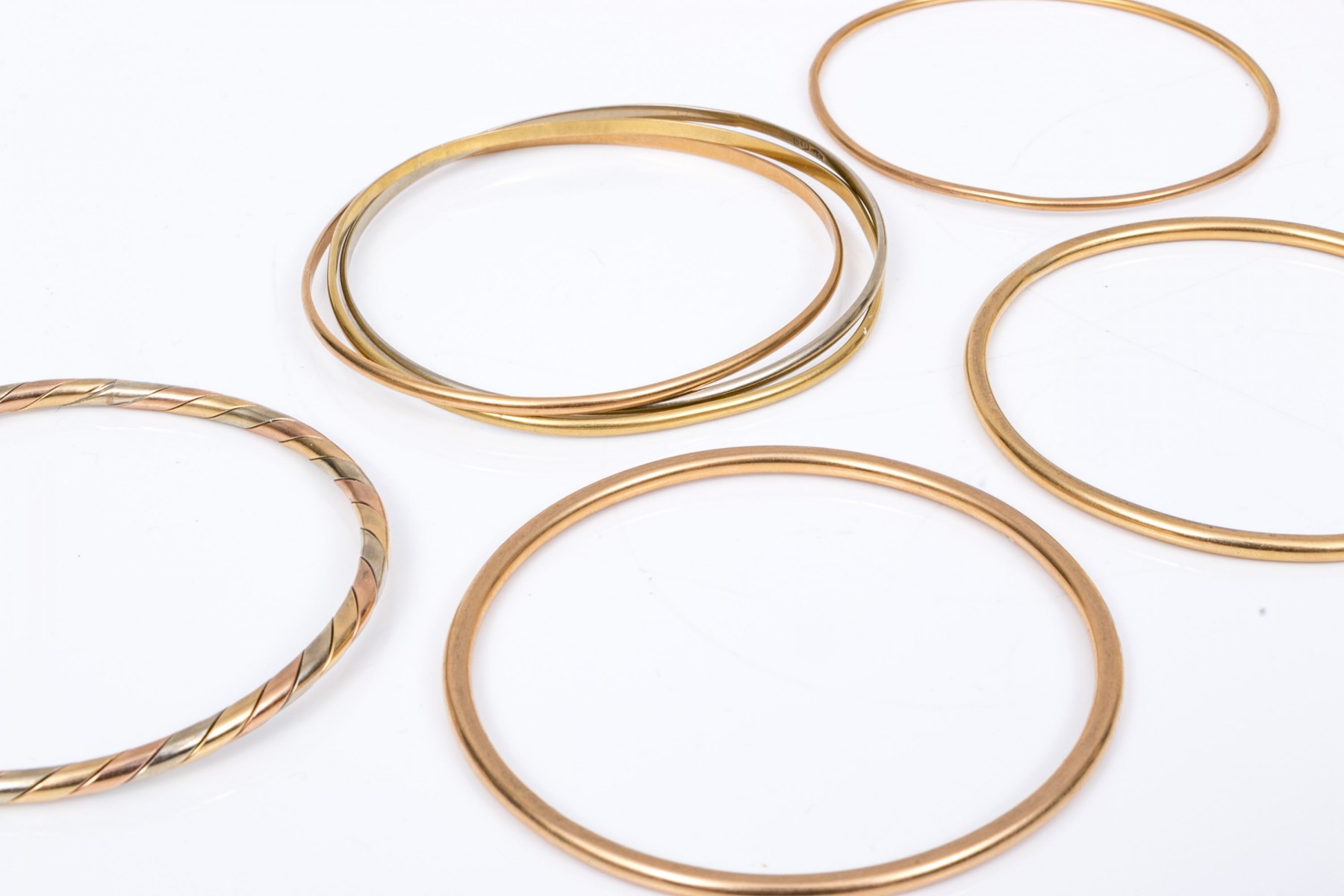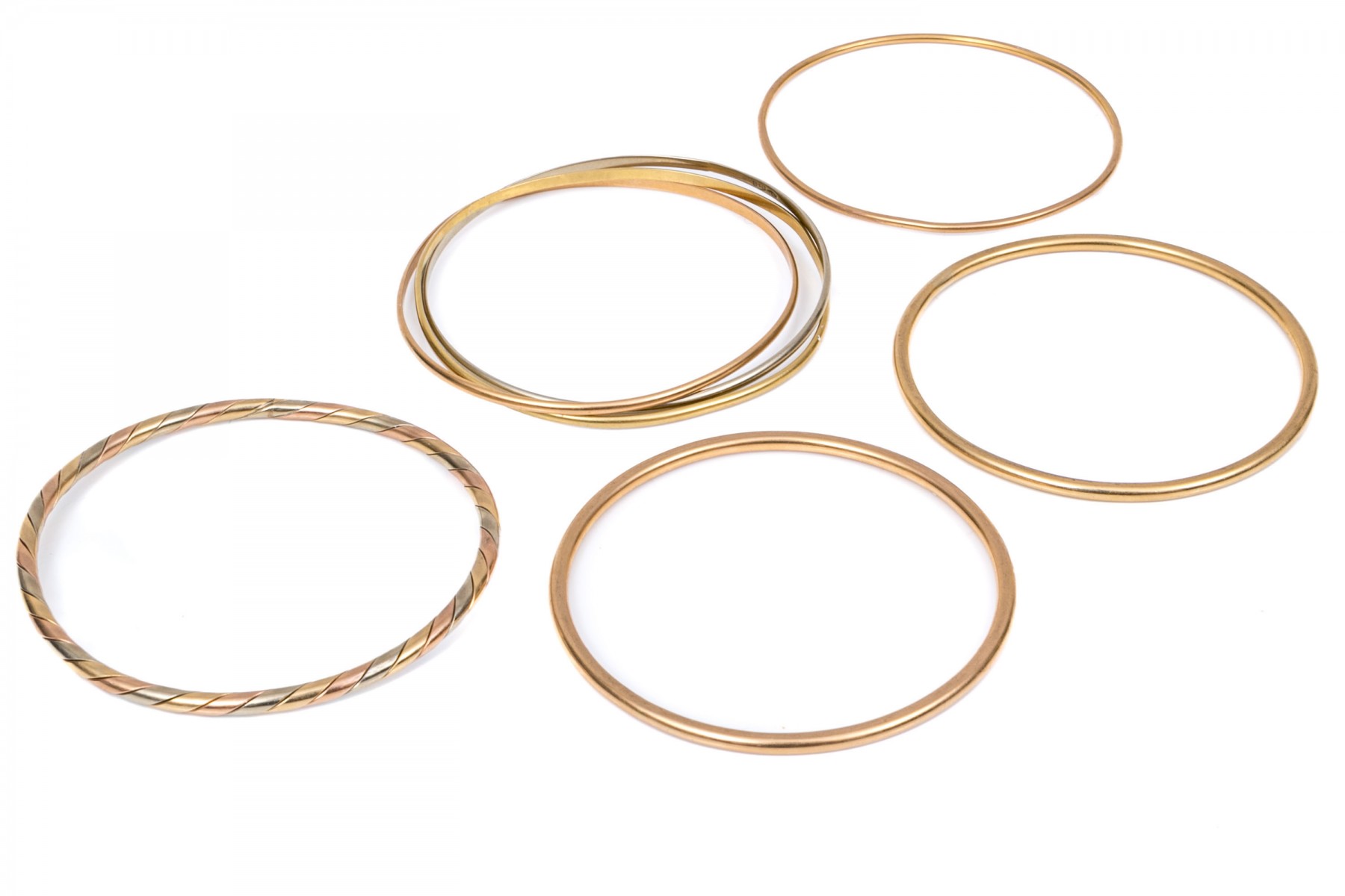 14k yellow, white and rose gold stack of five slip on bangles, assorted styles and diameters