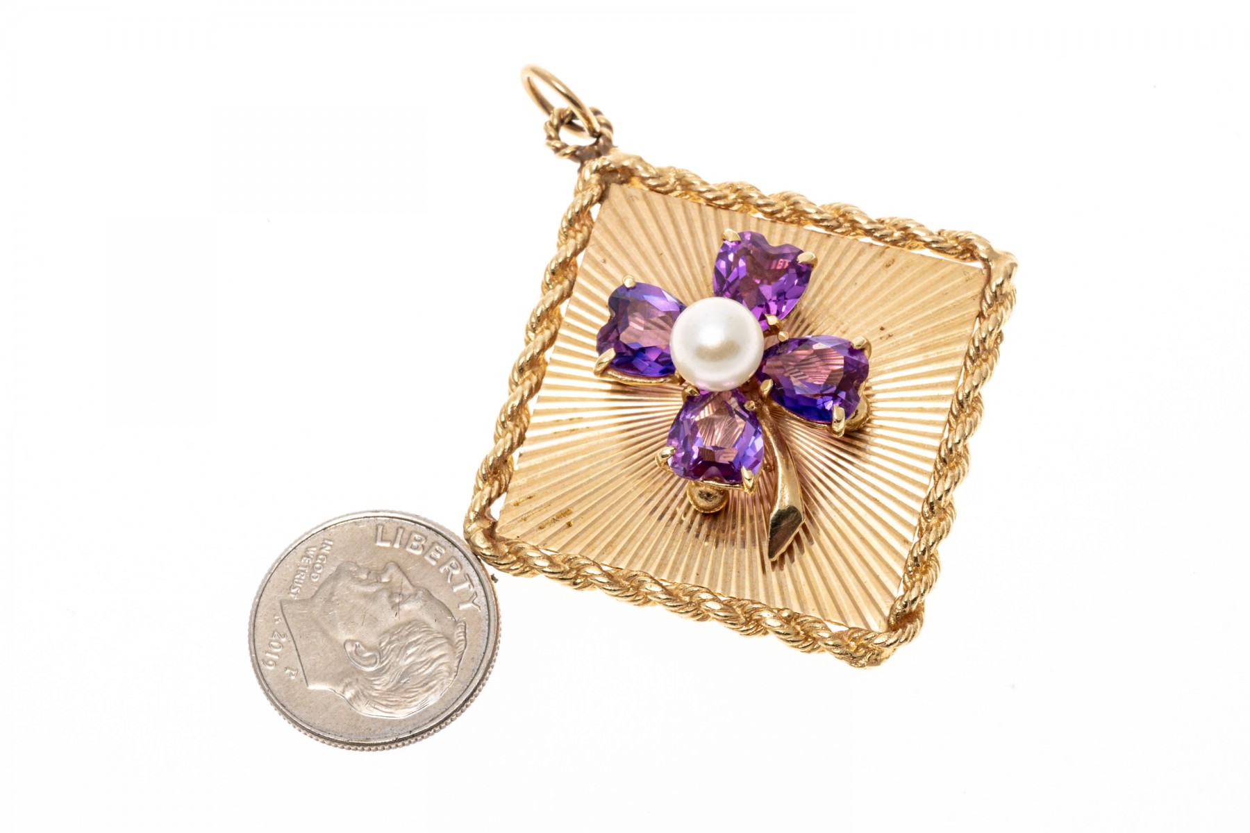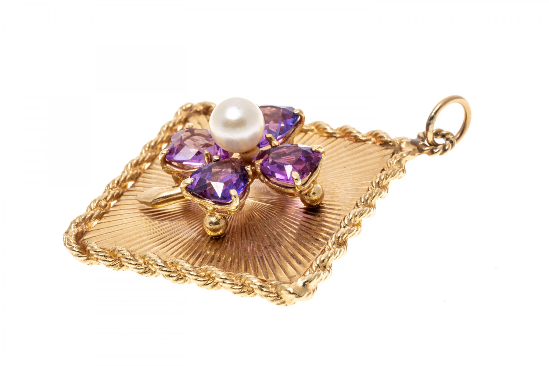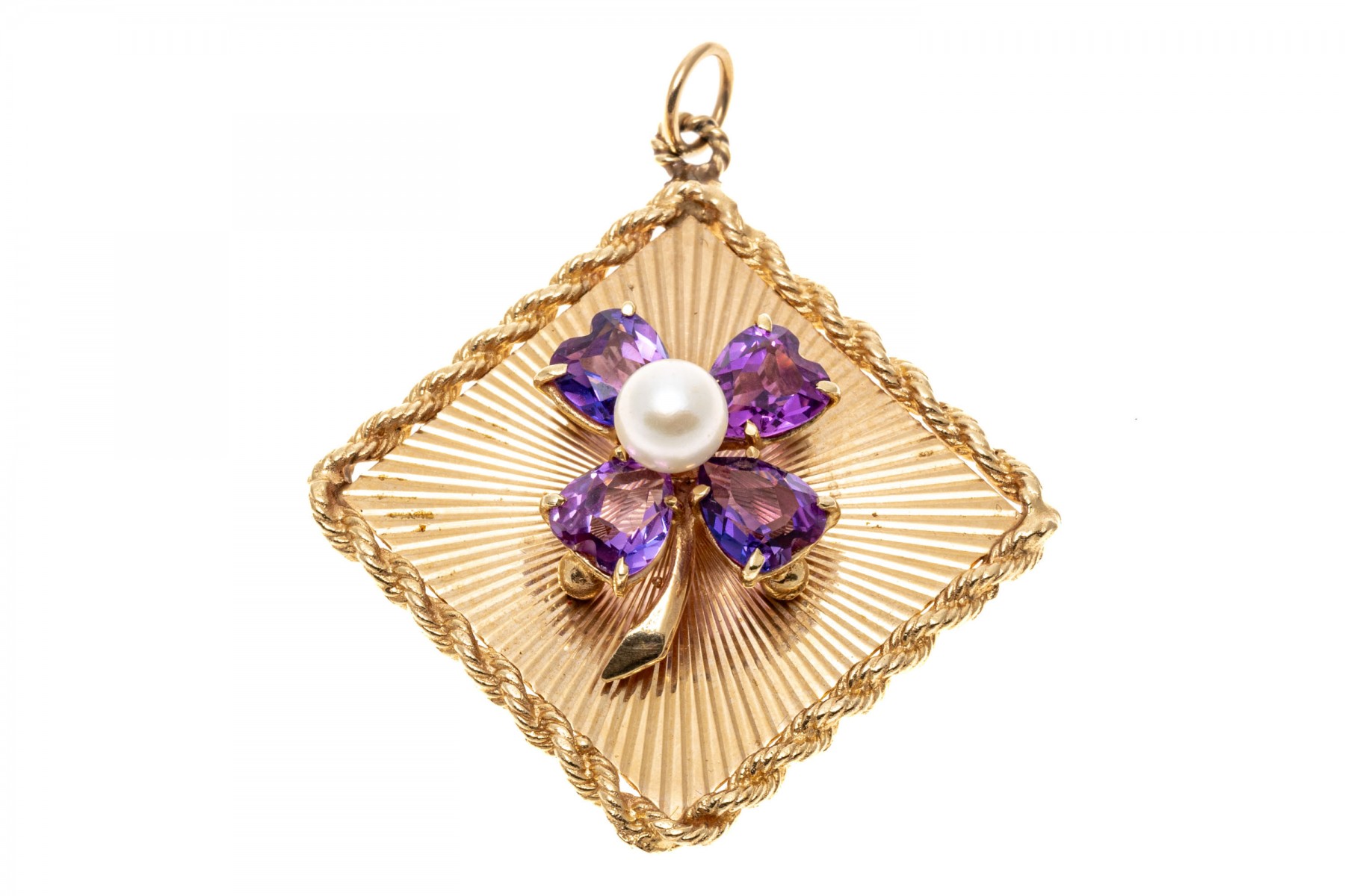 14k yellow gold lucky vintage large four leaf clover retro pendant, with a radiating ribbed field background, a rope edged border and a center set with a cultured pearl, surrounded by four purple synthetic sapphires heart leaves, prong set. The pendant is finished with a jump ring style bale