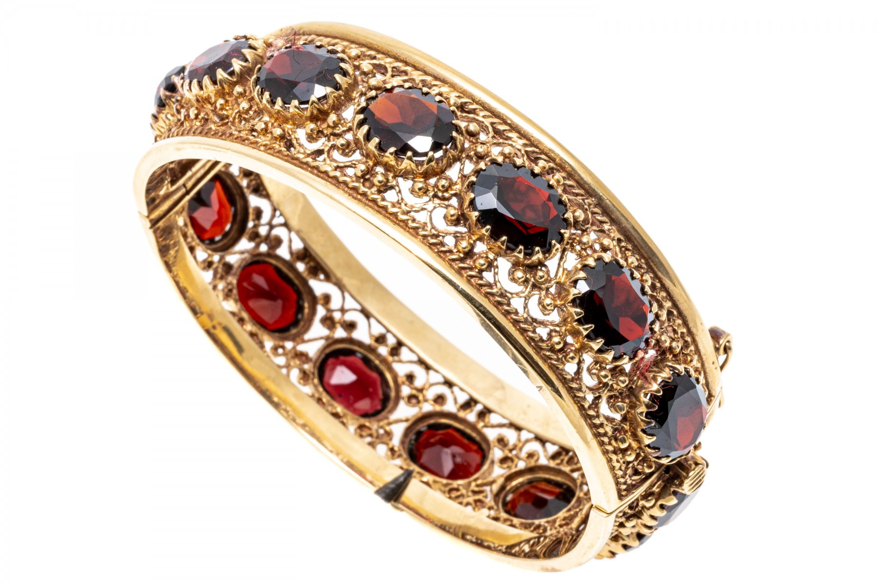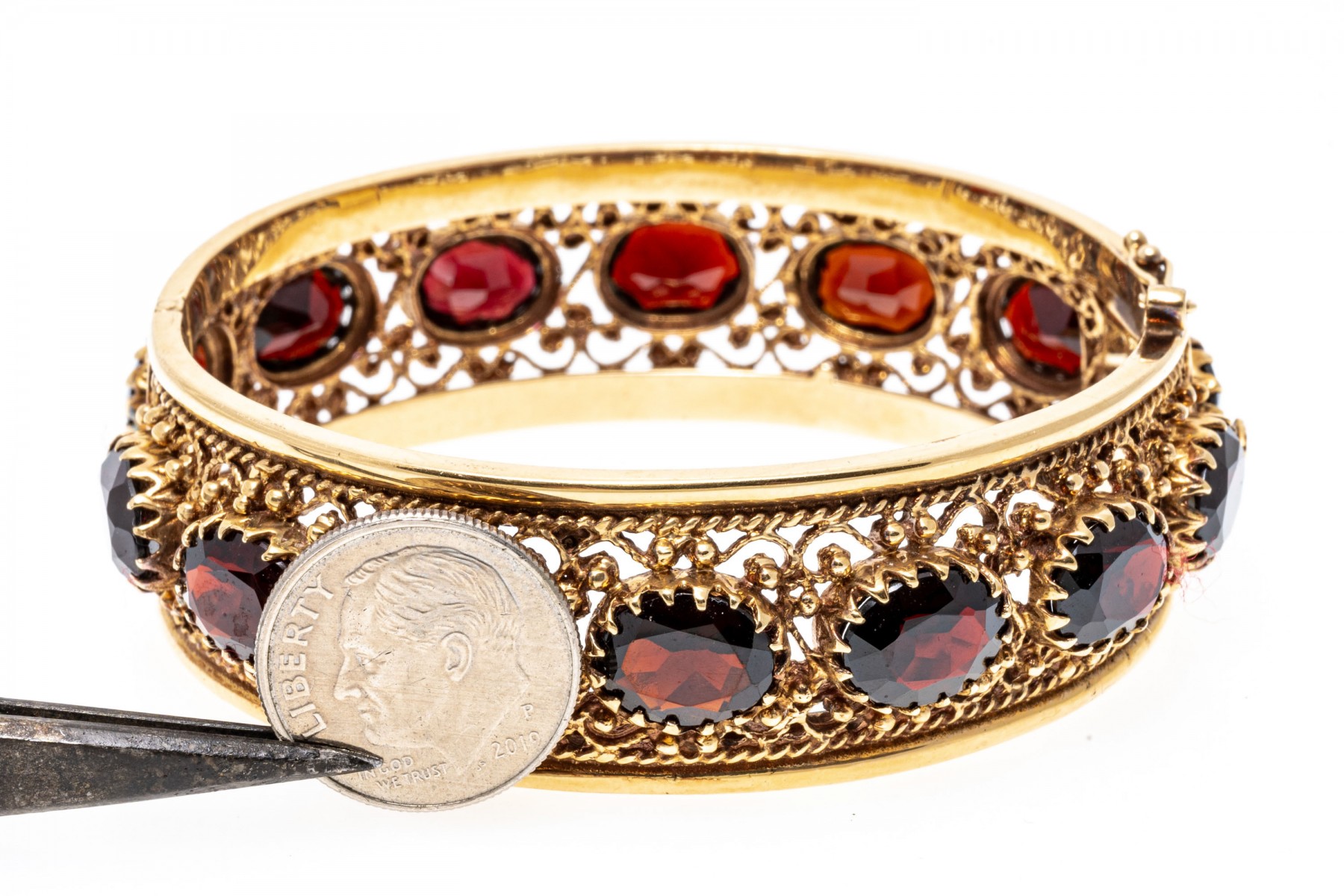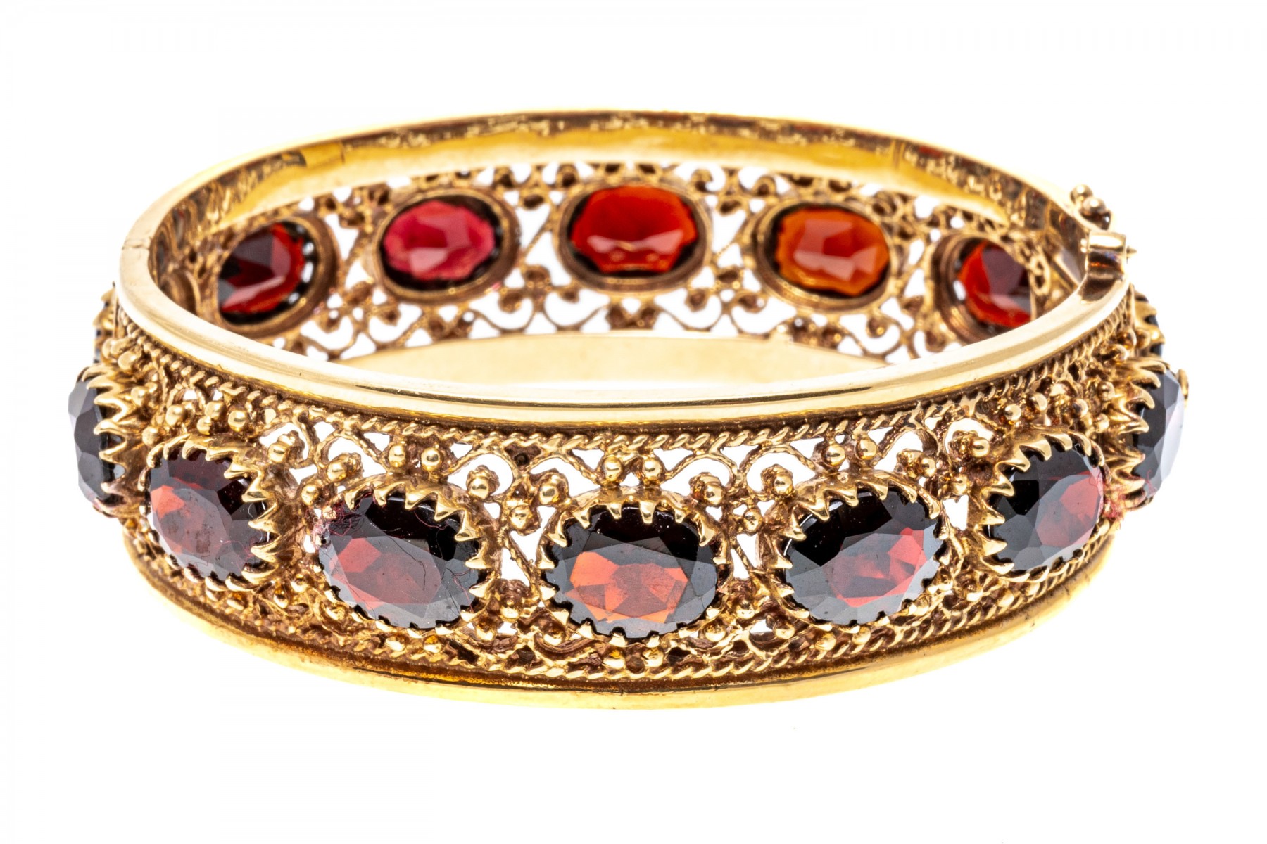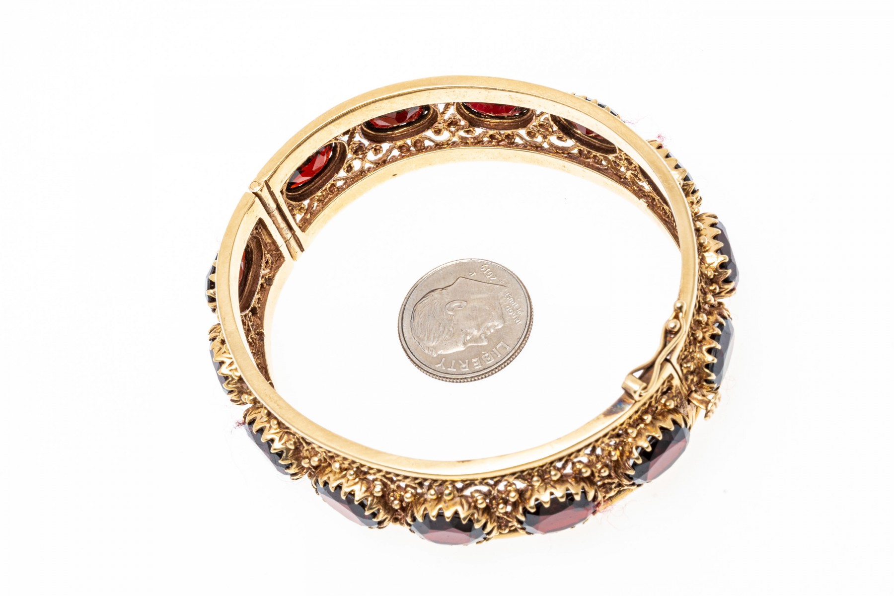 14k yellow gold spectacular wide vintage hinged filigree bangle bracelet, set with a center row of horizontally set, oval faceted burgundy color garnets, approximately 35.10 TCW, prong set. The bracelet is finished by a figure eight safety clasp.