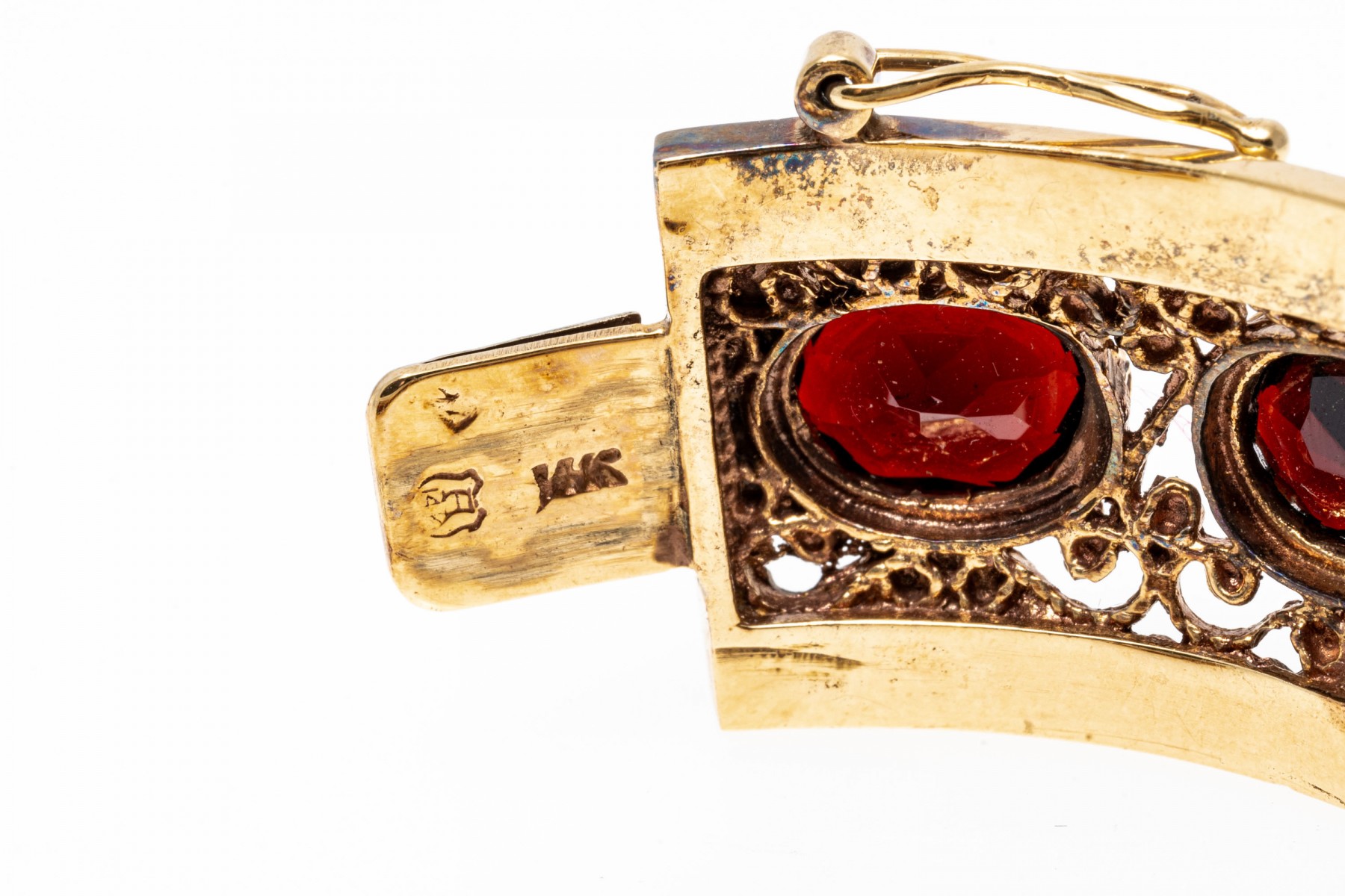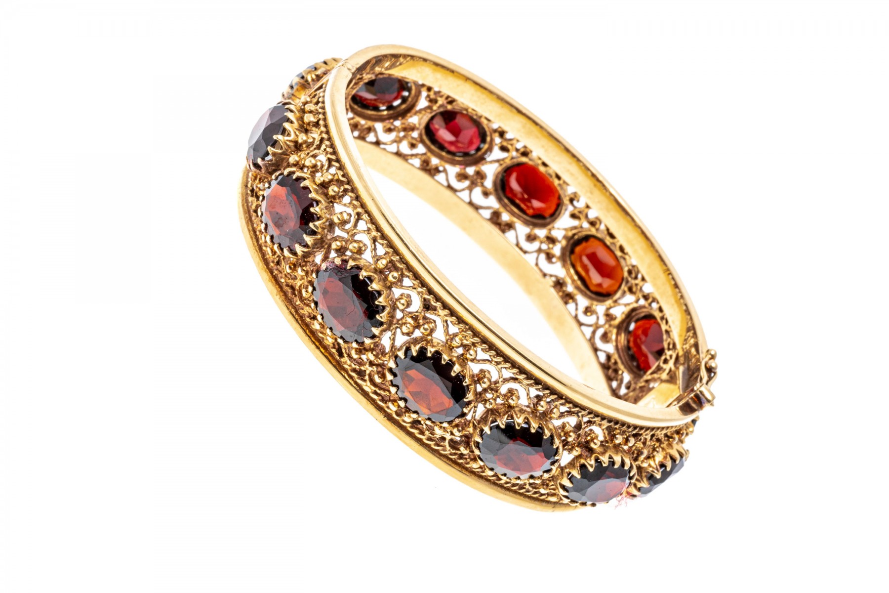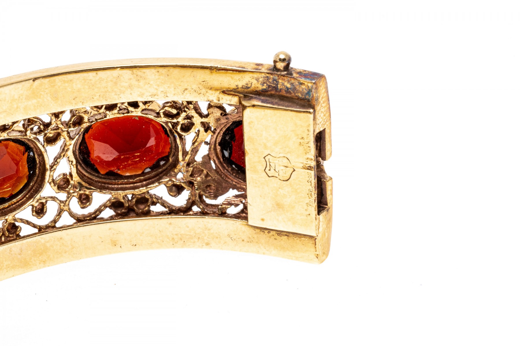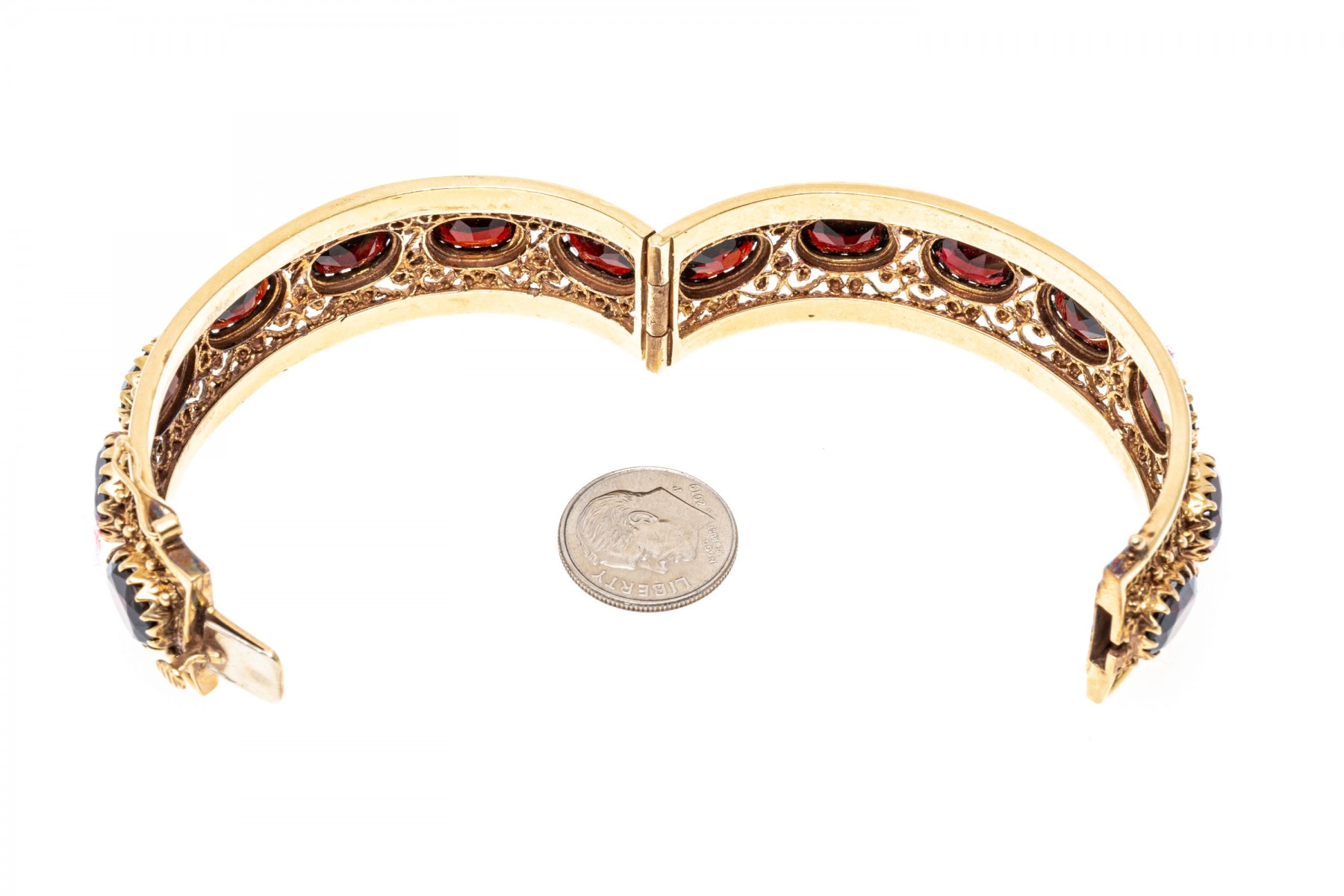 14k yellow gold spectacular wide vintage hinged filigree bangle bracelet, set with a center row of horizontally set, oval faceted burgundy color garnets, approximately 35.10 TCW, prong set. The bracelet is finished by a figure eight safety clasp.
