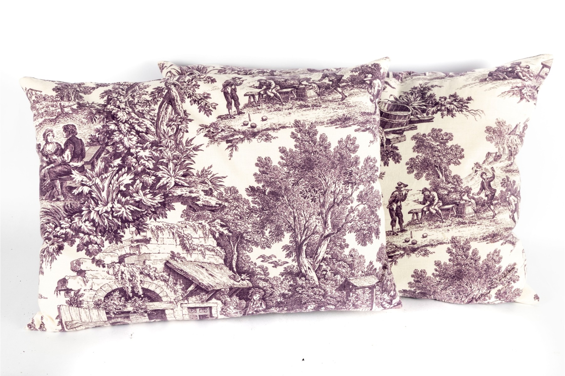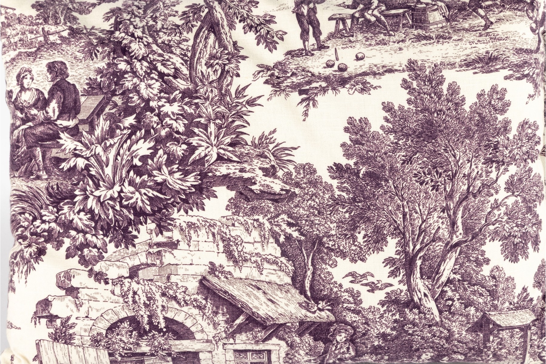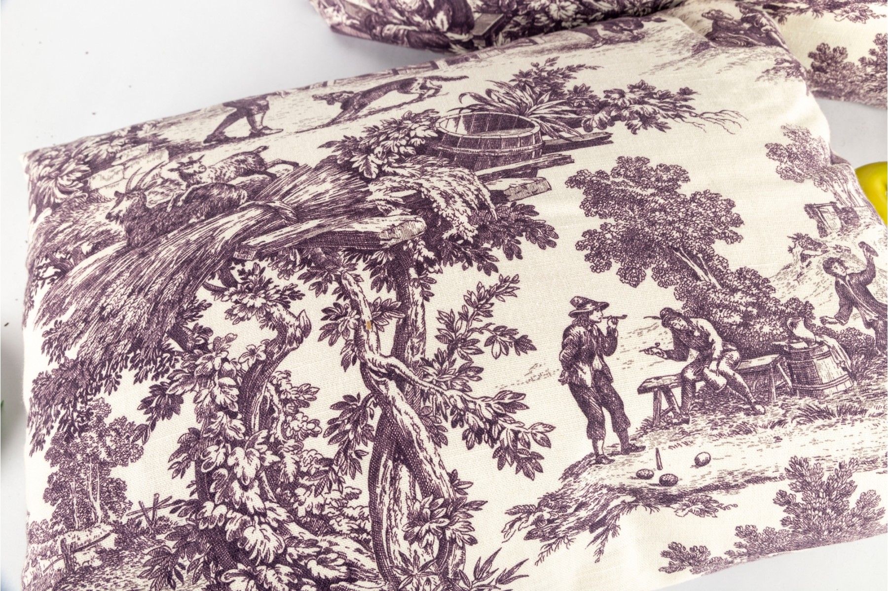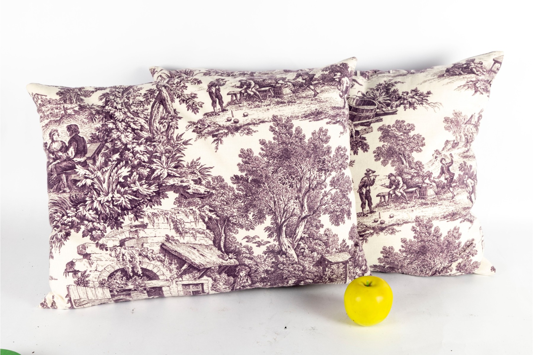 A charming pair of decorative Toile de Jouy throw pillows featuring a classic pastoral scene with figures in landscapes, trees, and rustic architecture.