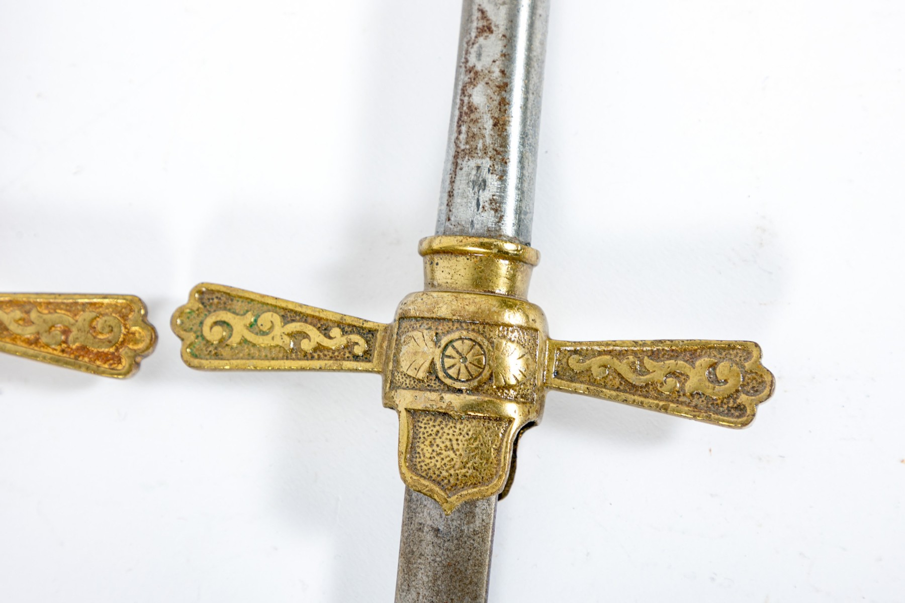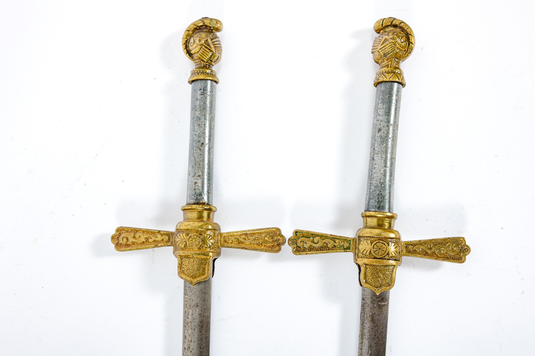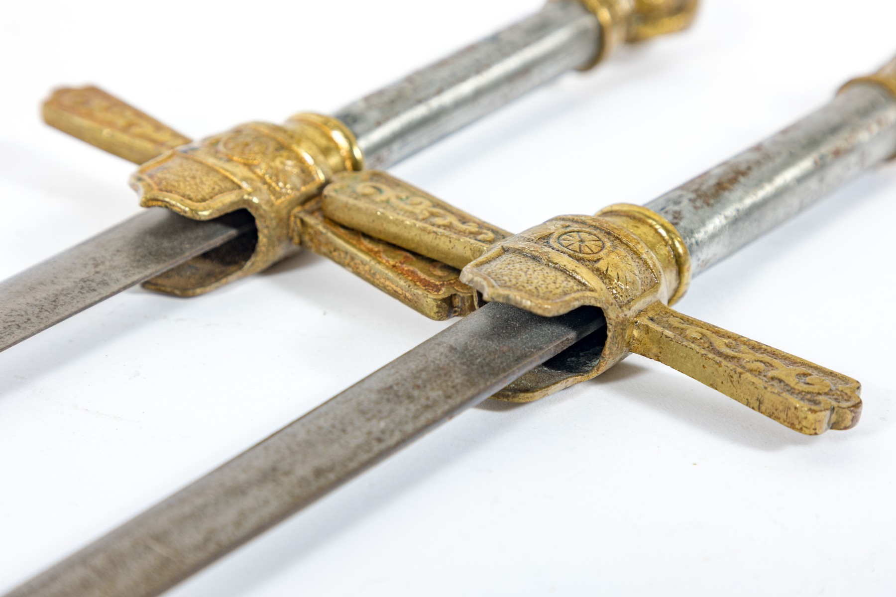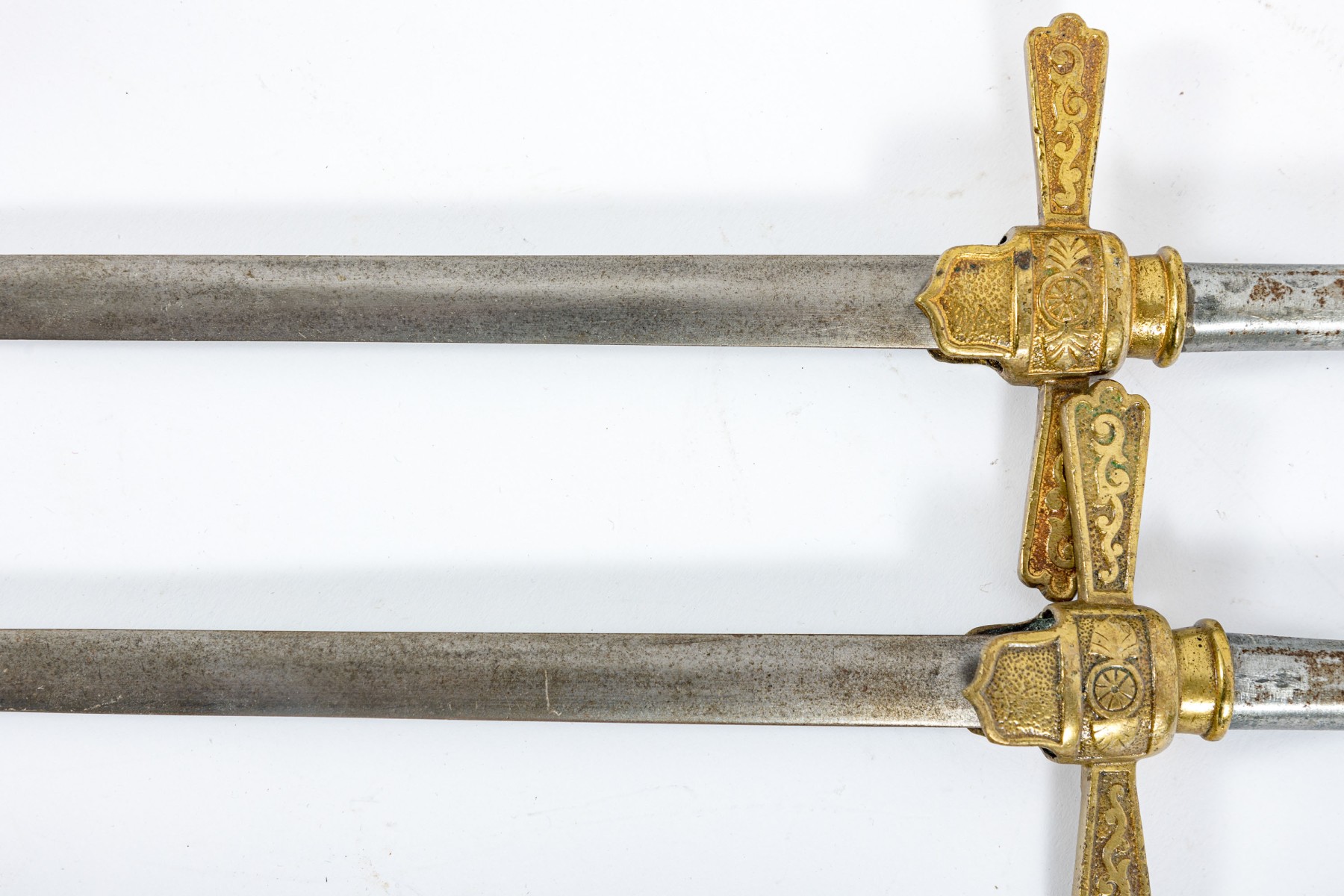 A pair of antique Civil War militia non-commissioned officer's short swords sporting a brass cross-guards, traditional “Knight’s Head” pommels and 27.5" blunt edge blades. Produced circa 1840-50.