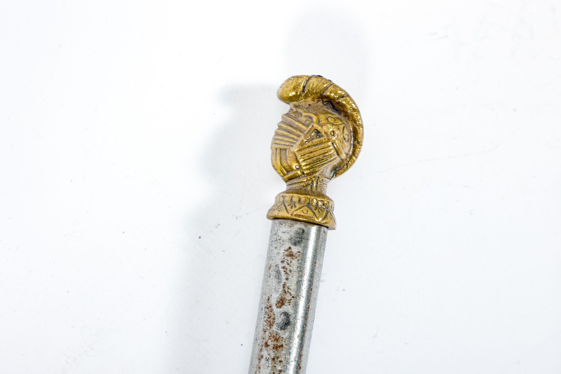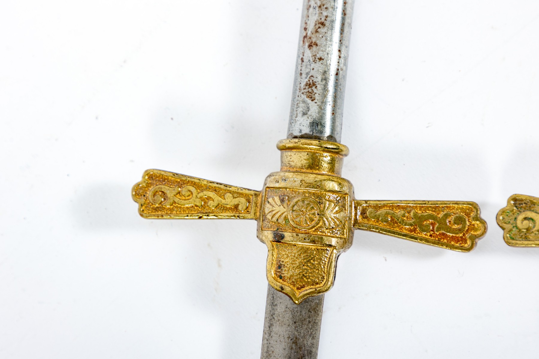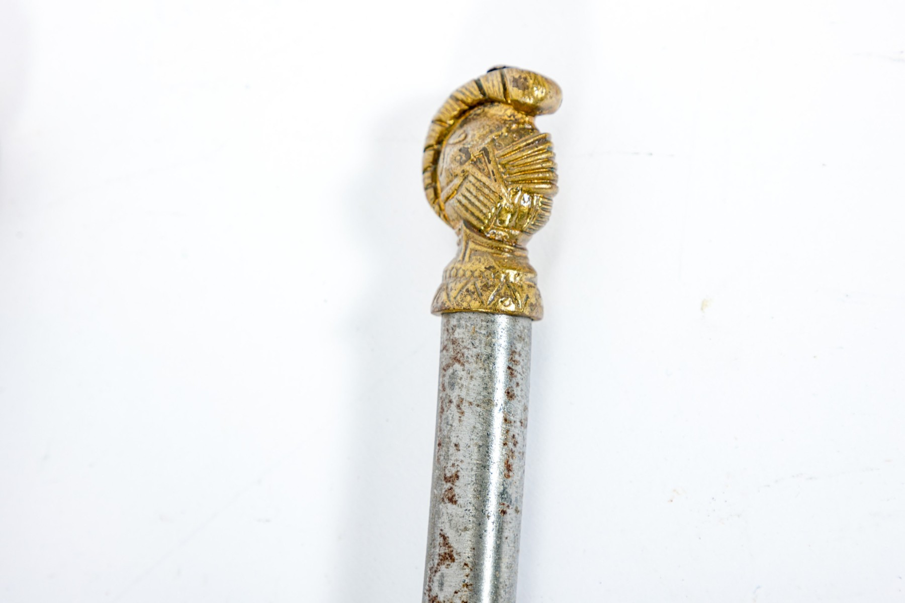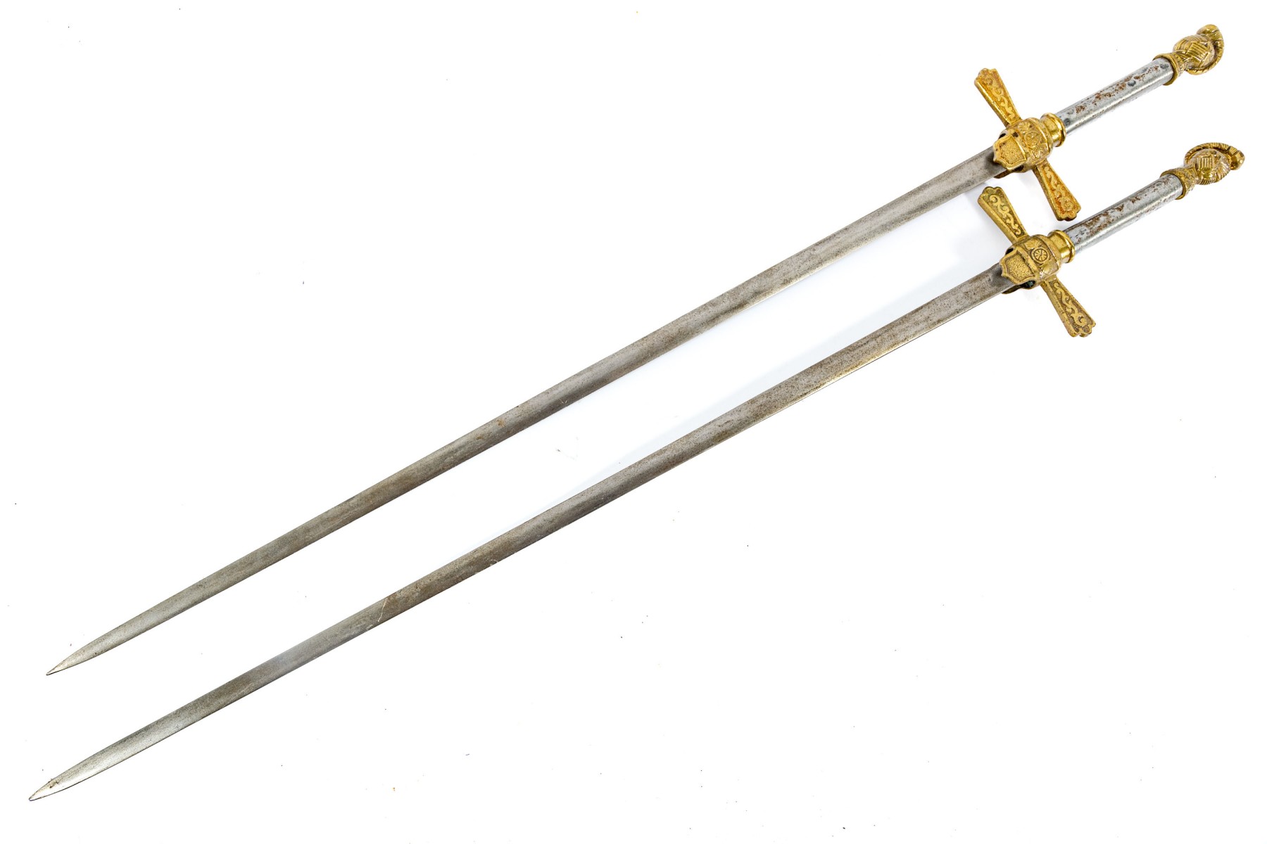 A pair of antique Civil War militia non-commissioned officer's short swords sporting a brass cross-guards, traditional “Knight’s Head” pommels and 27.5" blunt edge blades. Produced circa 1840-50.