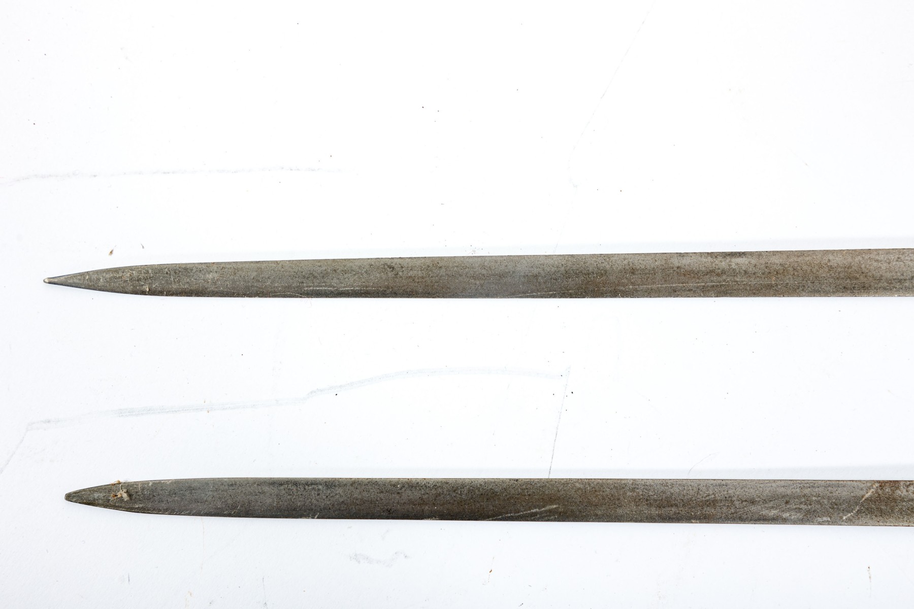 Sword handles are missing their original bone grips and are bare metal. Tarnished and consistent with age.