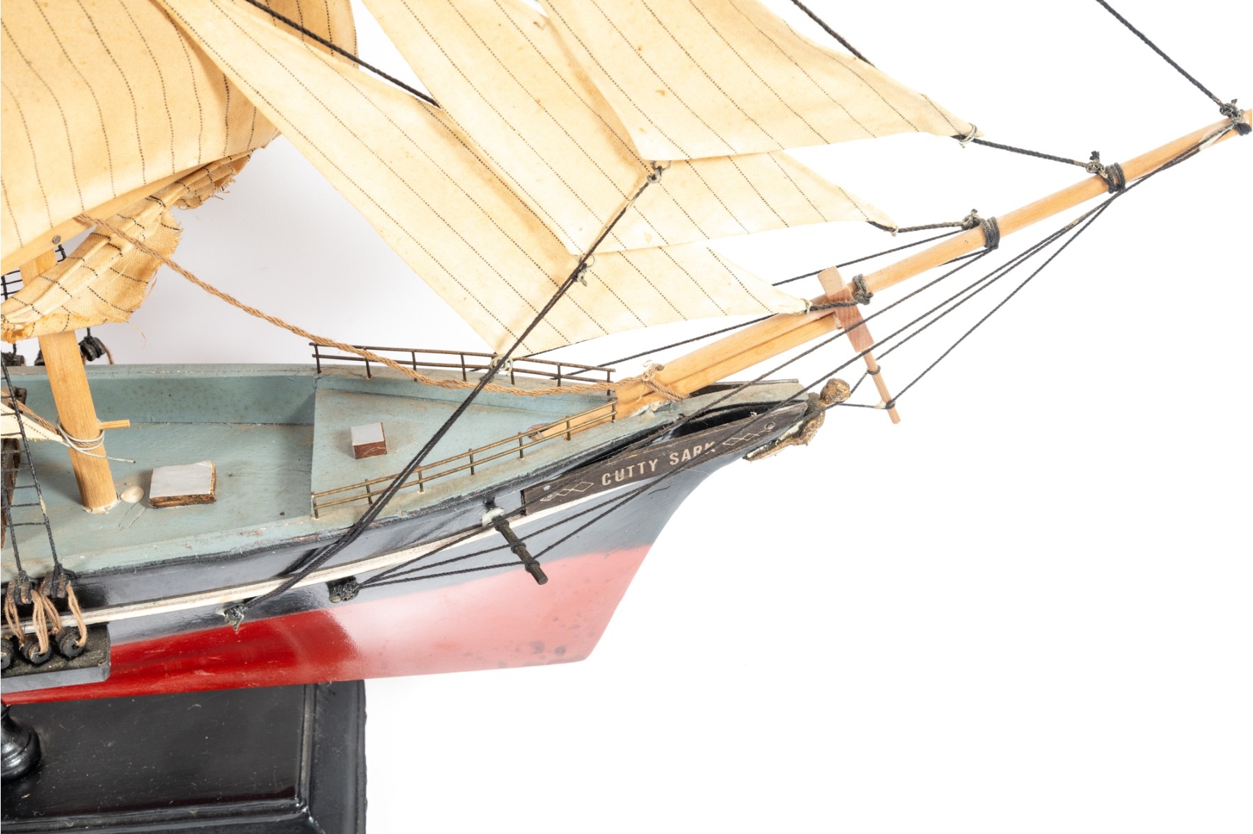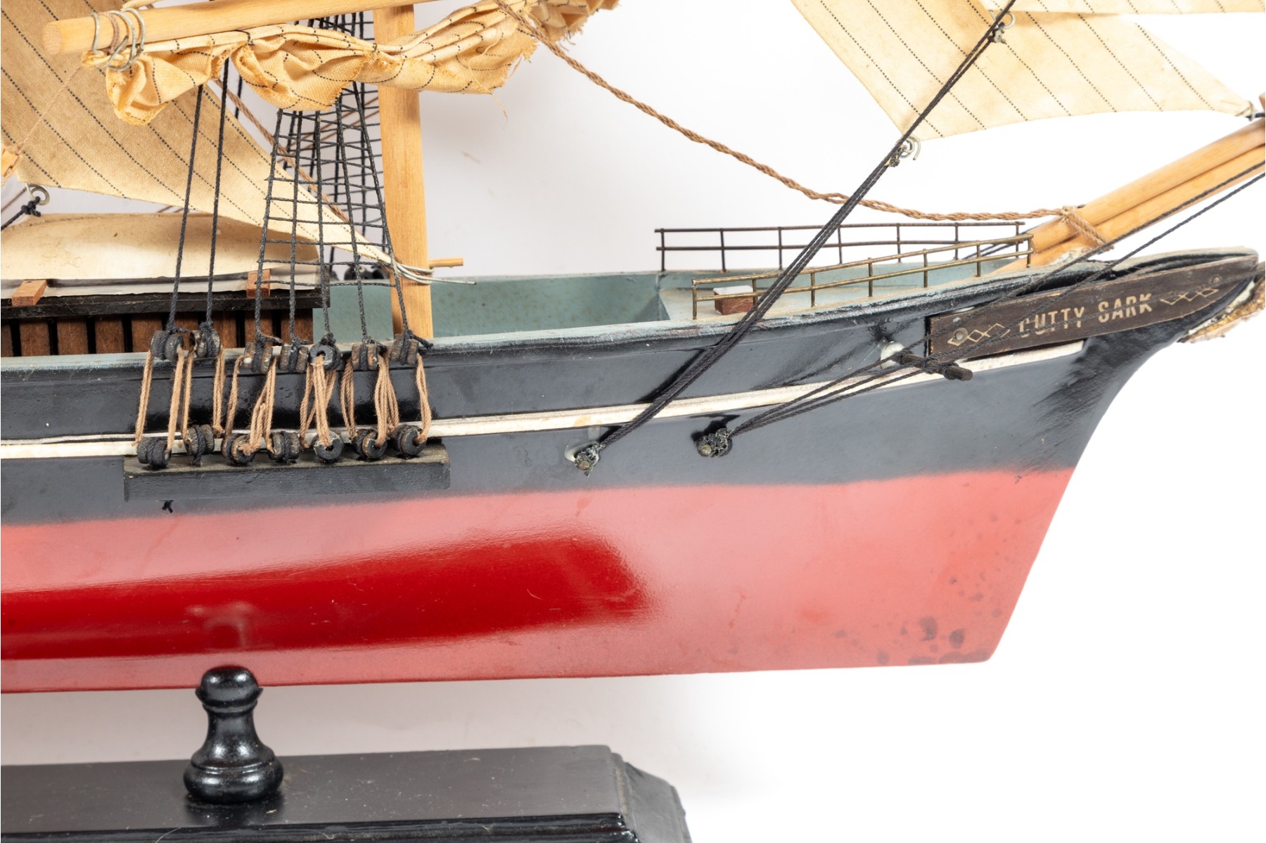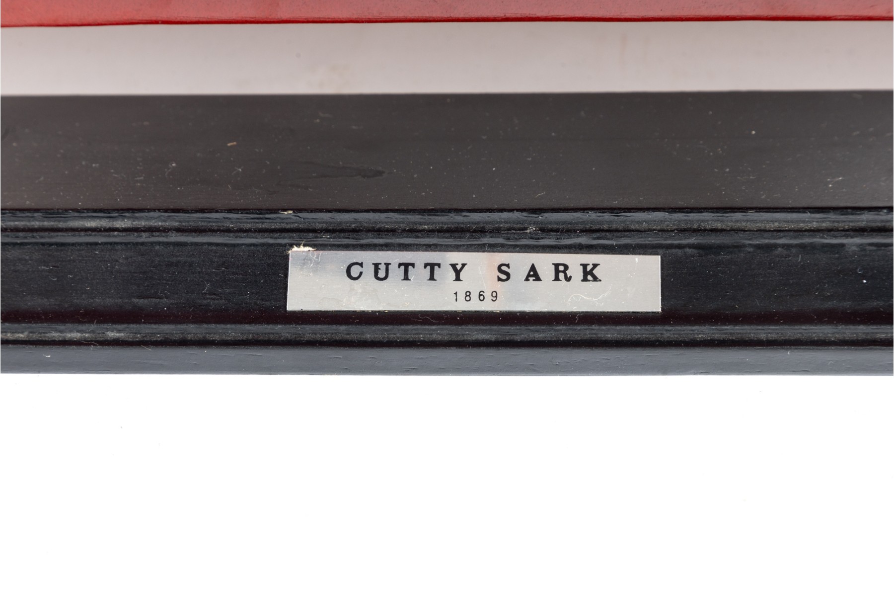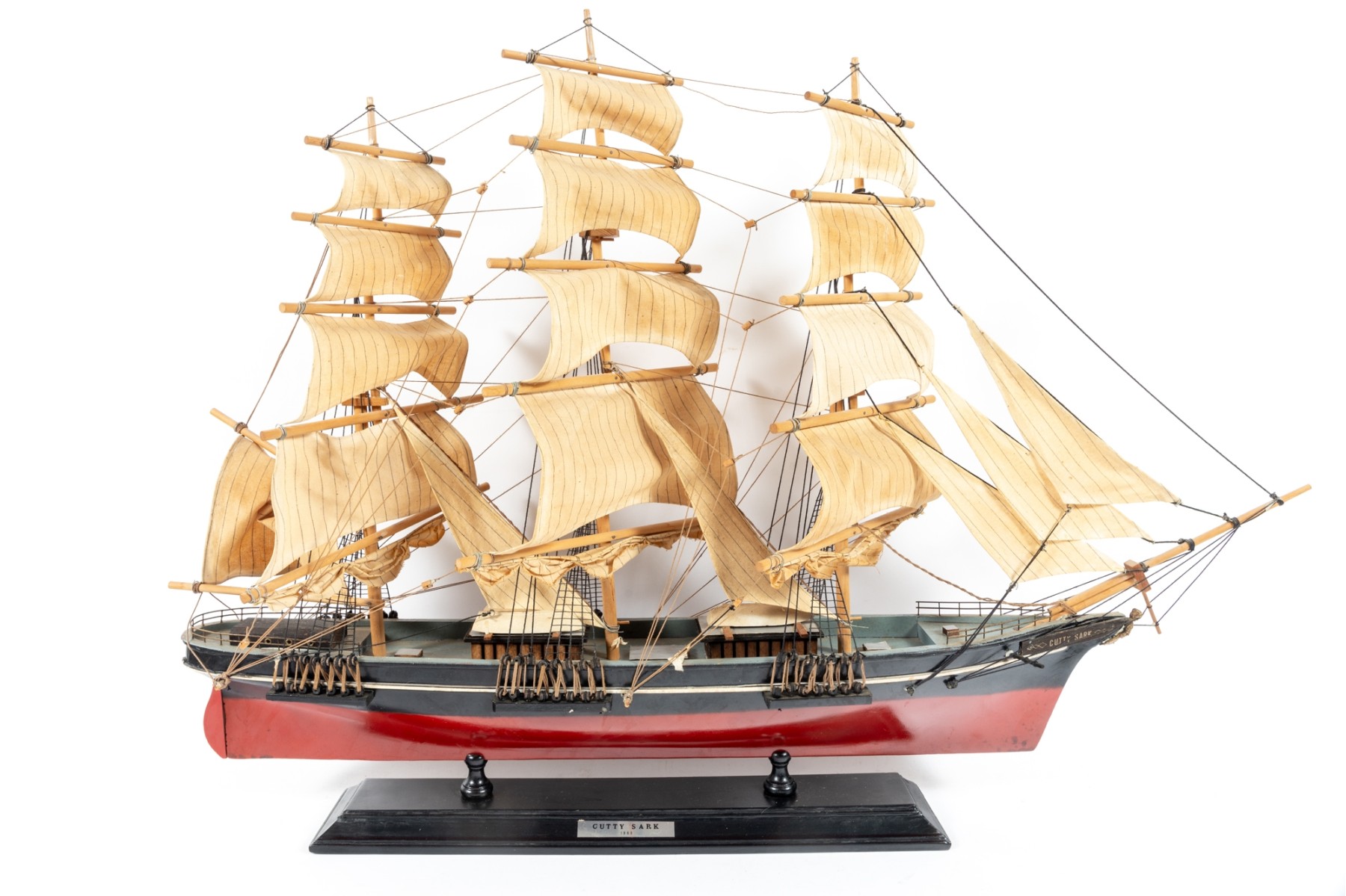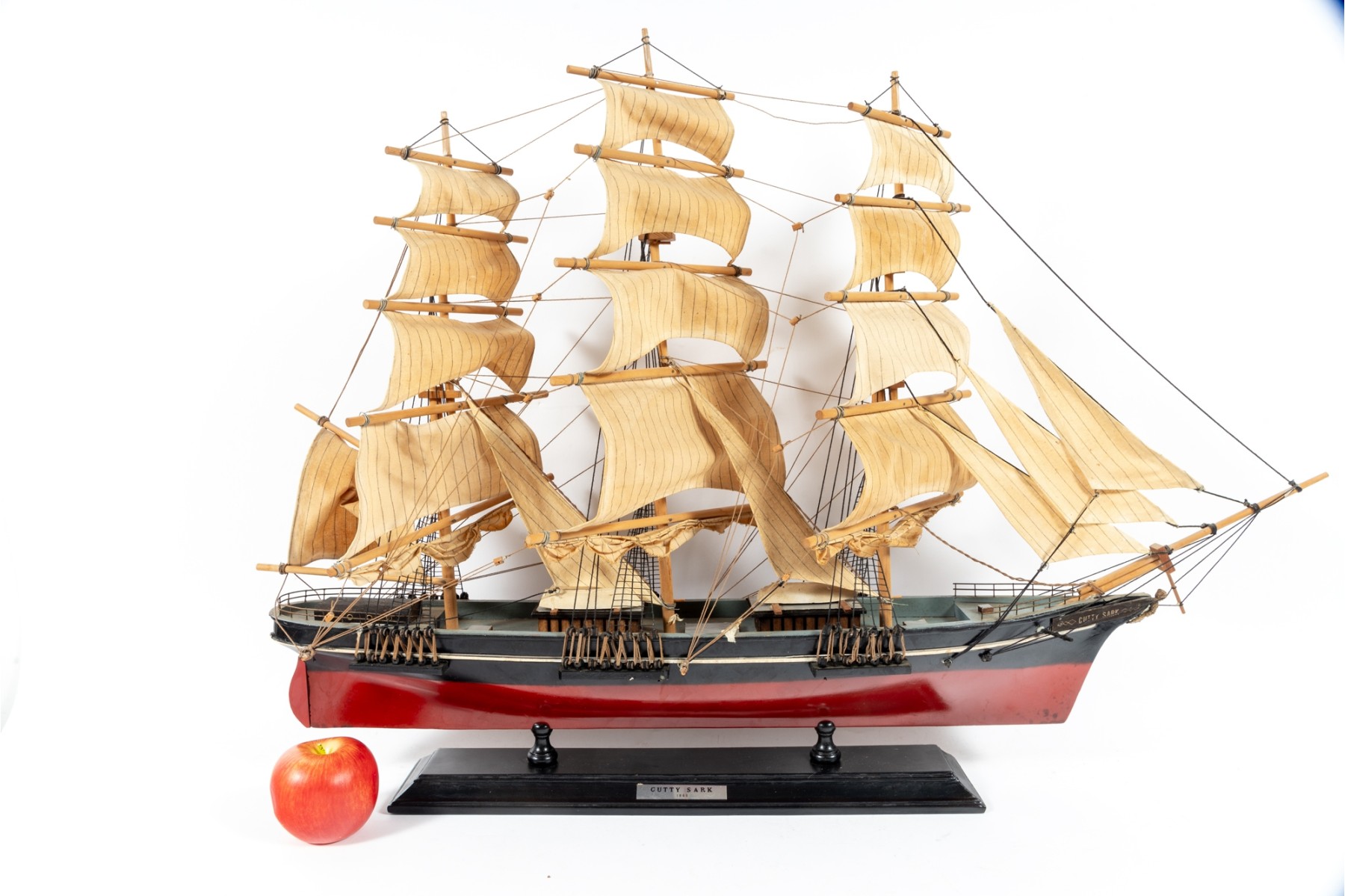 A finely crafted model of the Cutty Sark. This detailed clipper ship features accurately scaled masts, sails, and rigging. The hull is painted to reflect the original design, with intricate woodwork and fittings. Set on a sturdy display base, this replica captures the essence of the historic 19th-century tea clipper in precise detail.
