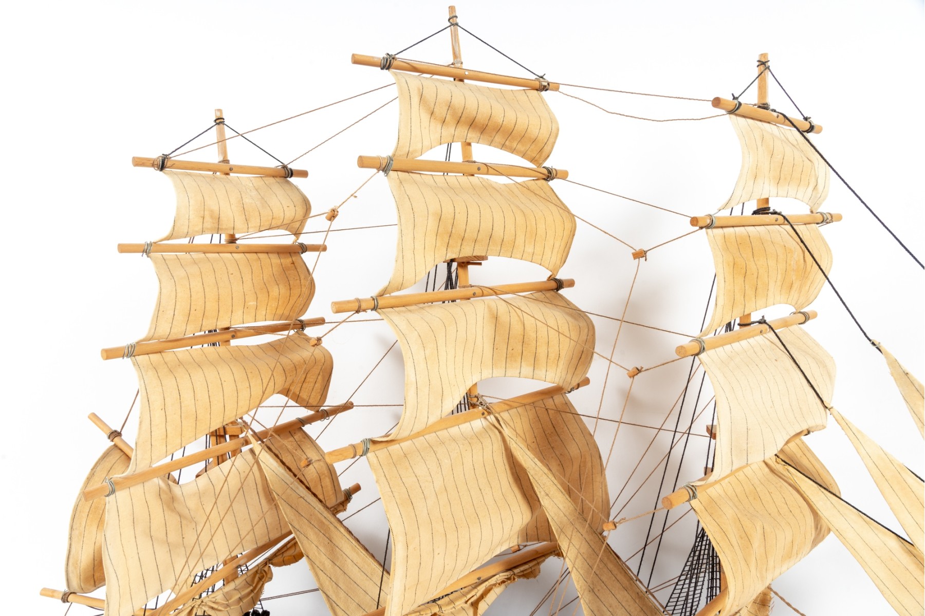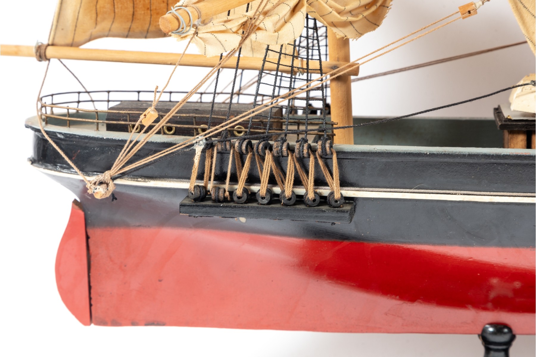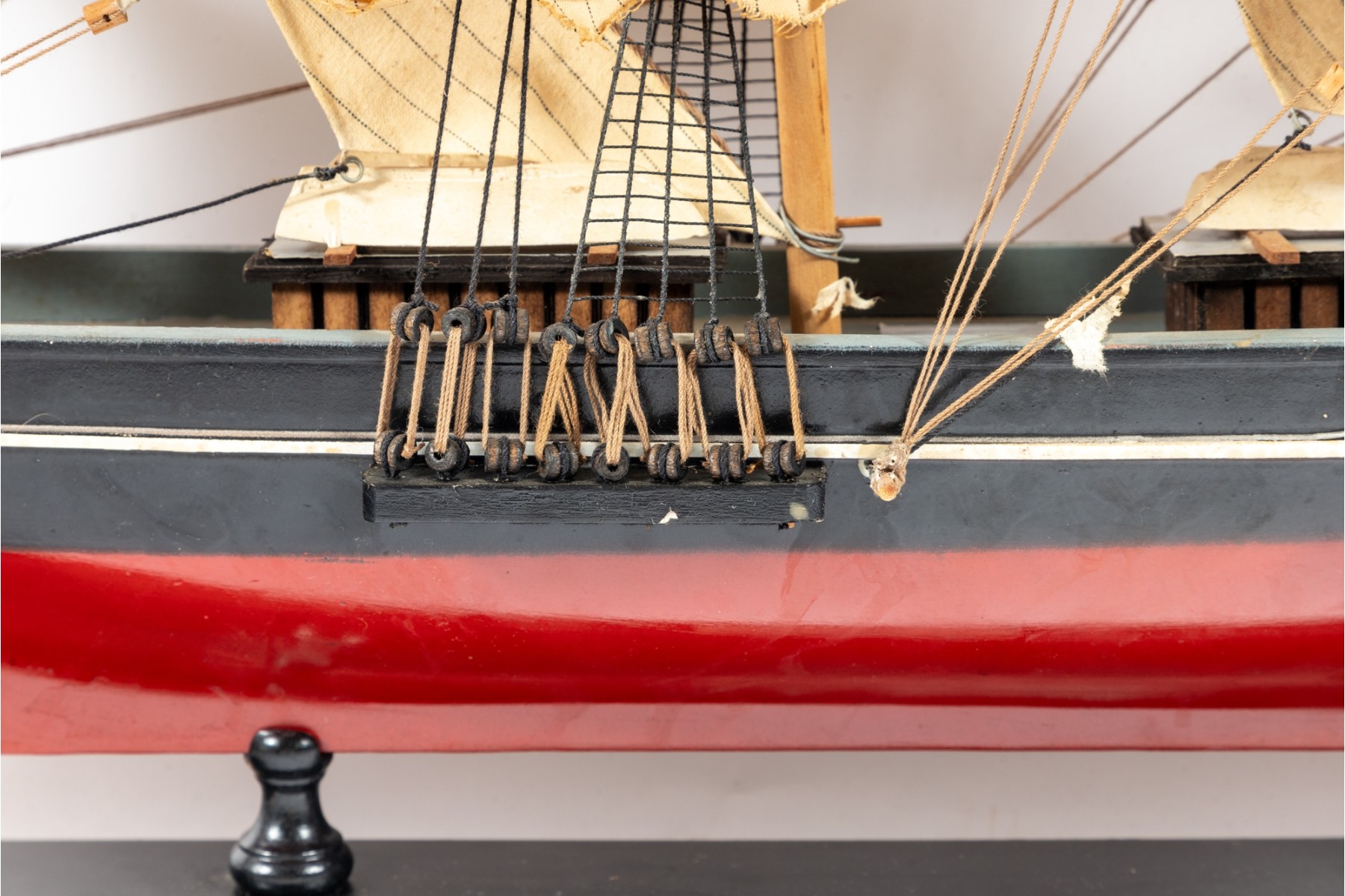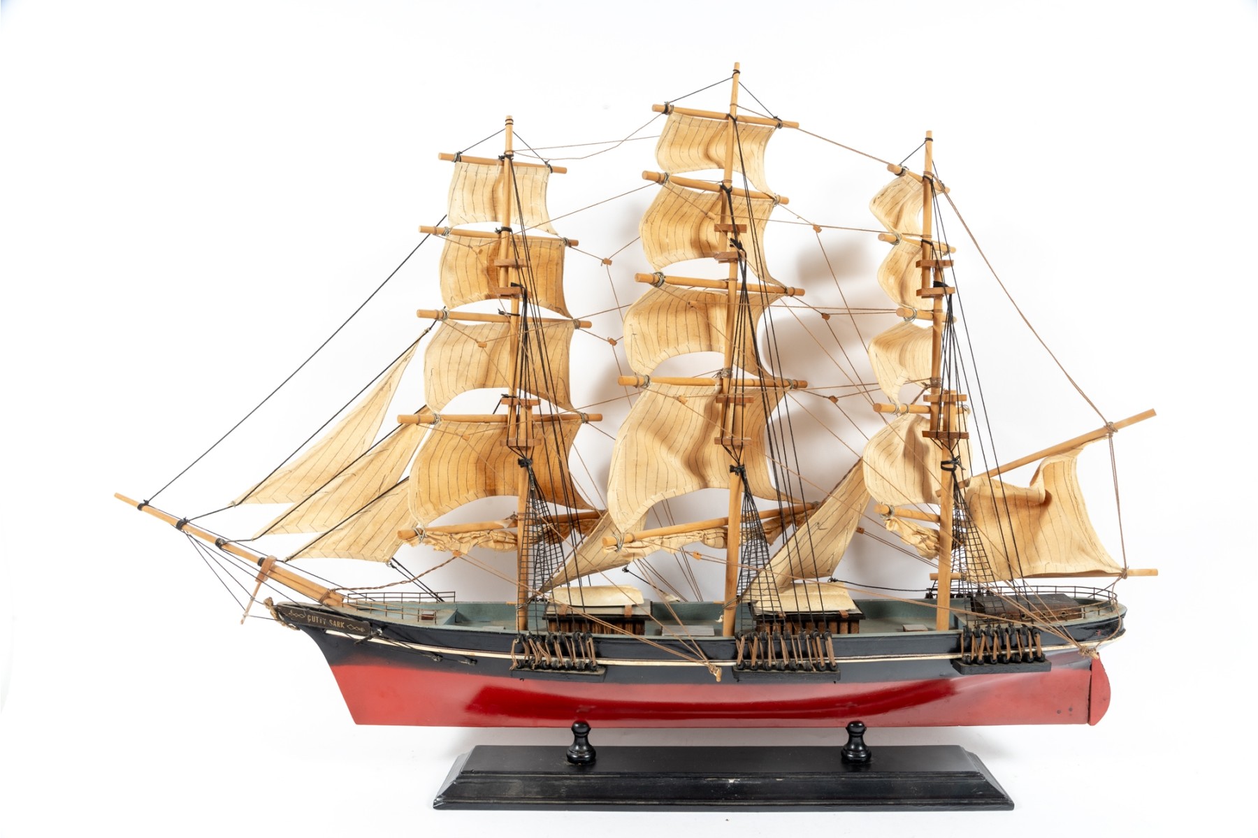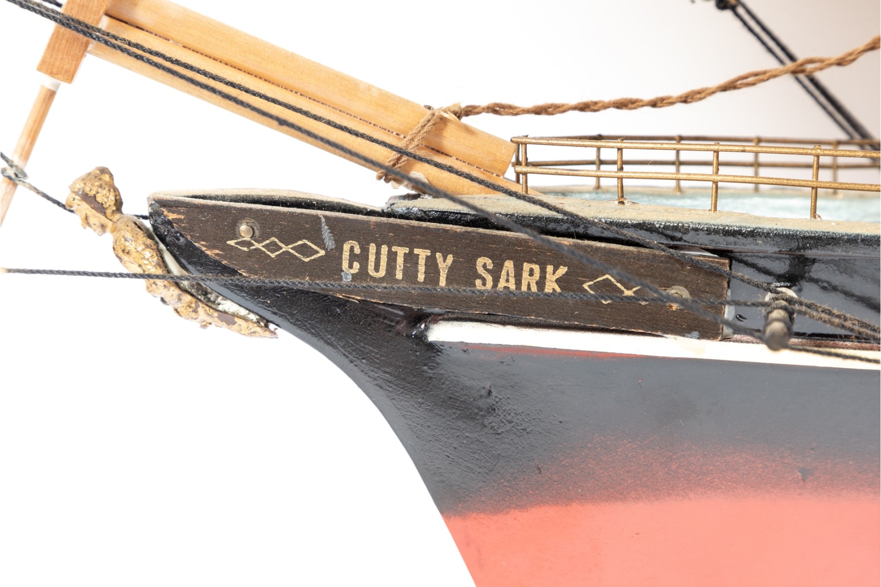 A finely crafted model of the Cutty Sark. This detailed clipper ship features accurately scaled masts, sails, and rigging. The hull is painted to reflect the original design, with intricate woodwork and fittings. Set on a sturdy display base, this replica captures the essence of the historic 19th-century tea clipper in precise detail.