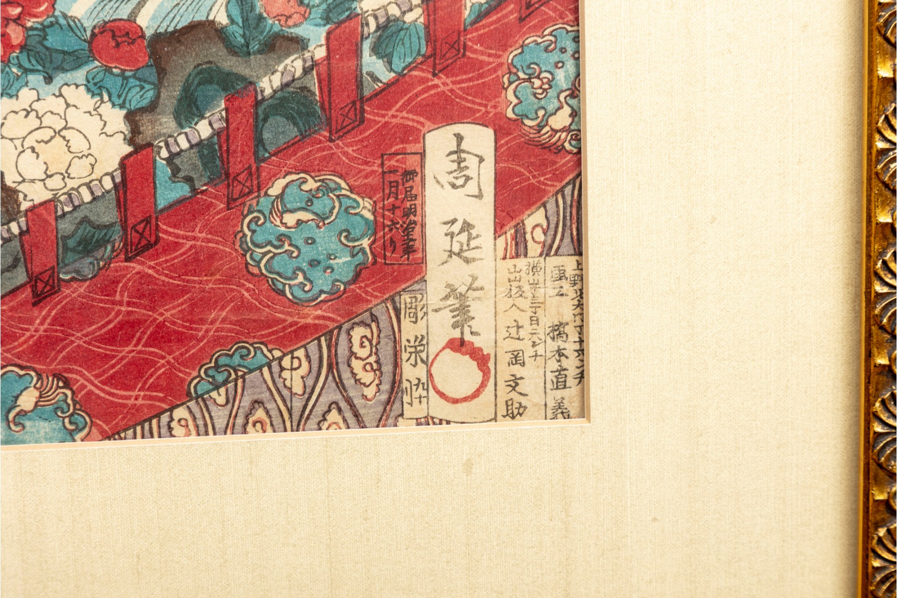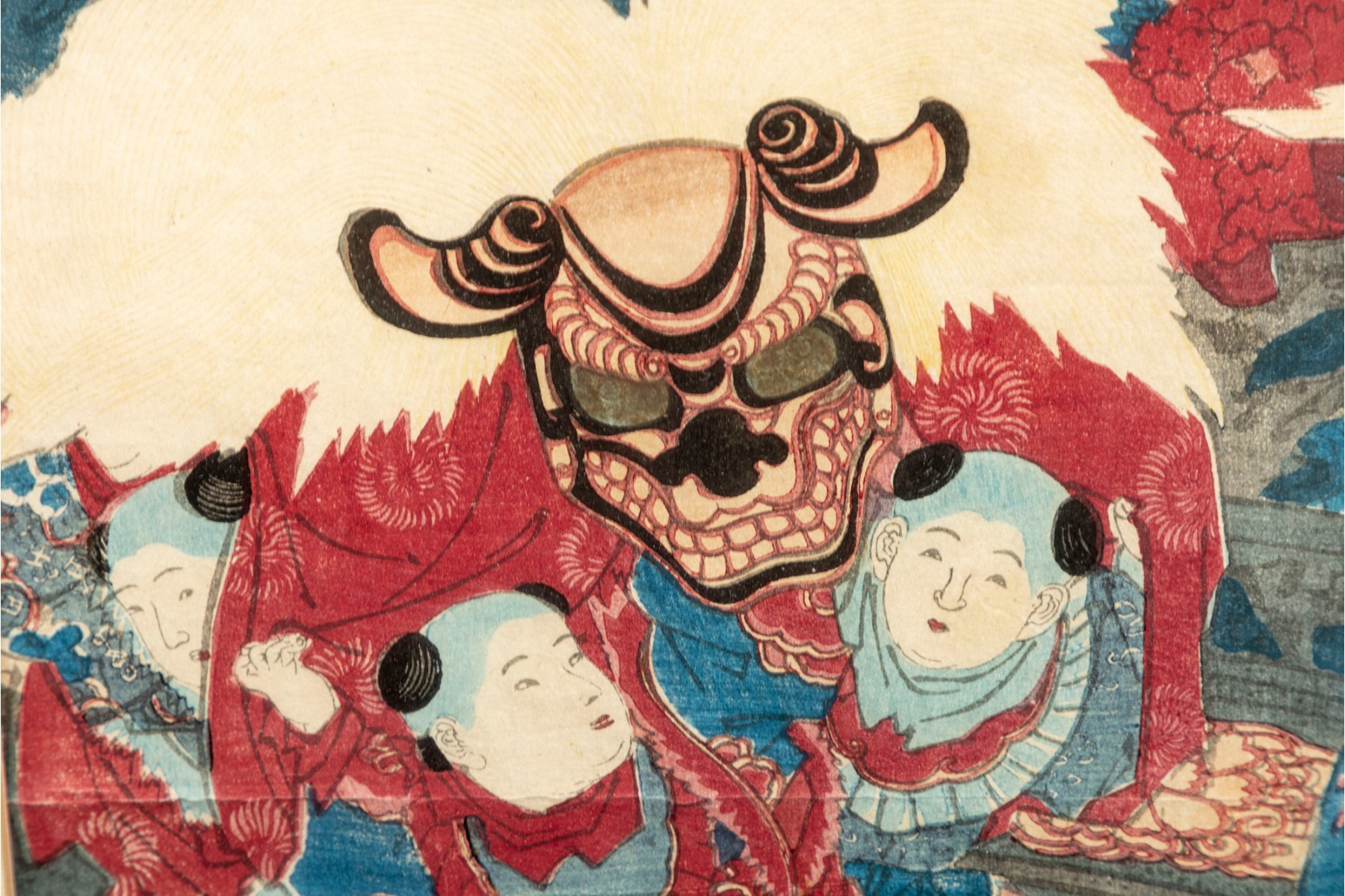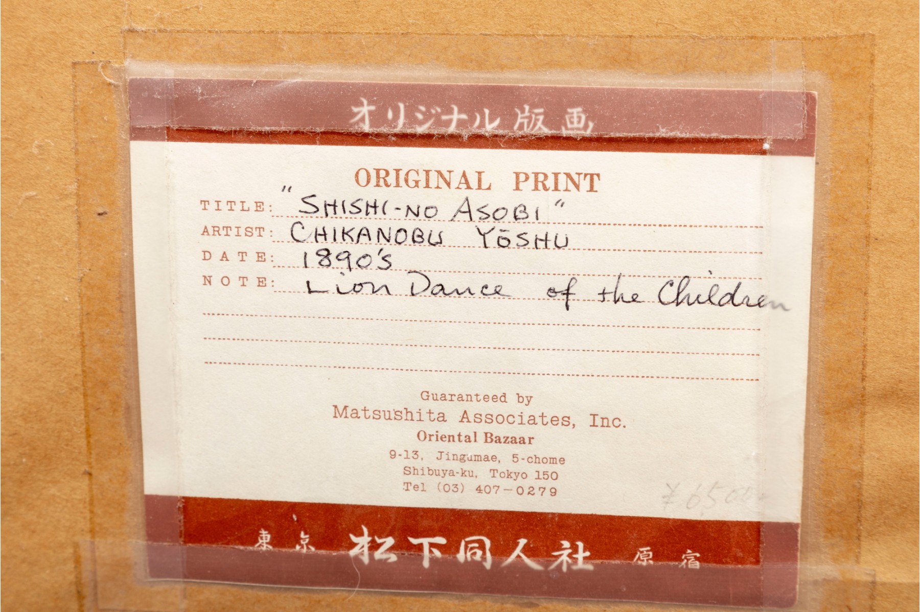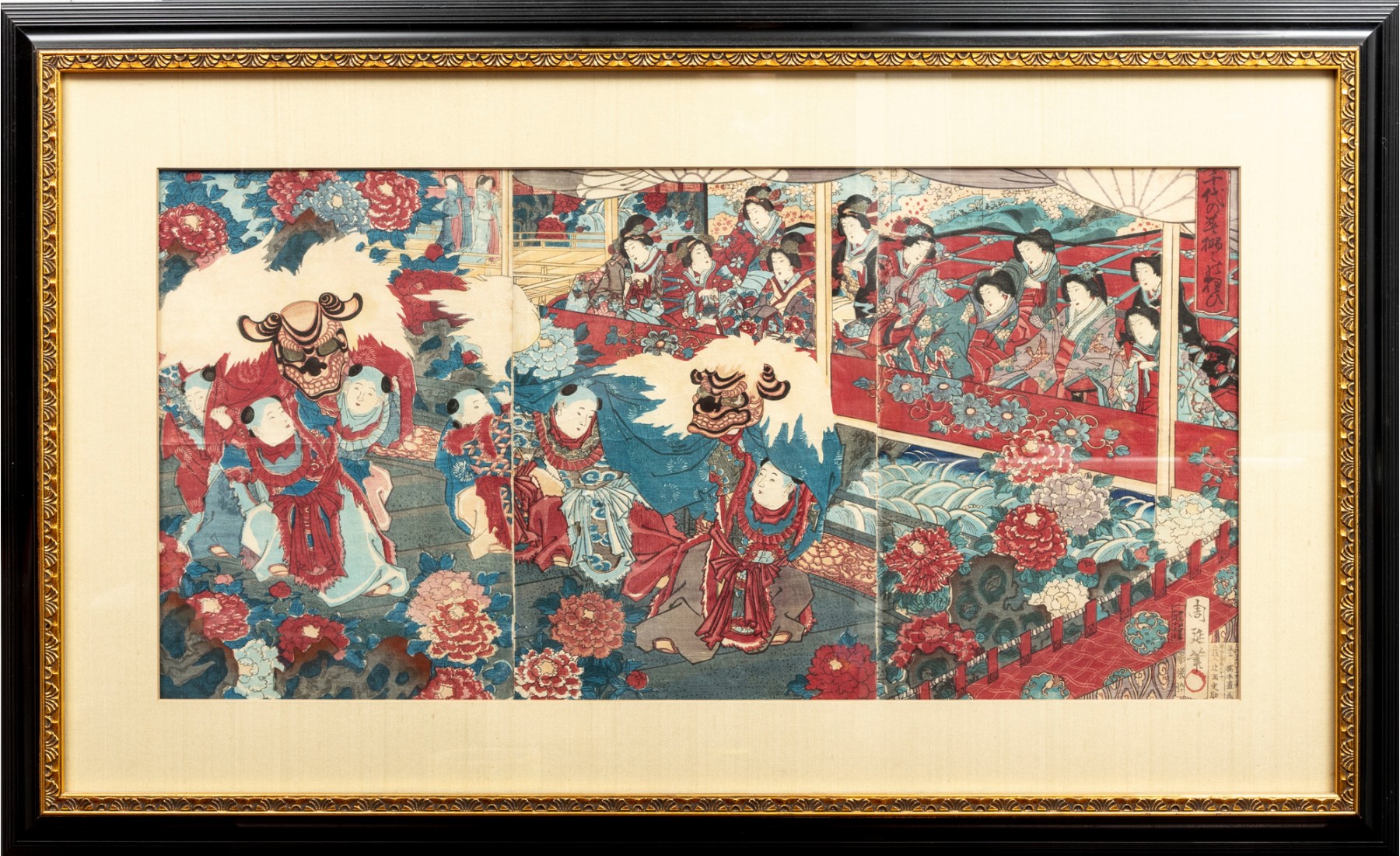 Hashimoto Naoyoshi, also known as "Chikanobu Yoshu" had a storied military life, taking part in The Battle of Ueno and The Battle of Hakodate. In 1875, he took up Ukiyo-e style woodblock printing. Shown here is one such example from the 1890's entitled, "Shishi-no Asobi" which displays a traditional lion dance complet with all three panels. The print is showcased in an ornate gold-tone frame with carved foliates, khaki mat border, and protected via a glass facing.