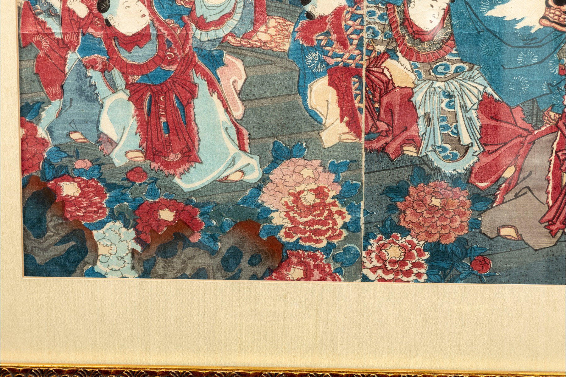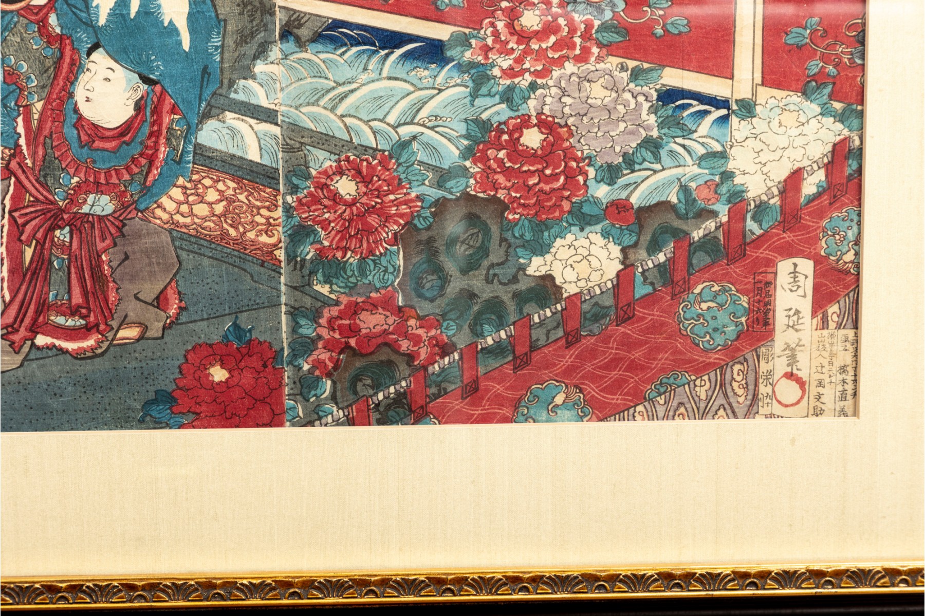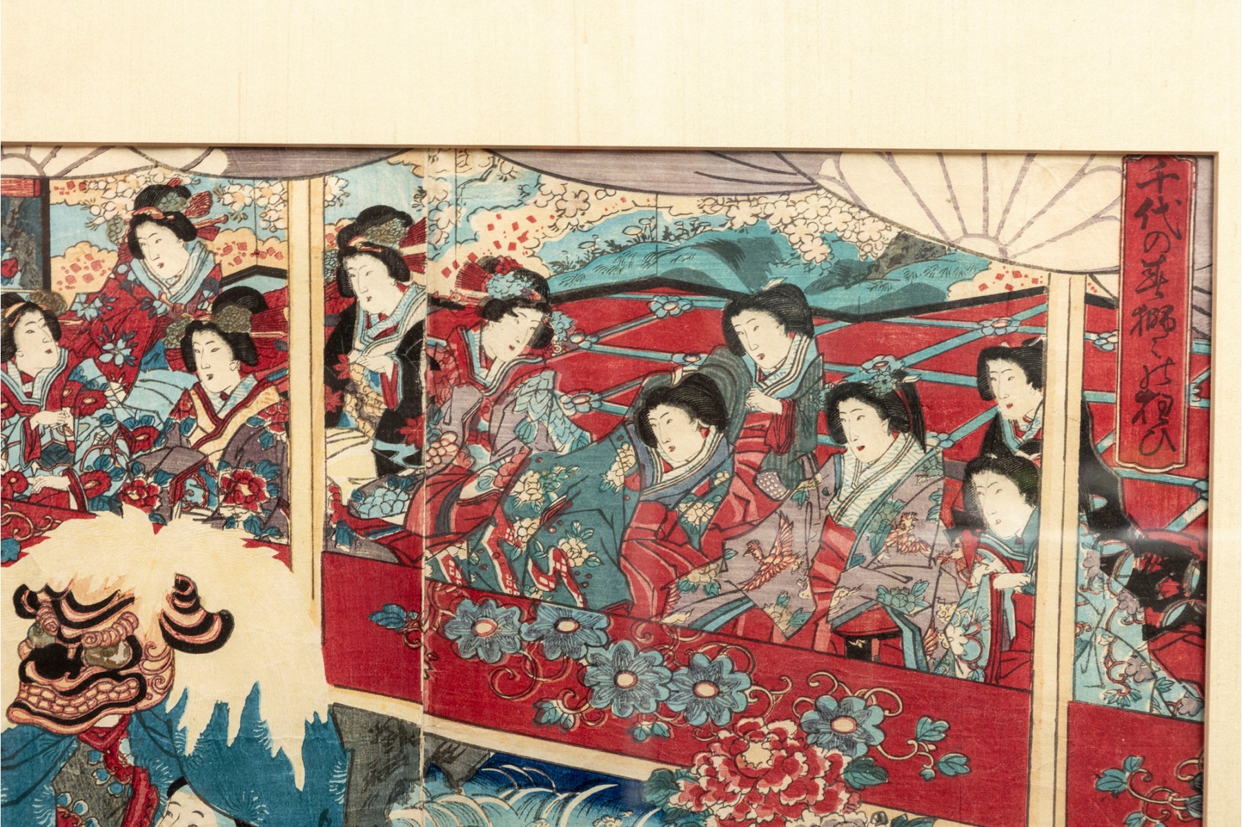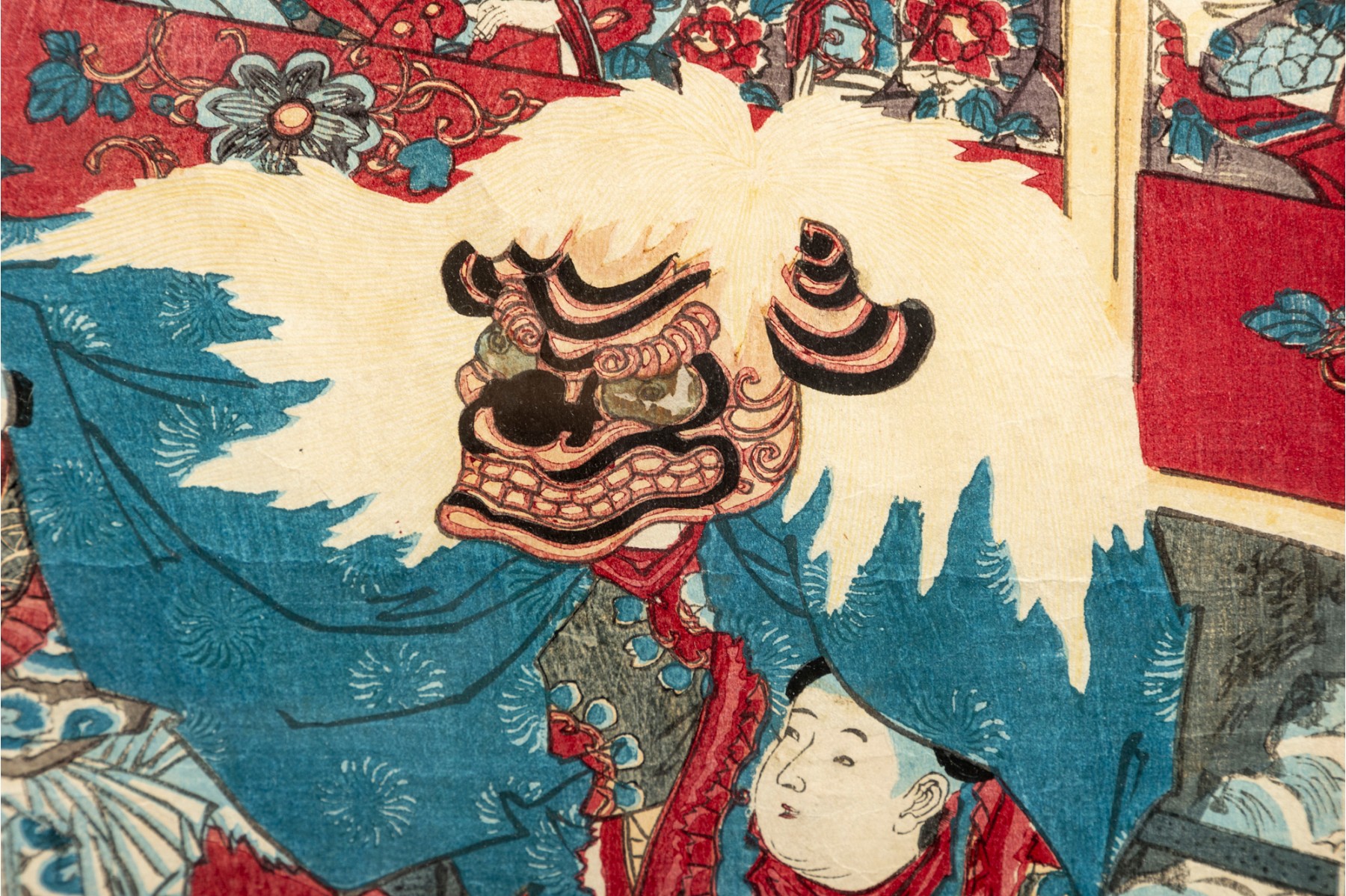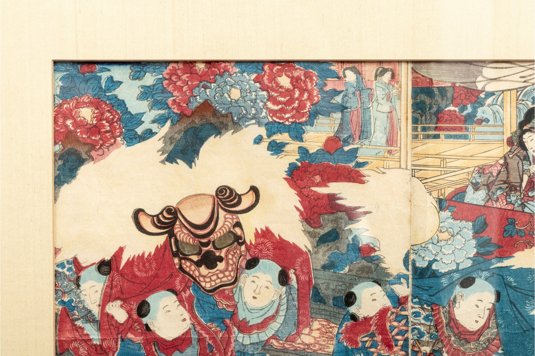 Hashimoto Naoyoshi, also known as "Chikanobu Yoshu" had a storied military life, taking part in The Battle of Ueno and The Battle of Hakodate. In 1875, he took up Ukiyo-e style woodblock printing. Shown here is one such example from the 1890's entitled, "Shishi-no Asobi" which displays a traditional lion dance complet with all three panels. The print is showcased in an ornate gold-tone frame with carved foliates, khaki mat border, and protected via a glass facing.