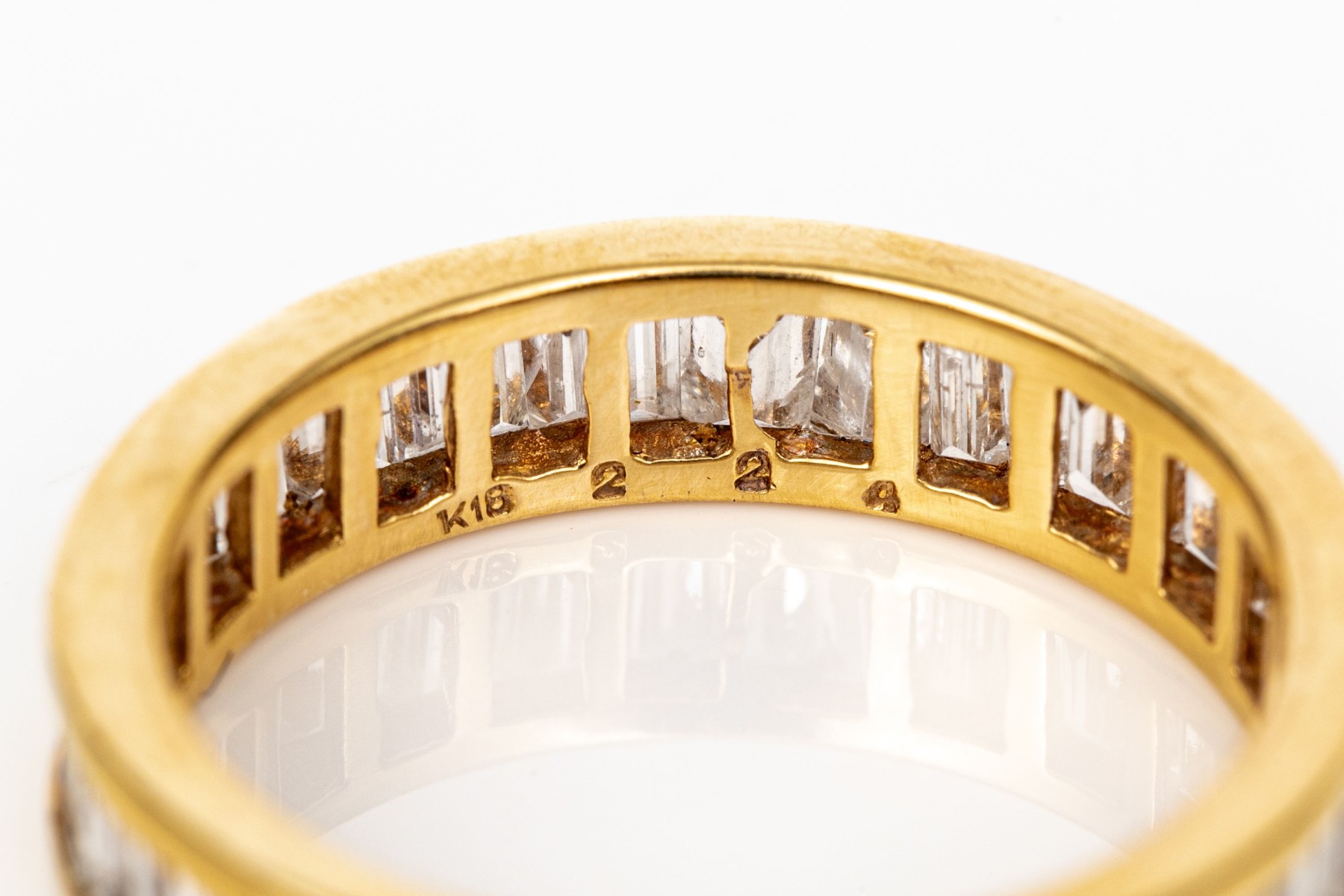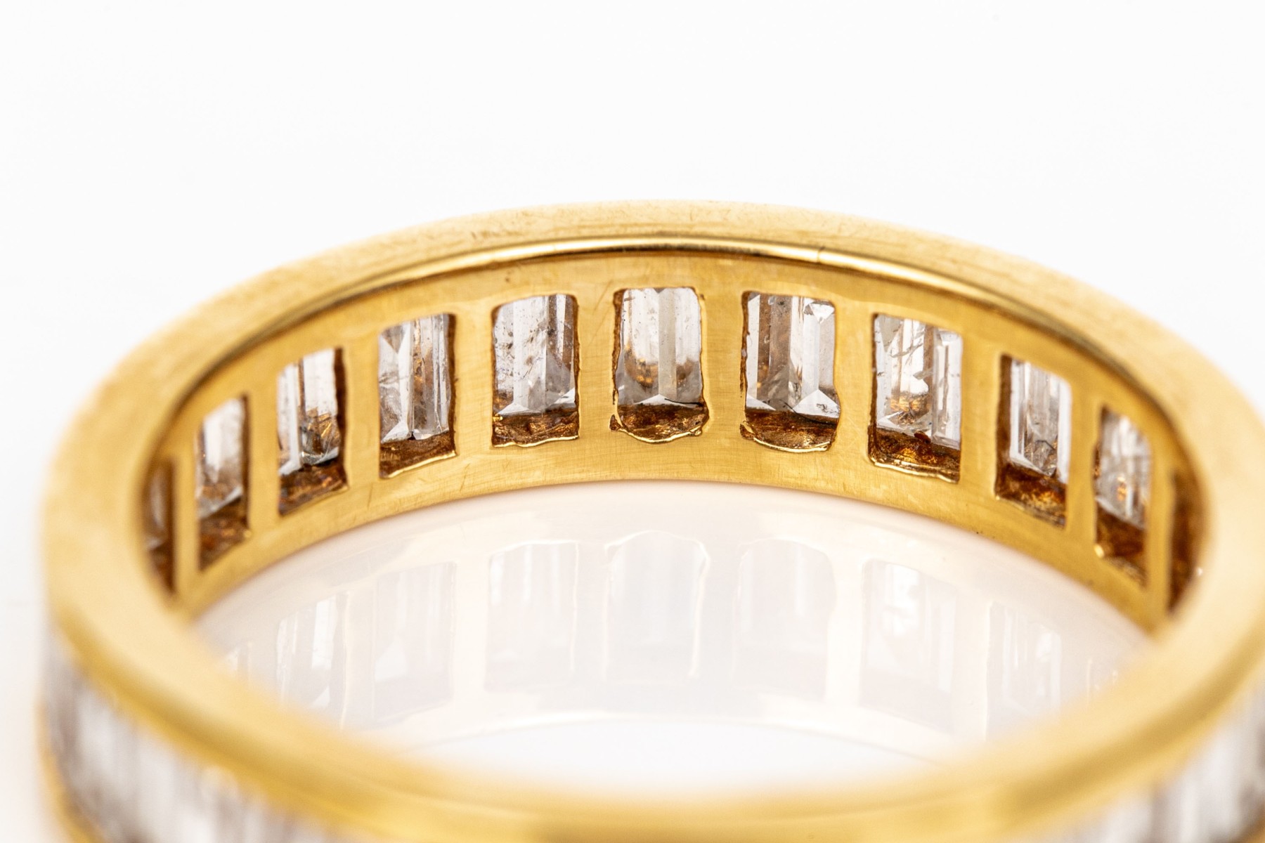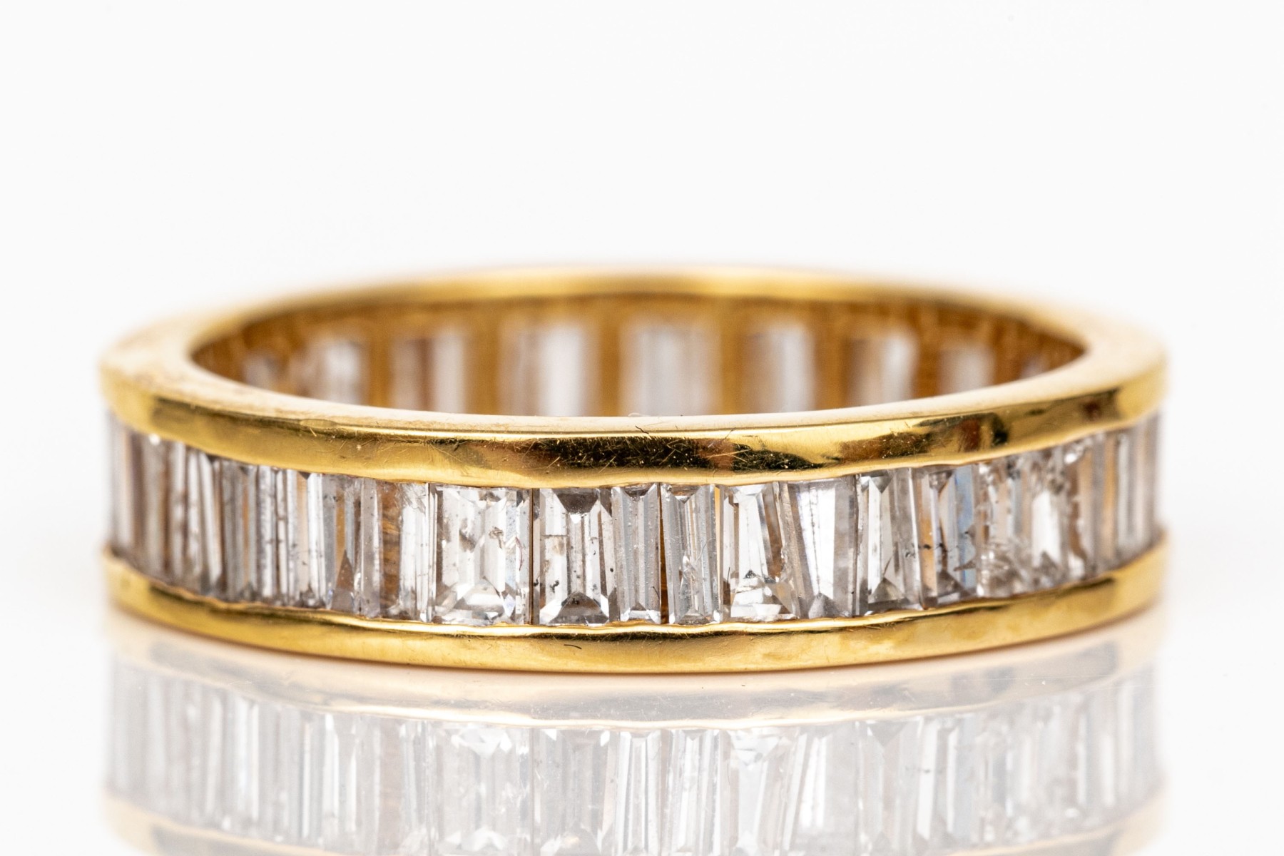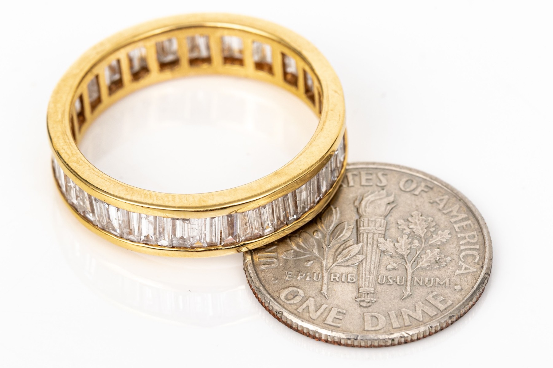18k yellow gold fabulous channel set baguette diamond eternity band ring, app. 2.00 TCW, size 8, please see sizing note. The diamonds are SI1 to I1 clarity, I to J color