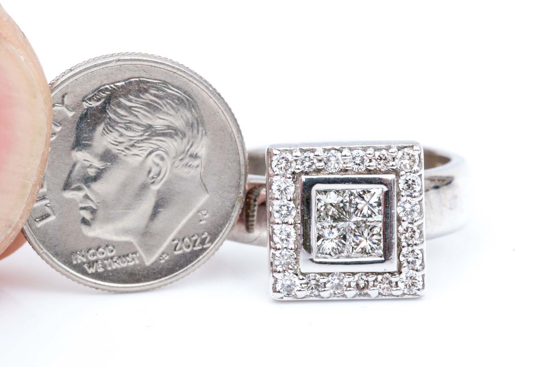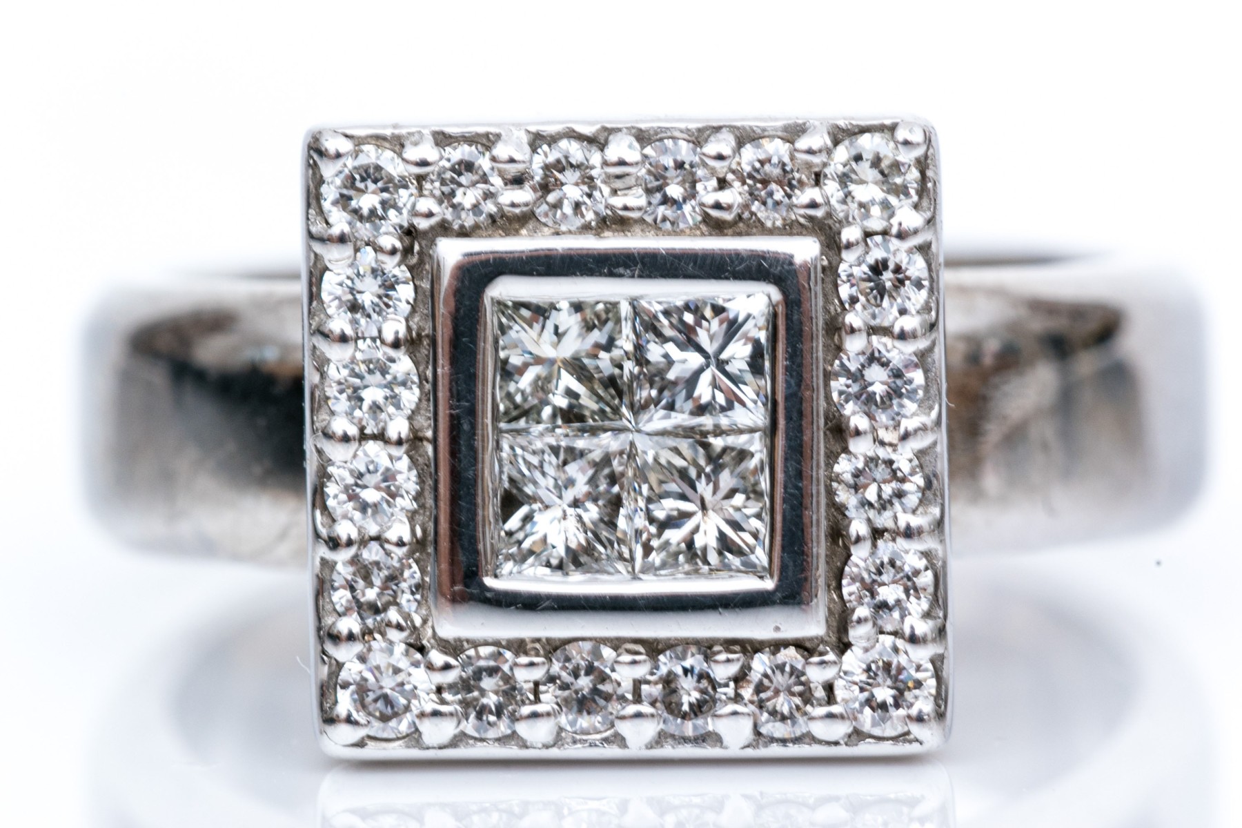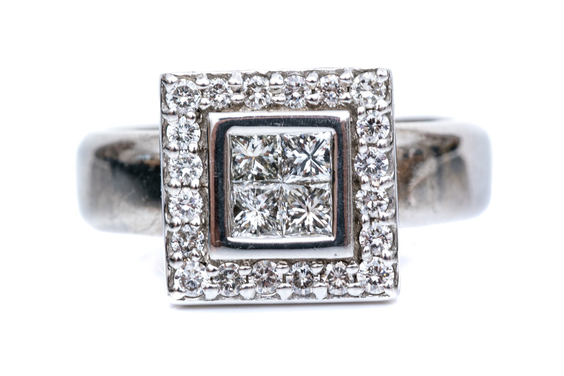 18K white gold ring. This eye-catching ring has a square face set with princess cut diamonds clustered at the center and framed in brilliant cut diamonds. Diamonds approximately 0.8 TCW. Ring size 7.25.