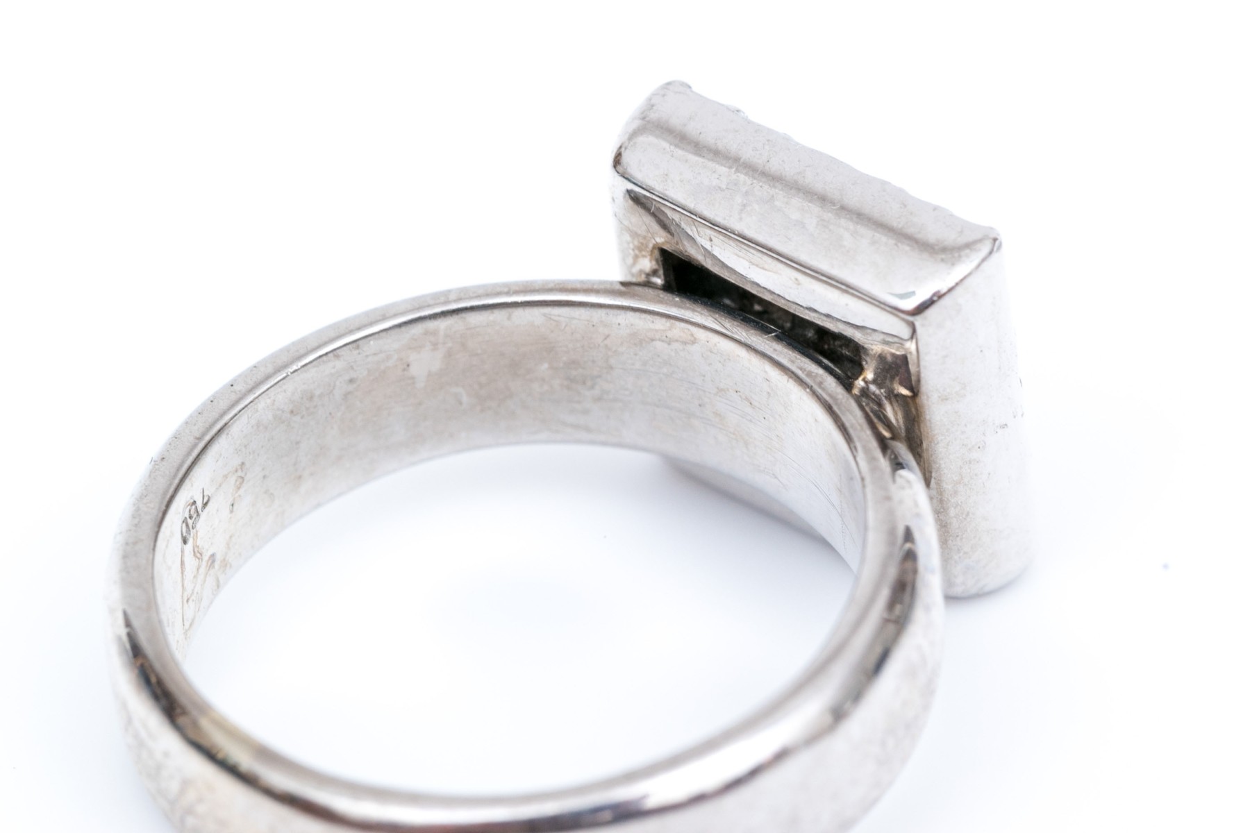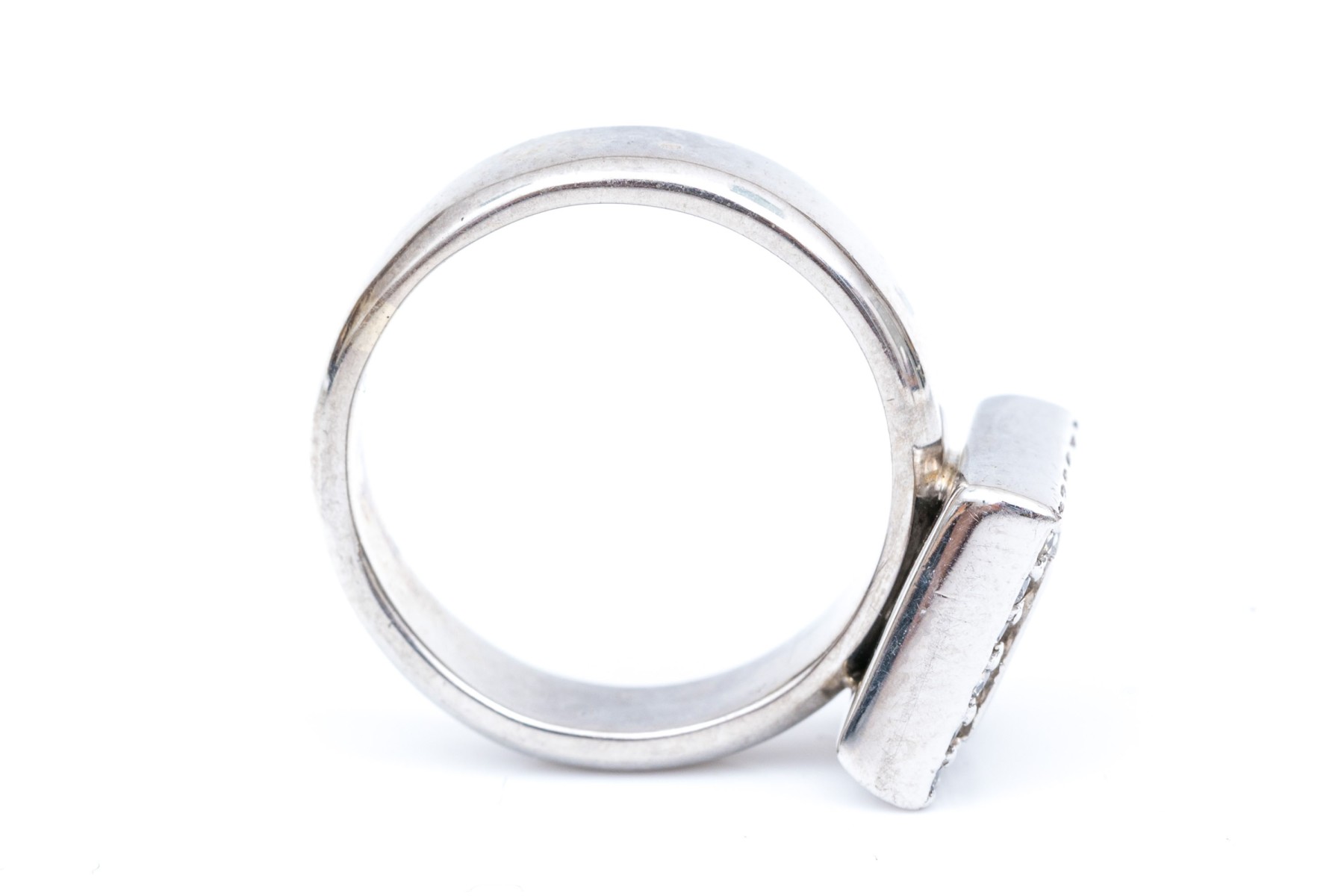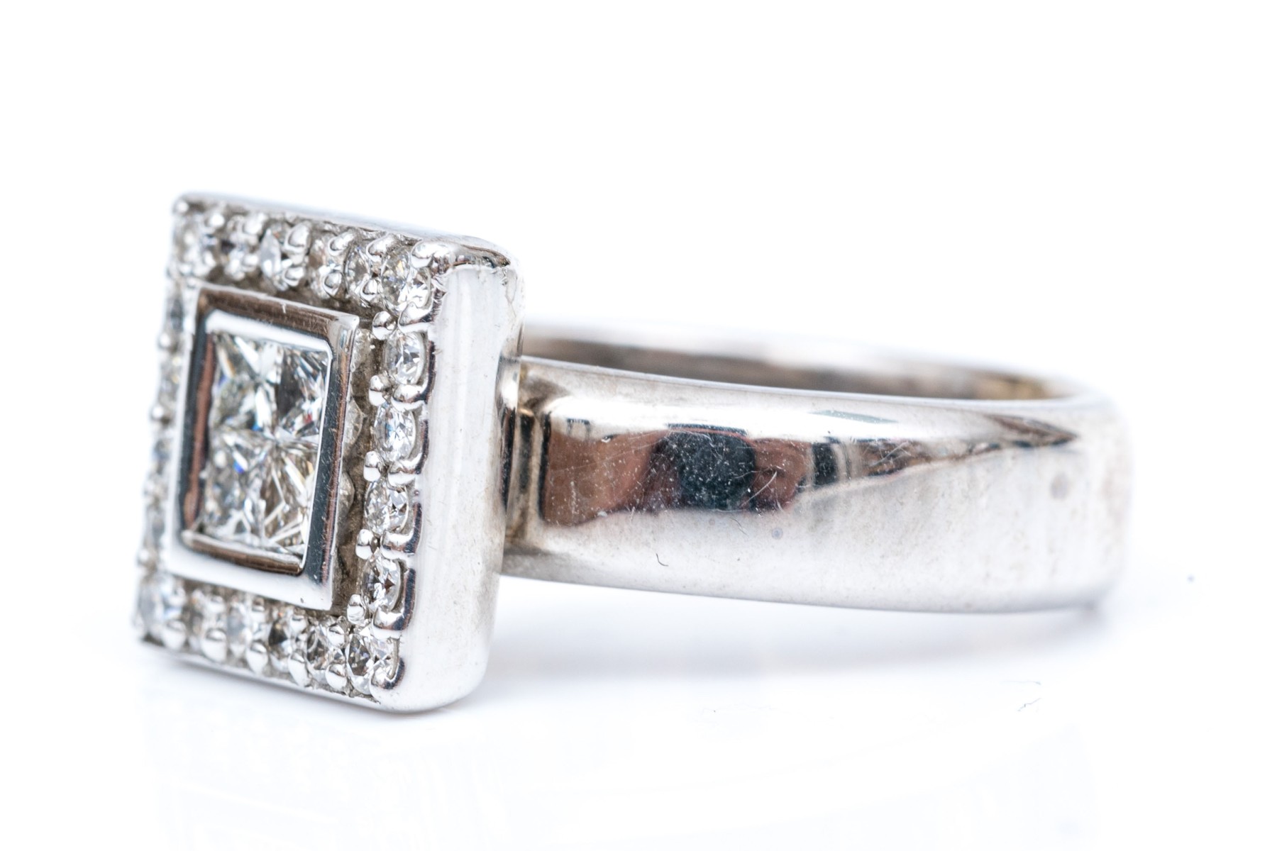 18K white gold ring. This eye-catching ring has a square face set with princess cut diamonds clustered at the center and framed in brilliant cut diamonds. Diamonds approximately 0.8 TCW. Ring size 7.25.