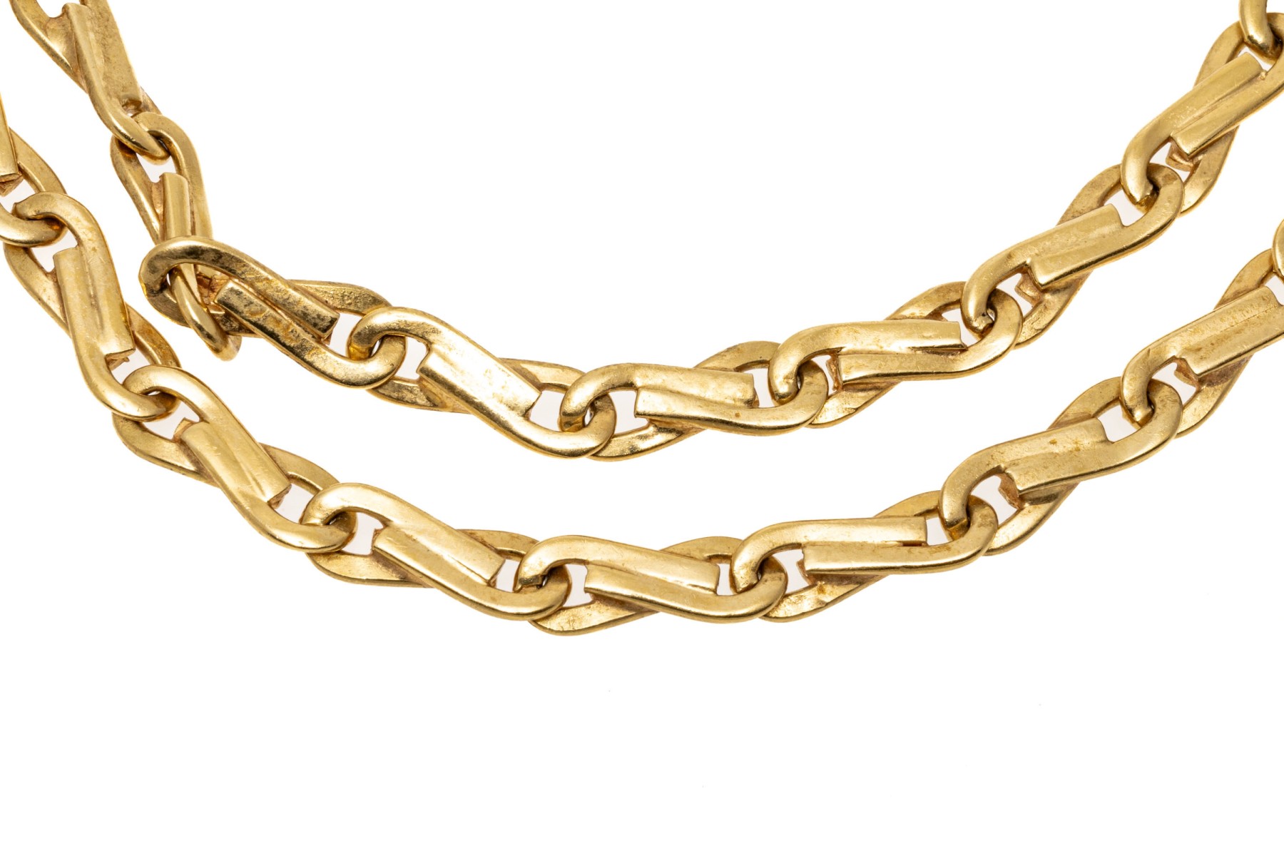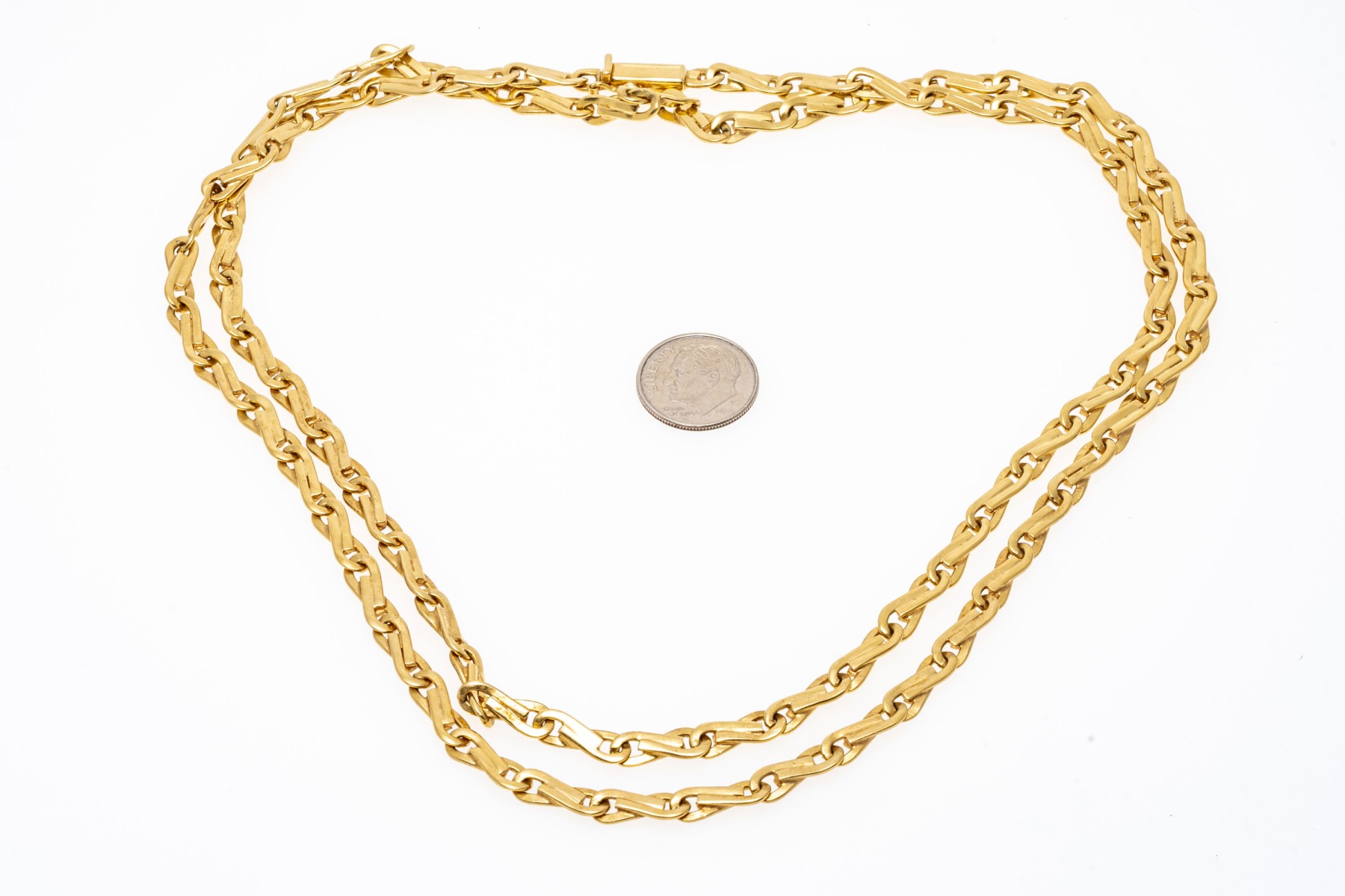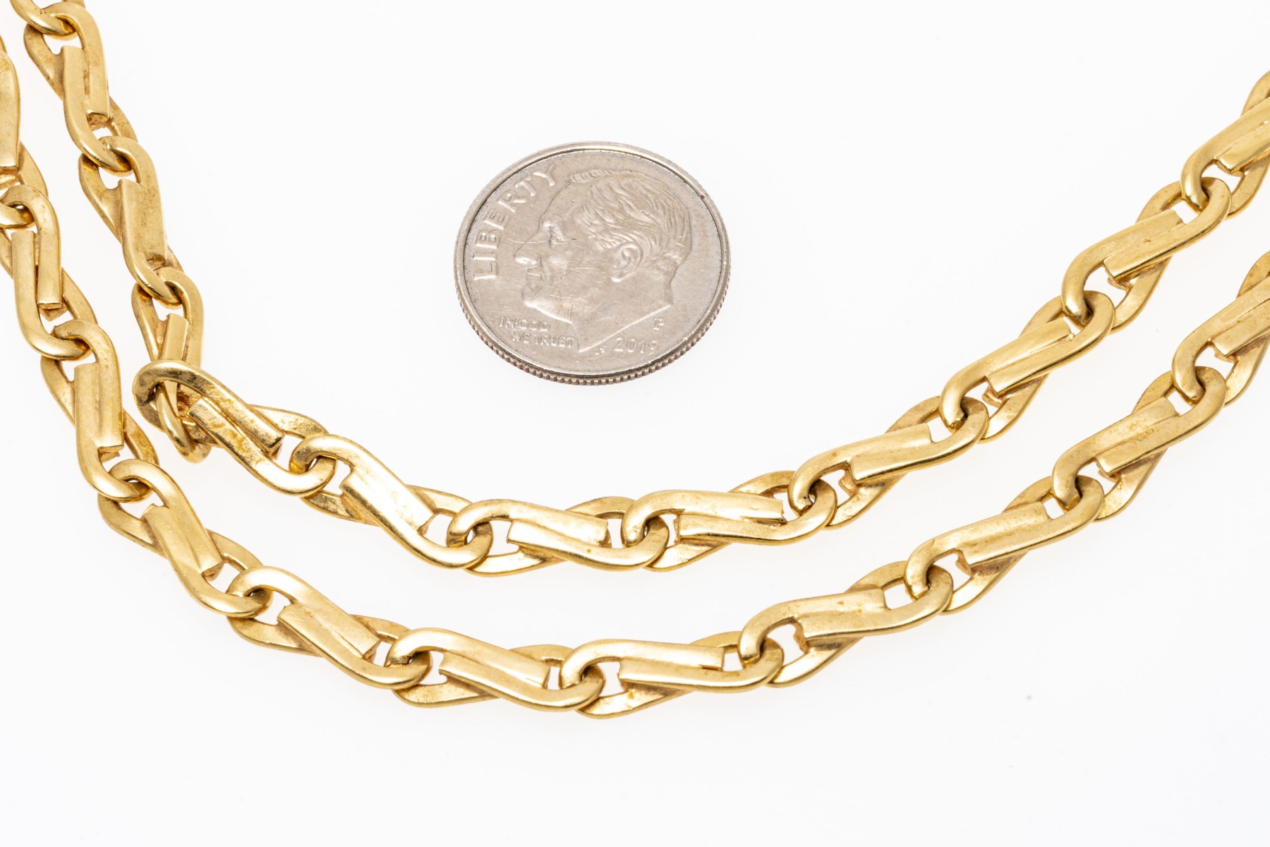 18k yellow gold striking heavy figure eight style opera length link necklace, 43.3 dwt. The necklace is finished by a box style clasp and a figure eight style safety