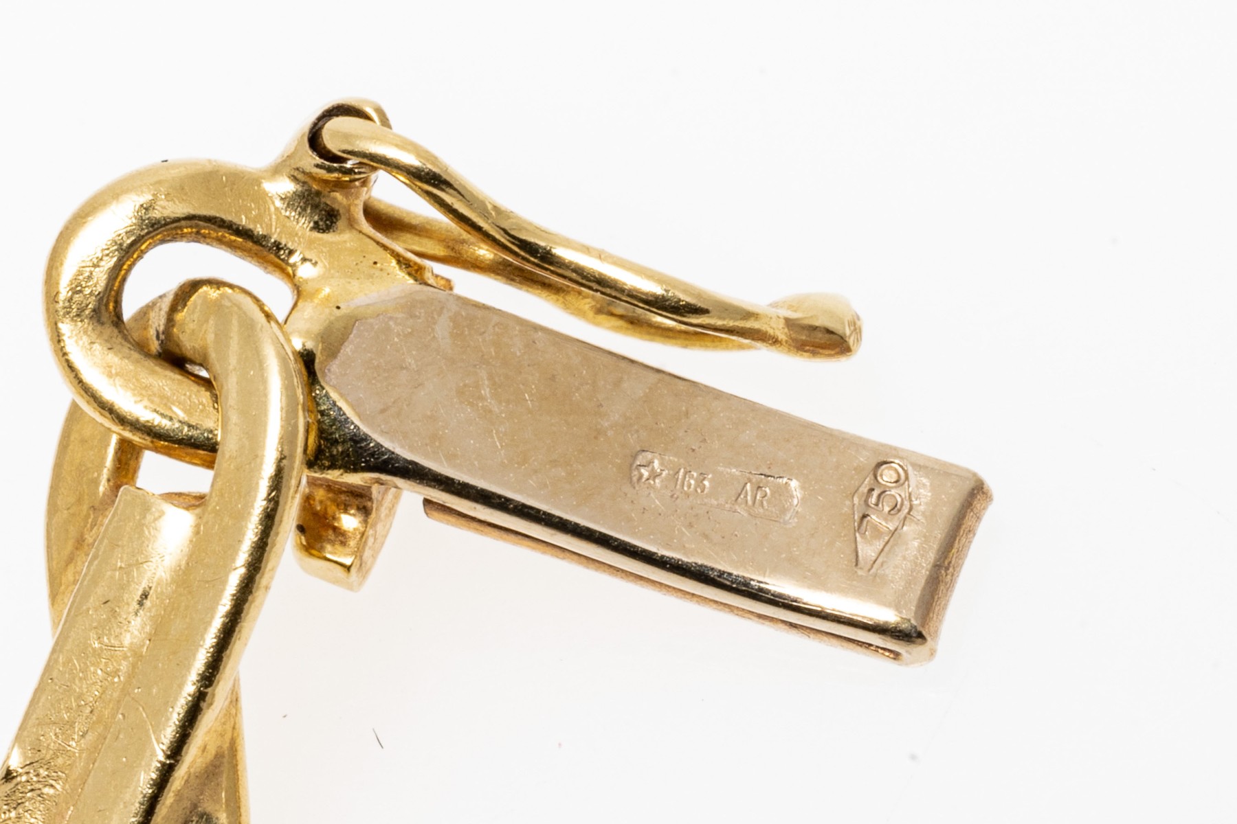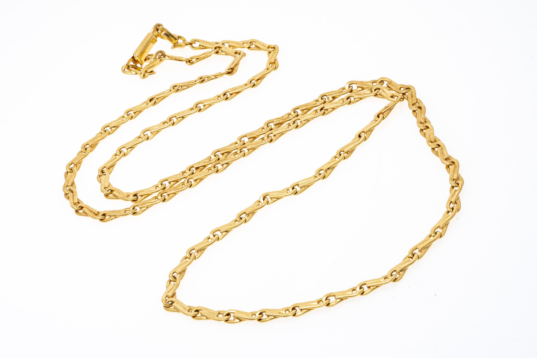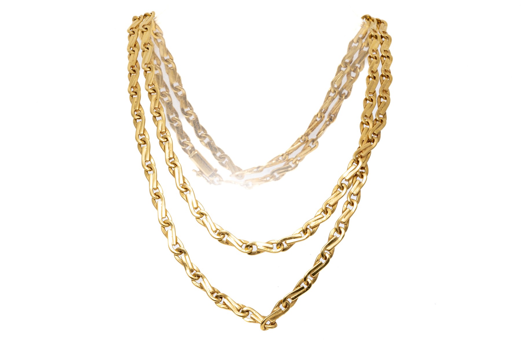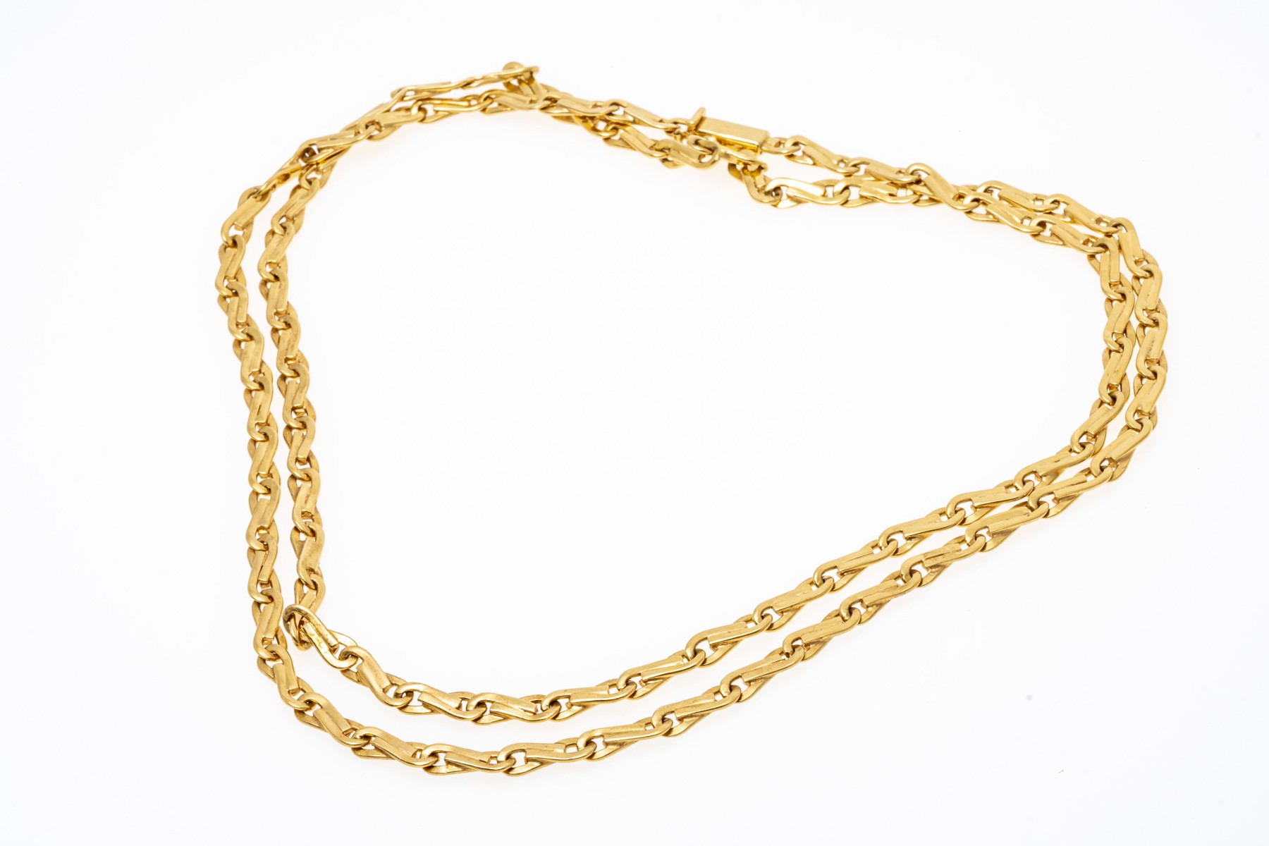 18k yellow gold striking heavy figure eight style opera length link necklace, 43.3 dwt. The necklace is finished by a box style clasp and a figure eight style safety