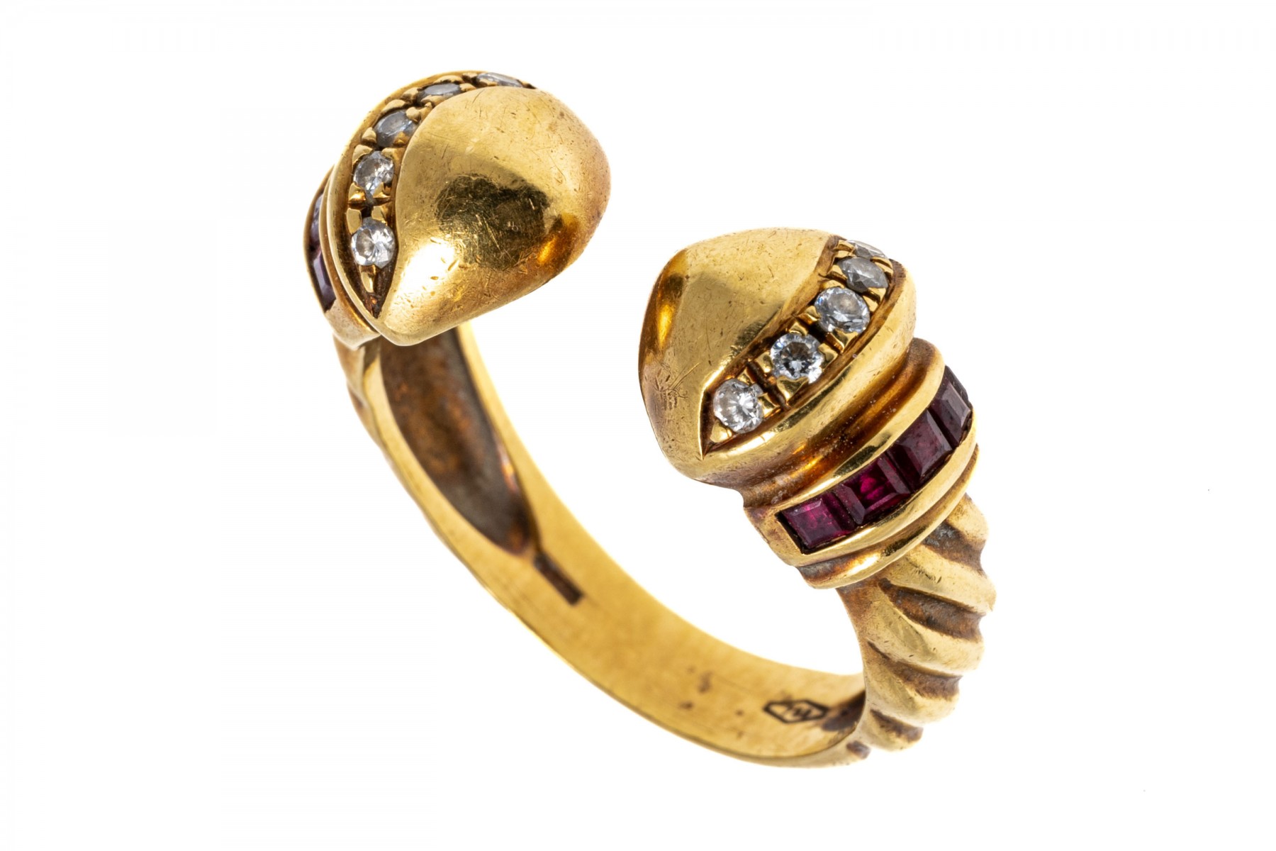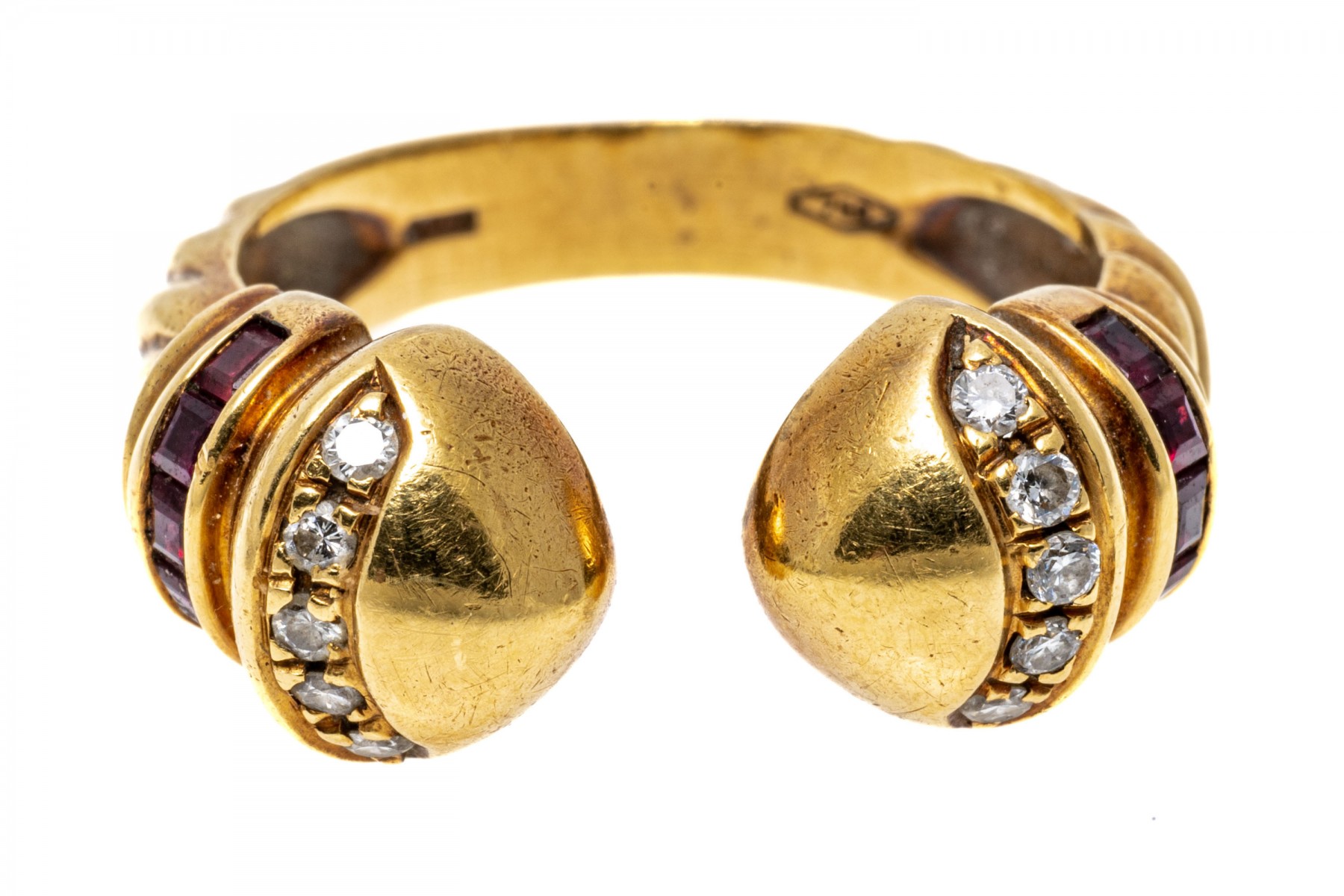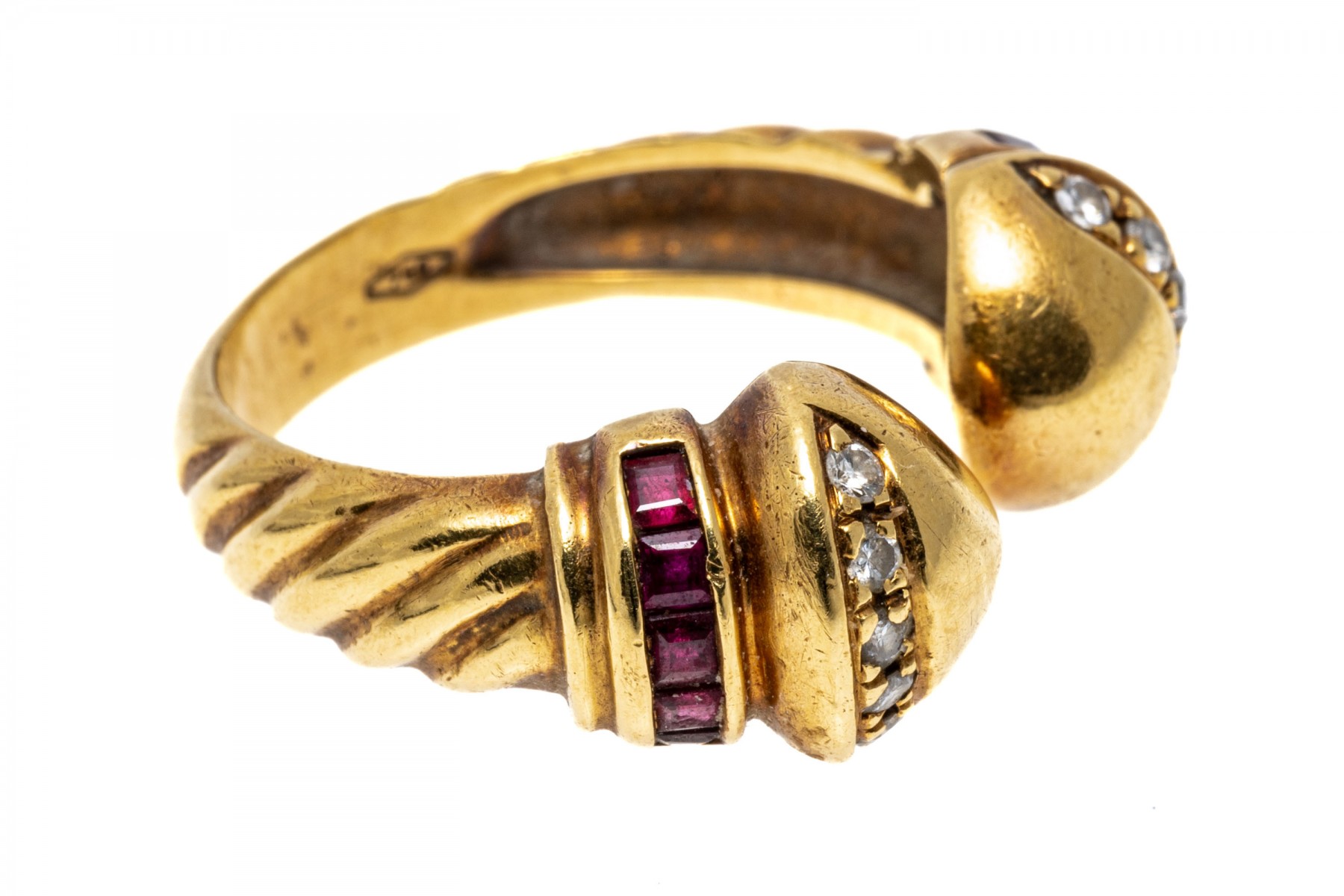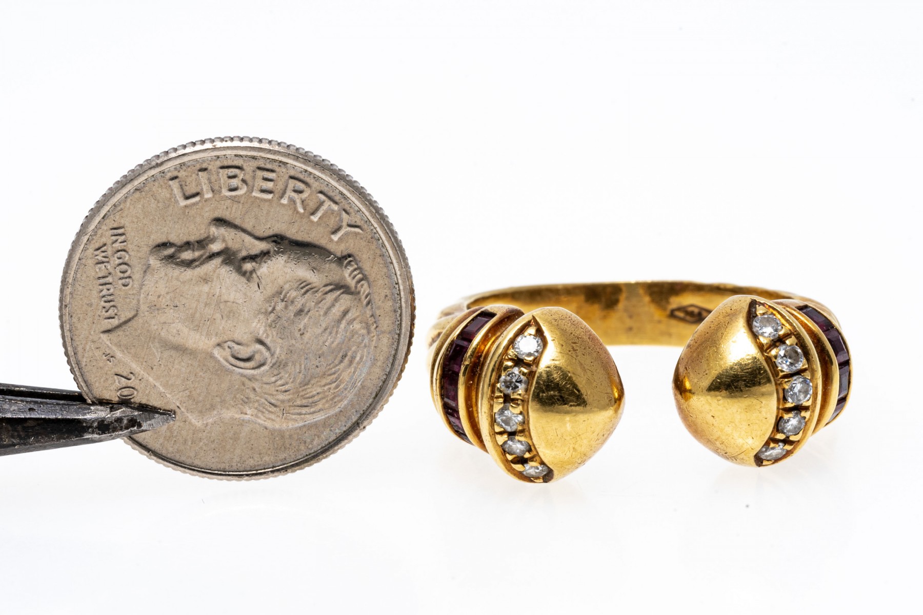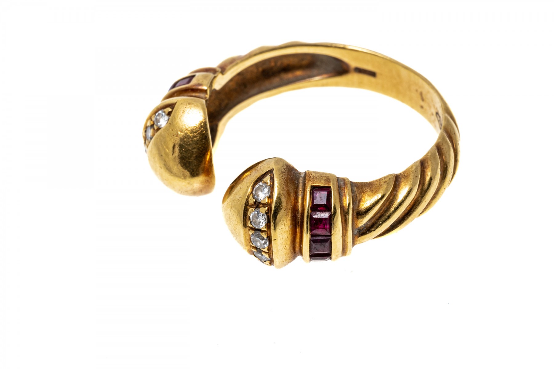 Open style 18K yellow gold ring. The ends of the ring are set with rows of round faceted diamonds and square cut rubies. The shanks of the ring has a polished ribbed finish. The diamonds are approximately 0.12 TCW and the rubies are approximately 0.35 TCW. Ring size .