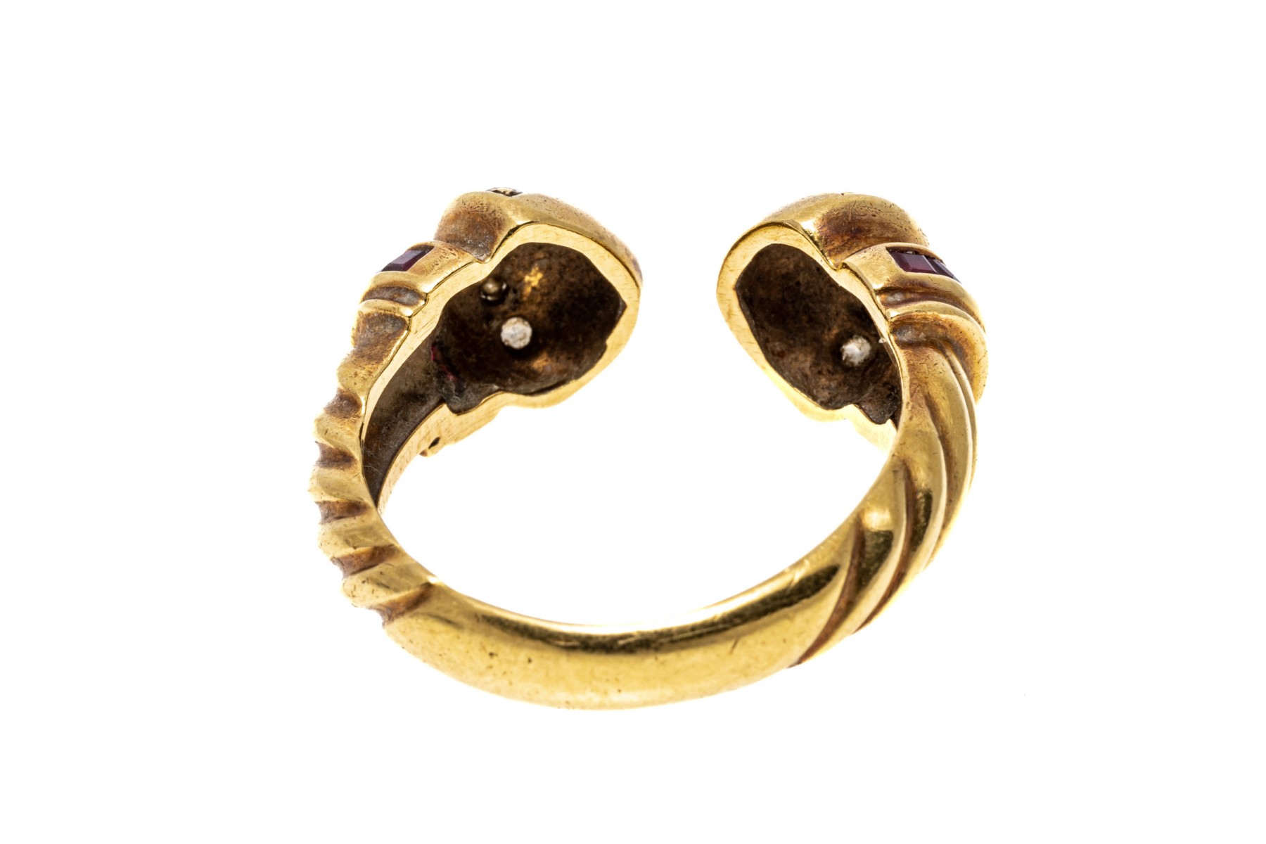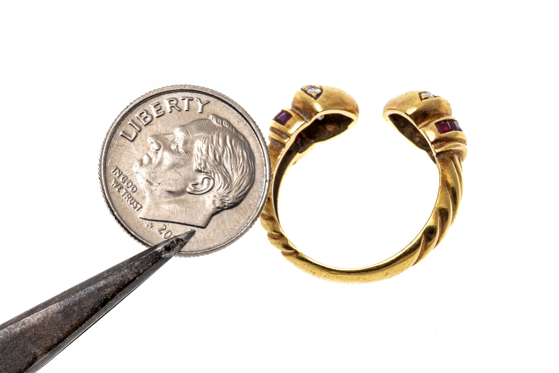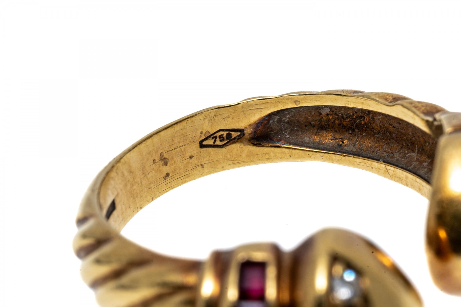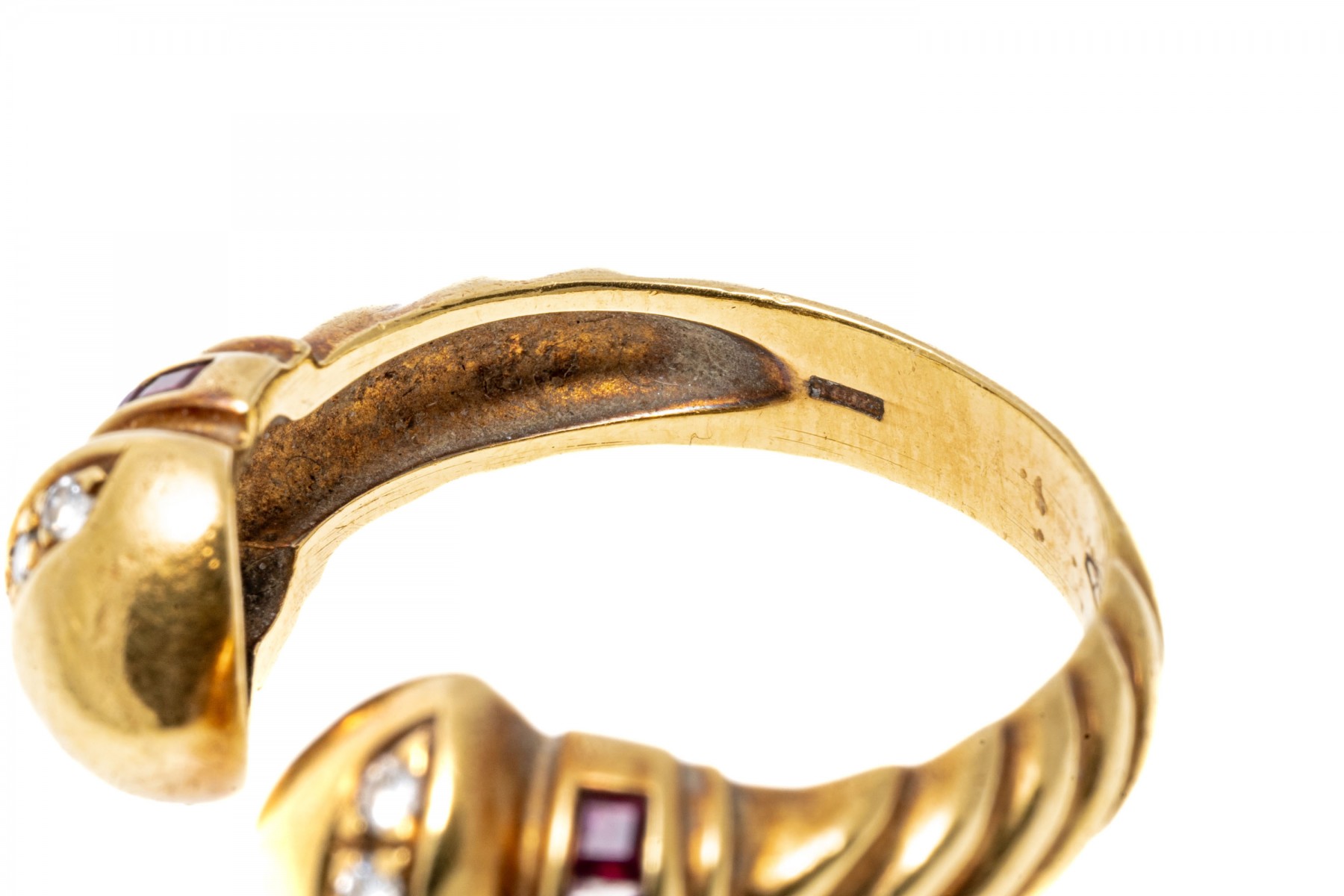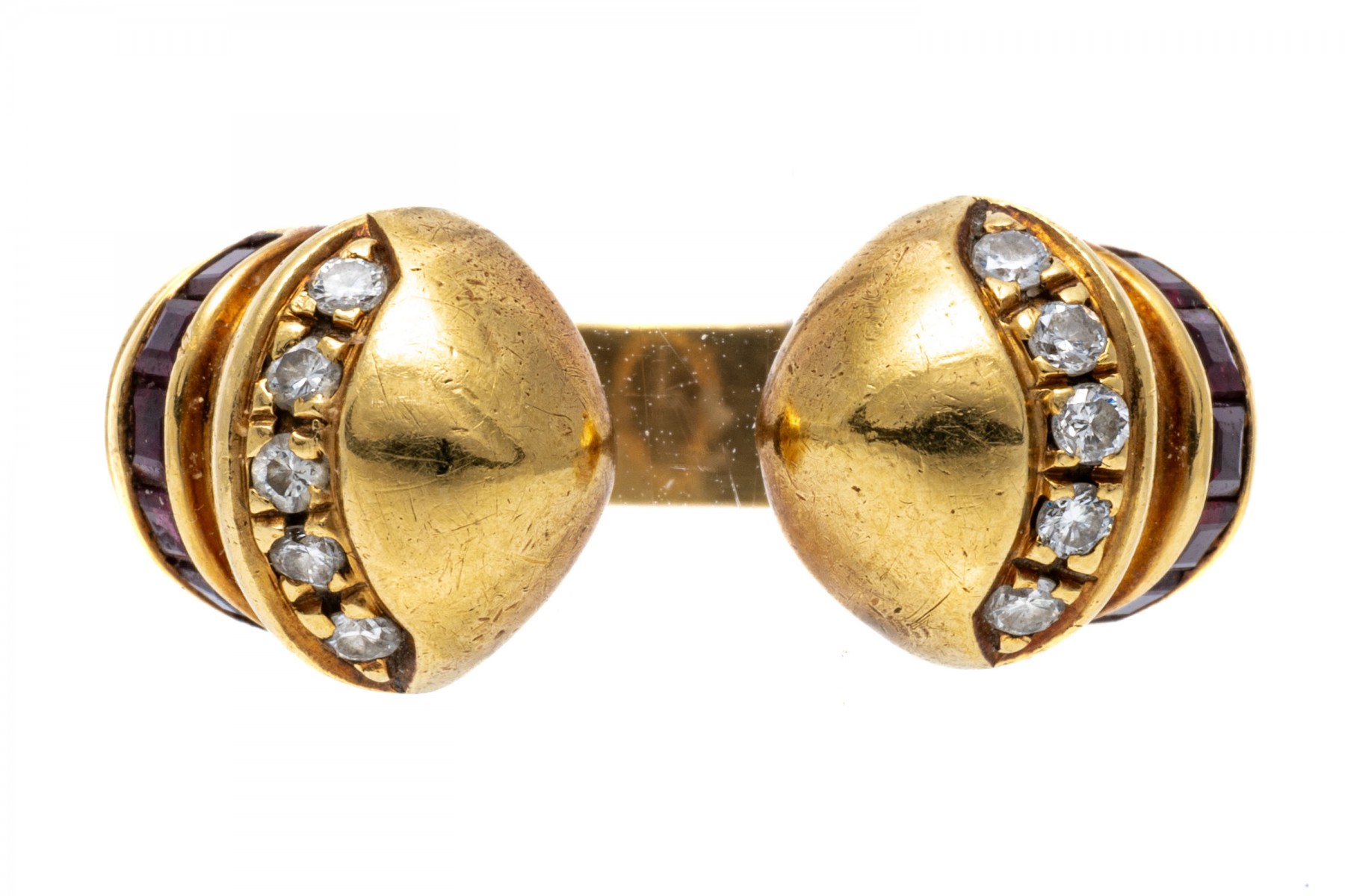 Open style 18K yellow gold ring. The ends of the ring are set with rows of round faceted diamonds and square cut rubies. The shanks of the ring has a polished ribbed finish. The diamonds are approximately 0.12 TCW and the rubies are approximately 0.35 TCW. Ring size .