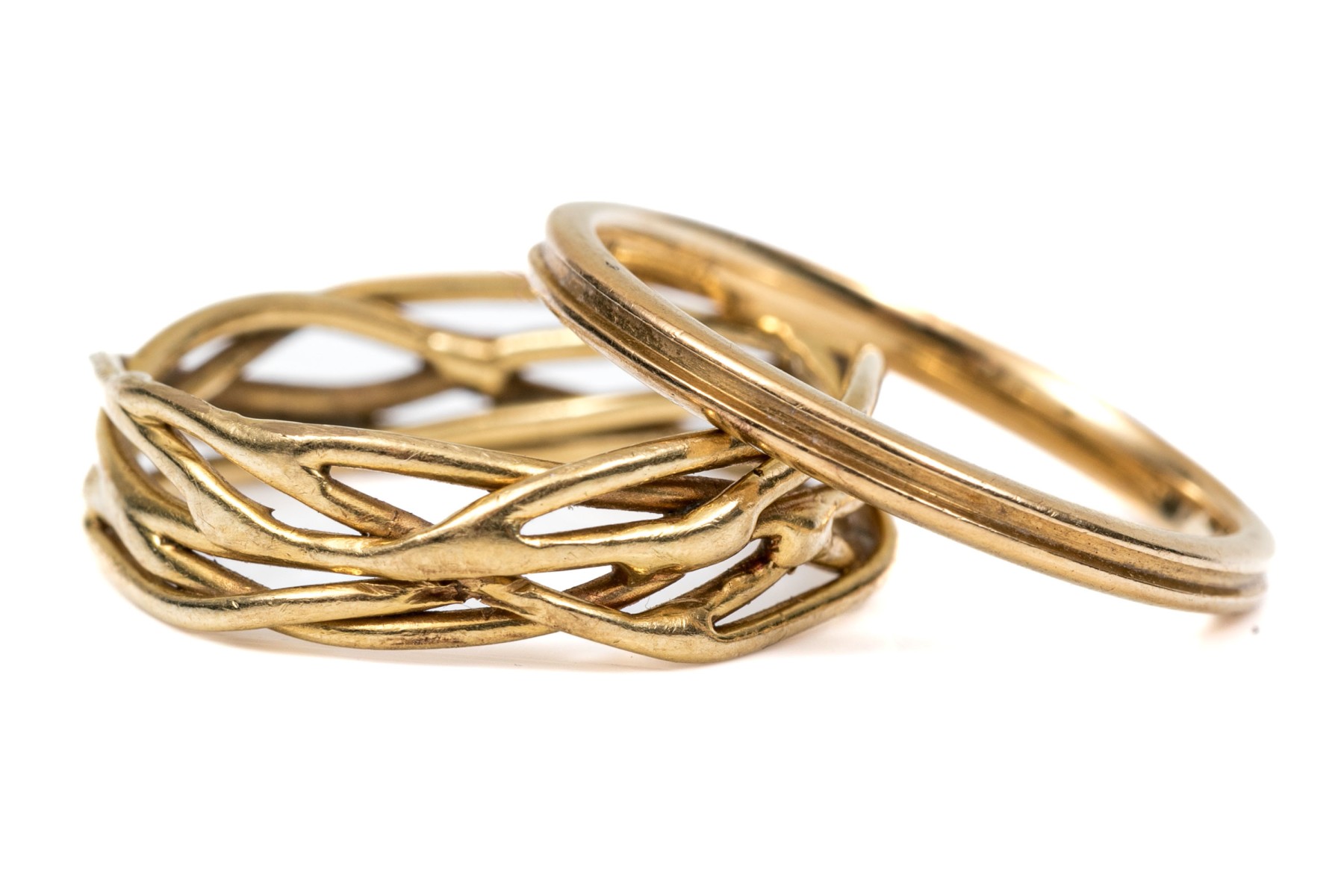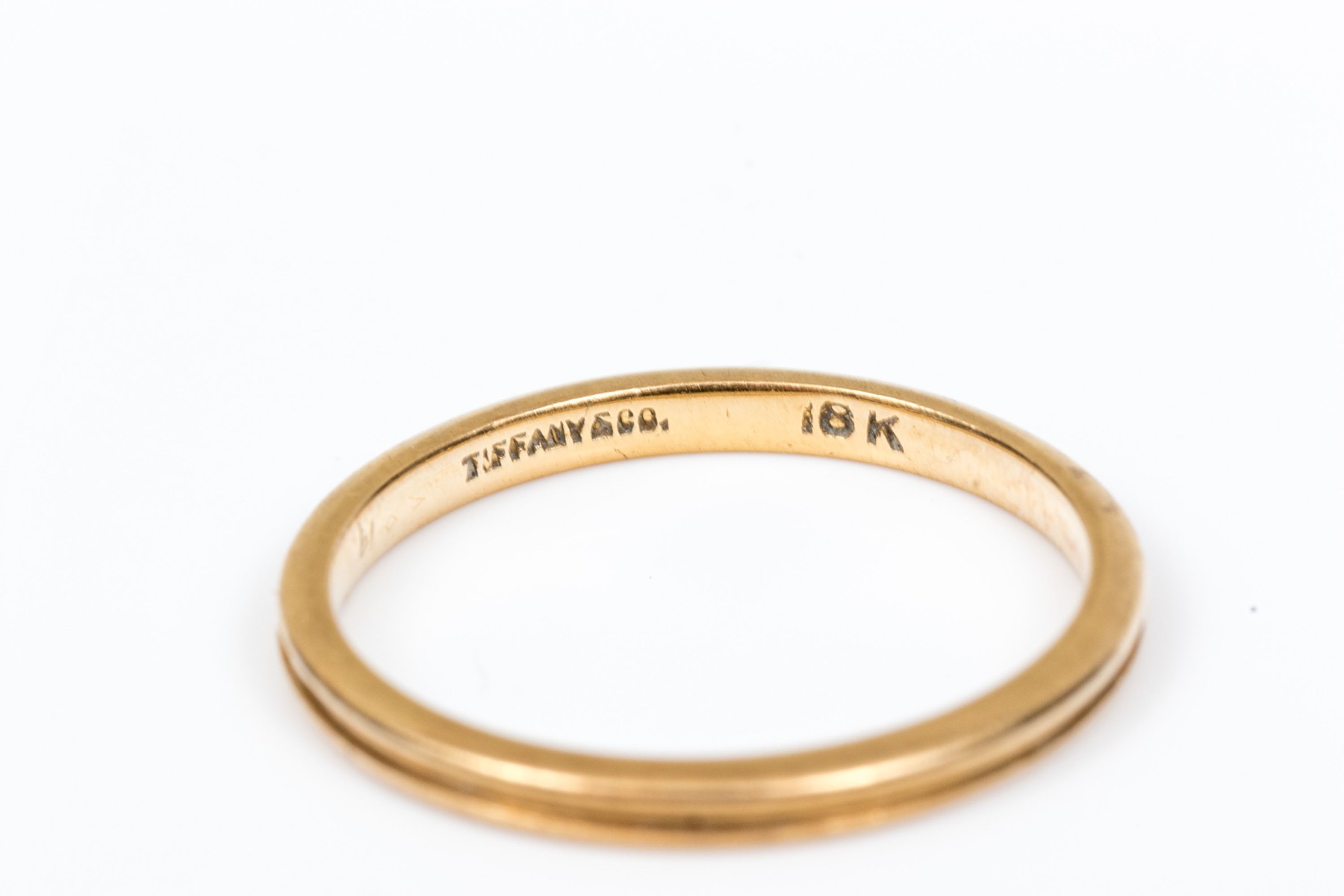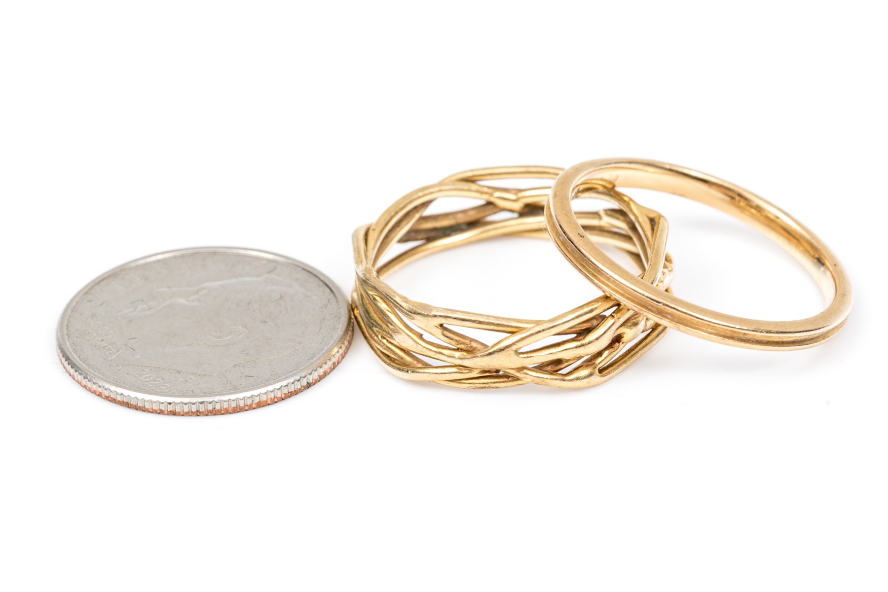 Two yellow gold rings. The first ring has been crafted from 18K by Tiffany & Company, has a bibbed design, size 6.25-. The second ring is created from 14K and displays an open braided design, size 6.5.