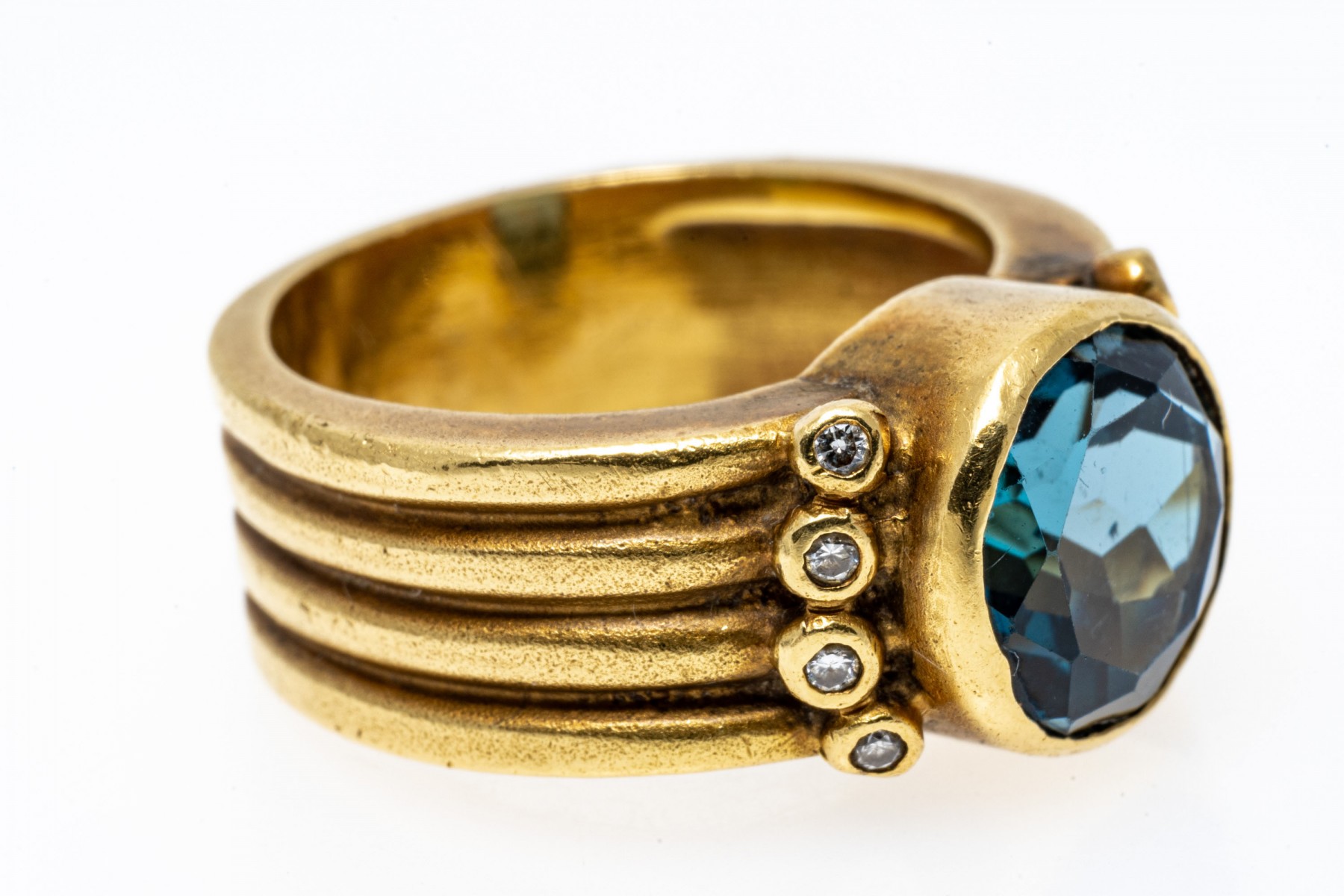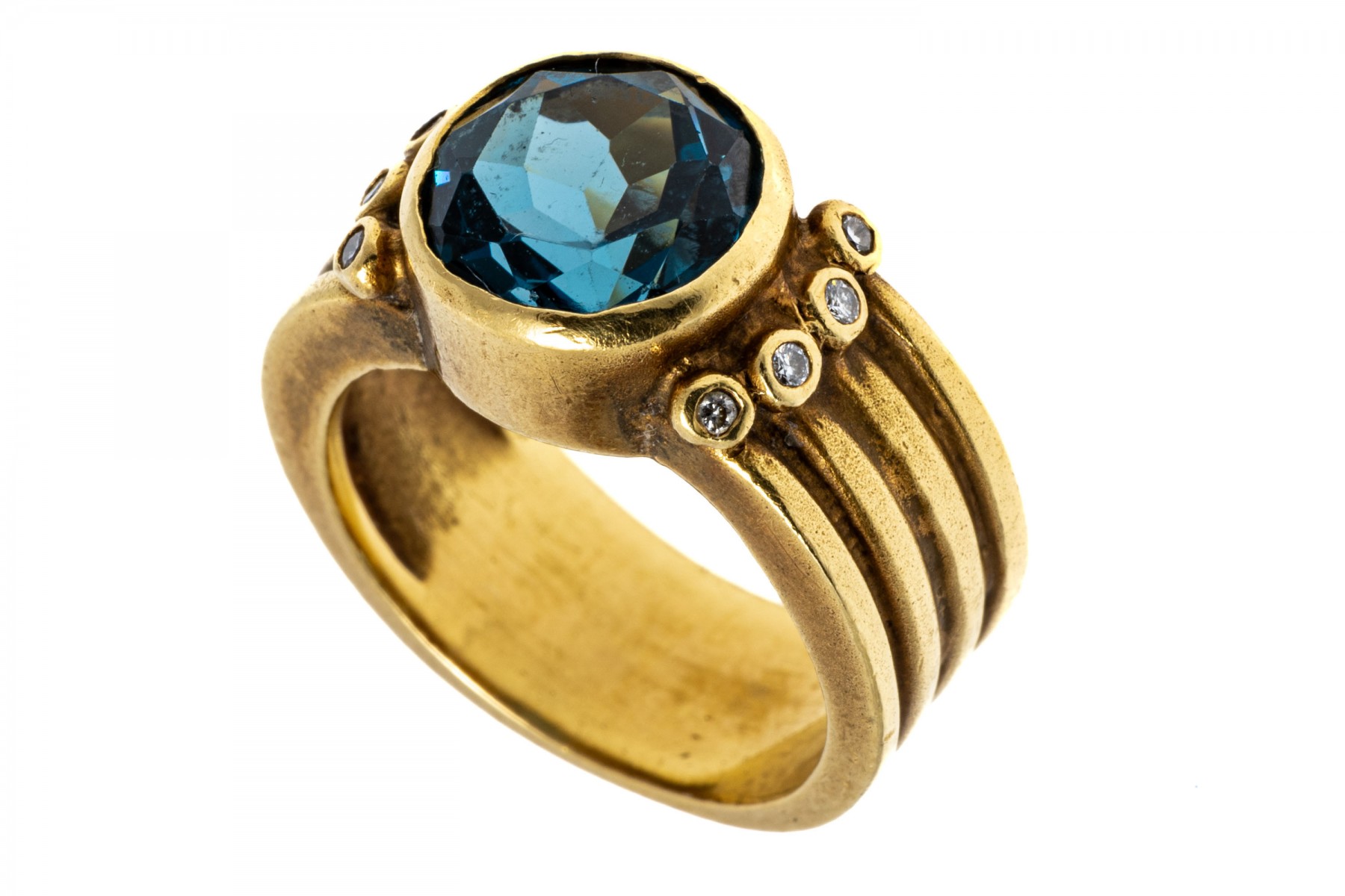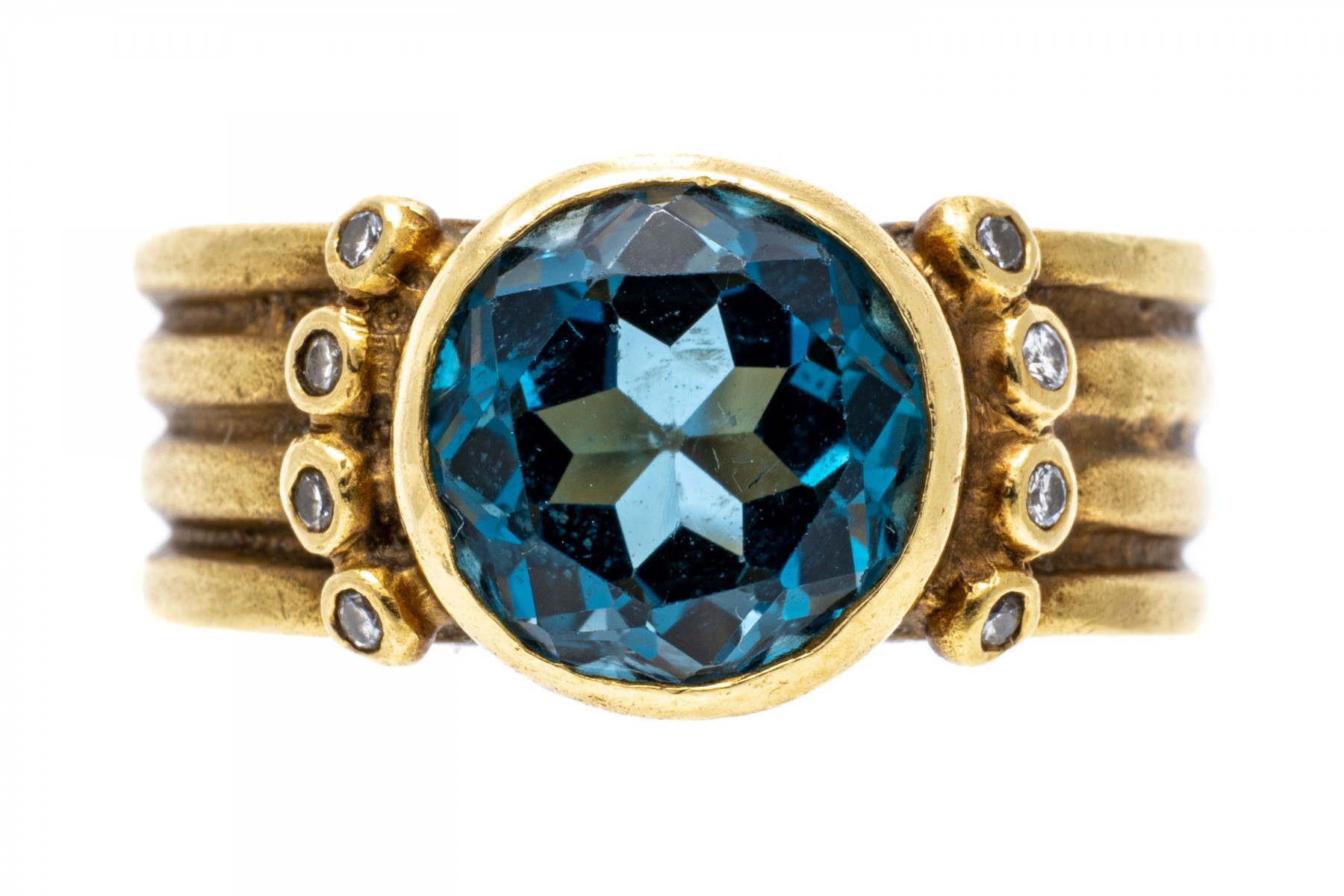 18K yellow gold ring with wide ribbed band. Bezel set into the face of the ring is a single round faceted blue topaz, approximately 2.5 cts. Five round brilliant cut diamonds flank each side of the topaz, approximately 0.048 TCW. Ring size .