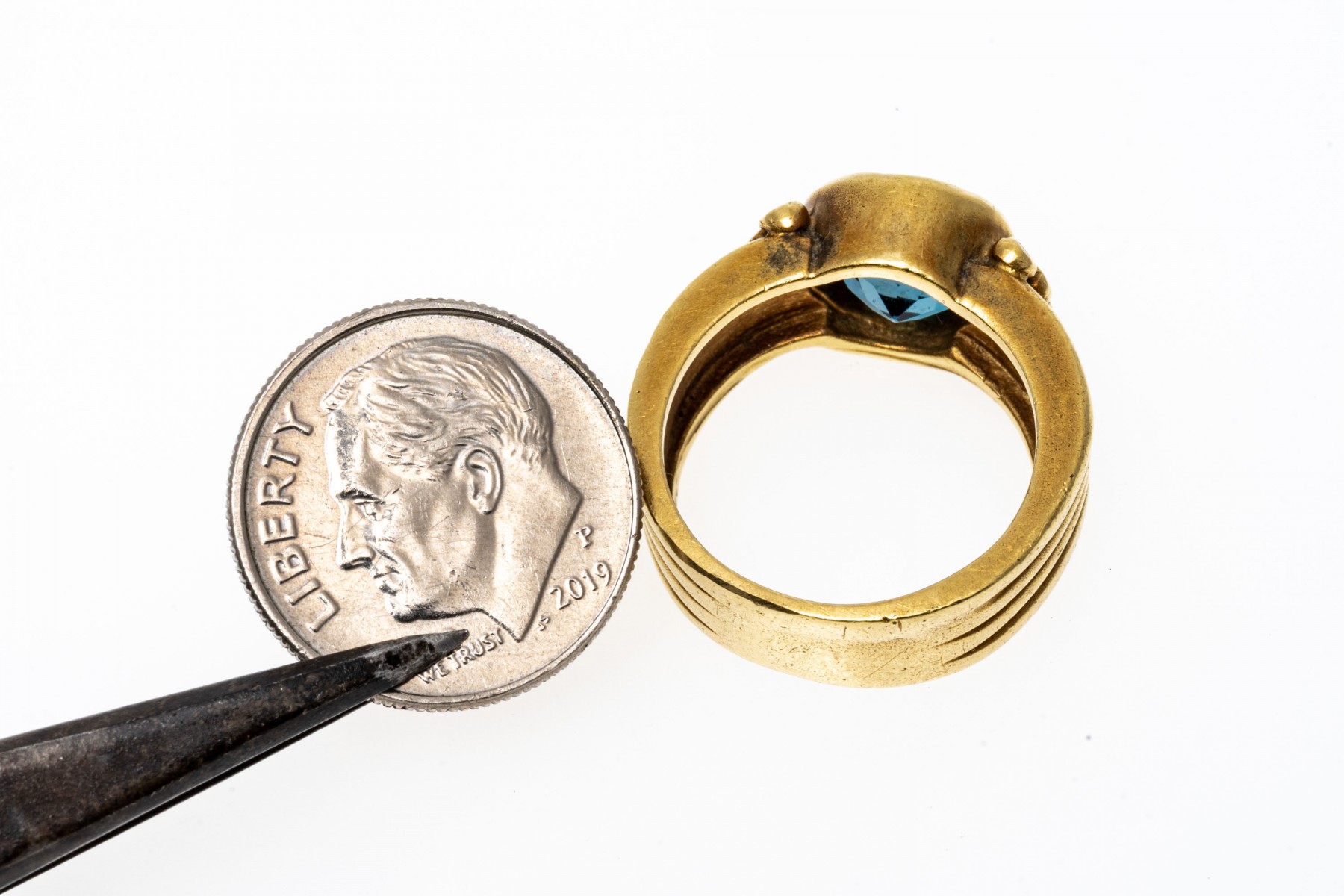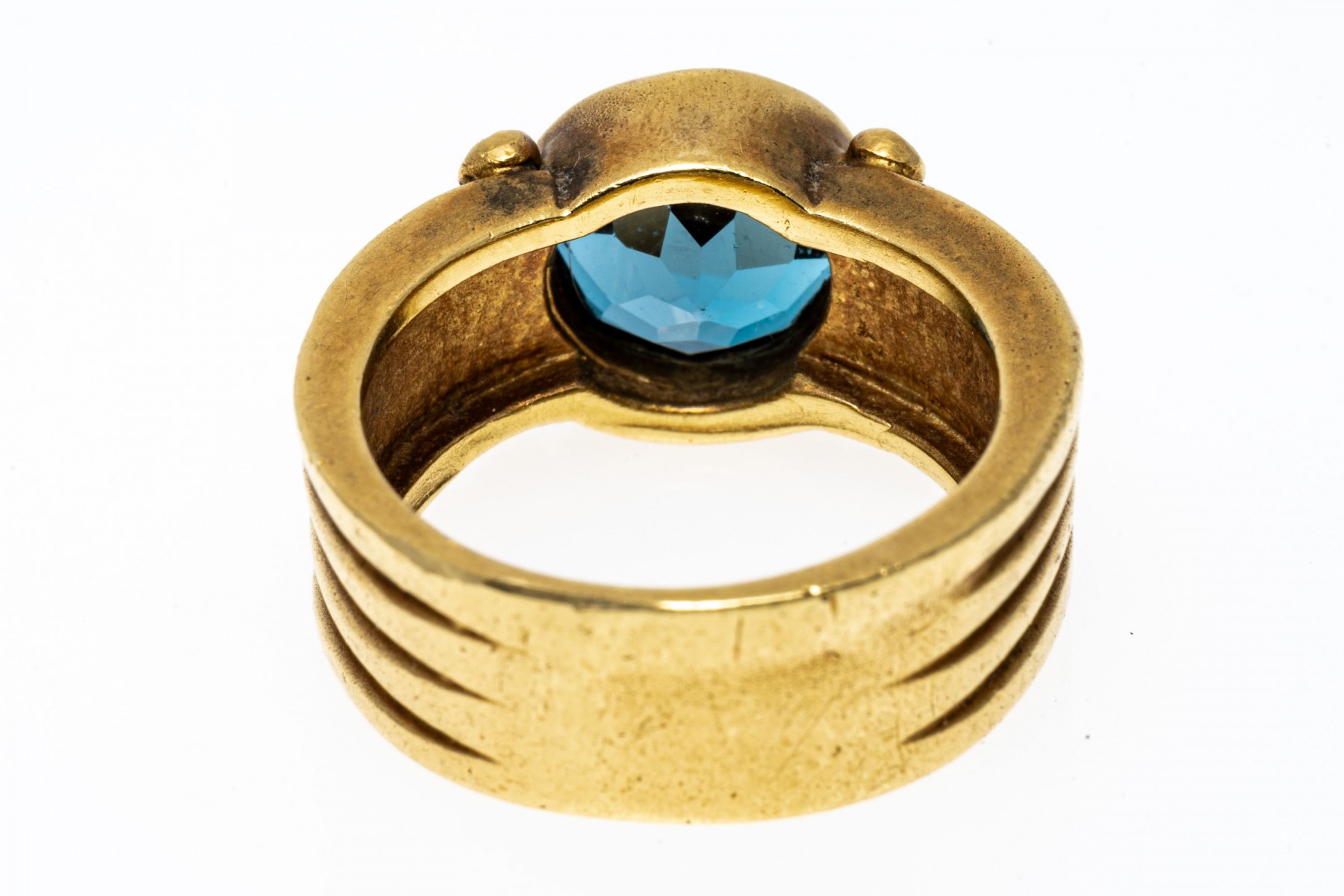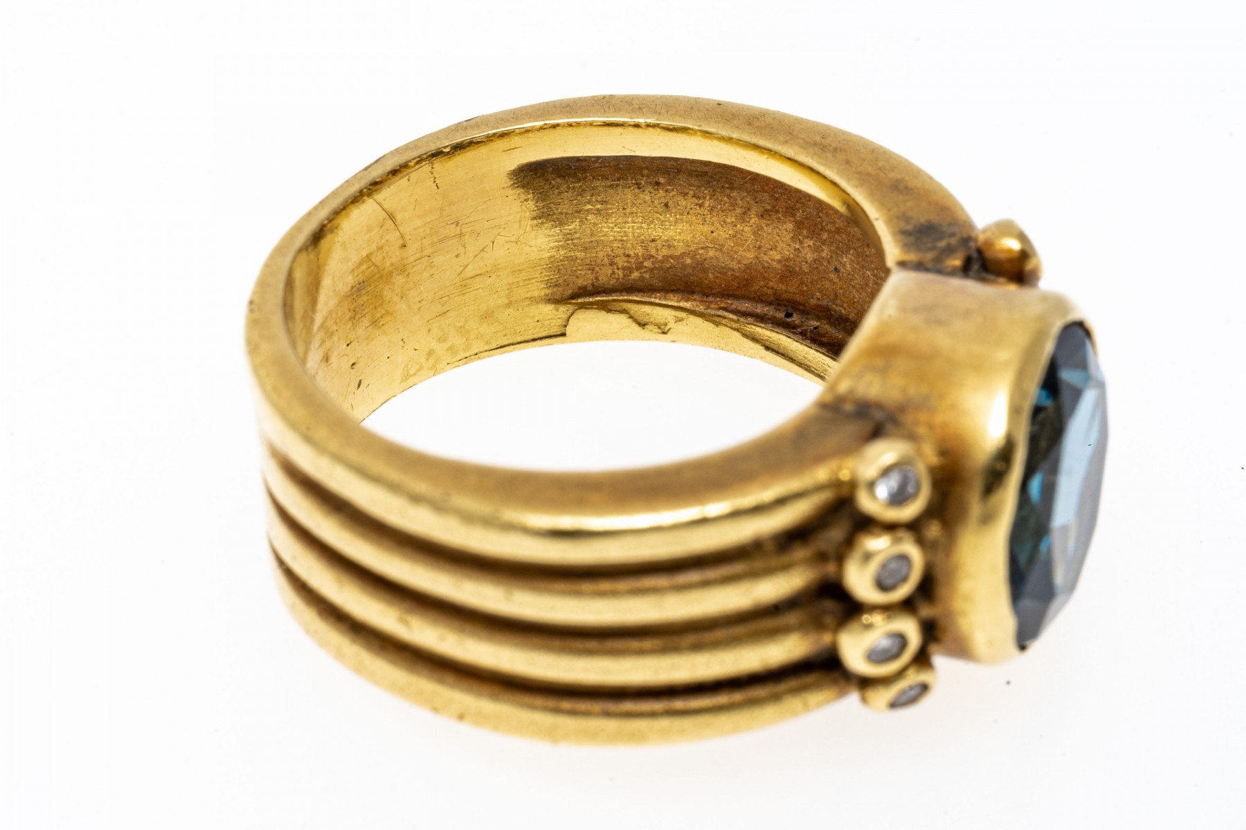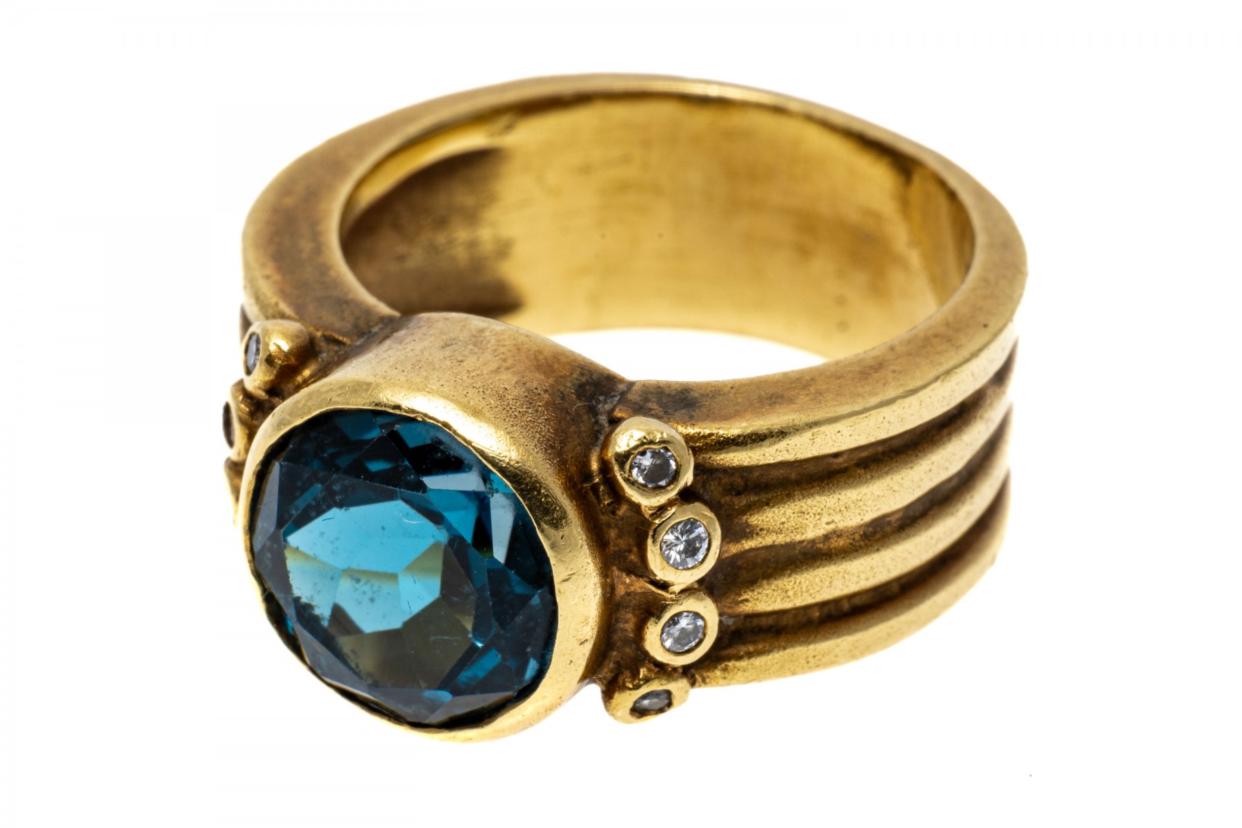 18K yellow gold ring with wide ribbed band. Bezel set into the face of the ring is a single round faceted blue topaz, approximately 2.5 cts. Five round brilliant cut diamonds flank each side of the topaz, approximately 0.048 TCW. Ring size .