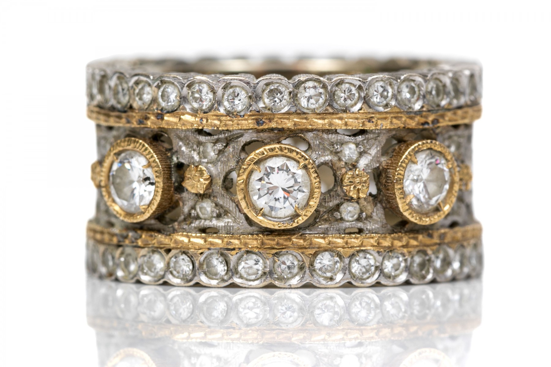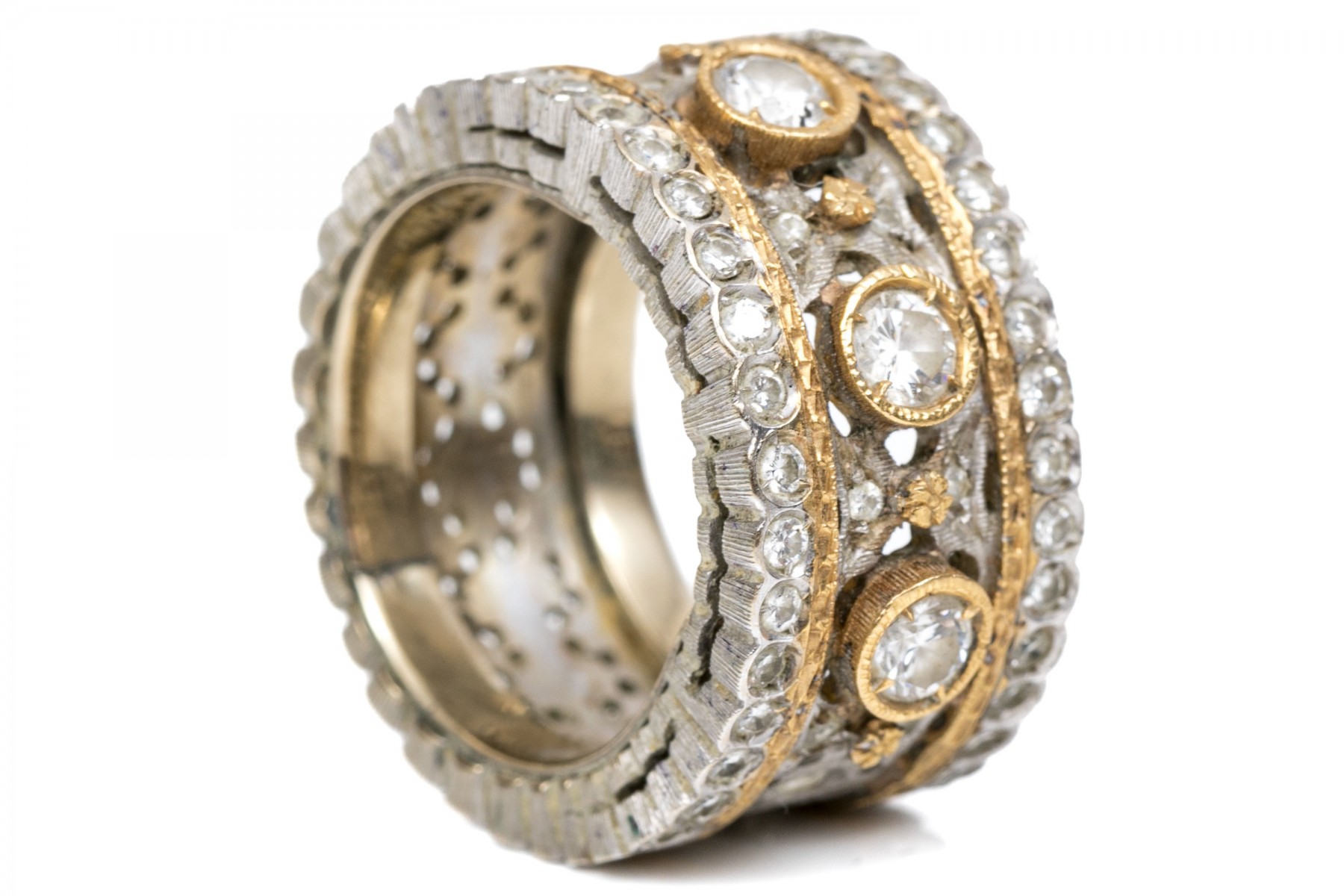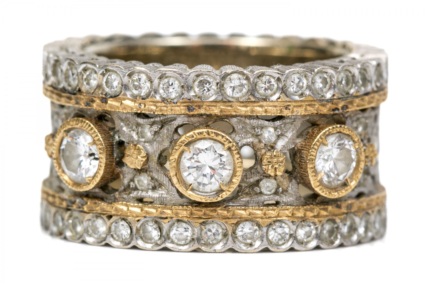 Stunning 18K white and yellow gold wide band ring. Three round brilliant cut diamonds sir over the center white gold band with yellow gold accents. Set into the scalloped edges are macle cut diamonds. Diamonds are approximately 0.42 TCW. Ring size 5.25.